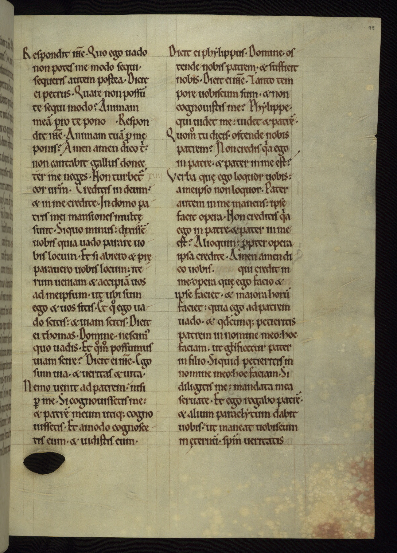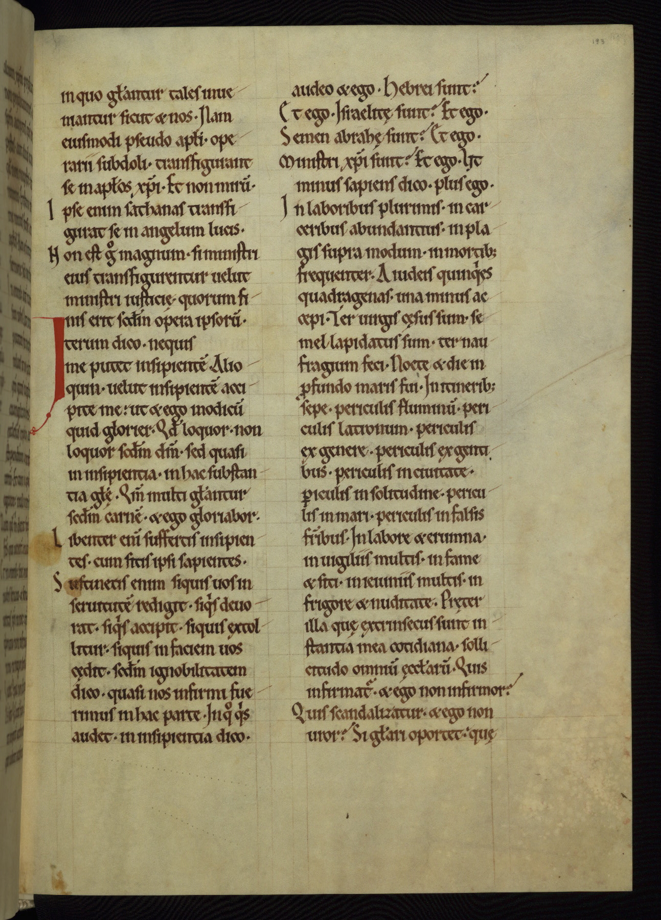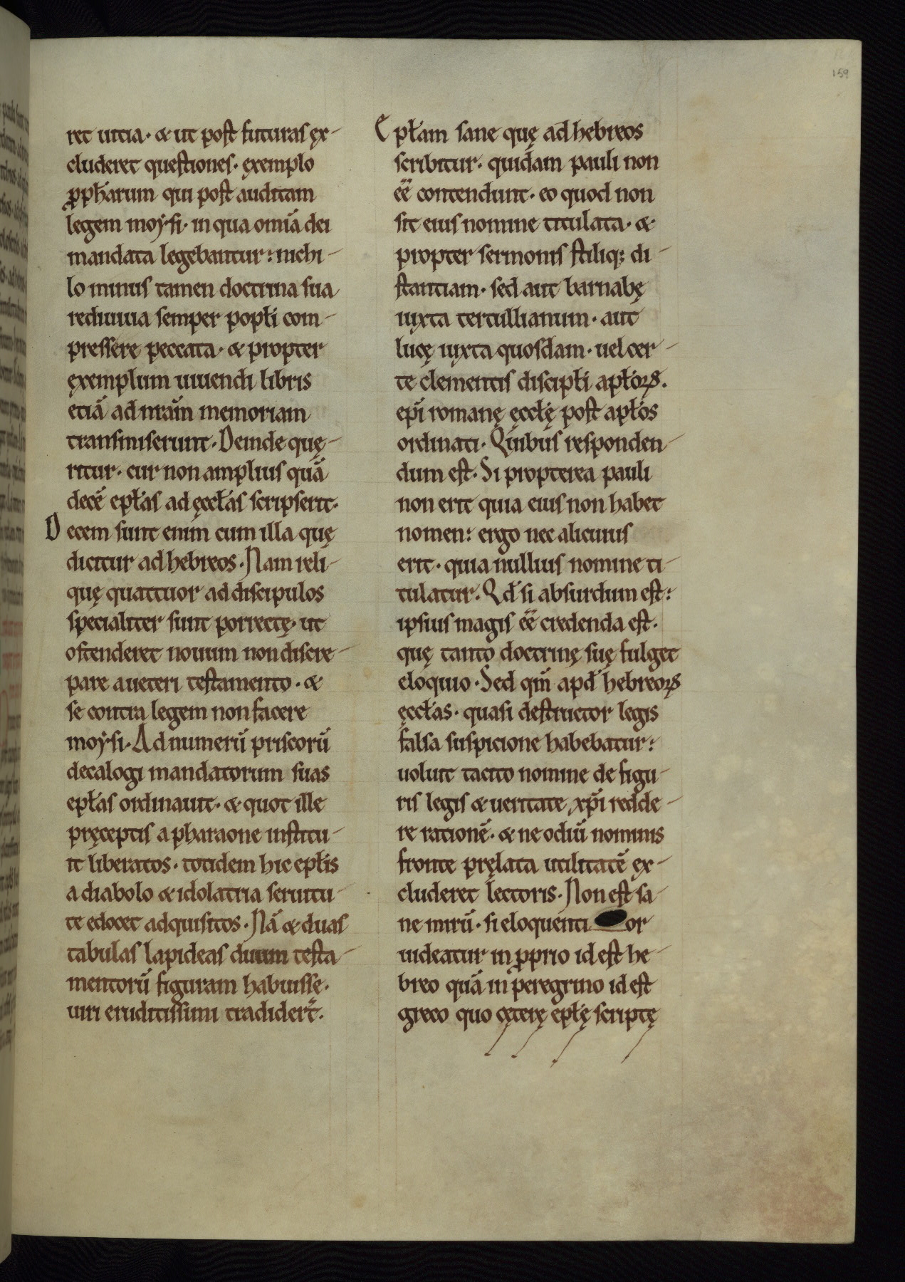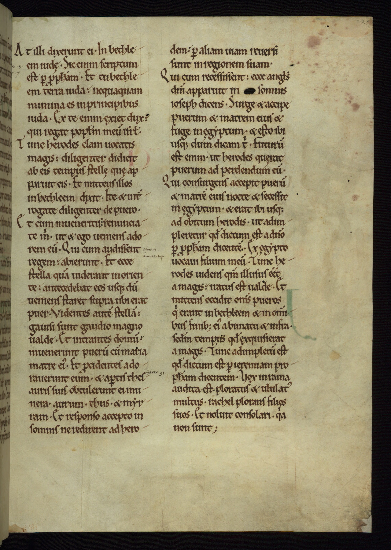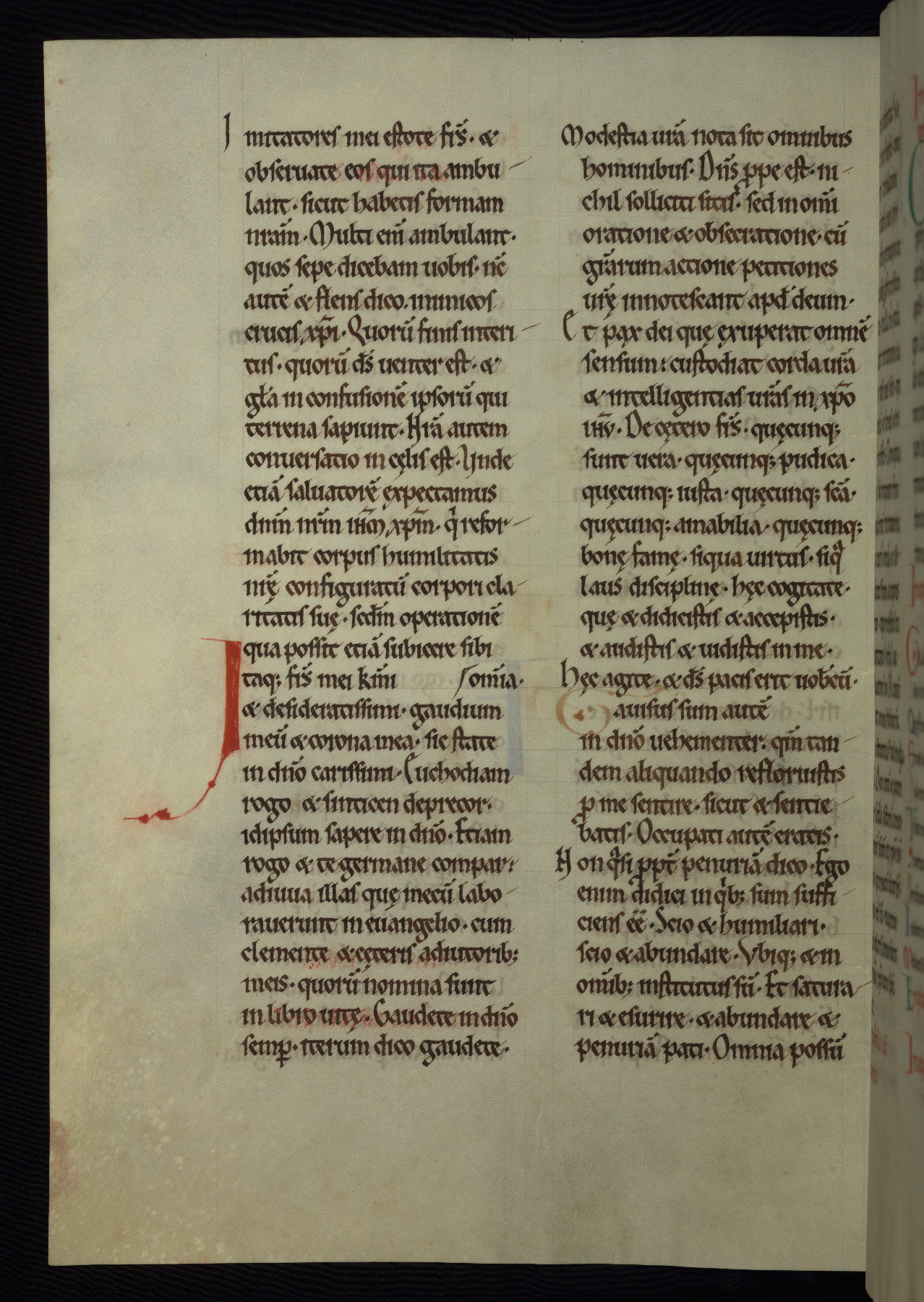 This large-format copy of the New Testament was almost certainly created at Rochester Cathedral Priory, England, in the first half of the twelfth century. It was part of a five-volume Bible, only one other volume of which, London, British Library Ms. Royal I.C.VII, has survived. The decorated initials in these manuscripts compare closely with those in other books securely attributed to Rochester. Textually these books are closely related to the Gundulph Bible (San Marino, Huntington Library Ms. HM 62), known to have been produced at Rochester in the second half of the eleventh century. Although neither the Walters' nor the British Library's volume includes an inscription associating this Bible with Rochester, the two medieval catalogs of the Rochester Cathedral library, produced around 1130 and in 1202, contain references to manuscripts that correspond well with them. The book’s large size indicates it that was designed to be read aloud, either during services or at meals in the refectory. Large, fanciful initials filled with succulent foliage, fruit, dragons, animals, and human faces begin each section of the text. Executed in a vibrant palette of red, blue, green, ochre (in place of gold), and yellow, the intricate, dynamic designs capture the essence of Romanesque manuscript illumination. Royal I.C.VII also includes four historiated initials (for the books of Joshua, I Samuel, 2 Samuel, and 2 Kings). Although the Bible was made at Rochester, the pre-Gothic script of W.18 in particular is extremely close to that practiced at nearby Canterbury at the time.