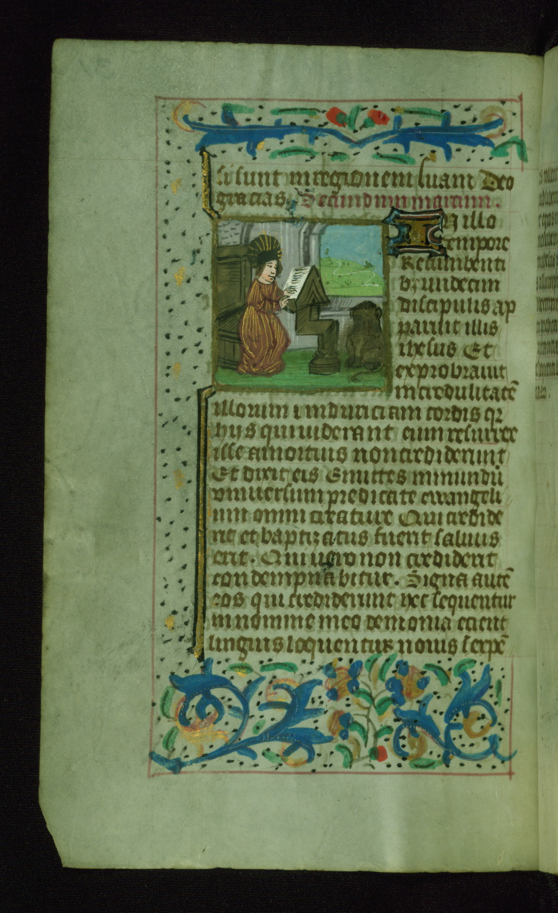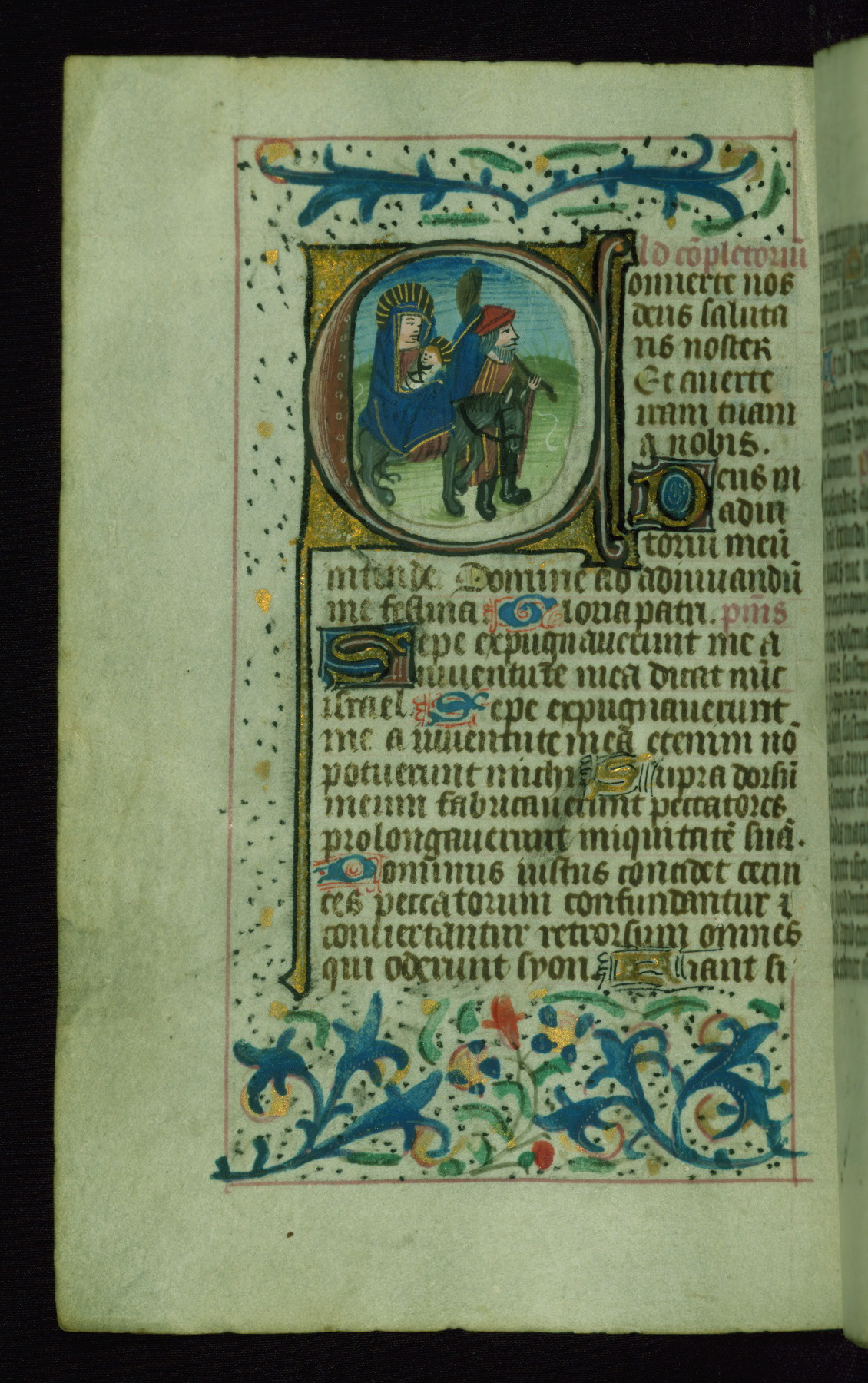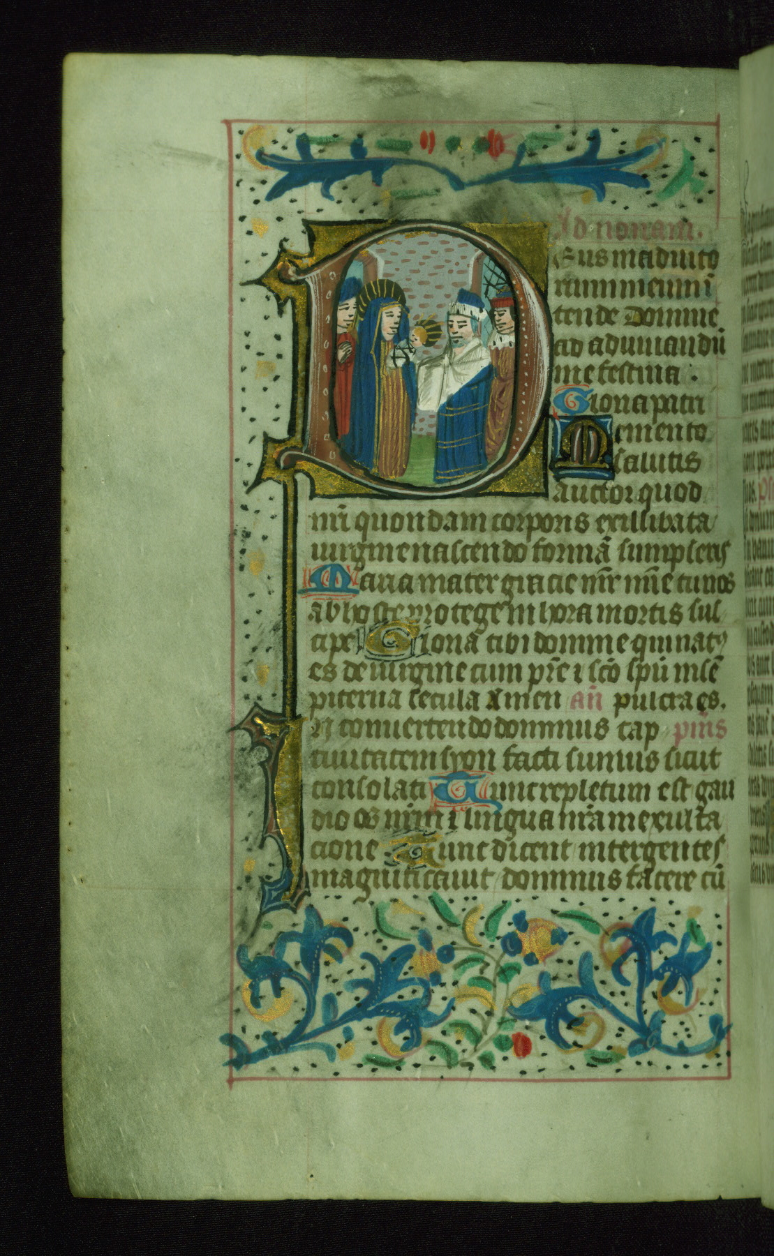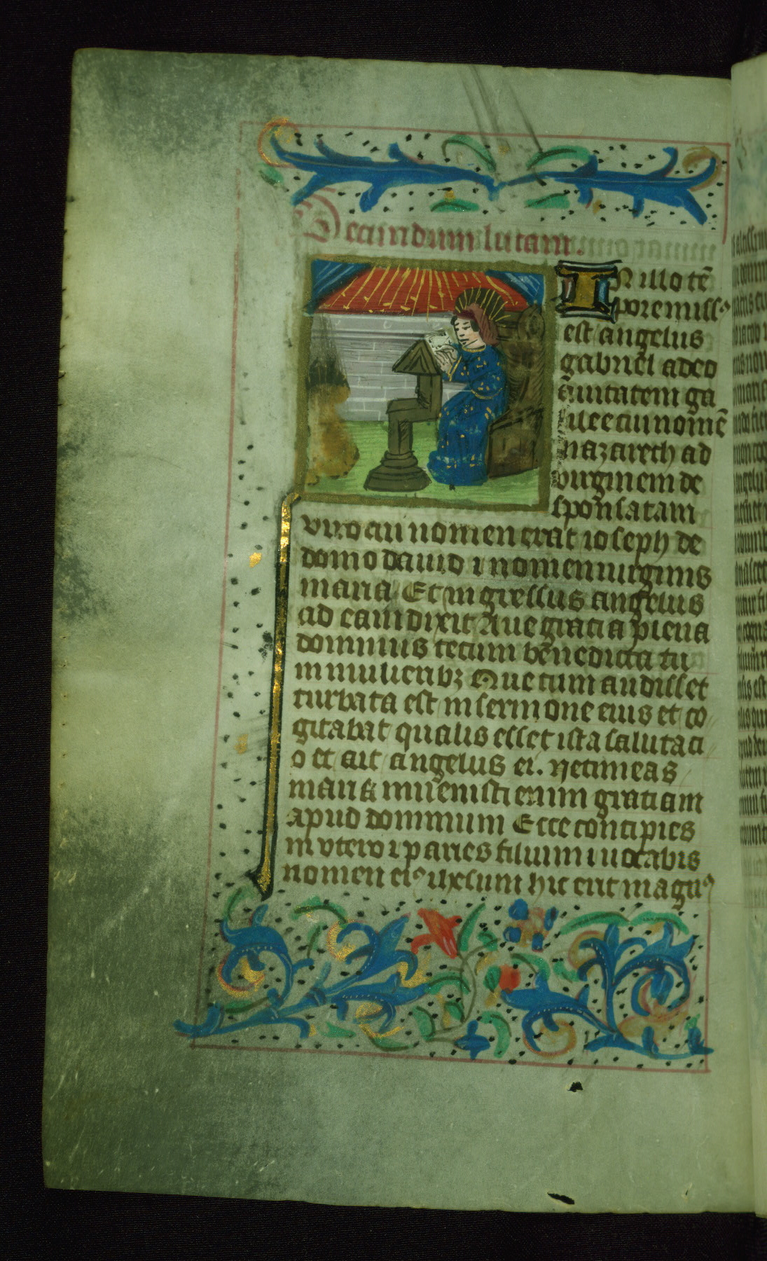 - Decoration note: Three full-page miniatures (three others now missing) by two different artists and inserted as singletons (3.7 x 6.3 cm), each with foliate margins on three sides and facing (or would have been facing) opening pages of text with matching foliate margins and large blue and rose floral initials against gold grounds (6-7 lines); four small miniatures and twenty-one historiated initials by a third artist (9 lines) with foliate margins above and below the textblock; smaller initials in gold against blue and rose grounds (2-4 lines) beginning each calendar page (KL) and also marking secondary text divisions; versals in alternating gold and blue (1 line); geometric line fillers in rose and blue (in litany only); rubrics and major feast days in rose; text in black ink