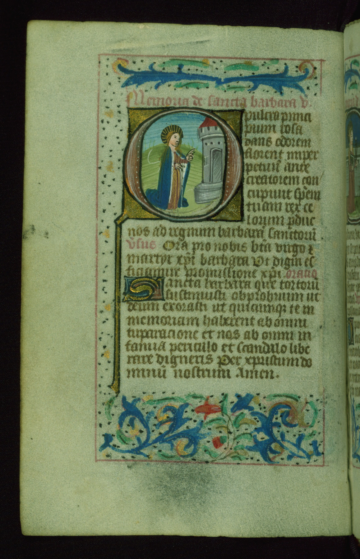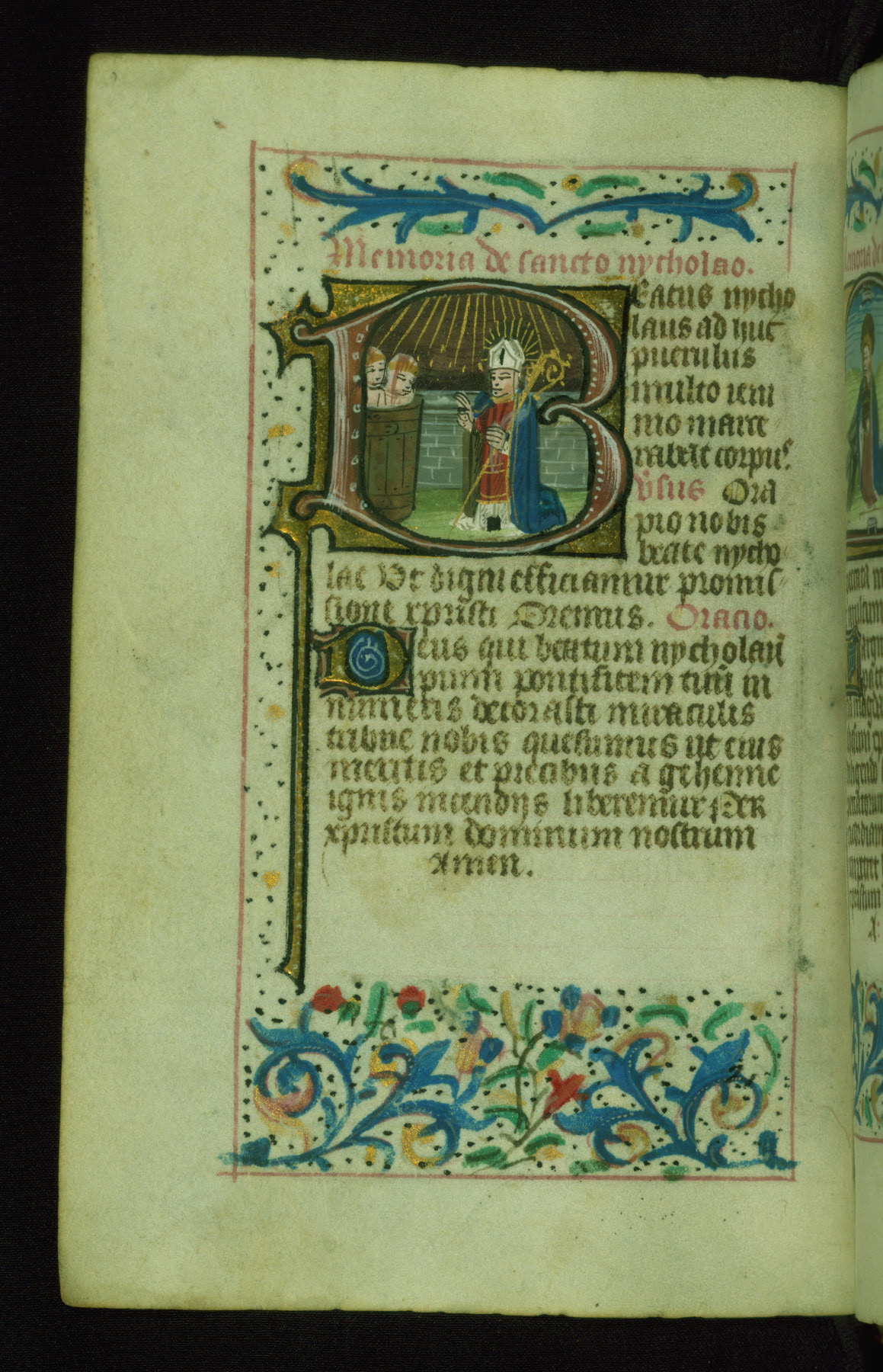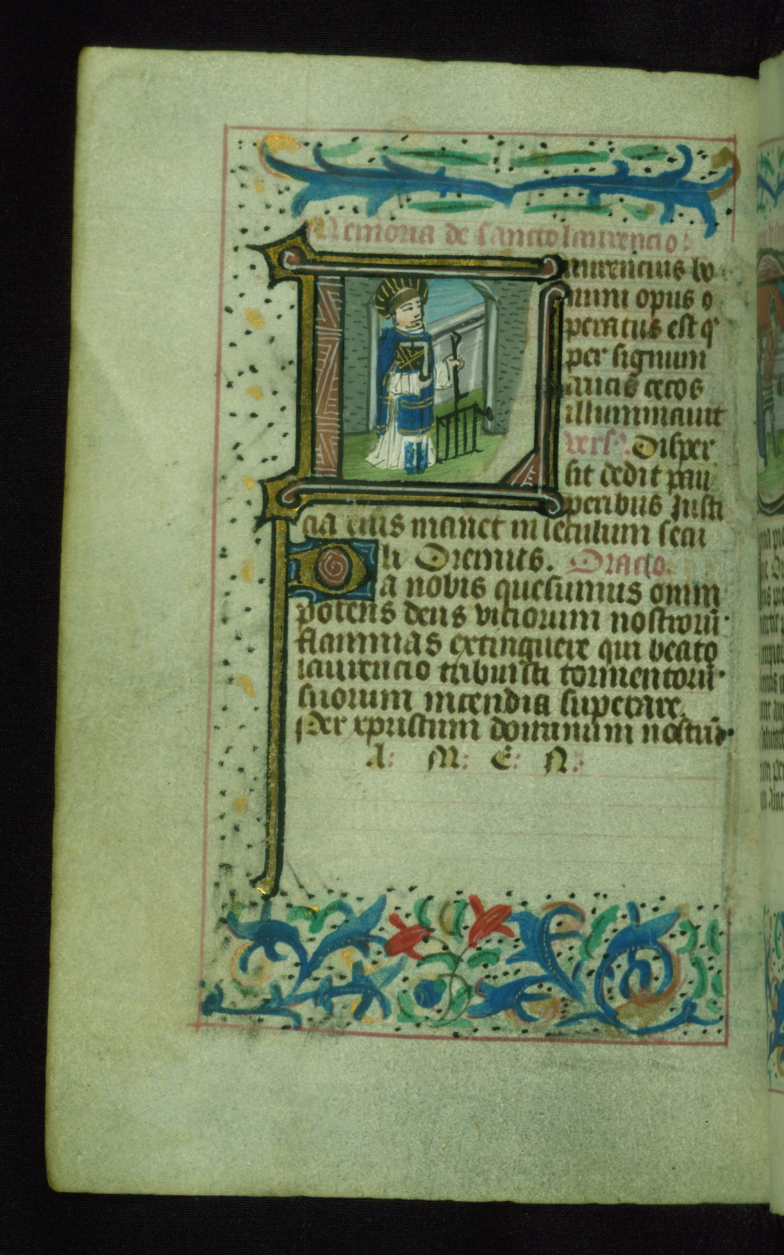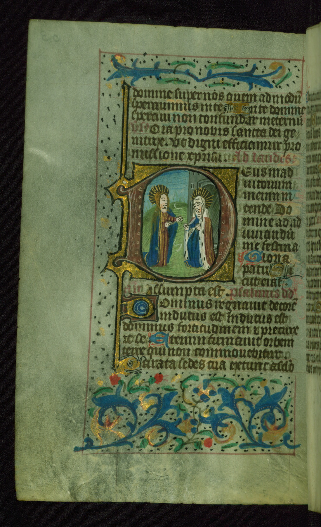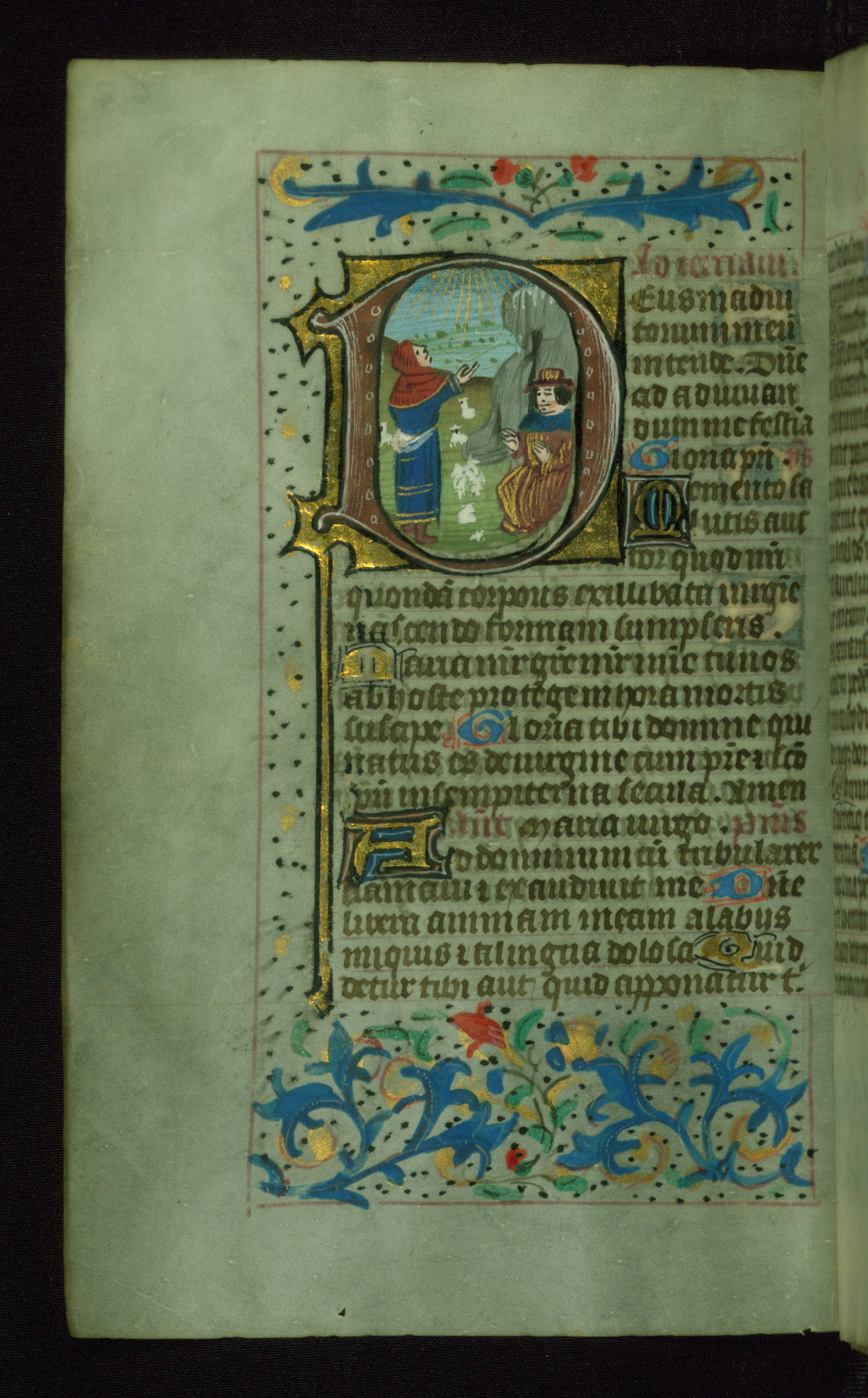 - Decoration note: Three full-page miniatures (three others now missing) by two different artists and inserted as singletons (3.7 x 6.3 cm), each with foliate margins on three sides and facing (or would have been facing) opening pages of text with matching foliate margins and large blue and rose floral initials against gold grounds (6-7 lines); four small miniatures and twenty-one historiated initials by a third artist (9 lines) with foliate margins above and below the textblock; smaller initials in gold against blue and rose grounds (2-4 lines) beginning each calendar page (KL) and also marking secondary text divisions; versals in alternating gold and blue (1 line); geometric line fillers in rose and blue (in litany only); rubrics and major feast days in rose; text in black ink