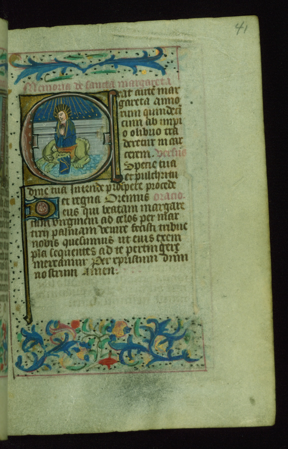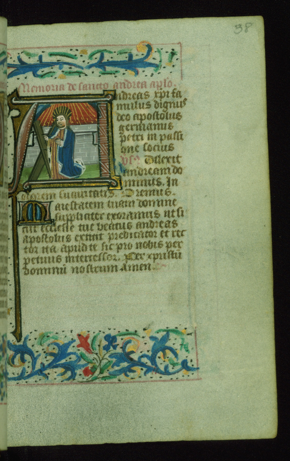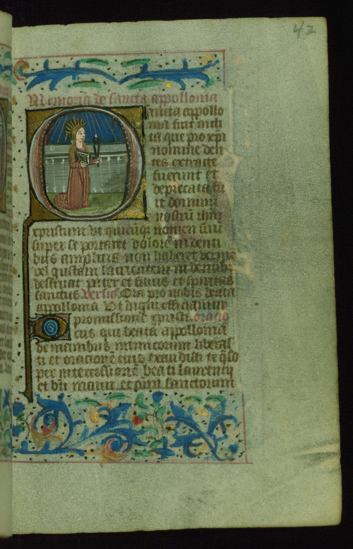 - Contents: Suffrages for saints: fol. 37r: John the Baptist, Inter natos mulierum non surrexit maior iohanne baptista; fol. 37v: Peter and Paul, Petrus apostolus et paulus doctor gentium; fol. 38r: Andrew, Andreas christi famulus dignus deo; fol. 38v: Lawrence, Laurencius homini opus operatus est; fol. 39r: Thomas Becket, Tu per thome sanguinem quem pro te impendit; fol. 39v: Nicholas, Beatus nycholaus ad huc puerulus multo ieiunio; fol. 40r: Mary Magdalene, Maria ergo unxit pedes ihesu et extersit capillis capitis sui; fol. 40v: Catherine, Virgo sancta katherina grecie gemma urbe allexandrina; fol. 41r: Margaret, Erat autem margareta annorum quindecim ab impio olibrio; fol. 41v: Barbara, O pulcra principium rosa dans odorem florent; fol. 42r: Apollonia, O sancta appollonia fuit milita que pro christi nomine dentes extracte; fol. 42v: Scholastica, Accinxit fortitudine lumbos suos et roborauit brachium suum