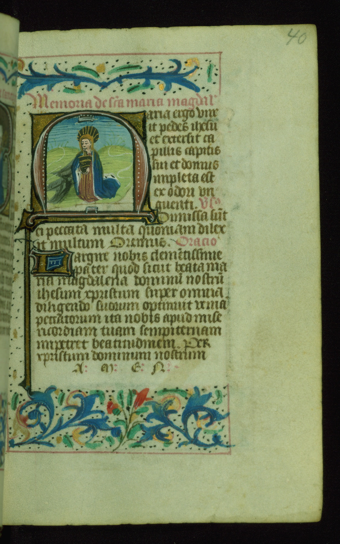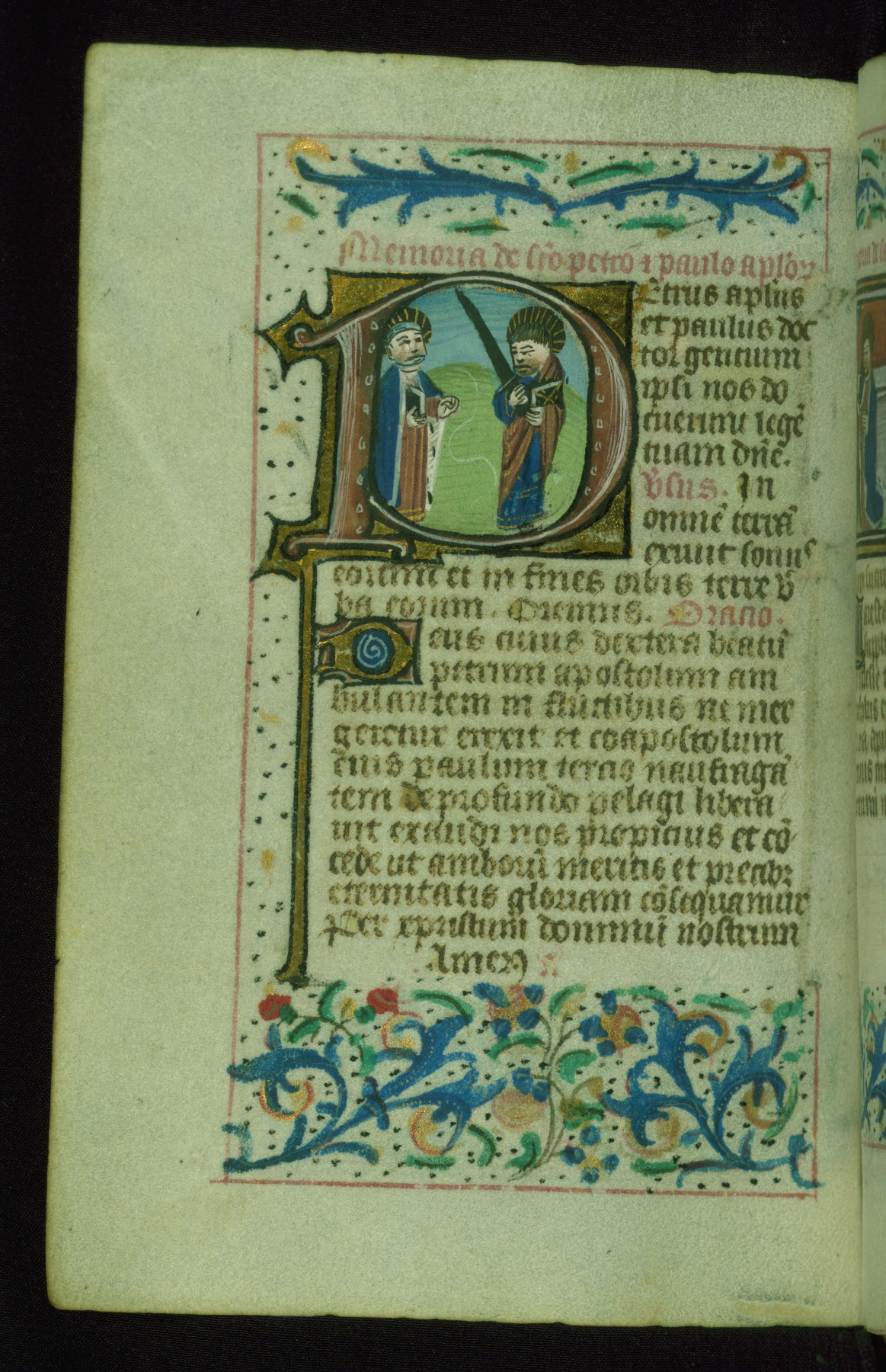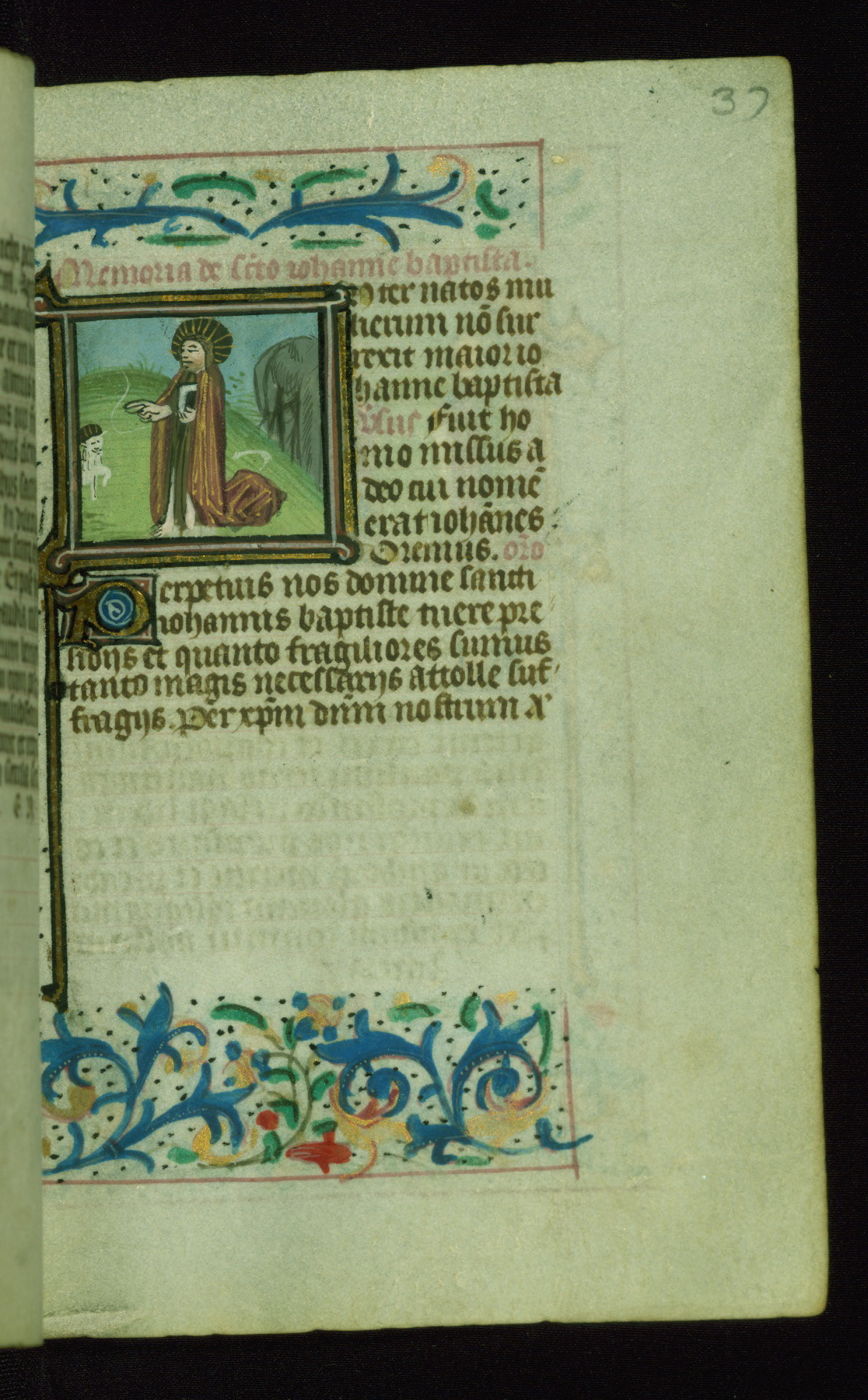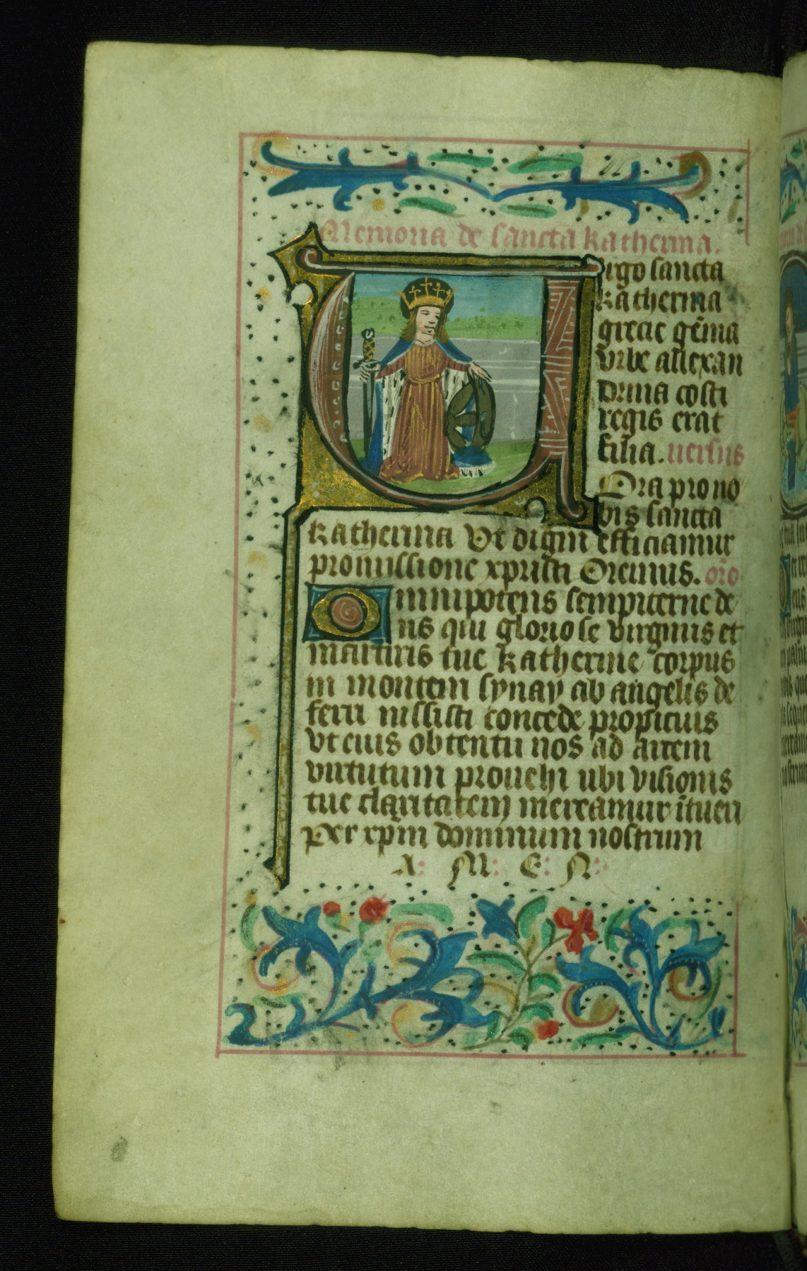 - Contents: Suffrages for saints: fol. 37r: John the Baptist, Inter natos mulierum non surrexit maior iohanne baptista; fol. 37v: Peter and Paul, Petrus apostolus et paulus doctor gentium; fol. 38r: Andrew, Andreas christi famulus dignus deo; fol. 38v: Lawrence, Laurencius homini opus operatus est; fol. 39r: Thomas Becket, Tu per thome sanguinem quem pro te impendit; fol. 39v: Nicholas, Beatus nycholaus ad huc puerulus multo ieiunio; fol. 40r: Mary Magdalene, Maria ergo unxit pedes ihesu et extersit capillis capitis sui; fol. 40v: Catherine, Virgo sancta katherina grecie gemma urbe allexandrina; fol. 41r: Margaret, Erat autem margareta annorum quindecim ab impio olibrio; fol. 41v: Barbara, O pulcra principium rosa dans odorem florent; fol. 42r: Apollonia, O sancta appollonia fuit milita que pro christi nomine dentes extracte; fol. 42v: Scholastica, Accinxit fortitudine lumbos suos et roborauit brachium suum