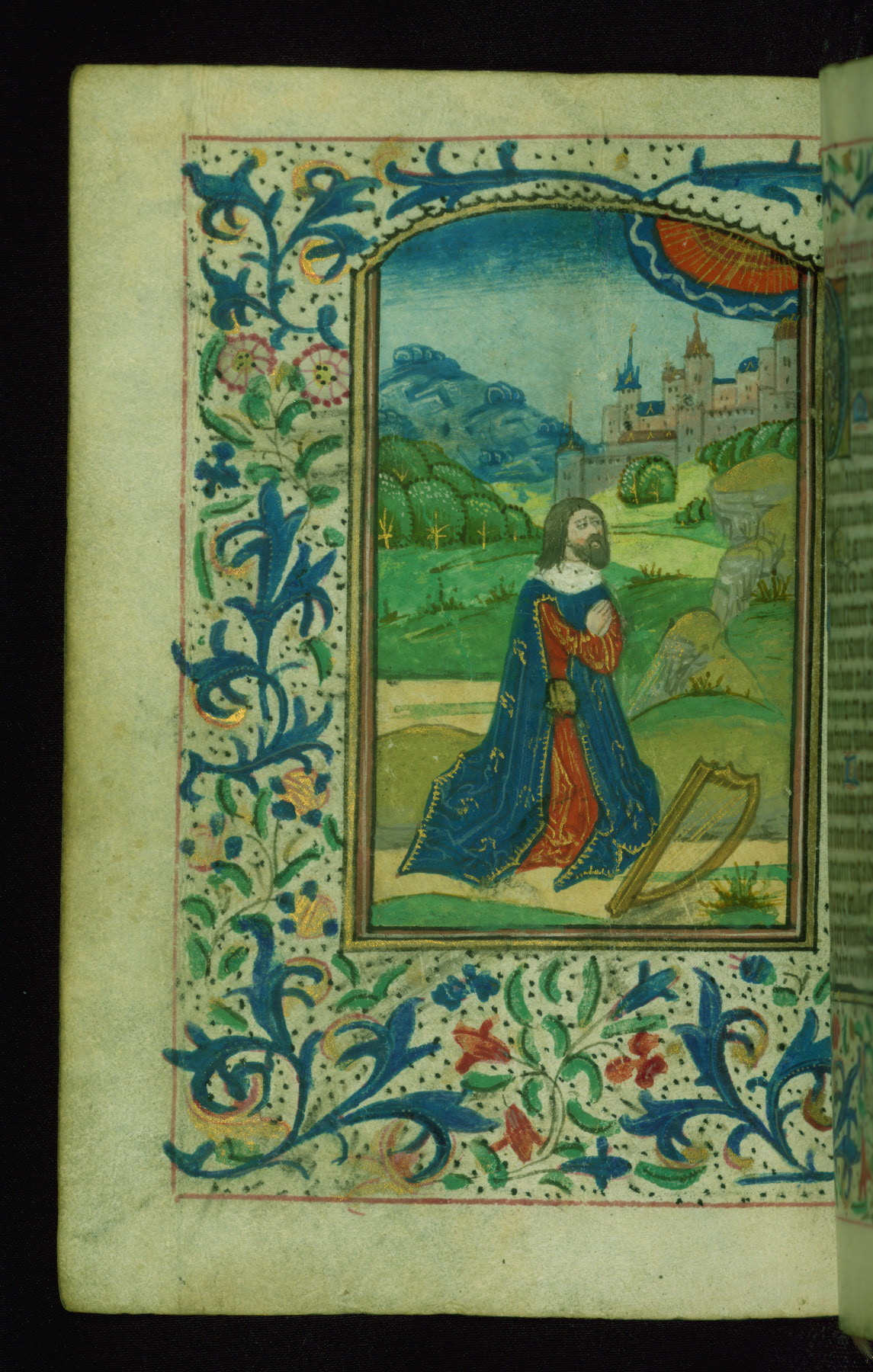 This pocket-size Flemish Book of Hours was created in Bruges between 1460 and 1470. A heavy contingent of South Netherlandish saints in the litany helps localize its production. Although small in scale, it is notable for its abundance of illuminations, nearly thirty extant, by artists working in the style of the prolific mid-fifteenth-century Flemish illuminator Willem Vrelant. Three artists worked on this book. The best painted the full-page miniature of David Penitent on fol. 85v; an able artist painted the other two full-page miniatures; the historiated initials and minor decoration are routine. Several other Books of Hours in the Walters' collection are similar in style to this manuscript, exhibiting the characteristics of the Vrelant circle, notably W.177, W.179, and W.180.