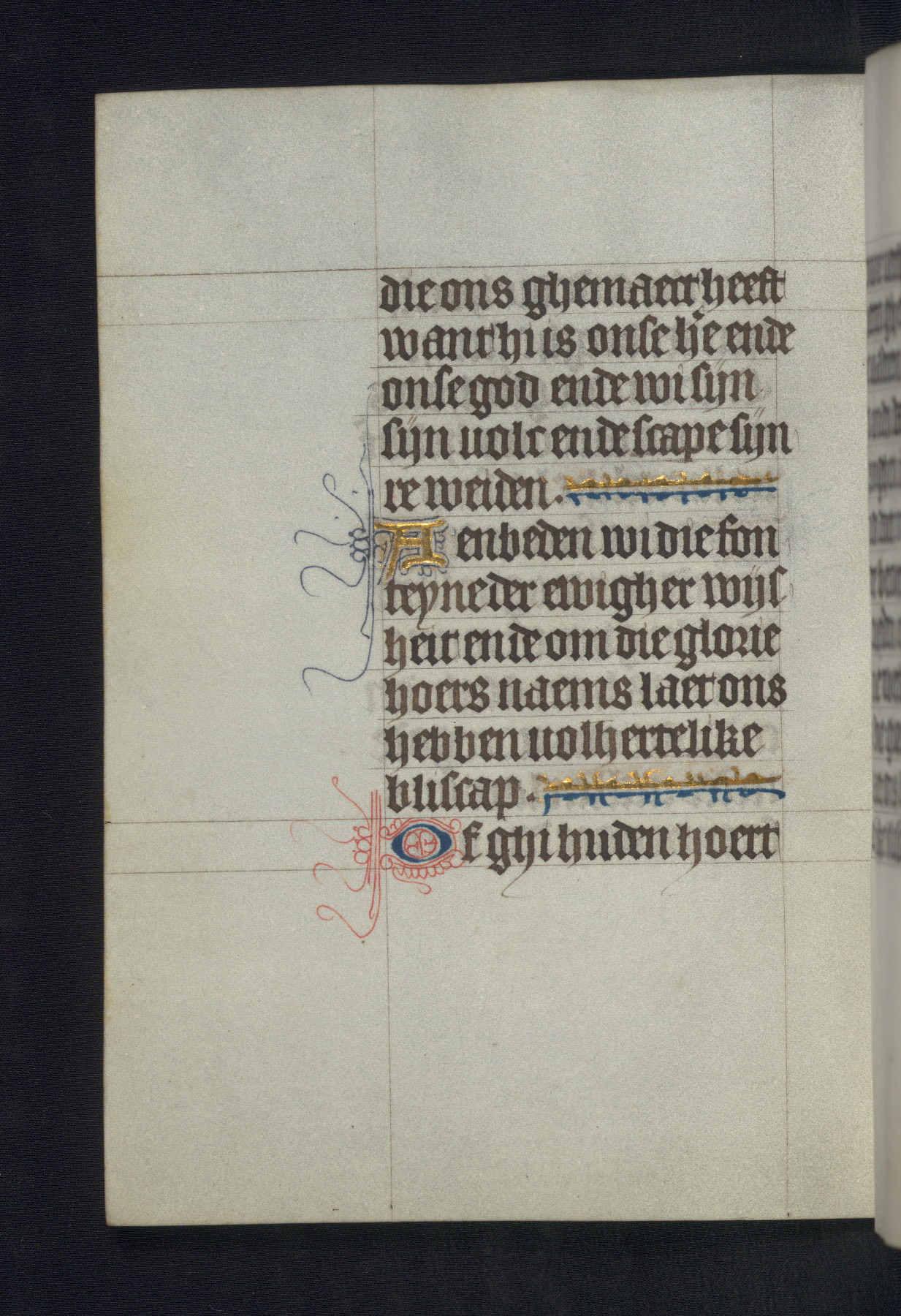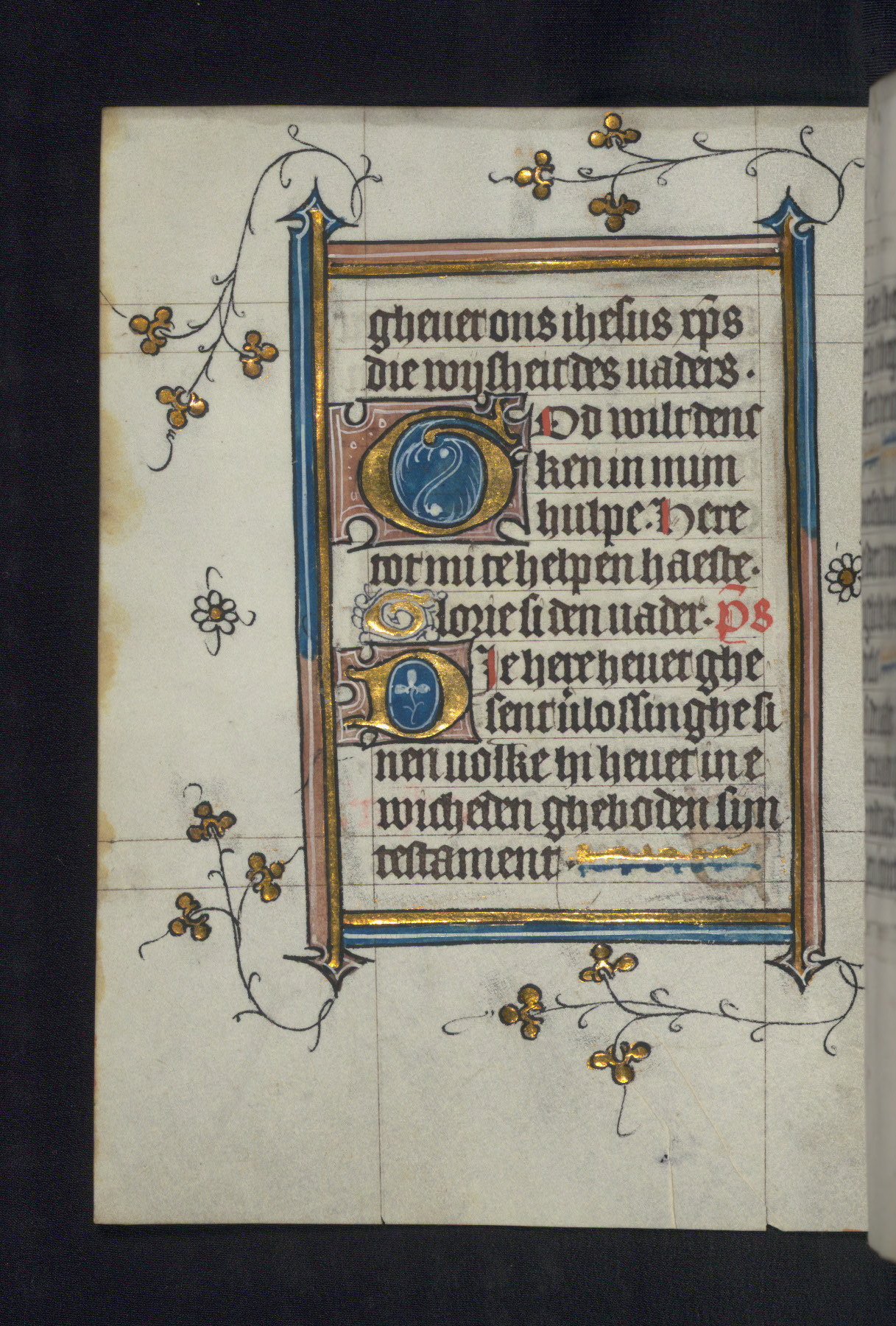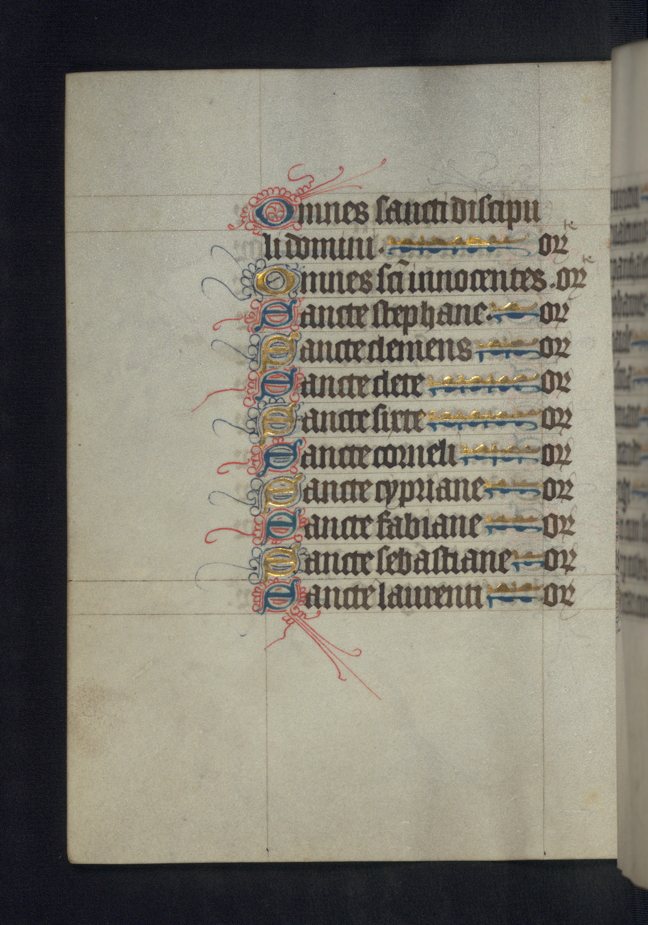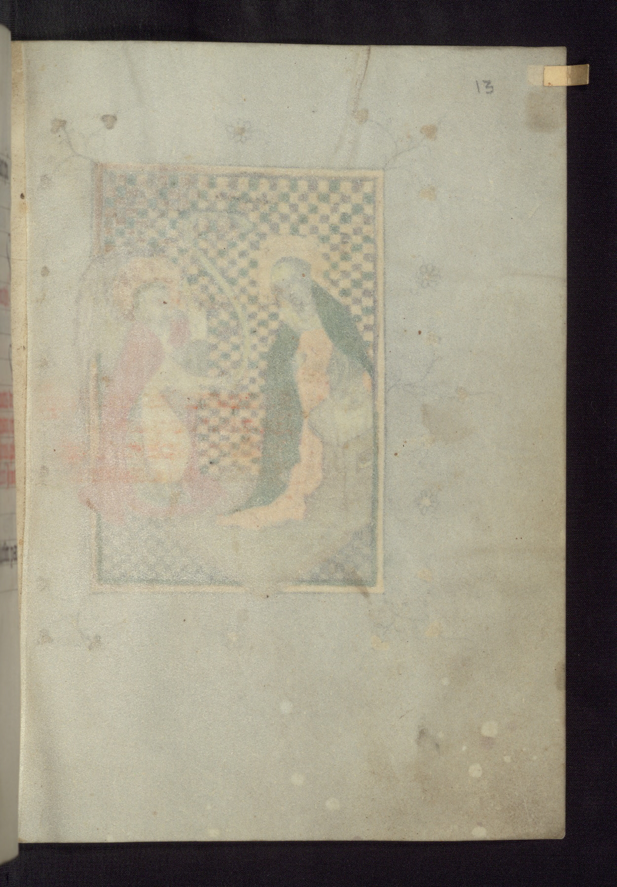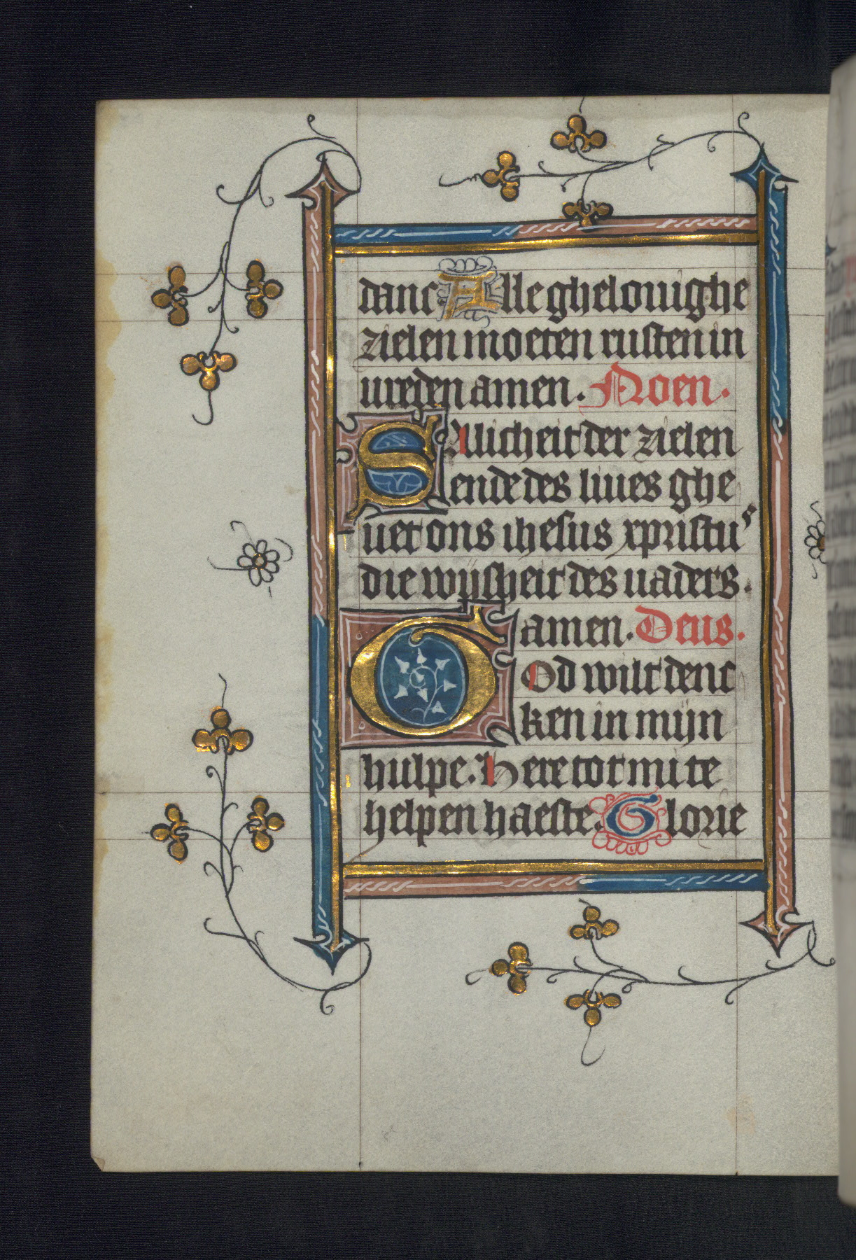 This Book of Hours was named the Doffinnes Hours after Franchoise de Doffinnes, who owned the book in the late sixteenth century and whose family’s subsequent history remains chronicled on the book’s final folios. However, the manuscript was originally made in the first quarter of the fifteenth century, probably for a married couple, who were originally represented kneeling with scrolls and their coats of arms in the margins, flanking a full-page miniature of the Crucifixion (fol. 72v), but whose figures and arms were later erased and overpainted with white. The manuscript contains both Latin and Dutch texts, supplemented by twelve full-page miniatures, the work of the Master of Walters 185. The manuscript also contains twelve pen-and-ink decorated initials in the calendar, some with grotesque faces, and letter "G" descenders throughout the book that can be attributed to the scribe Johannes de Malborch. The book’s original Dutch provenance is indicated by its calendar (for the Use of Utrecht) and its Hours of the Virgin, which follows predominantly the Use of the Windesheim Congregation. Prayers in Dutch were added to the end of the volume in the late fifteenth or early sixteenth century, and the book was subsequently rebound with its current cream-colored parchment binding of the seventeenth or eighteenth century.