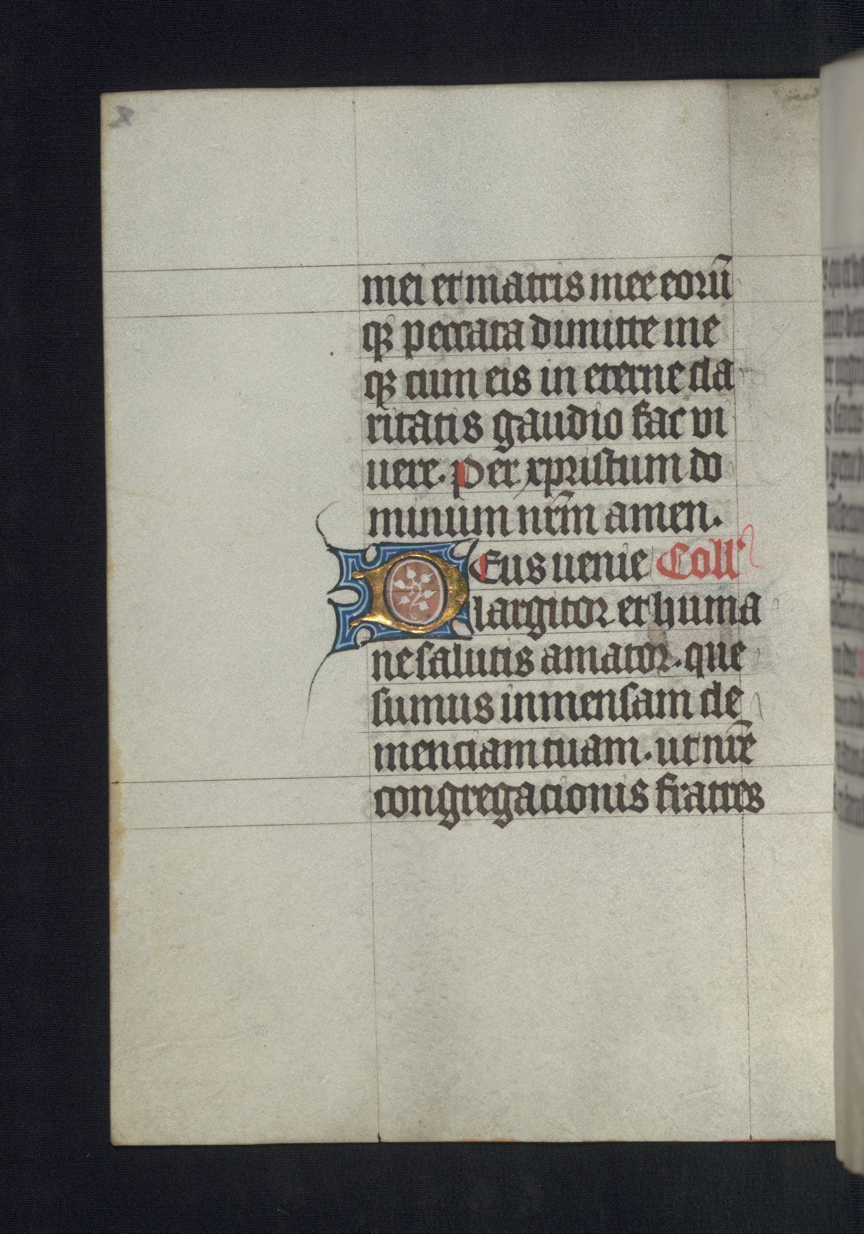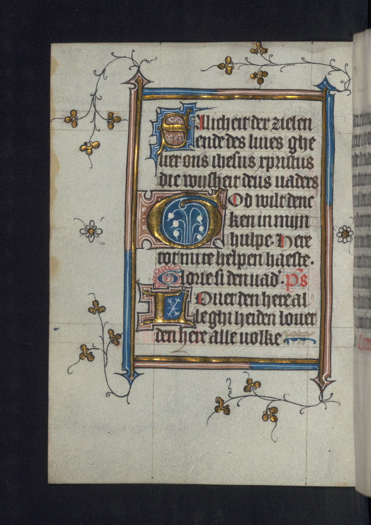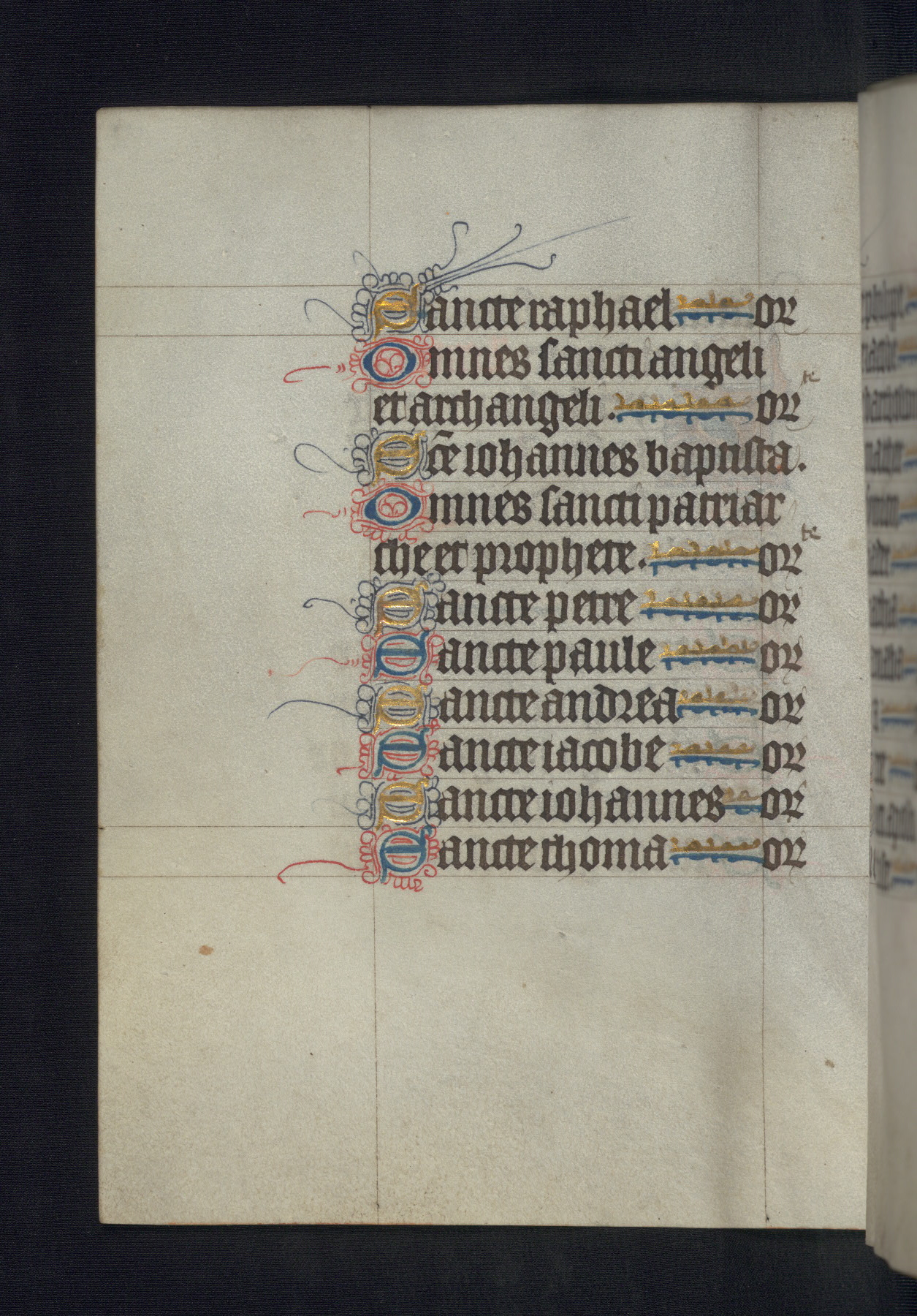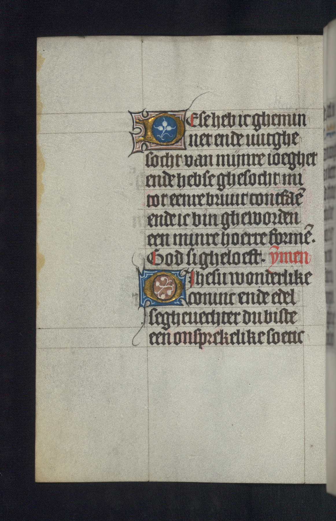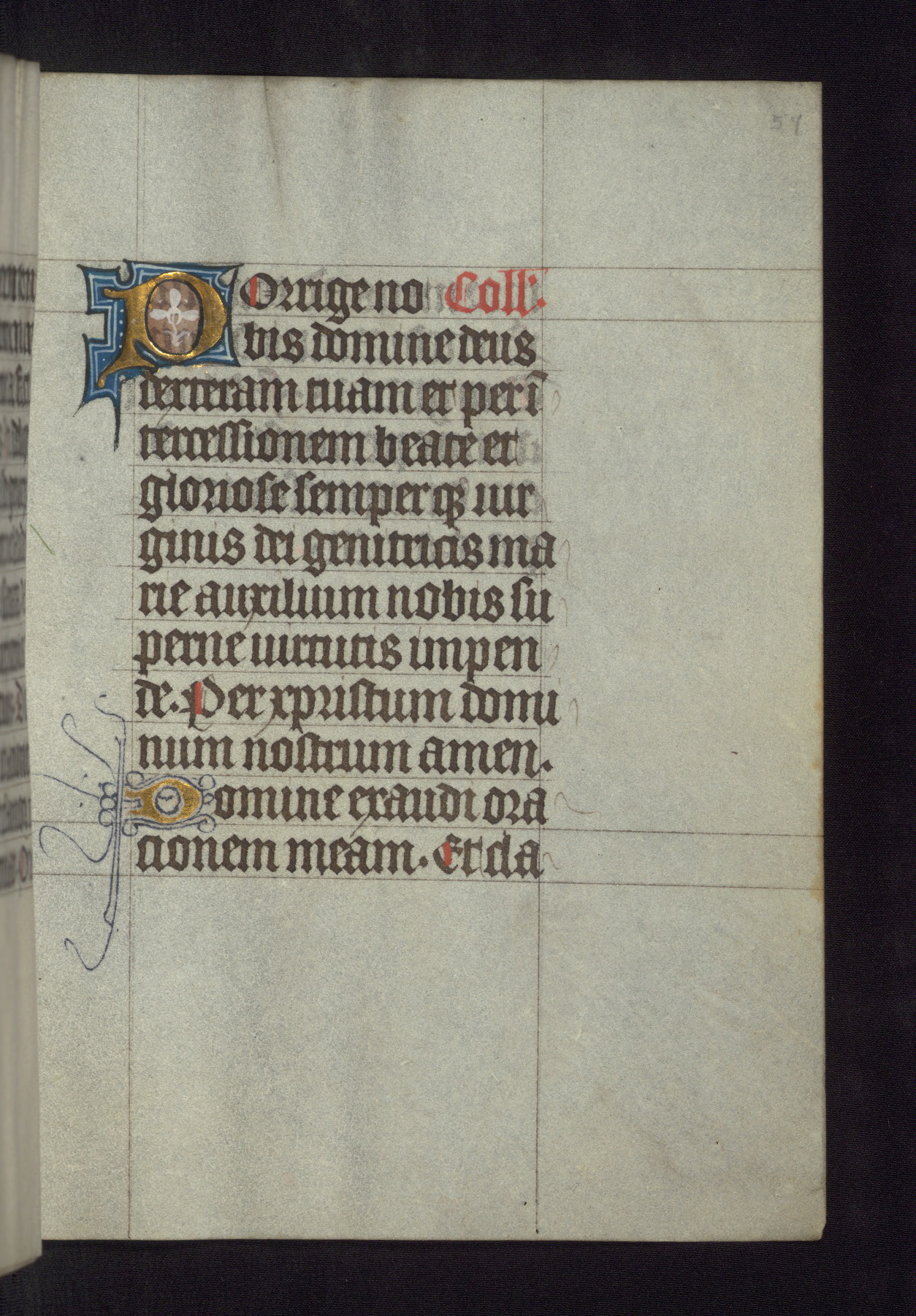 This Book of Hours was named the Doffinnes Hours after Franchoise de Doffinnes, who owned the book in the late sixteenth century and whose family’s subsequent history remains chronicled on the book’s final folios. However, the manuscript was originally made in the first quarter of the fifteenth century, probably for a married couple, who were originally represented kneeling with scrolls and their coats of arms in the margins, flanking a full-page miniature of the Crucifixion (fol. 72v), but whose figures and arms were later erased and overpainted with white. The manuscript contains both Latin and Dutch texts, supplemented by twelve full-page miniatures, the work of the Master of Walters 185. The manuscript also contains twelve pen-and-ink decorated initials in the calendar, some with grotesque faces, and letter "G" descenders throughout the book that can be attributed to the scribe Johannes de Malborch. The book’s original Dutch provenance is indicated by its calendar (for the Use of Utrecht) and its Hours of the Virgin, which follows predominantly the Use of the Windesheim Congregation. Prayers in Dutch were added to the end of the volume in the late fifteenth or early sixteenth century, and the book was subsequently rebound with its current cream-colored parchment binding of the seventeenth or eighteenth century.