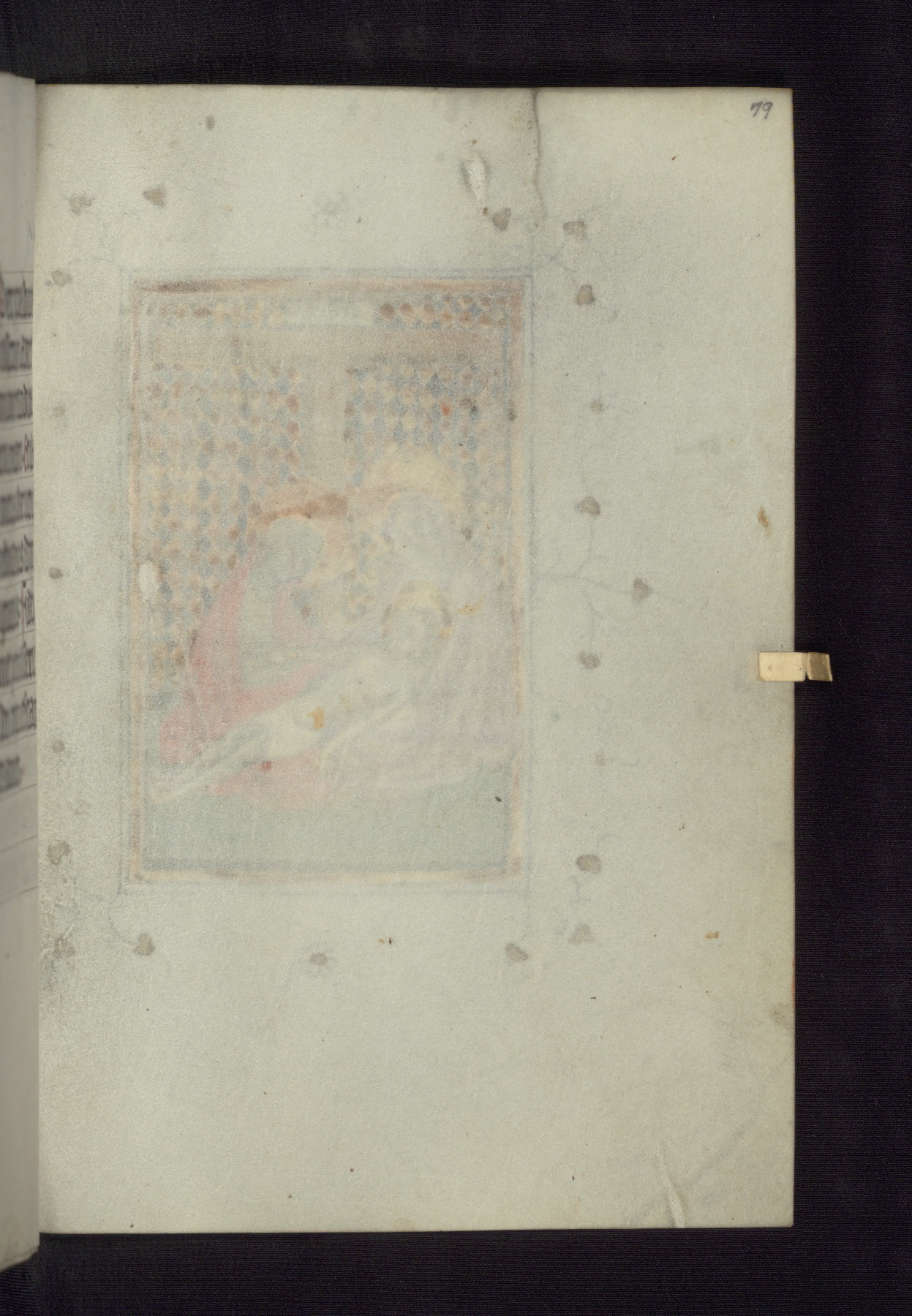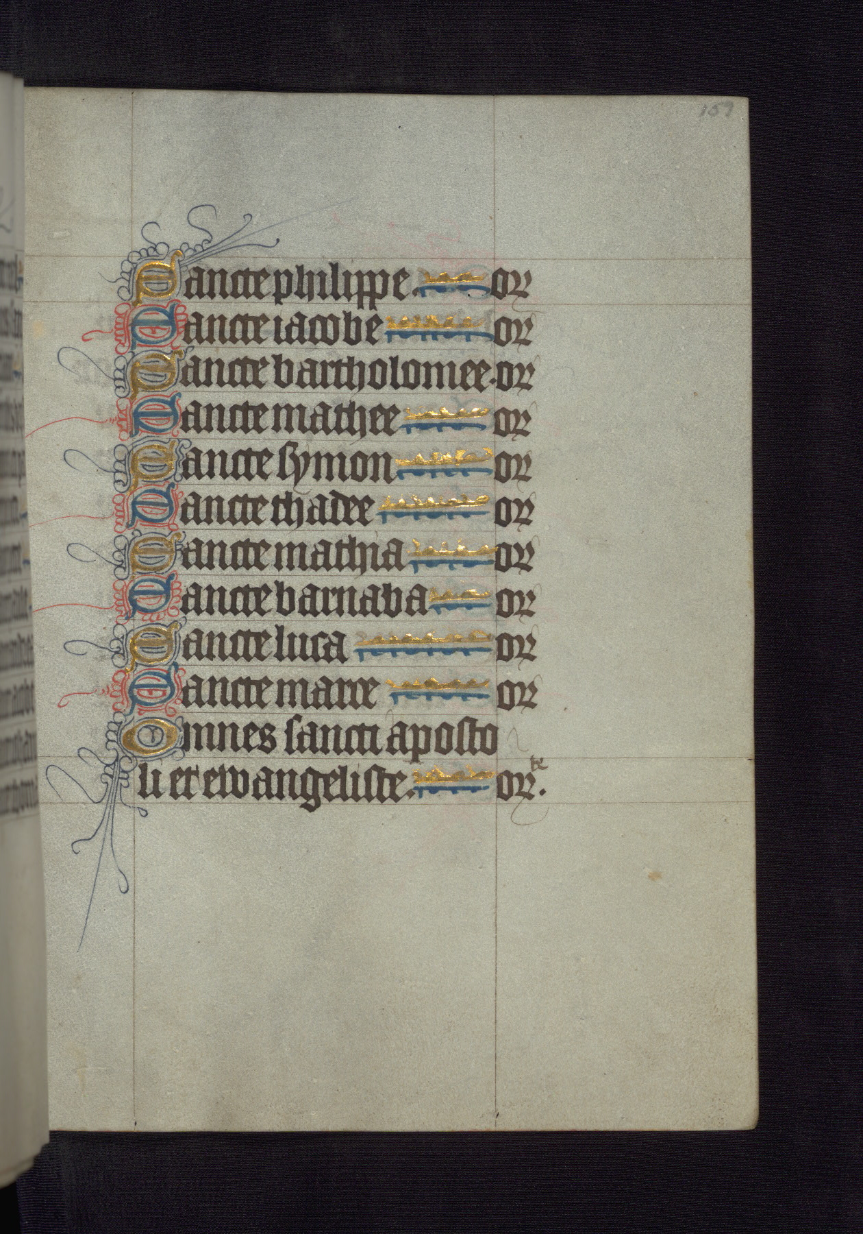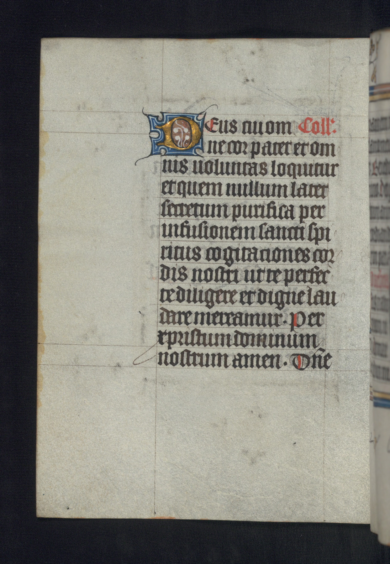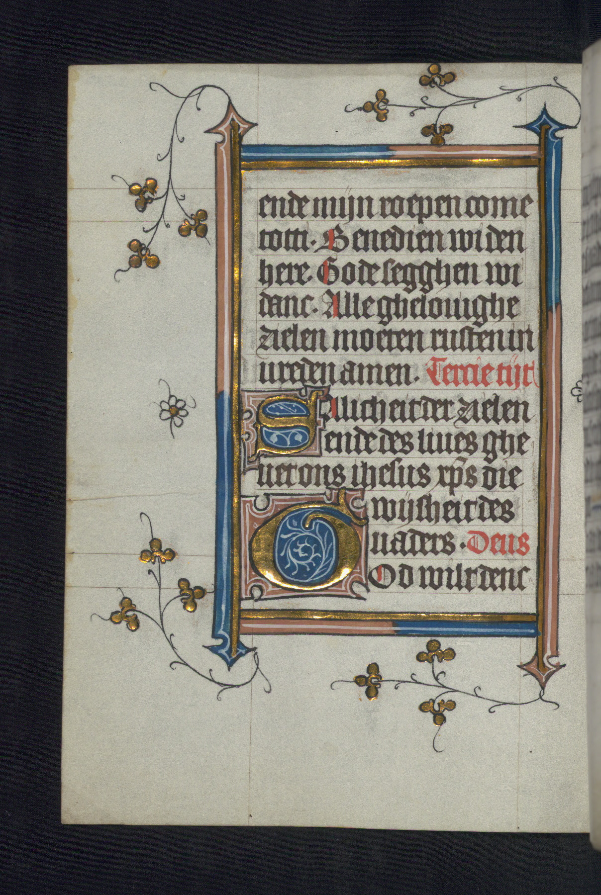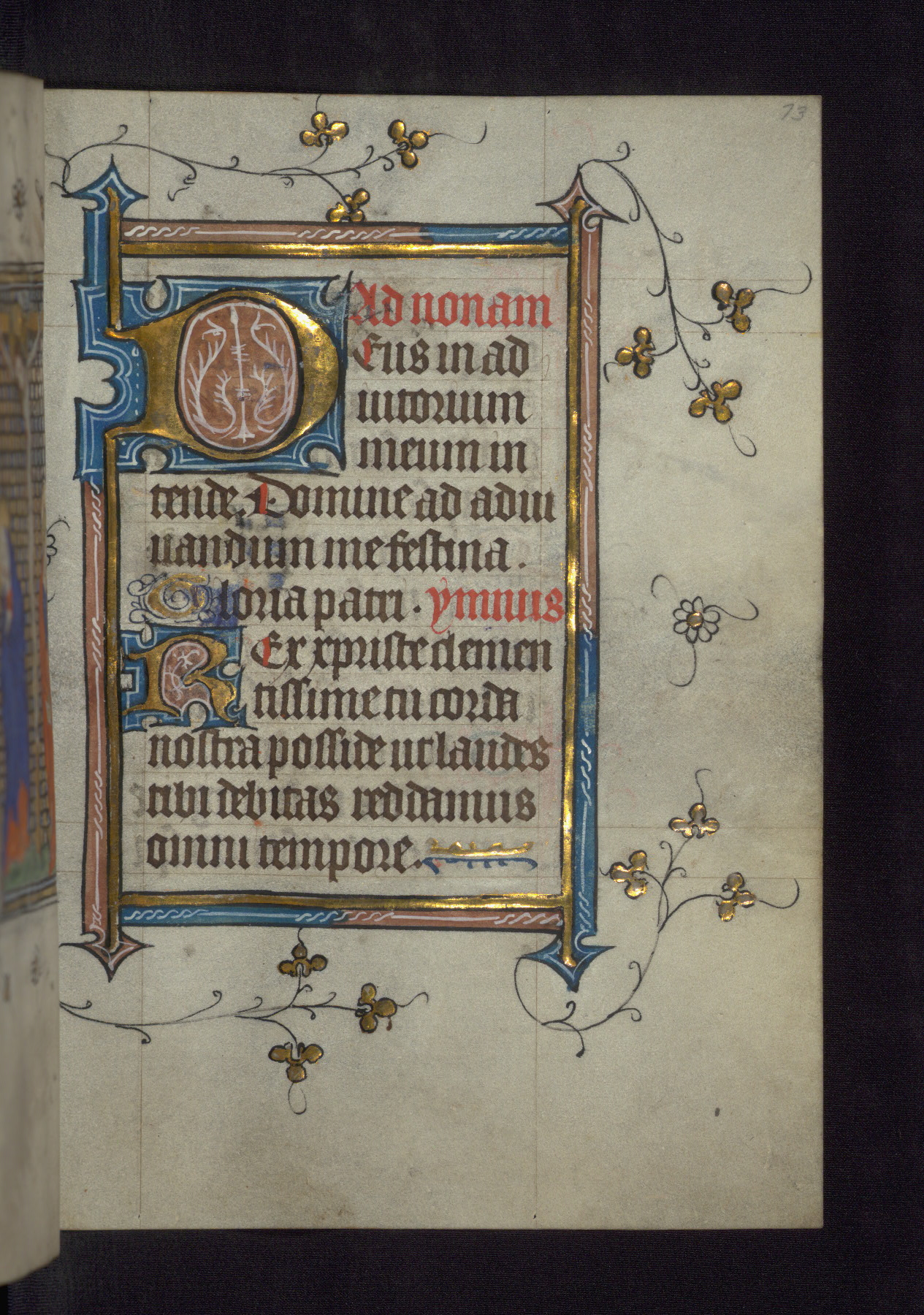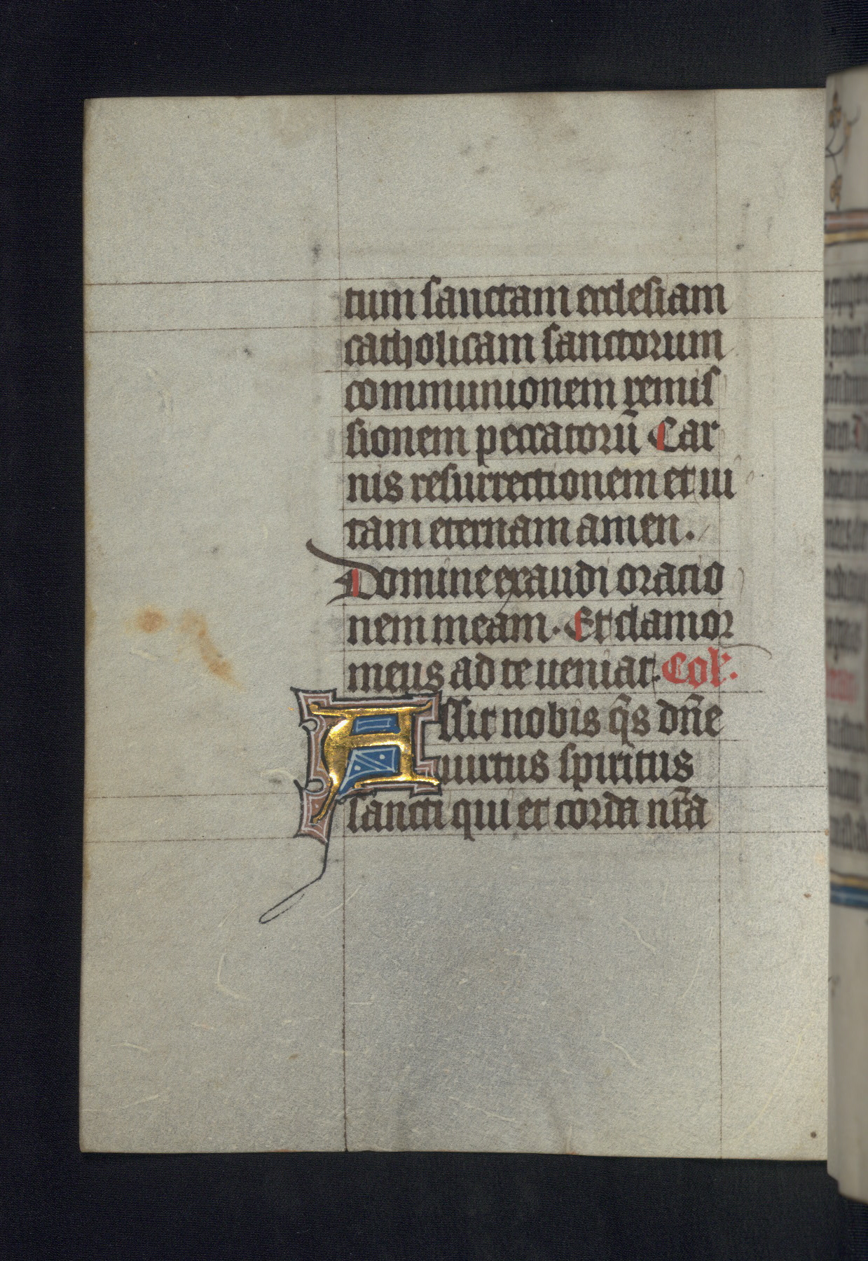 This Book of Hours was named the Doffinnes Hours after Franchoise de Doffinnes, who owned the book in the late sixteenth century and whose family’s subsequent history remains chronicled on the book’s final folios. However, the manuscript was originally made in the first quarter of the fifteenth century, probably for a married couple, who were originally represented kneeling with scrolls and their coats of arms in the margins, flanking a full-page miniature of the Crucifixion (fol. 72v), but whose figures and arms were later erased and overpainted with white. The manuscript contains both Latin and Dutch texts, supplemented by twelve full-page miniatures, the work of the Master of Walters 185. The manuscript also contains twelve pen-and-ink decorated initials in the calendar, some with grotesque faces, and letter "G" descenders throughout the book that can be attributed to the scribe Johannes de Malborch. The book’s original Dutch provenance is indicated by its calendar (for the Use of Utrecht) and its Hours of the Virgin, which follows predominantly the Use of the Windesheim Congregation. Prayers in Dutch were added to the end of the volume in the late fifteenth or early sixteenth century, and the book was subsequently rebound with its current cream-colored parchment binding of the seventeenth or eighteenth century.
