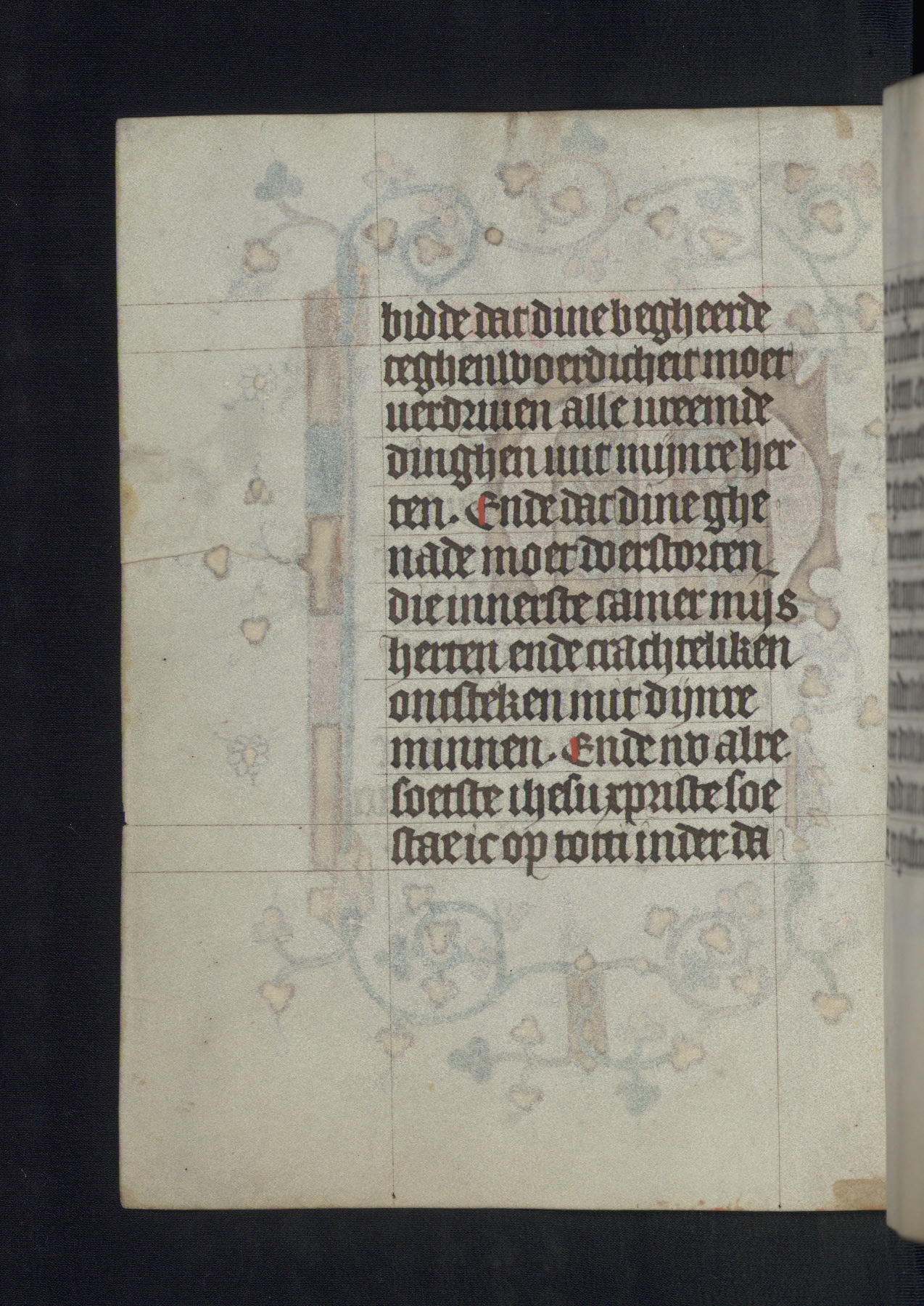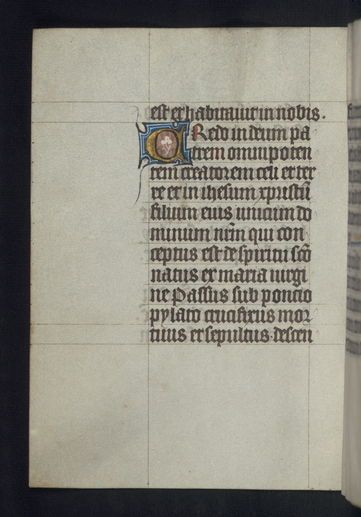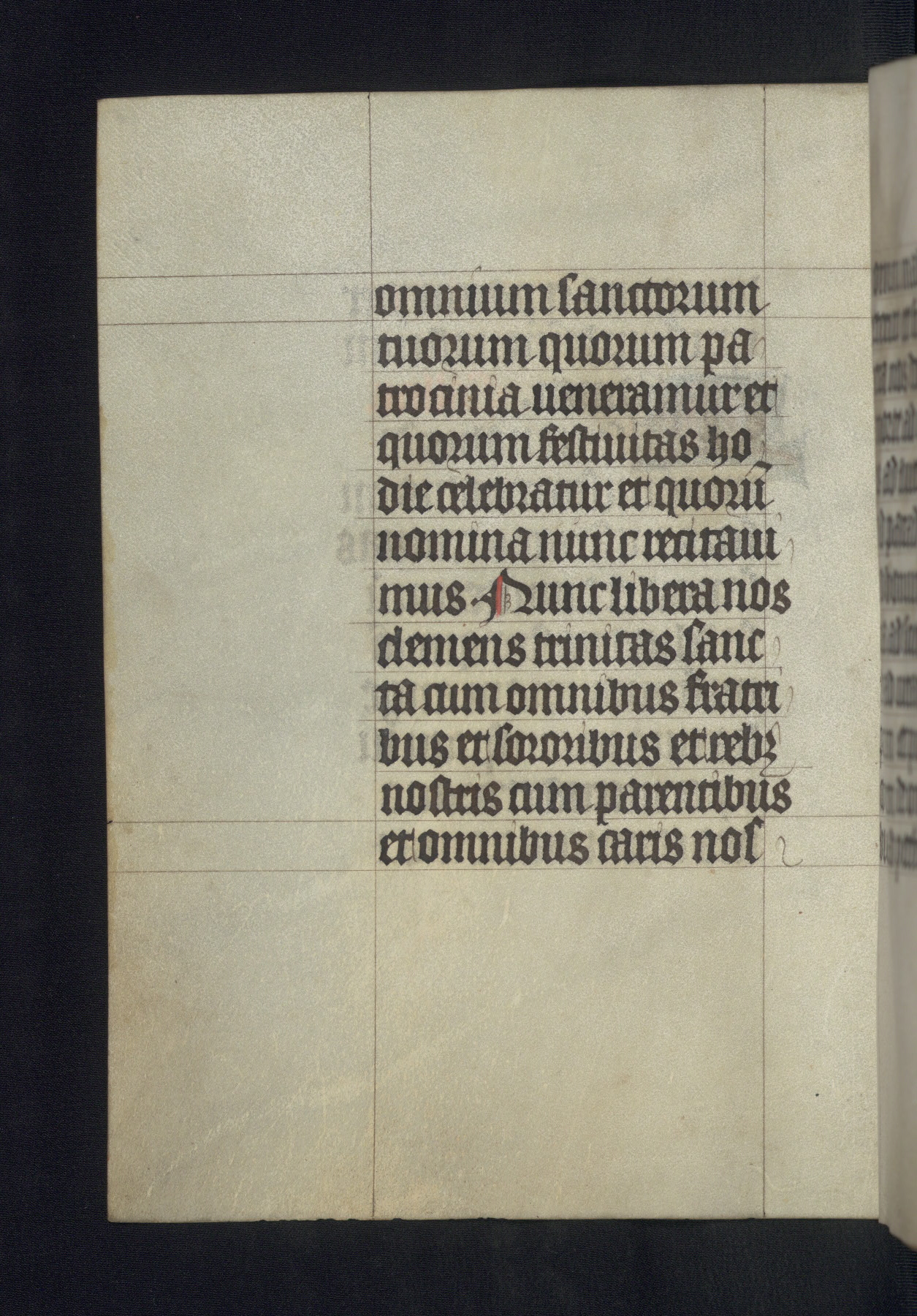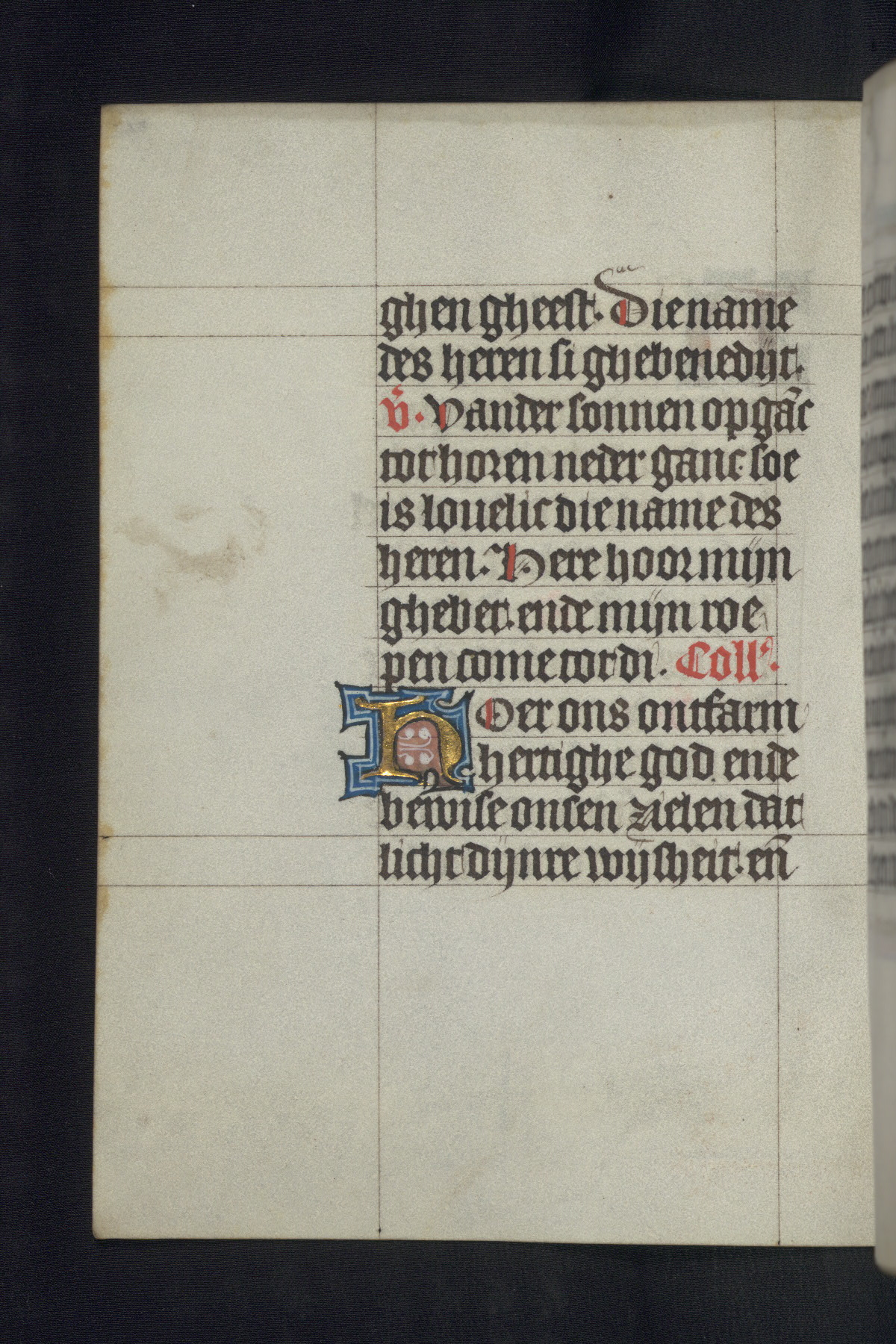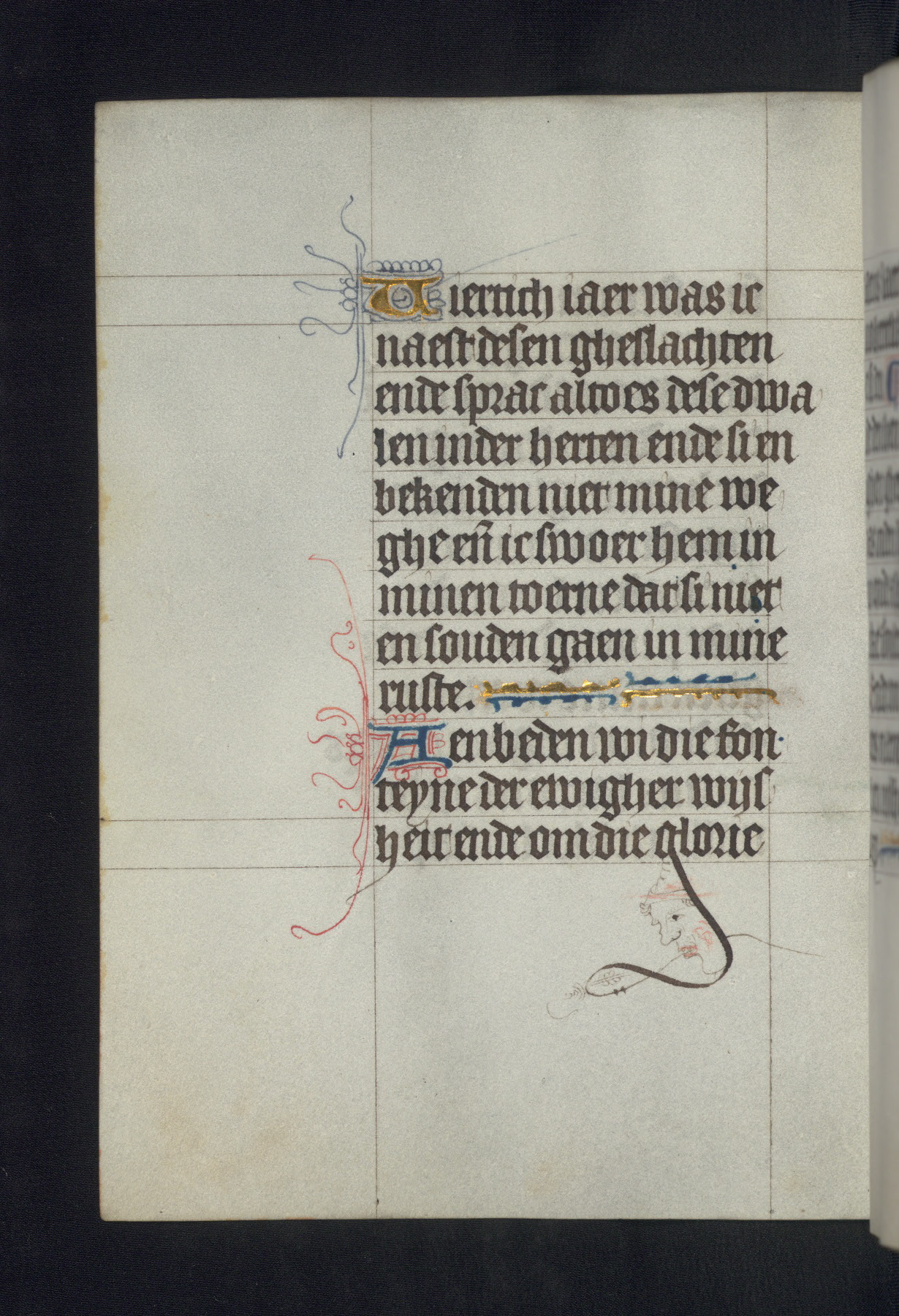 This Book of Hours was named the Doffinnes Hours after Franchoise de Doffinnes, who owned the book in the late sixteenth century and whose family’s subsequent history remains chronicled on the book’s final folios. However, the manuscript was originally made in the first quarter of the fifteenth century, probably for a married couple, who were originally represented kneeling with scrolls and their coats of arms in the margins, flanking a full-page miniature of the Crucifixion (fol. 72v), but whose figures and arms were later erased and overpainted with white. The manuscript contains both Latin and Dutch texts, supplemented by twelve full-page miniatures, the work of the Master of Walters 185. The manuscript also contains twelve pen-and-ink decorated initials in the calendar, some with grotesque faces, and letter "G" descenders throughout the book that can be attributed to the scribe Johannes de Malborch. The book’s original Dutch provenance is indicated by its calendar (for the Use of Utrecht) and its Hours of the Virgin, which follows predominantly the Use of the Windesheim Congregation. Prayers in Dutch were added to the end of the volume in the late fifteenth or early sixteenth century, and the book was subsequently rebound with its current cream-colored parchment binding of the seventeenth or eighteenth century.