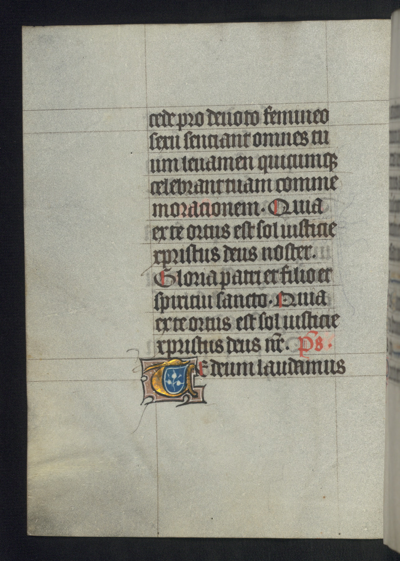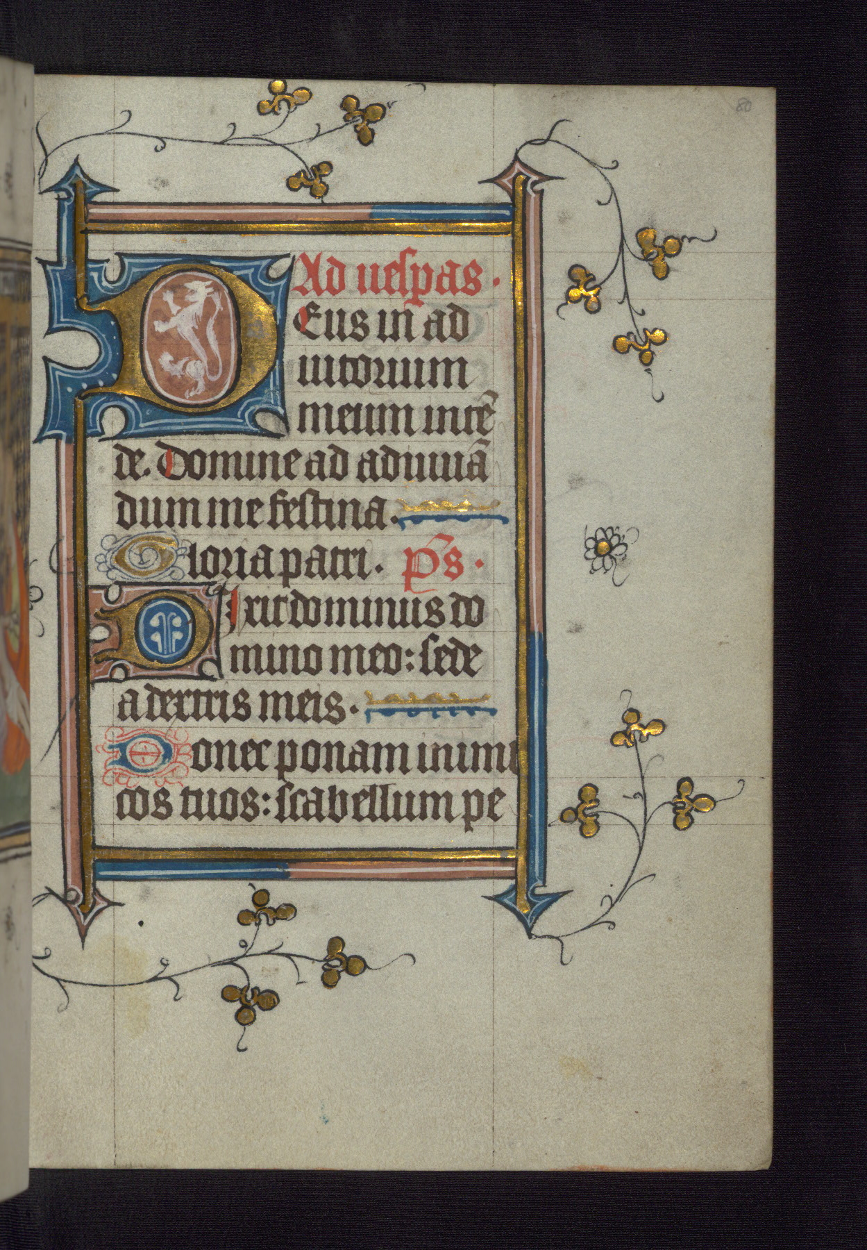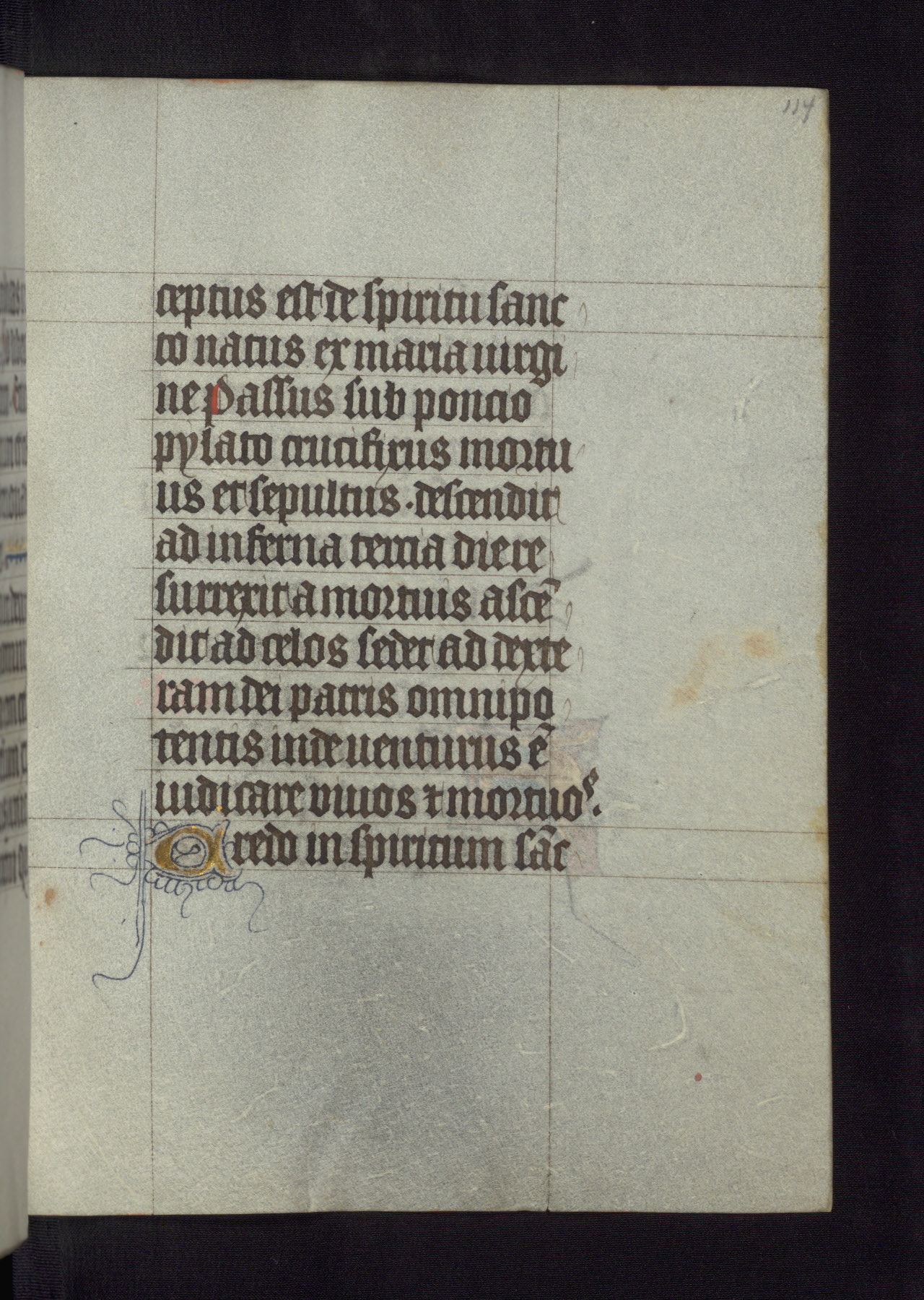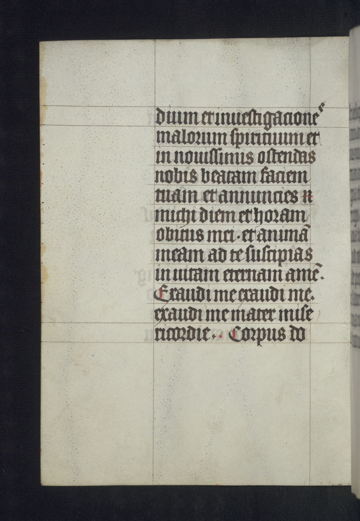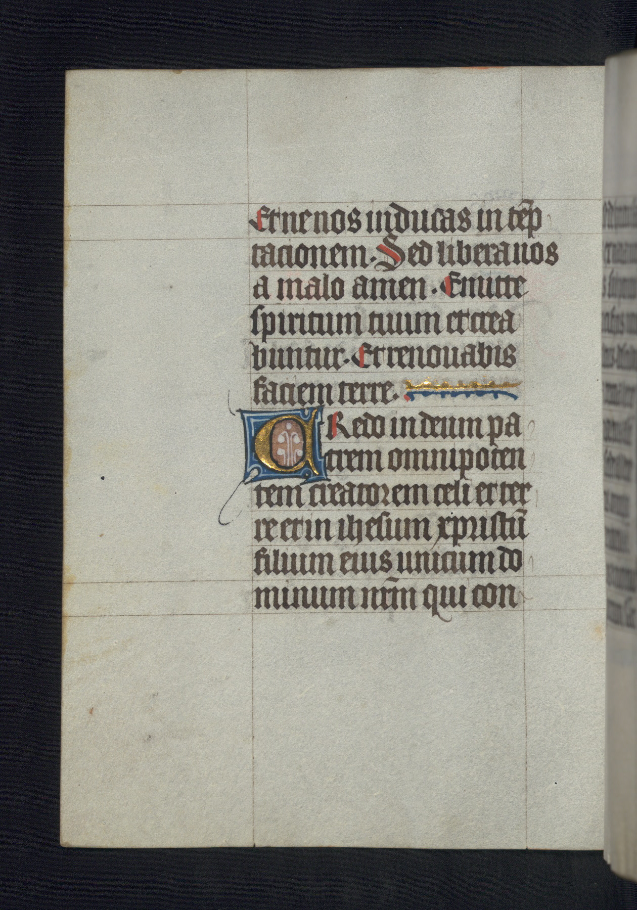 This Book of Hours was named the Doffinnes Hours after Franchoise de Doffinnes, who owned the book in the late sixteenth century and whose family’s subsequent history remains chronicled on the book’s final folios. However, the manuscript was originally made in the first quarter of the fifteenth century, probably for a married couple, who were originally represented kneeling with scrolls and their coats of arms in the margins, flanking a full-page miniature of the Crucifixion (fol. 72v), but whose figures and arms were later erased and overpainted with white. The manuscript contains both Latin and Dutch texts, supplemented by twelve full-page miniatures, the work of the Master of Walters 185. The manuscript also contains twelve pen-and-ink decorated initials in the calendar, some with grotesque faces, and letter "G" descenders throughout the book that can be attributed to the scribe Johannes de Malborch. The book’s original Dutch provenance is indicated by its calendar (for the Use of Utrecht) and its Hours of the Virgin, which follows predominantly the Use of the Windesheim Congregation. Prayers in Dutch were added to the end of the volume in the late fifteenth or early sixteenth century, and the book was subsequently rebound with its current cream-colored parchment binding of the seventeenth or eighteenth century.