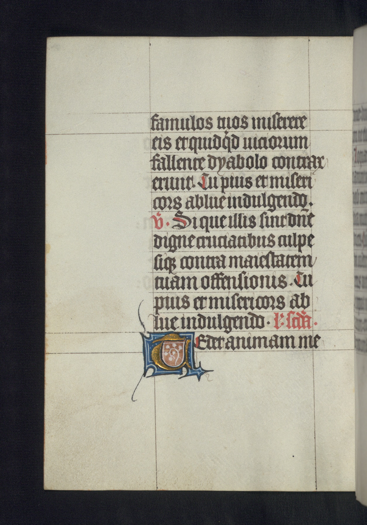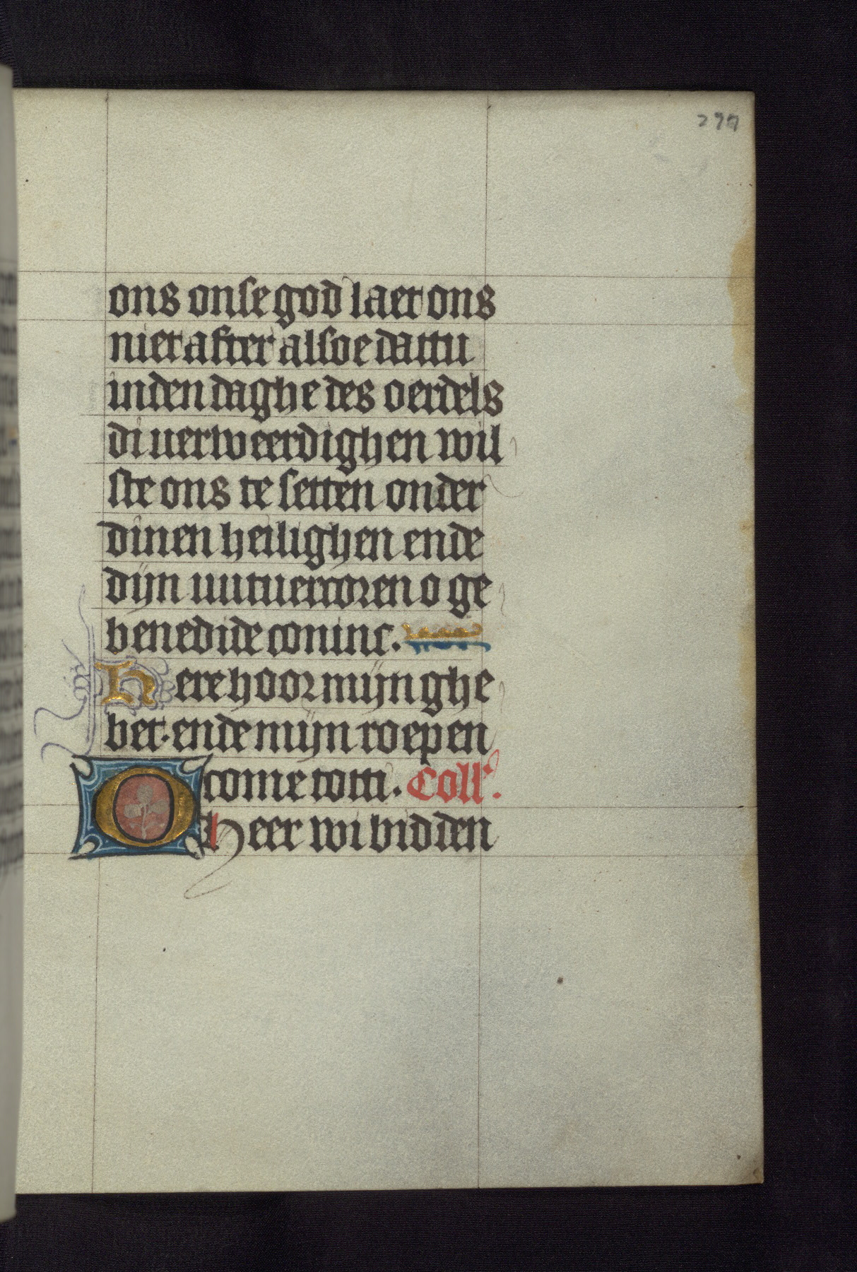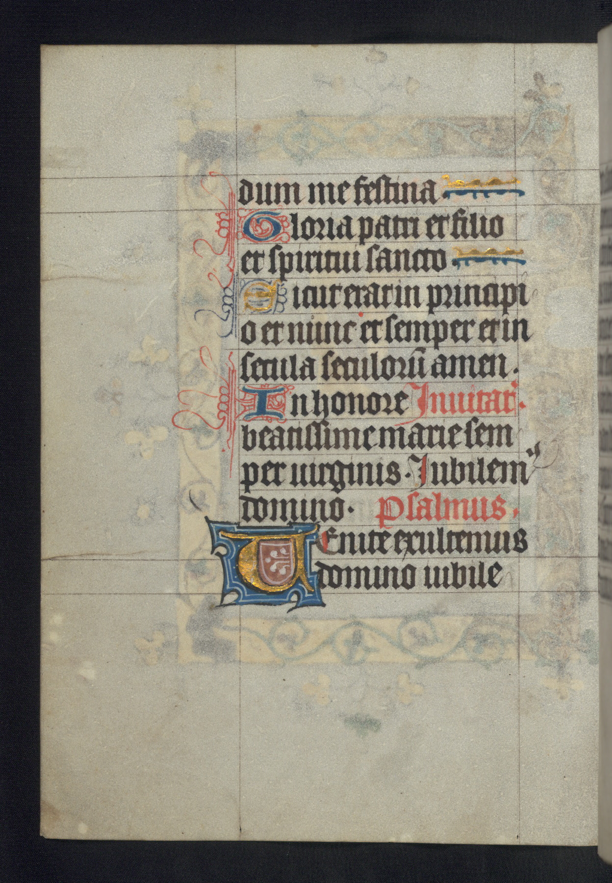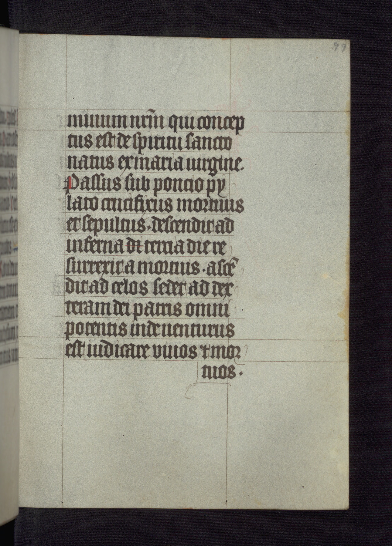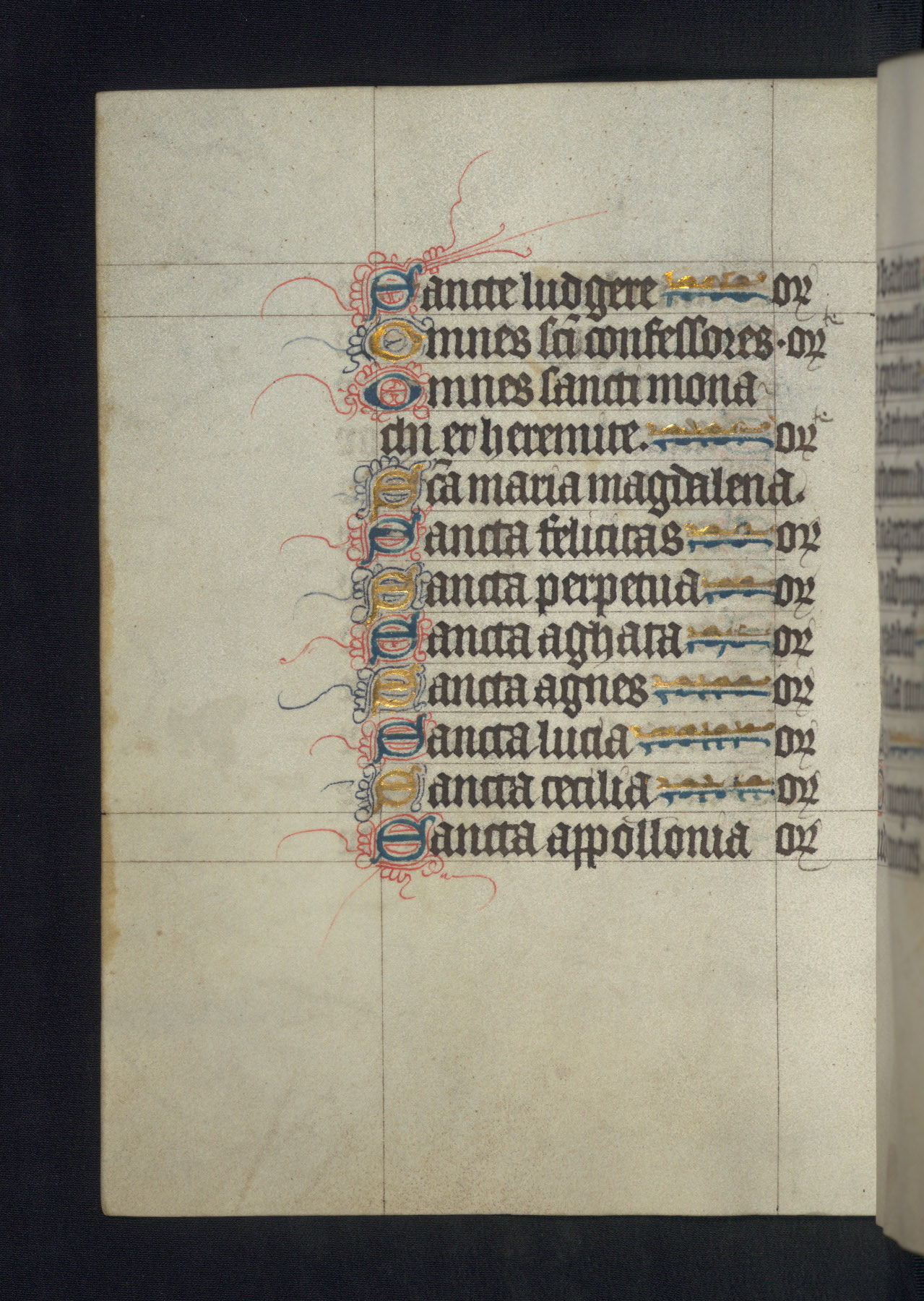 This Book of Hours was named the Doffinnes Hours after Franchoise de Doffinnes, who owned the book in the late sixteenth century and whose family’s subsequent history remains chronicled on the book’s final folios. However, the manuscript was originally made in the first quarter of the fifteenth century, probably for a married couple, who were originally represented kneeling with scrolls and their coats of arms in the margins, flanking a full-page miniature of the Crucifixion (fol. 72v), but whose figures and arms were later erased and overpainted with white. The manuscript contains both Latin and Dutch texts, supplemented by twelve full-page miniatures, the work of the Master of Walters 185. The manuscript also contains twelve pen-and-ink decorated initials in the calendar, some with grotesque faces, and letter "G" descenders throughout the book that can be attributed to the scribe Johannes de Malborch. The book’s original Dutch provenance is indicated by its calendar (for the Use of Utrecht) and its Hours of the Virgin, which follows predominantly the Use of the Windesheim Congregation. Prayers in Dutch were added to the end of the volume in the late fifteenth or early sixteenth century, and the book was subsequently rebound with its current cream-colored parchment binding of the seventeenth or eighteenth century.