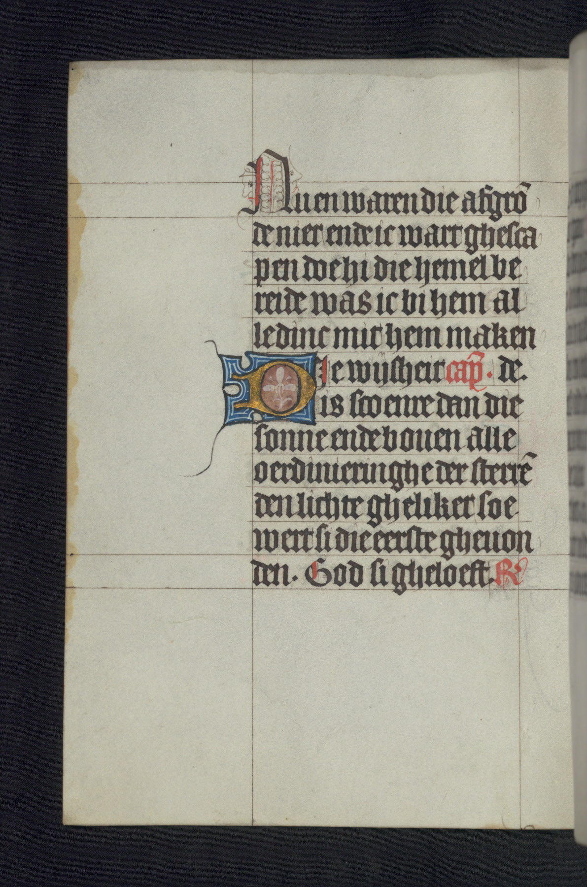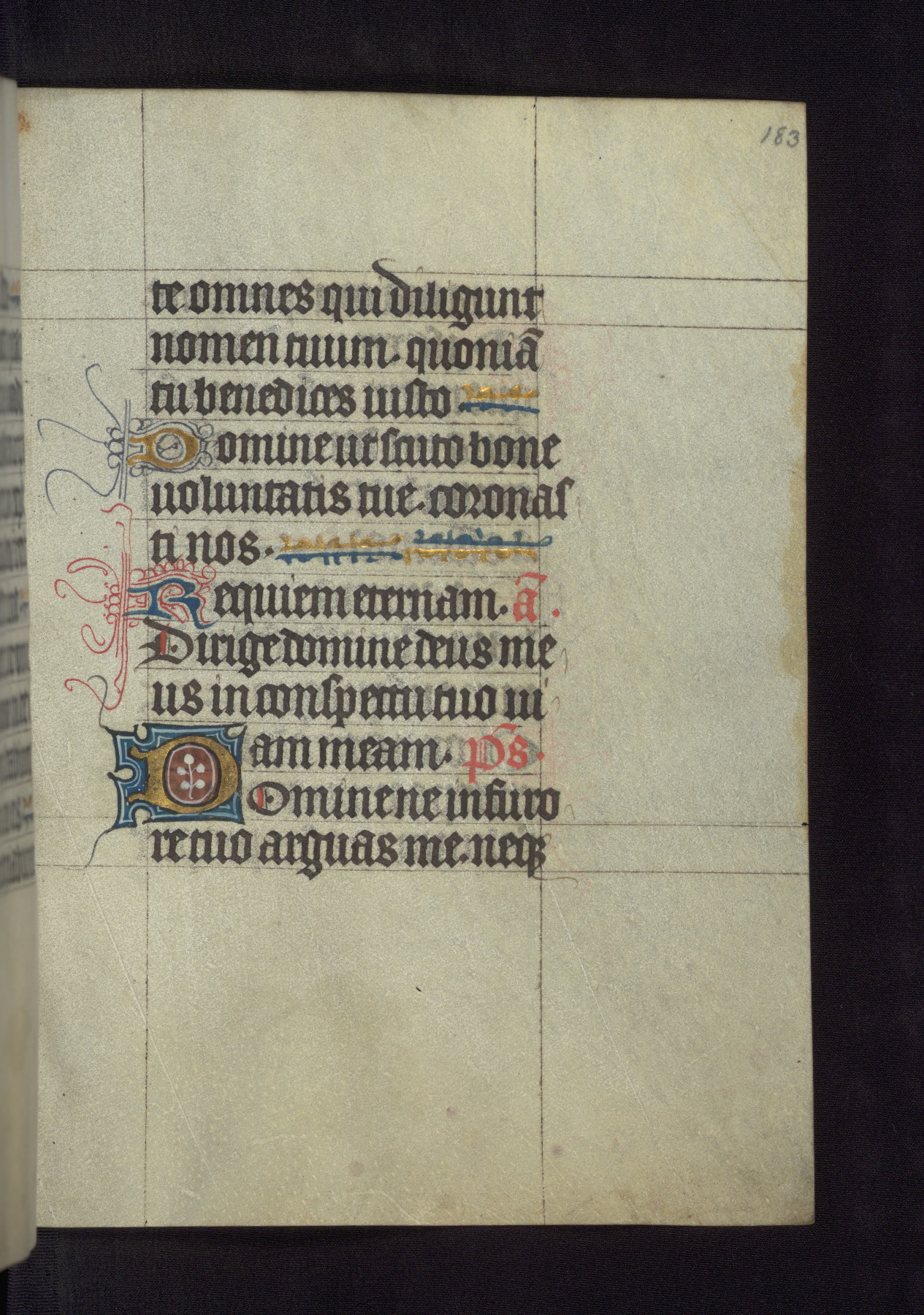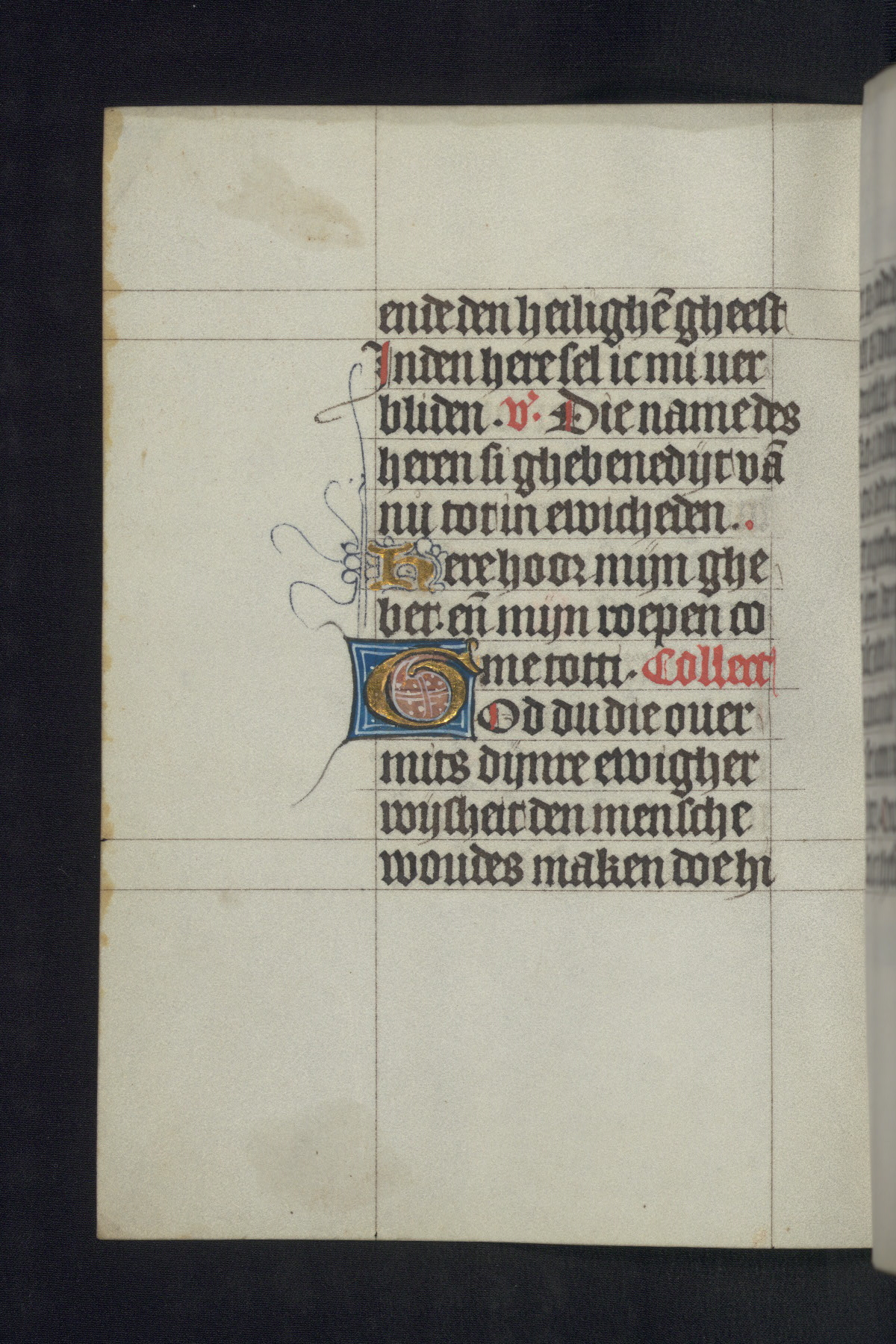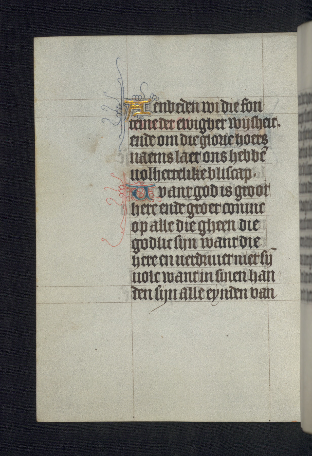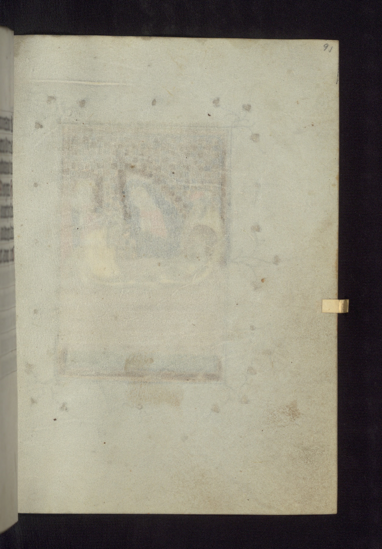 This Book of Hours was named the Doffinnes Hours after Franchoise de Doffinnes, who owned the book in the late sixteenth century and whose family’s subsequent history remains chronicled on the book’s final folios. However, the manuscript was originally made in the first quarter of the fifteenth century, probably for a married couple, who were originally represented kneeling with scrolls and their coats of arms in the margins, flanking a full-page miniature of the Crucifixion (fol. 72v), but whose figures and arms were later erased and overpainted with white. The manuscript contains both Latin and Dutch texts, supplemented by twelve full-page miniatures, the work of the Master of Walters 185. The manuscript also contains twelve pen-and-ink decorated initials in the calendar, some with grotesque faces, and letter "G" descenders throughout the book that can be attributed to the scribe Johannes de Malborch. The book’s original Dutch provenance is indicated by its calendar (for the Use of Utrecht) and its Hours of the Virgin, which follows predominantly the Use of the Windesheim Congregation. Prayers in Dutch were added to the end of the volume in the late fifteenth or early sixteenth century, and the book was subsequently rebound with its current cream-colored parchment binding of the seventeenth or eighteenth century.