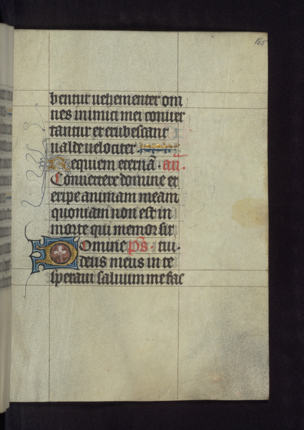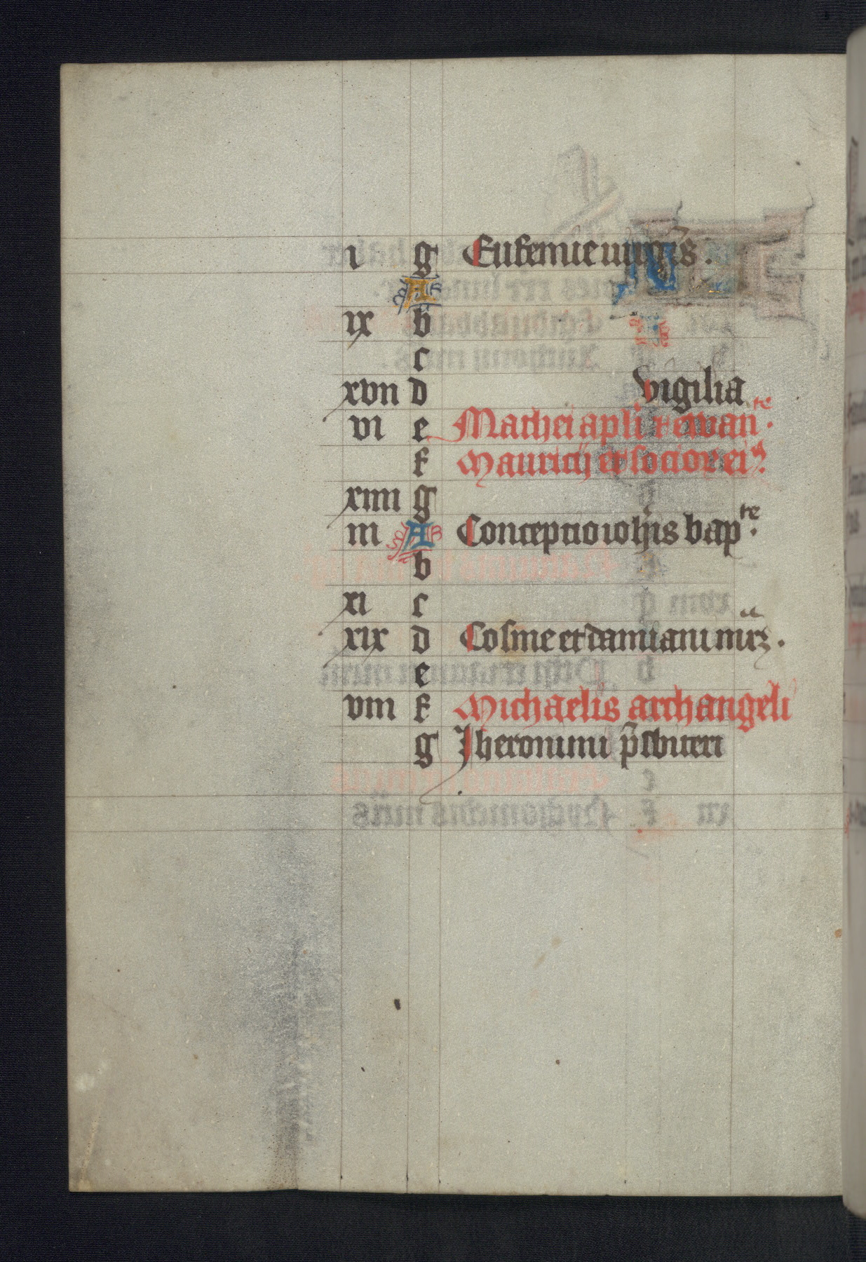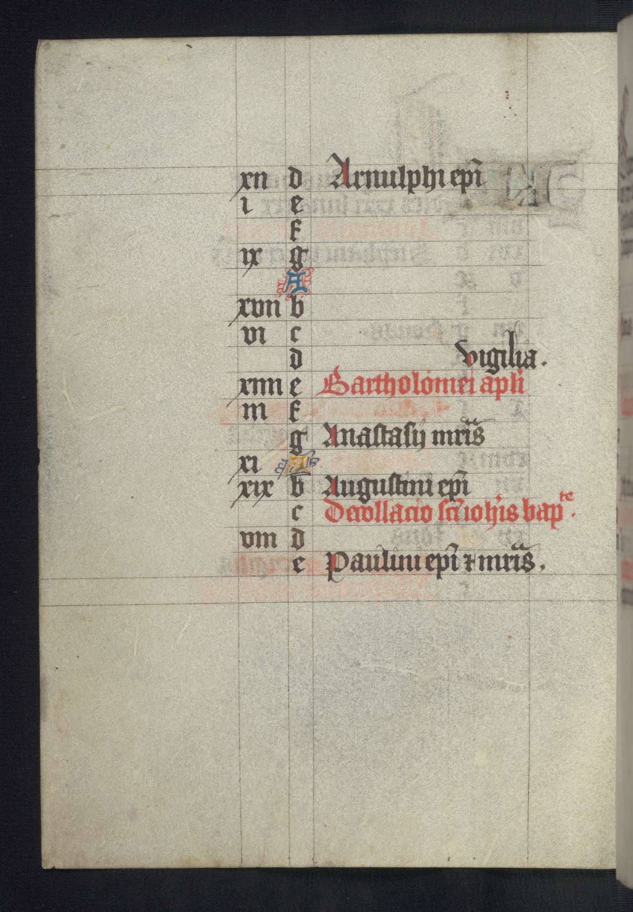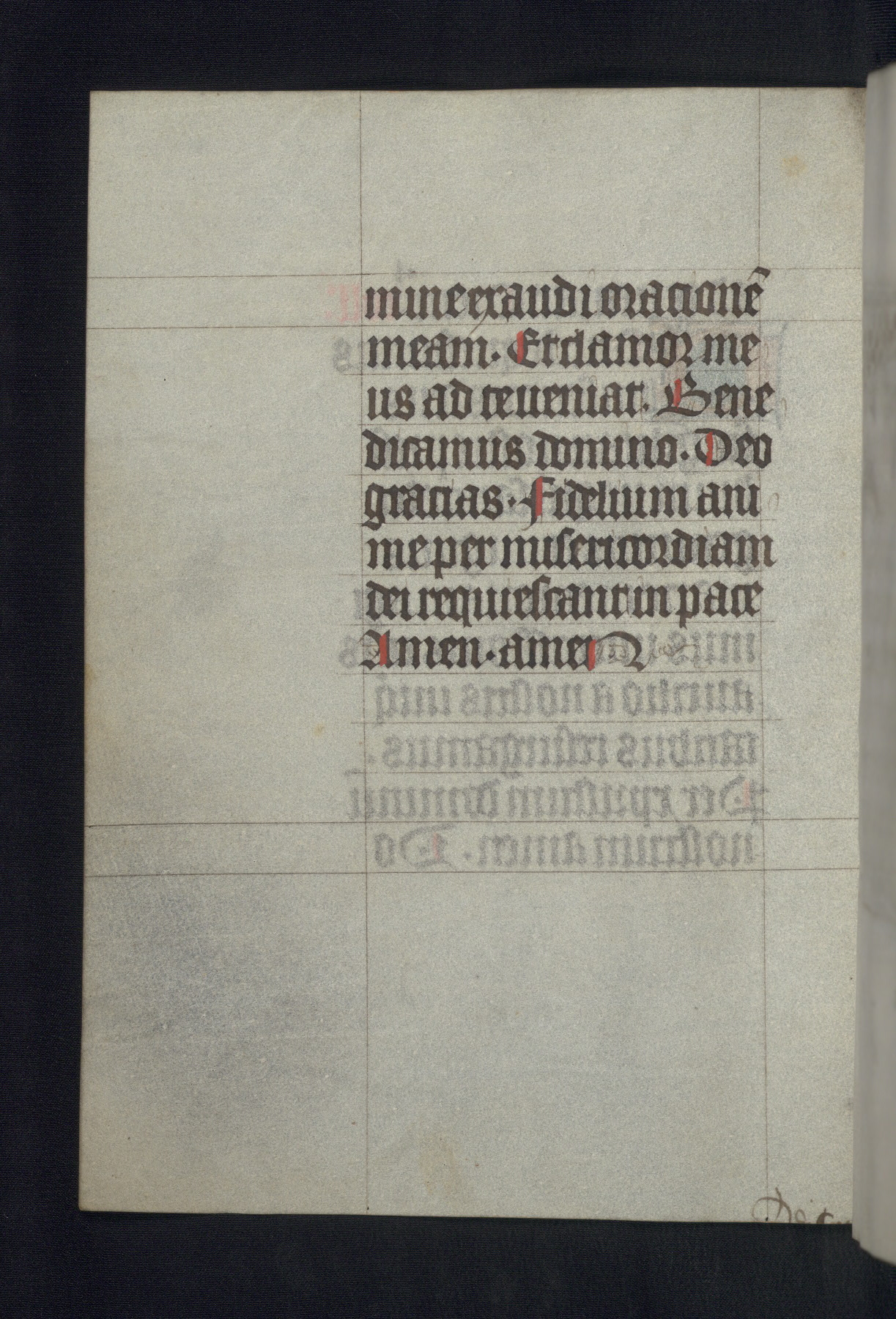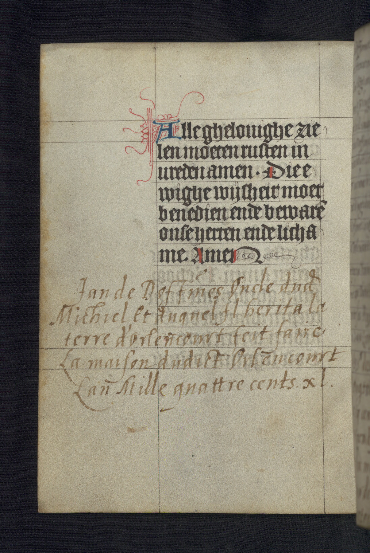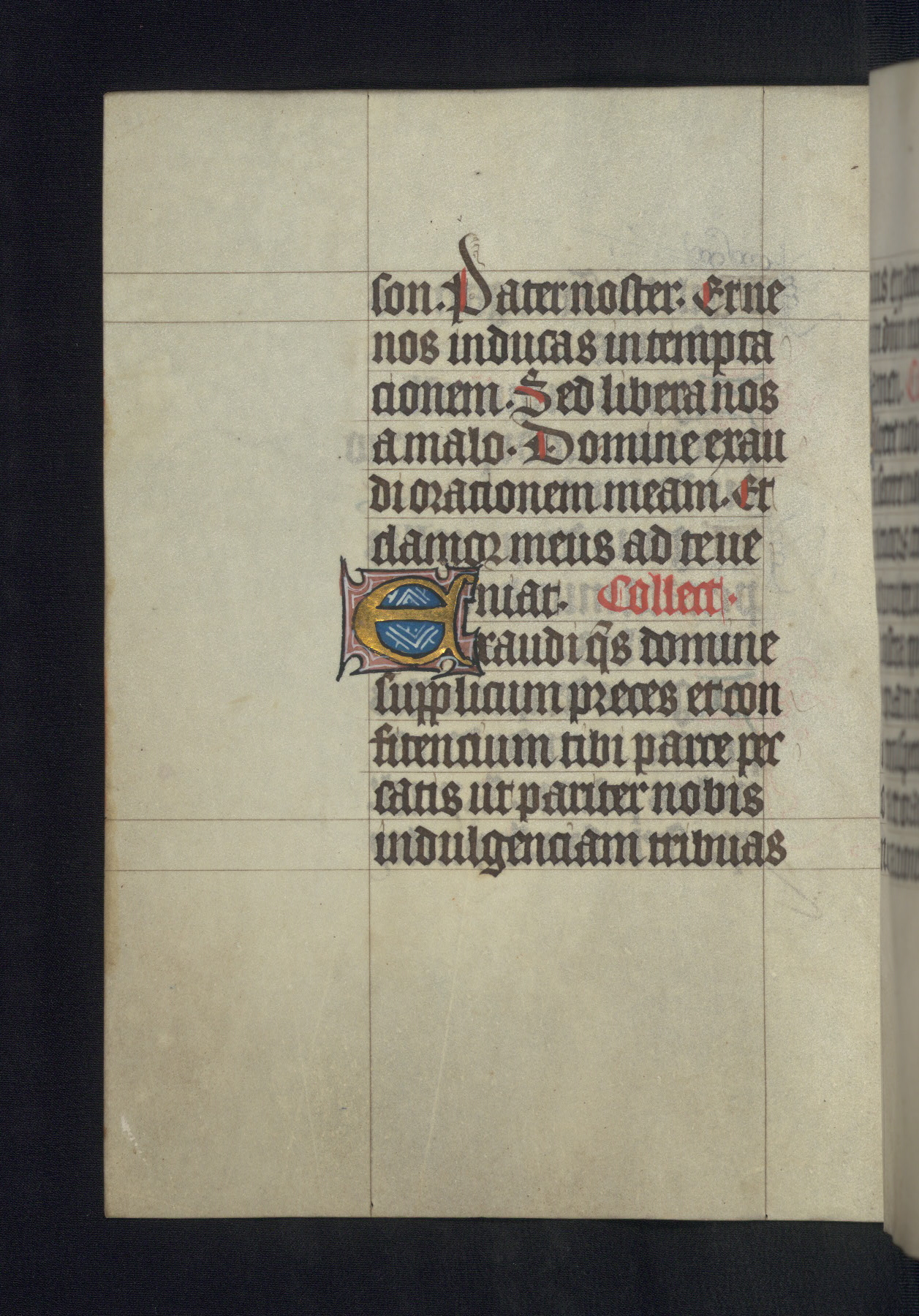 This Book of Hours was named the Doffinnes Hours after Franchoise de Doffinnes, who owned the book in the late sixteenth century and whose family’s subsequent history remains chronicled on the book’s final folios. However, the manuscript was originally made in the first quarter of the fifteenth century, probably for a married couple, who were originally represented kneeling with scrolls and their coats of arms in the margins, flanking a full-page miniature of the Crucifixion (fol. 72v), but whose figures and arms were later erased and overpainted with white. The manuscript contains both Latin and Dutch texts, supplemented by twelve full-page miniatures, the work of the Master of Walters 185. The manuscript also contains twelve pen-and-ink decorated initials in the calendar, some with grotesque faces, and letter "G" descenders throughout the book that can be attributed to the scribe Johannes de Malborch. The book’s original Dutch provenance is indicated by its calendar (for the Use of Utrecht) and its Hours of the Virgin, which follows predominantly the Use of the Windesheim Congregation. Prayers in Dutch were added to the end of the volume in the late fifteenth or early sixteenth century, and the book was subsequently rebound with its current cream-colored parchment binding of the seventeenth or eighteenth century.