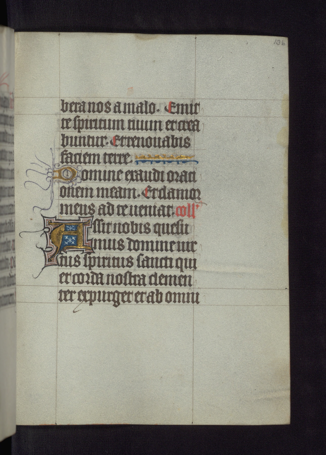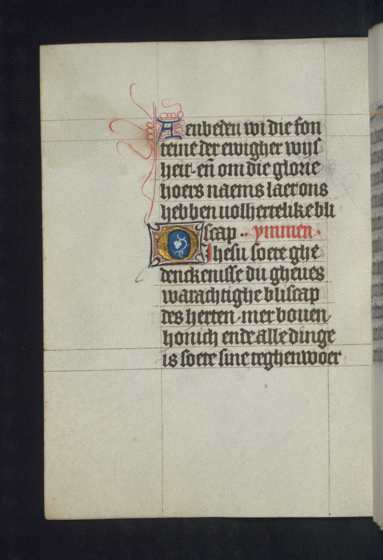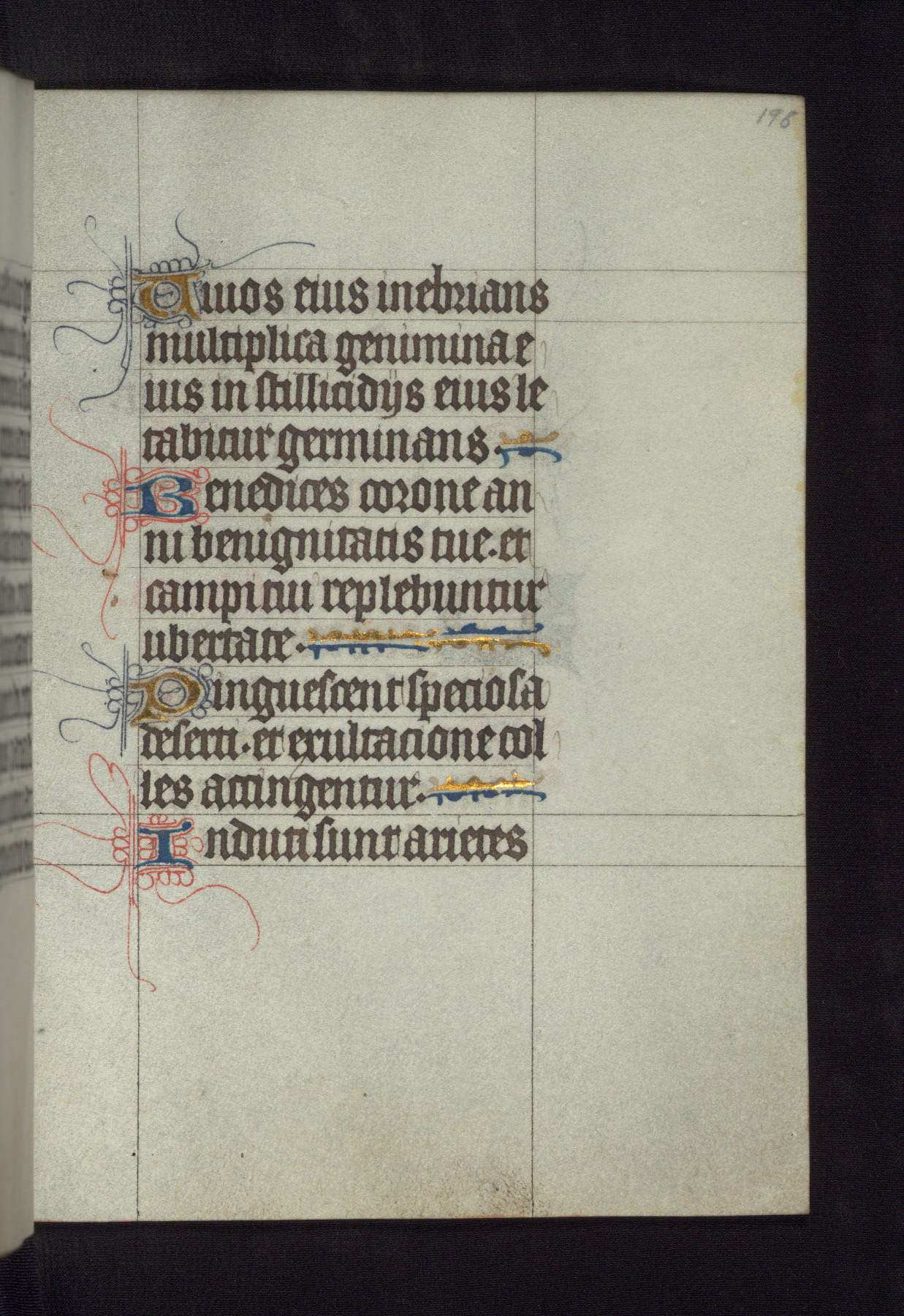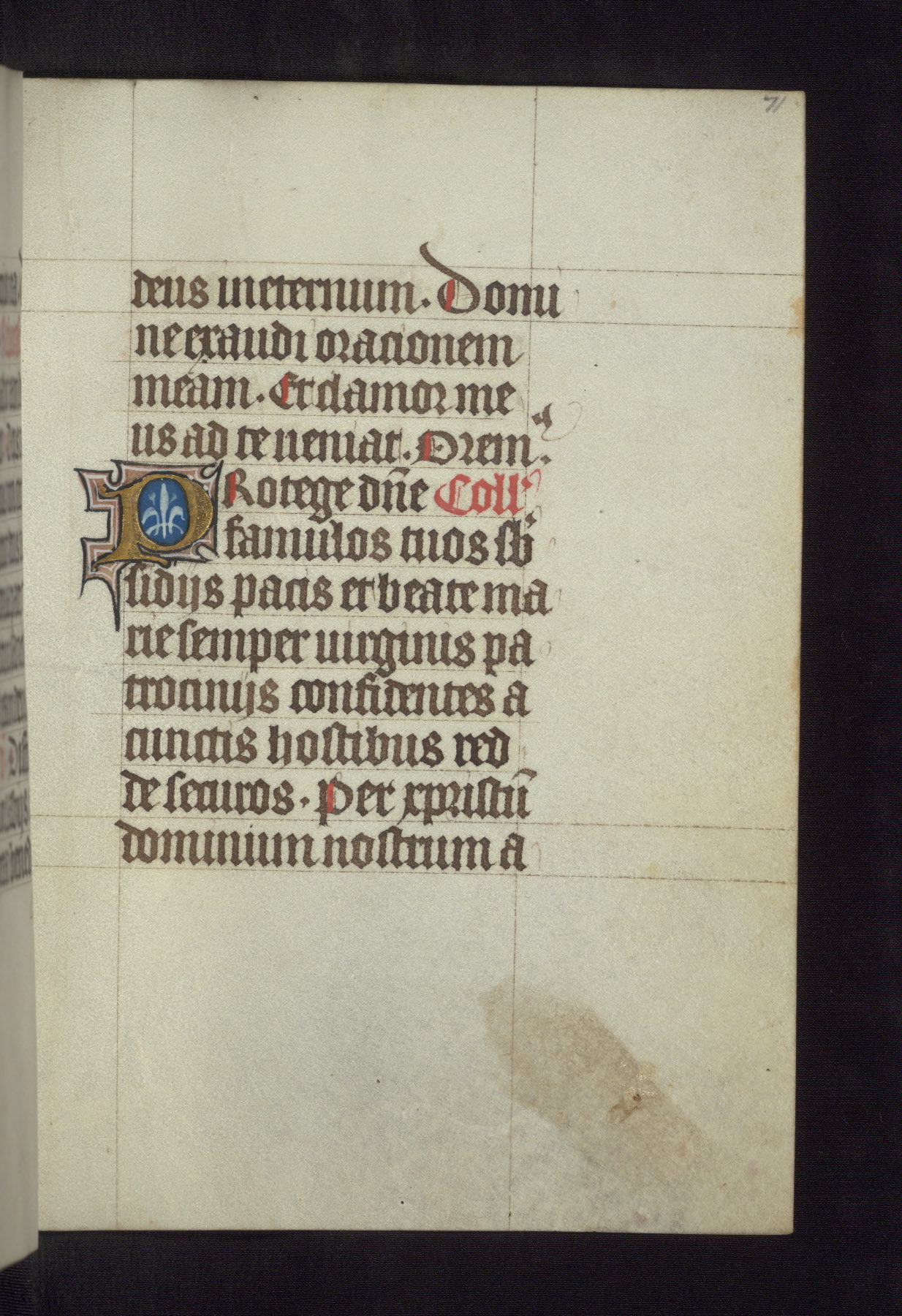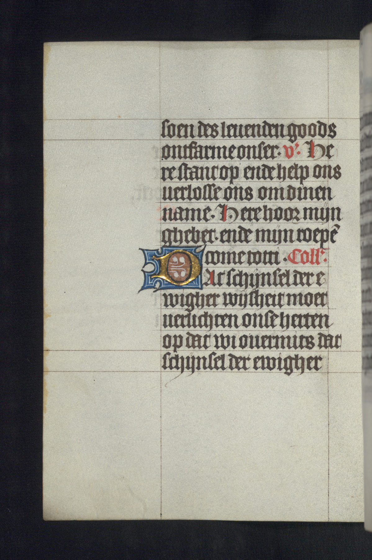 This Book of Hours was named the Doffinnes Hours after Franchoise de Doffinnes, who owned the book in the late sixteenth century and whose family’s subsequent history remains chronicled on the book’s final folios. However, the manuscript was originally made in the first quarter of the fifteenth century, probably for a married couple, who were originally represented kneeling with scrolls and their coats of arms in the margins, flanking a full-page miniature of the Crucifixion (fol. 72v), but whose figures and arms were later erased and overpainted with white. The manuscript contains both Latin and Dutch texts, supplemented by twelve full-page miniatures, the work of the Master of Walters 185. The manuscript also contains twelve pen-and-ink decorated initials in the calendar, some with grotesque faces, and letter "G" descenders throughout the book that can be attributed to the scribe Johannes de Malborch. The book’s original Dutch provenance is indicated by its calendar (for the Use of Utrecht) and its Hours of the Virgin, which follows predominantly the Use of the Windesheim Congregation. Prayers in Dutch were added to the end of the volume in the late fifteenth or early sixteenth century, and the book was subsequently rebound with its current cream-colored parchment binding of the seventeenth or eighteenth century.