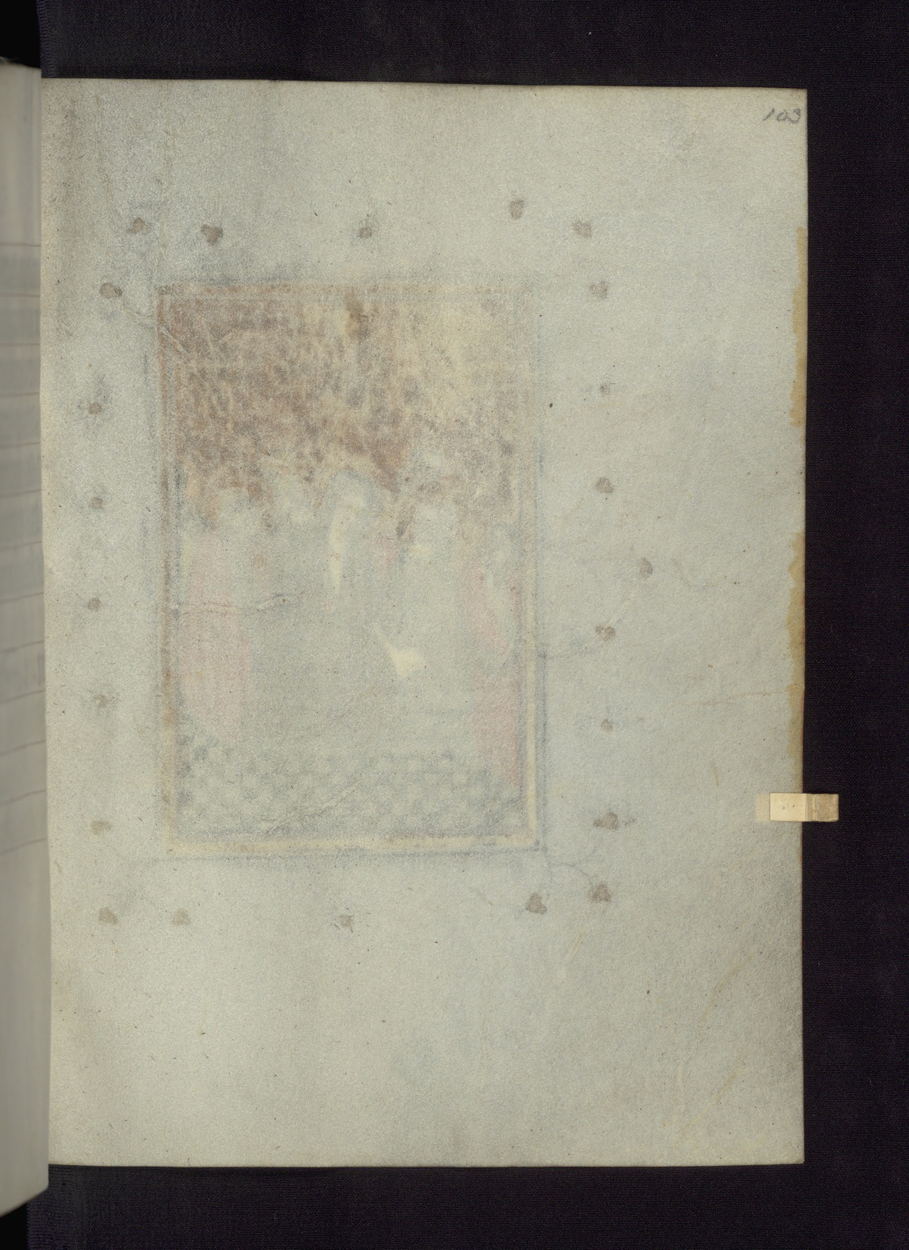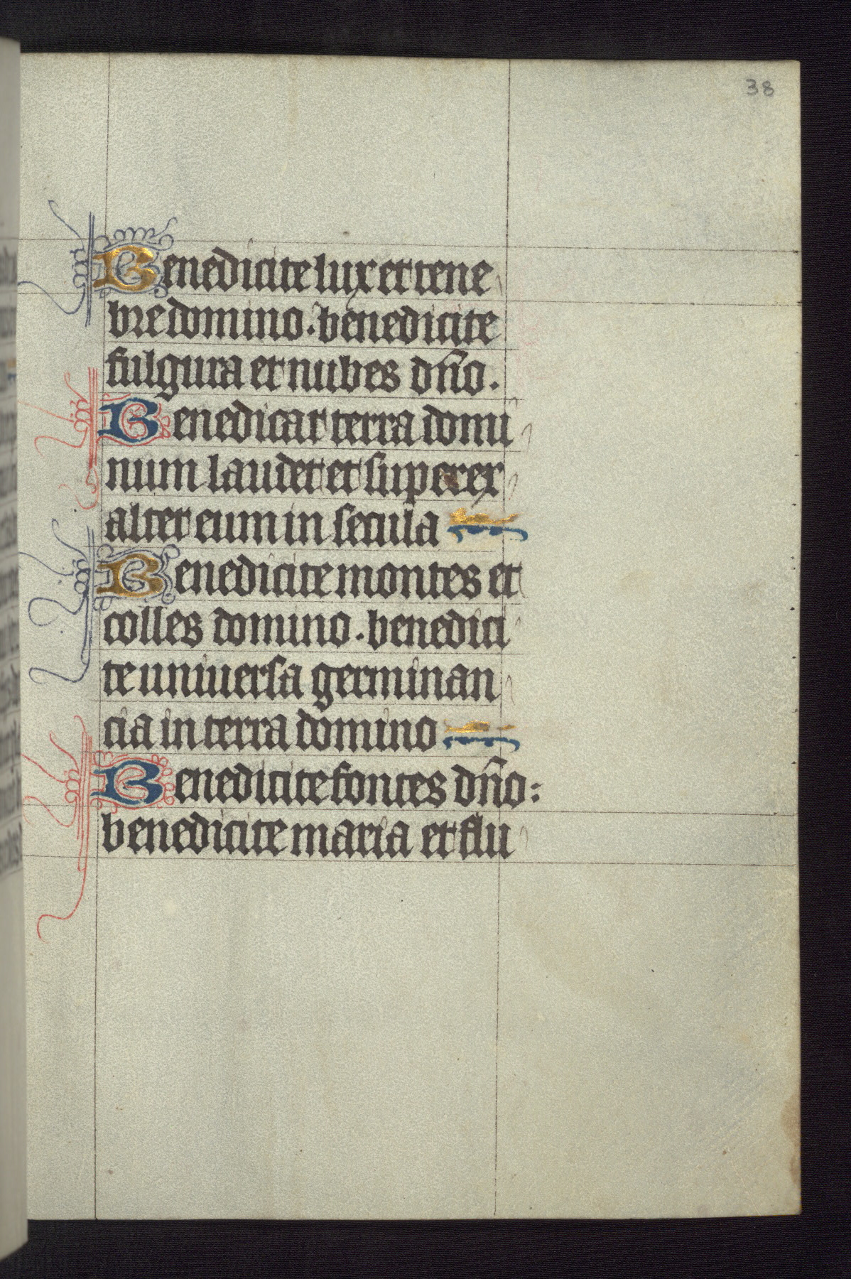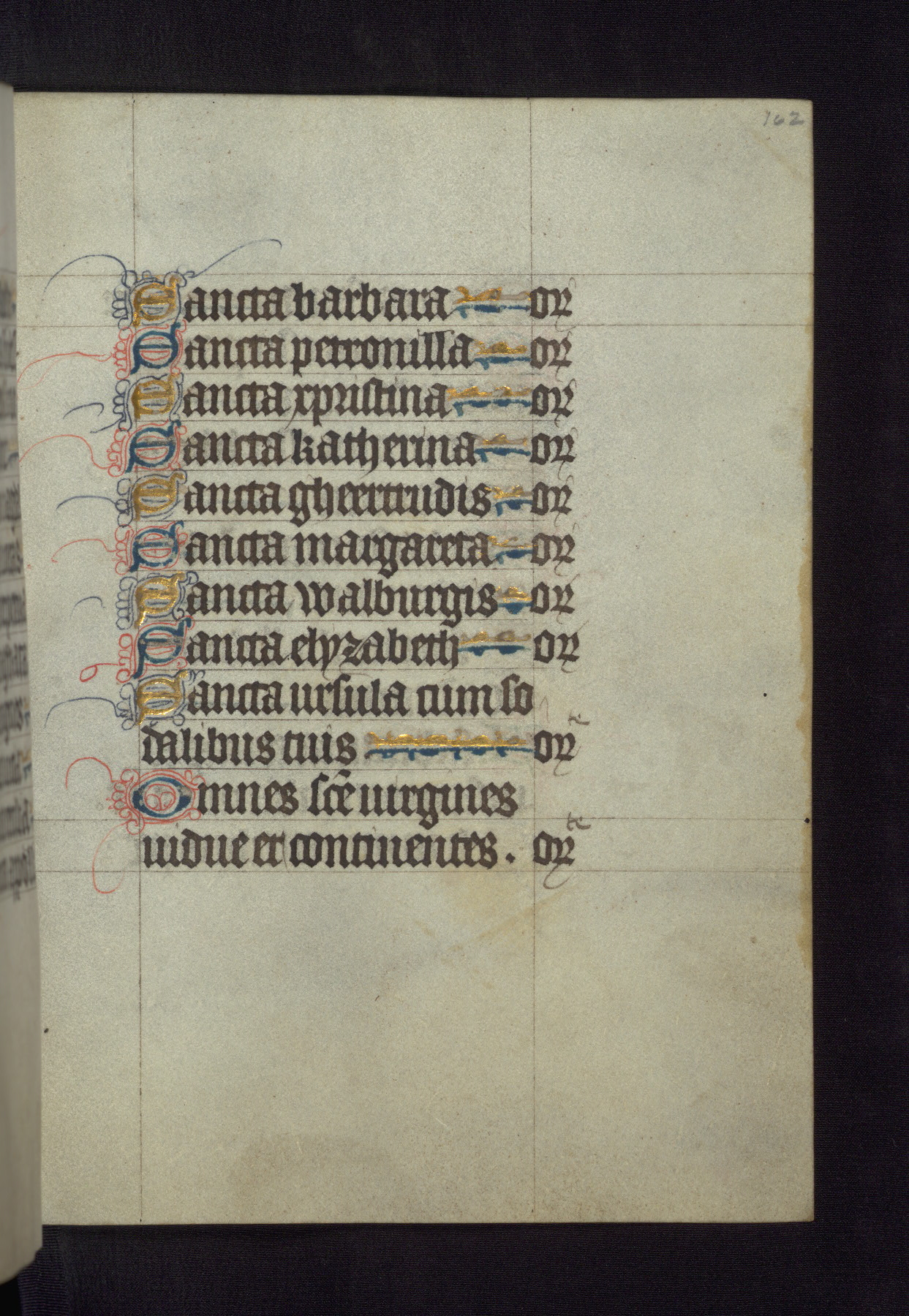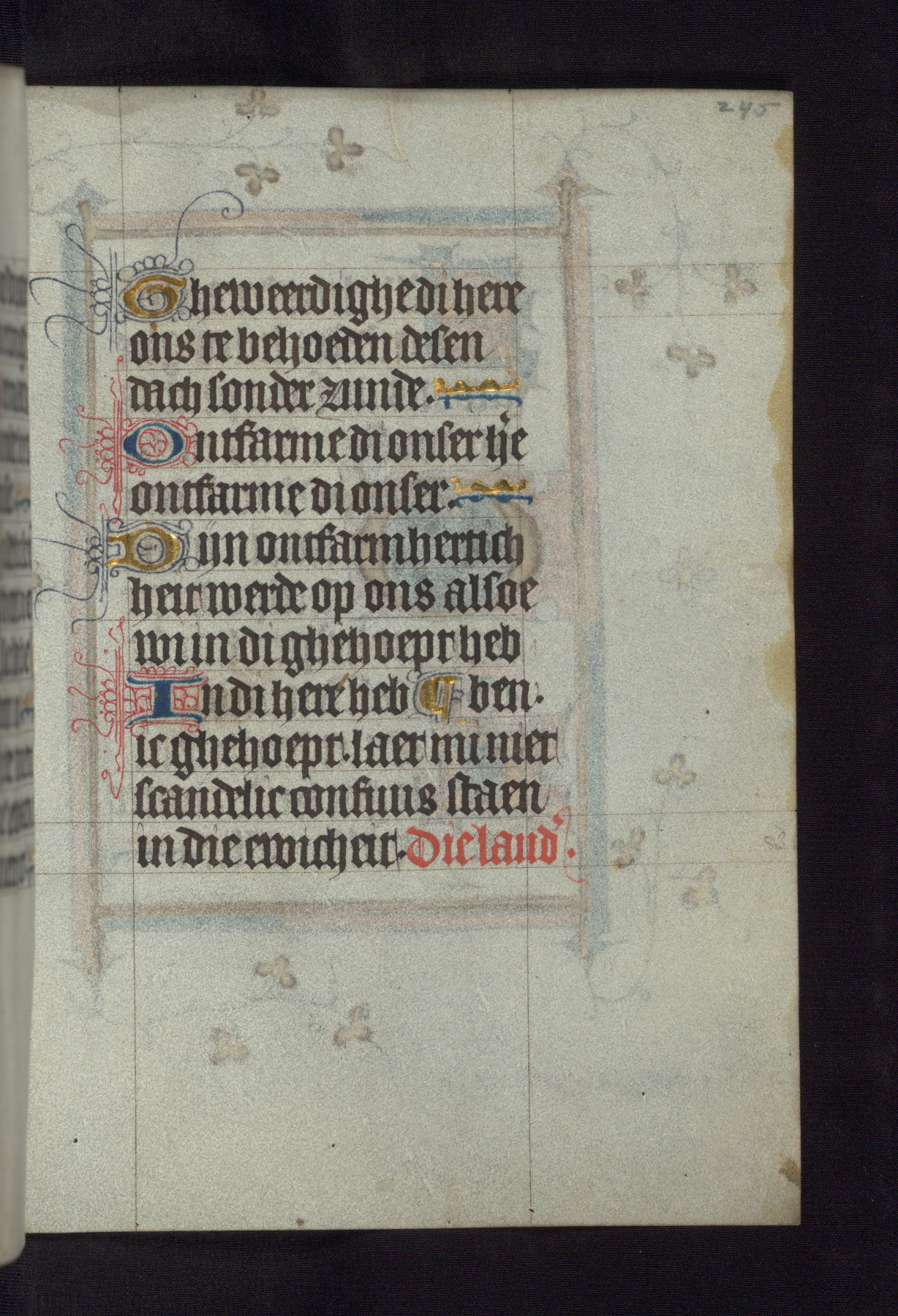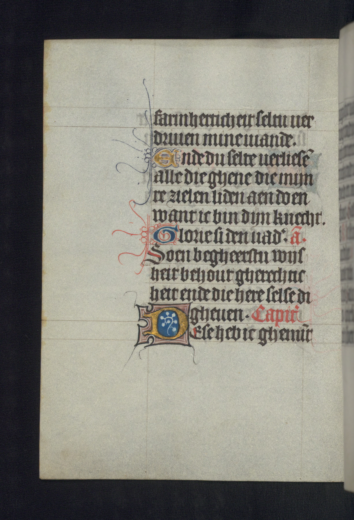 This Book of Hours was named the Doffinnes Hours after Franchoise de Doffinnes, who owned the book in the late sixteenth century and whose family’s subsequent history remains chronicled on the book’s final folios. However, the manuscript was originally made in the first quarter of the fifteenth century, probably for a married couple, who were originally represented kneeling with scrolls and their coats of arms in the margins, flanking a full-page miniature of the Crucifixion (fol. 72v), but whose figures and arms were later erased and overpainted with white. The manuscript contains both Latin and Dutch texts, supplemented by twelve full-page miniatures, the work of the Master of Walters 185. The manuscript also contains twelve pen-and-ink decorated initials in the calendar, some with grotesque faces, and letter "G" descenders throughout the book that can be attributed to the scribe Johannes de Malborch. The book’s original Dutch provenance is indicated by its calendar (for the Use of Utrecht) and its Hours of the Virgin, which follows predominantly the Use of the Windesheim Congregation. Prayers in Dutch were added to the end of the volume in the late fifteenth or early sixteenth century, and the book was subsequently rebound with its current cream-colored parchment binding of the seventeenth or eighteenth century.