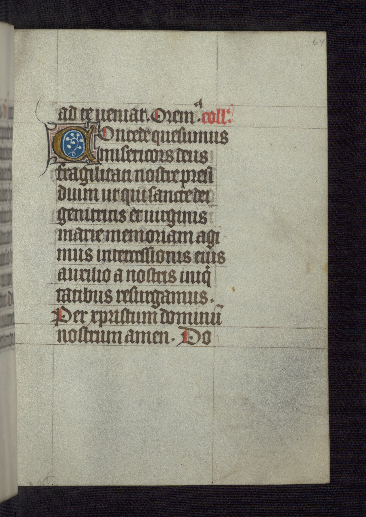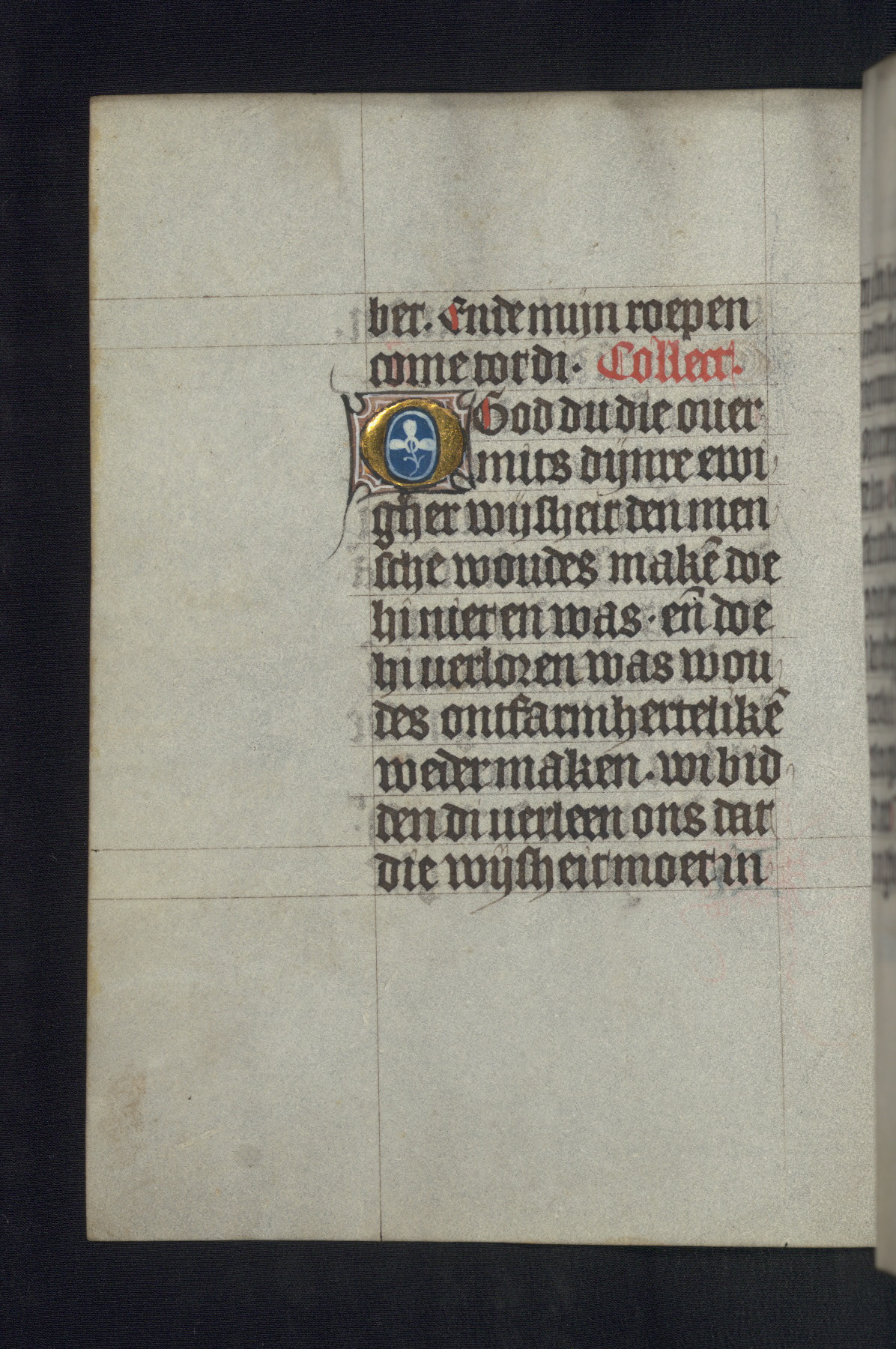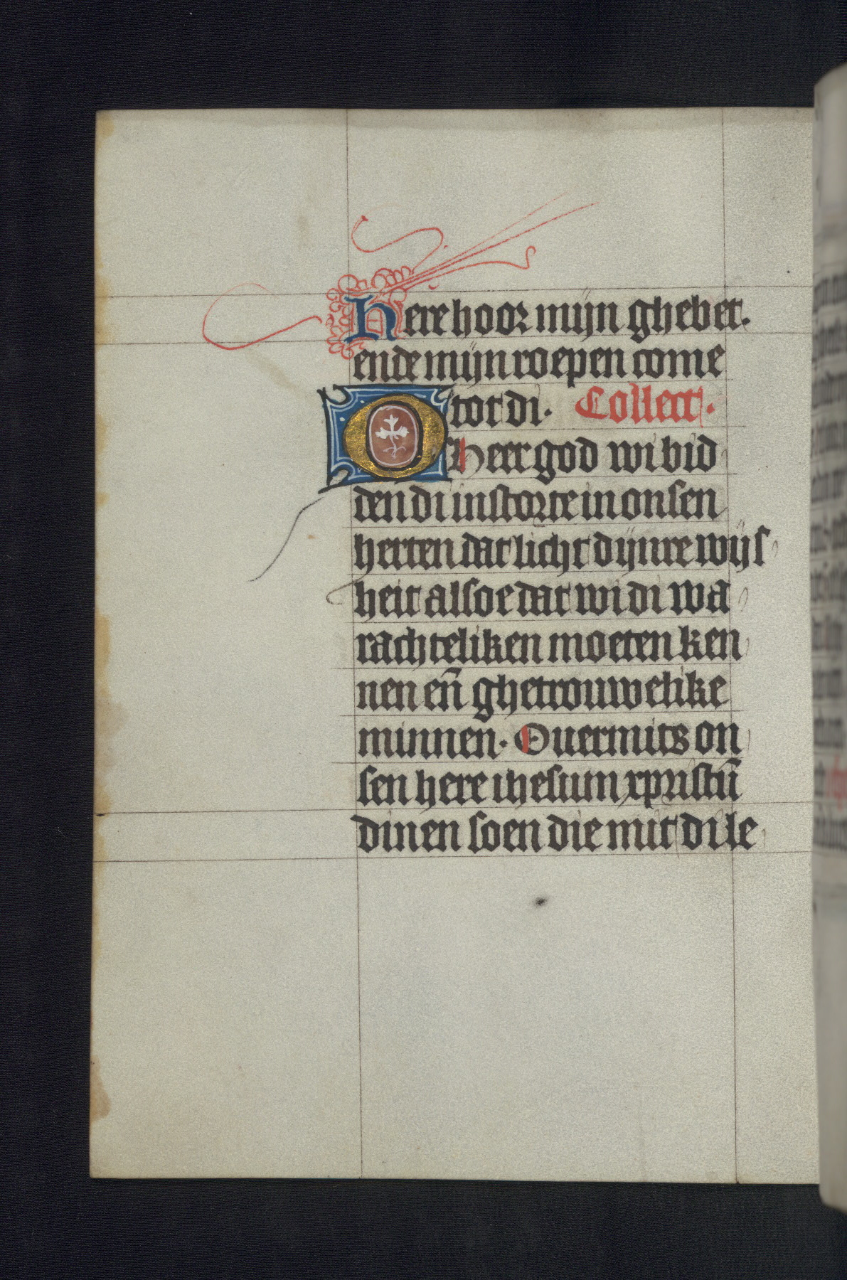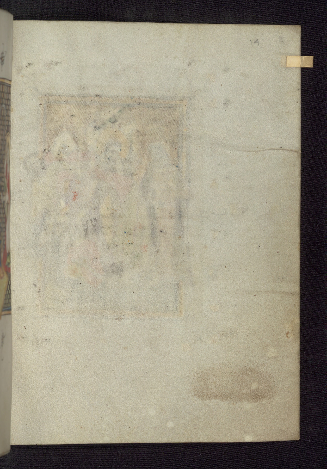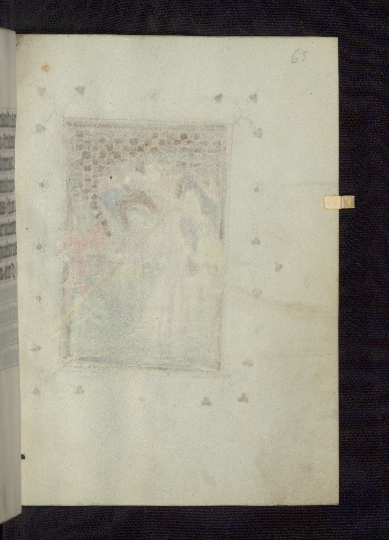 This Book of Hours was named the Doffinnes Hours after Franchoise de Doffinnes, who owned the book in the late sixteenth century and whose family’s subsequent history remains chronicled on the book’s final folios. However, the manuscript was originally made in the first quarter of the fifteenth century, probably for a married couple, who were originally represented kneeling with scrolls and their coats of arms in the margins, flanking a full-page miniature of the Crucifixion (fol. 72v), but whose figures and arms were later erased and overpainted with white. The manuscript contains both Latin and Dutch texts, supplemented by twelve full-page miniatures, the work of the Master of Walters 185. The manuscript also contains twelve pen-and-ink decorated initials in the calendar, some with grotesque faces, and letter "G" descenders throughout the book that can be attributed to the scribe Johannes de Malborch. The book’s original Dutch provenance is indicated by its calendar (for the Use of Utrecht) and its Hours of the Virgin, which follows predominantly the Use of the Windesheim Congregation. Prayers in Dutch were added to the end of the volume in the late fifteenth or early sixteenth century, and the book was subsequently rebound with its current cream-colored parchment binding of the seventeenth or eighteenth century.