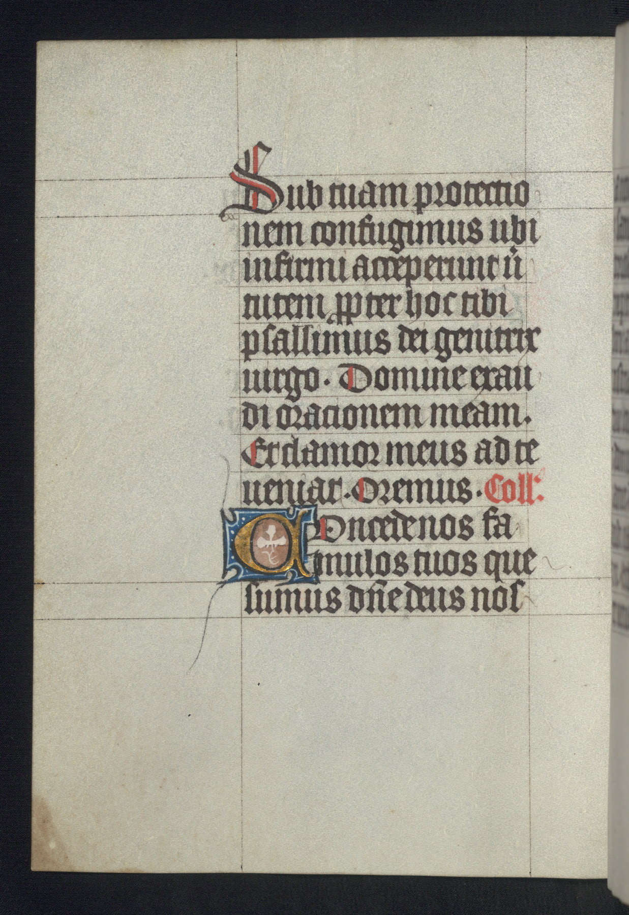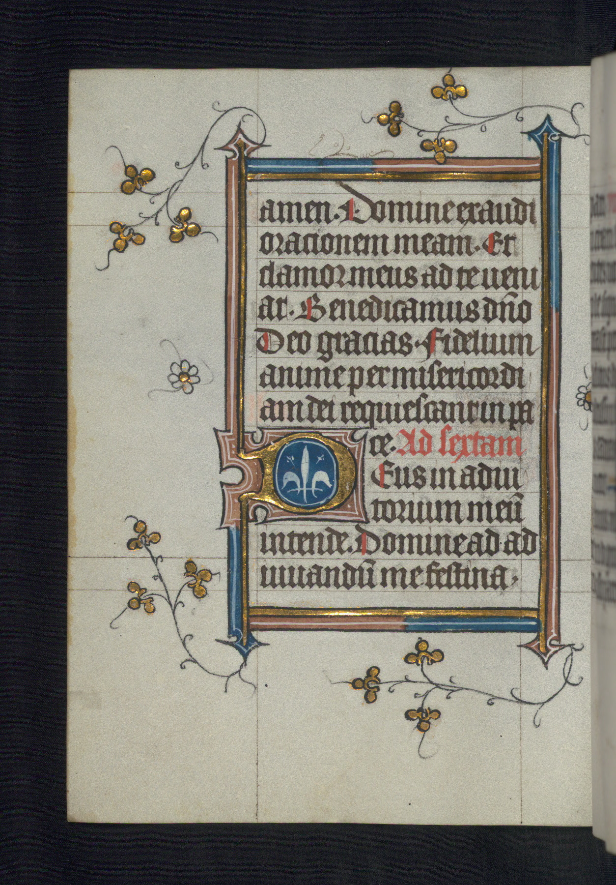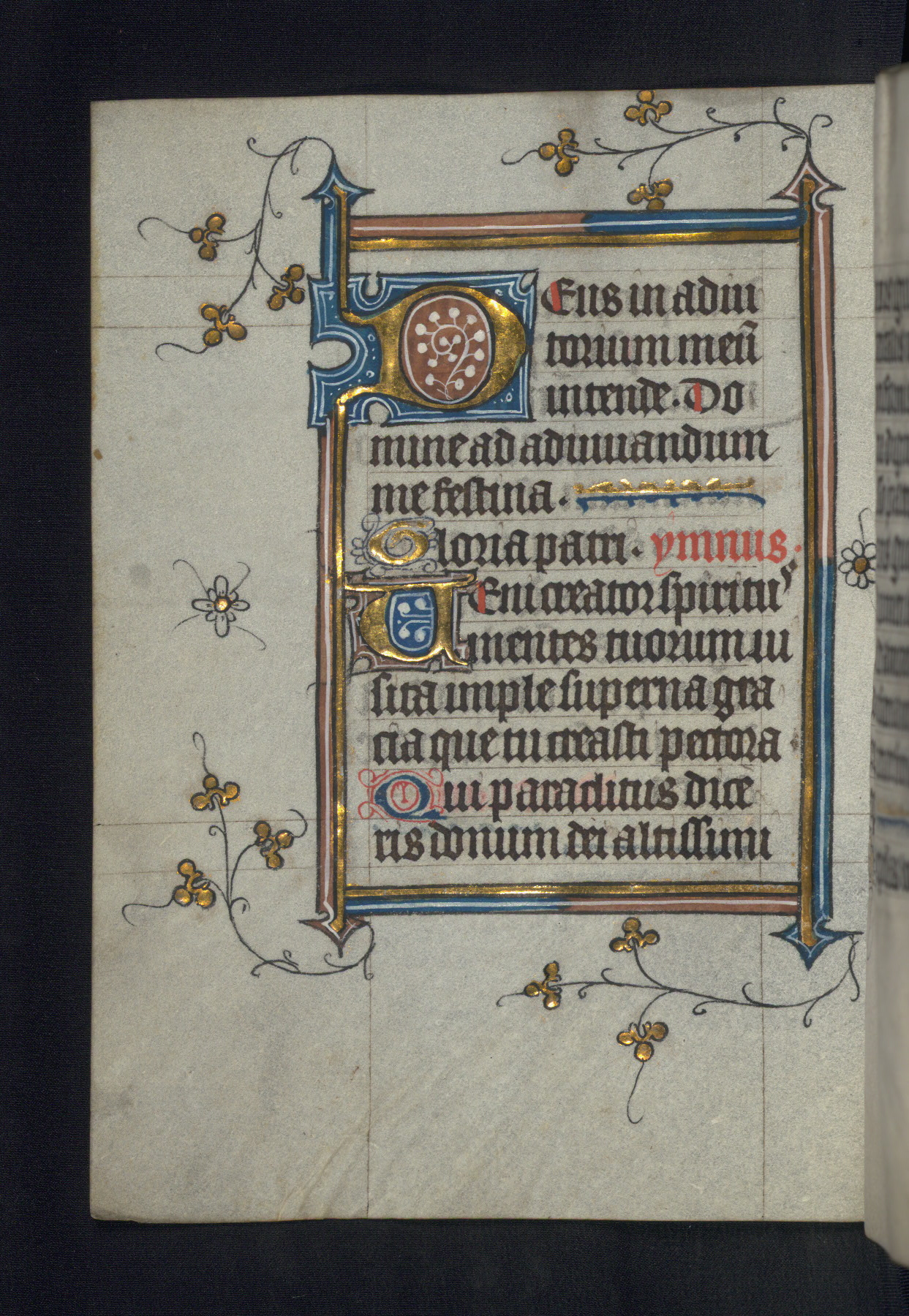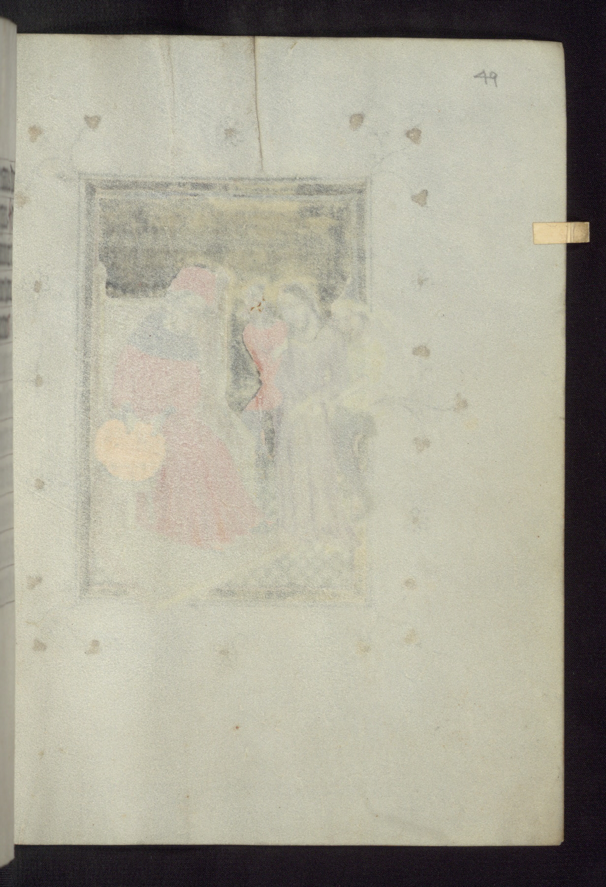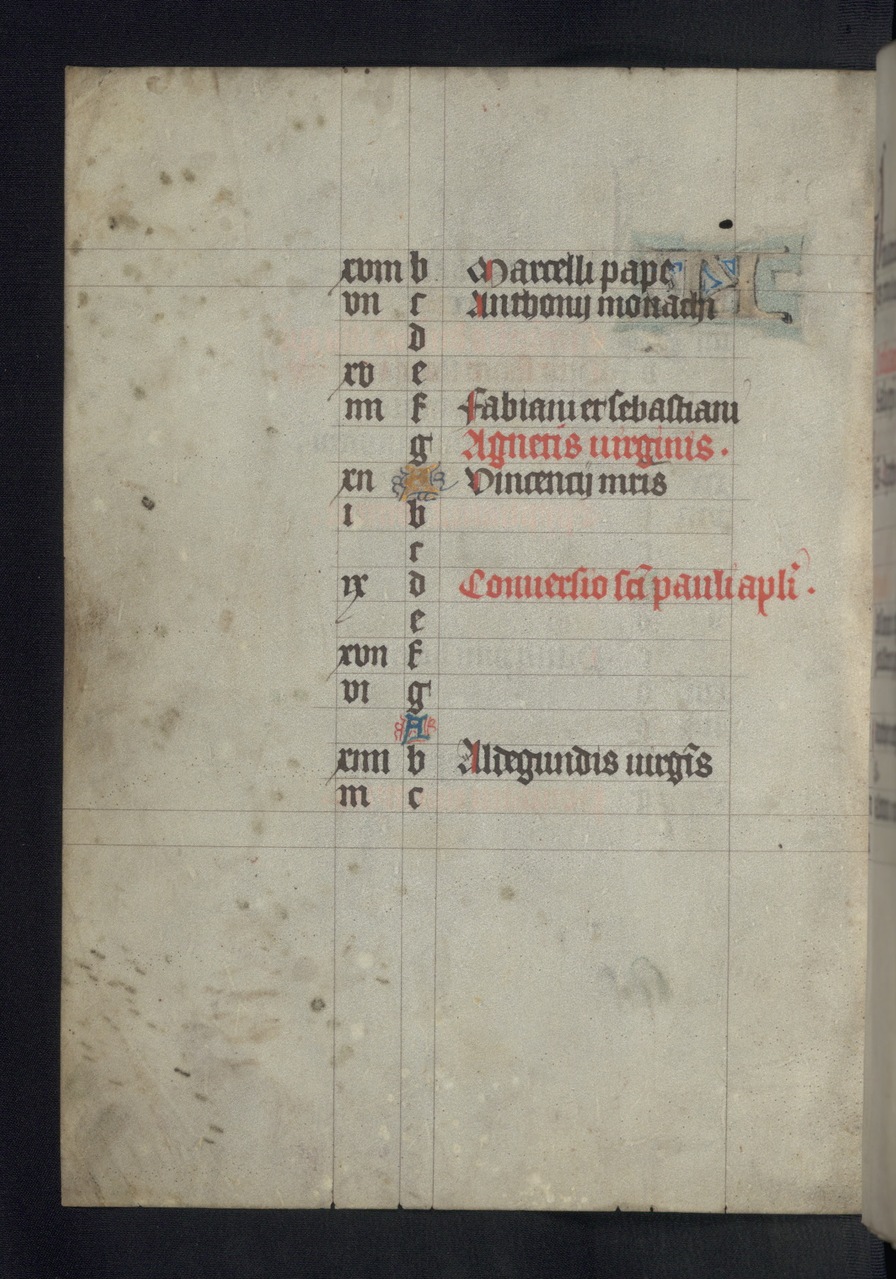 This Book of Hours was named the Doffinnes Hours after Franchoise de Doffinnes, who owned the book in the late sixteenth century and whose family’s subsequent history remains chronicled on the book’s final folios. However, the manuscript was originally made in the first quarter of the fifteenth century, probably for a married couple, who were originally represented kneeling with scrolls and their coats of arms in the margins, flanking a full-page miniature of the Crucifixion (fol. 72v), but whose figures and arms were later erased and overpainted with white. The manuscript contains both Latin and Dutch texts, supplemented by twelve full-page miniatures, the work of the Master of Walters 185. The manuscript also contains twelve pen-and-ink decorated initials in the calendar, some with grotesque faces, and letter "G" descenders throughout the book that can be attributed to the scribe Johannes de Malborch. The book’s original Dutch provenance is indicated by its calendar (for the Use of Utrecht) and its Hours of the Virgin, which follows predominantly the Use of the Windesheim Congregation. Prayers in Dutch were added to the end of the volume in the late fifteenth or early sixteenth century, and the book was subsequently rebound with its current cream-colored parchment binding of the seventeenth or eighteenth century.