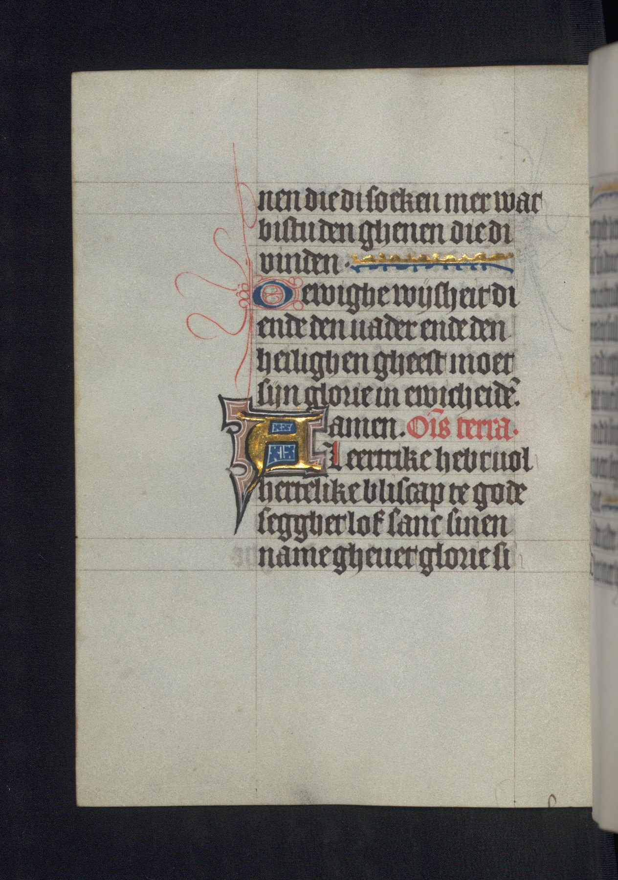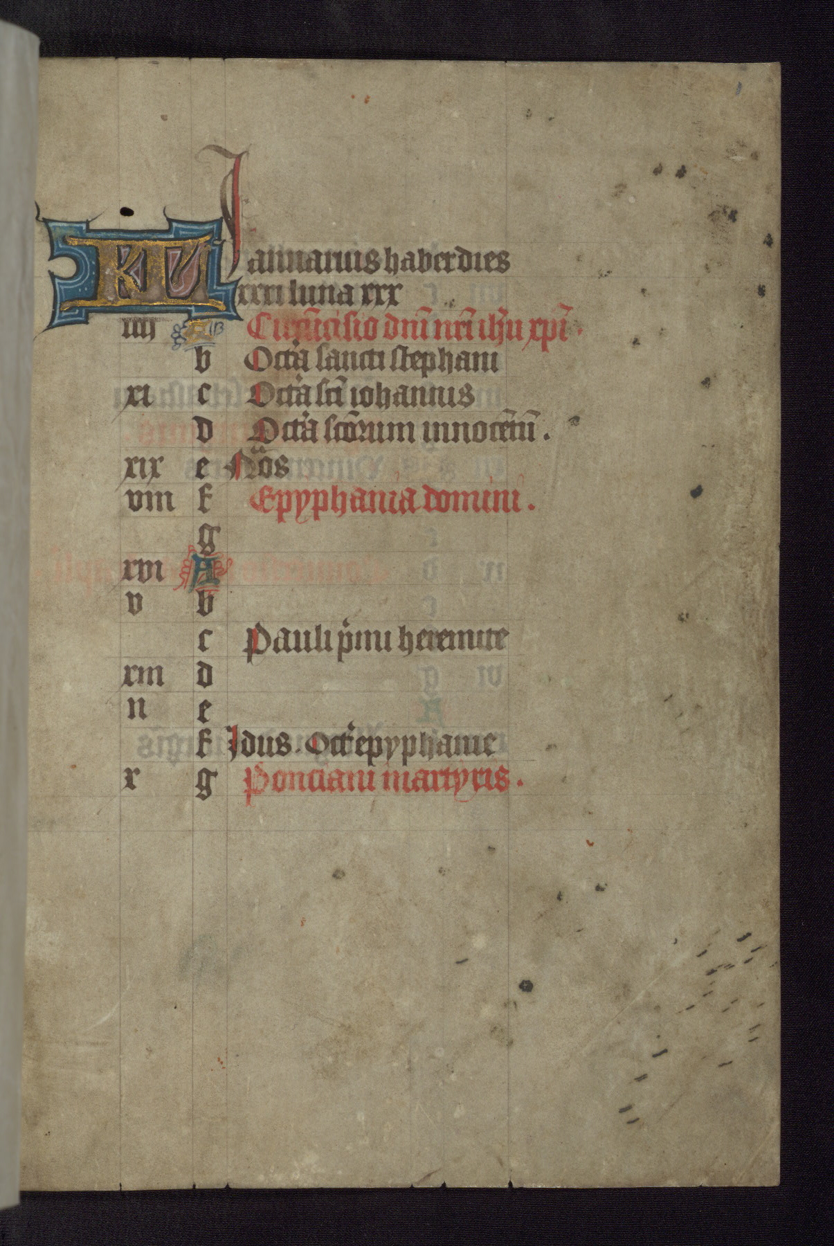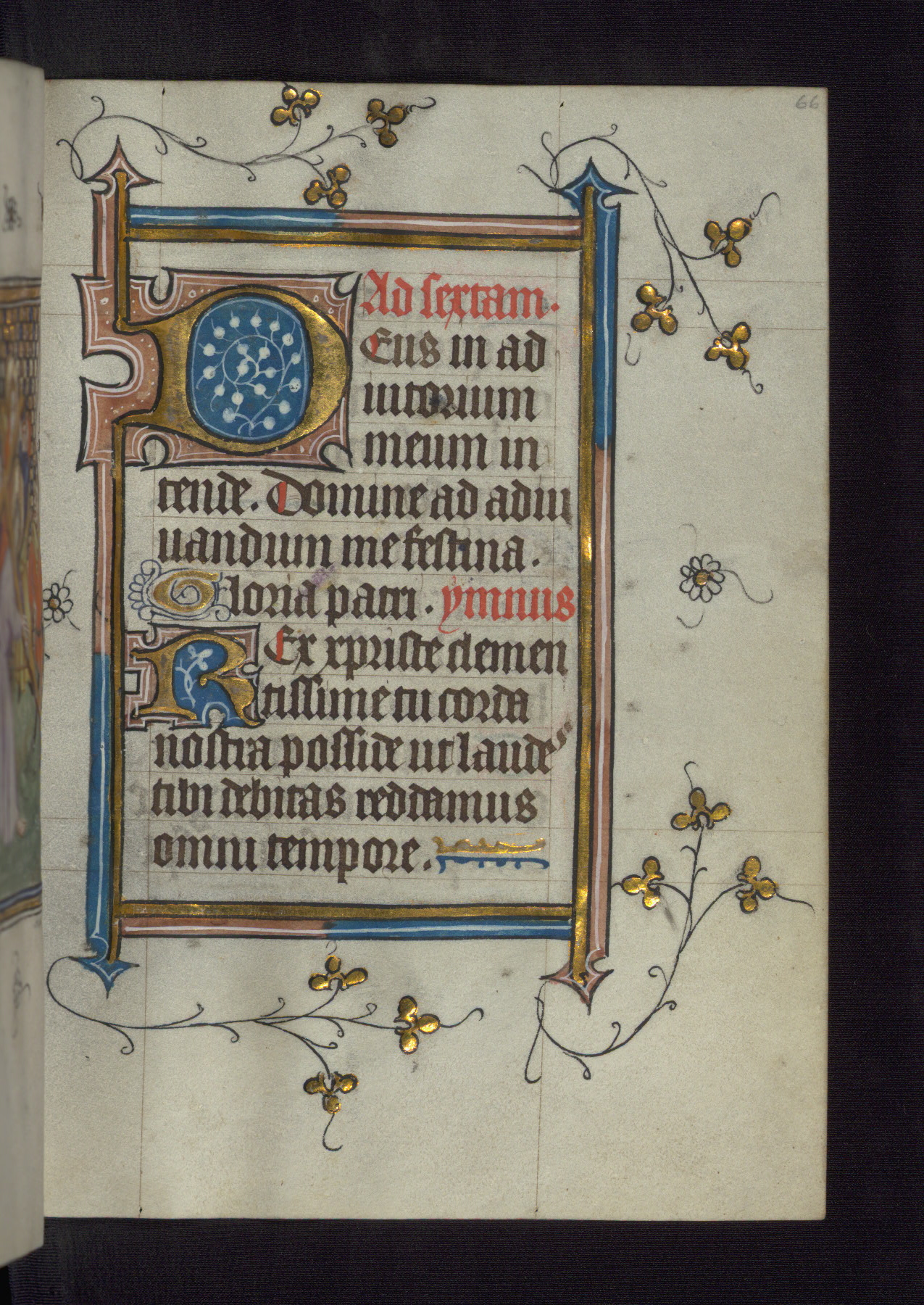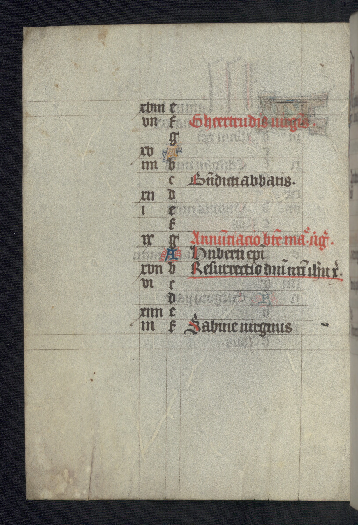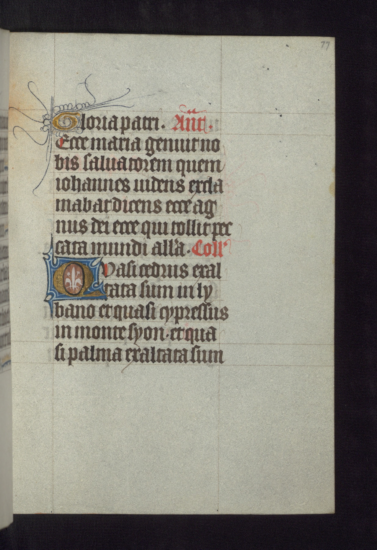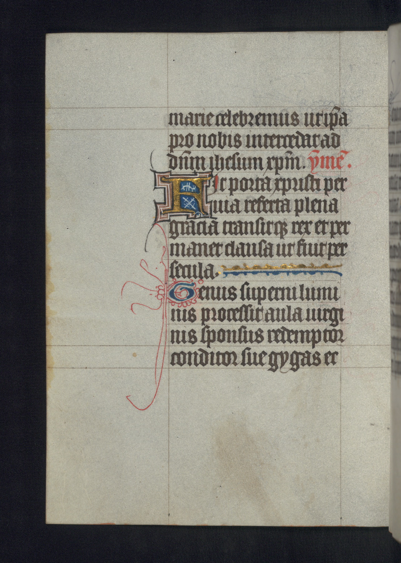 This Book of Hours was named the Doffinnes Hours after Franchoise de Doffinnes, who owned the book in the late sixteenth century and whose family’s subsequent history remains chronicled on the book’s final folios. However, the manuscript was originally made in the first quarter of the fifteenth century, probably for a married couple, who were originally represented kneeling with scrolls and their coats of arms in the margins, flanking a full-page miniature of the Crucifixion (fol. 72v), but whose figures and arms were later erased and overpainted with white. The manuscript contains both Latin and Dutch texts, supplemented by twelve full-page miniatures, the work of the Master of Walters 185. The manuscript also contains twelve pen-and-ink decorated initials in the calendar, some with grotesque faces, and letter "G" descenders throughout the book that can be attributed to the scribe Johannes de Malborch. The book’s original Dutch provenance is indicated by its calendar (for the Use of Utrecht) and its Hours of the Virgin, which follows predominantly the Use of the Windesheim Congregation. Prayers in Dutch were added to the end of the volume in the late fifteenth or early sixteenth century, and the book was subsequently rebound with its current cream-colored parchment binding of the seventeenth or eighteenth century.