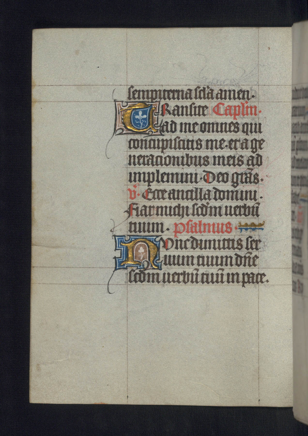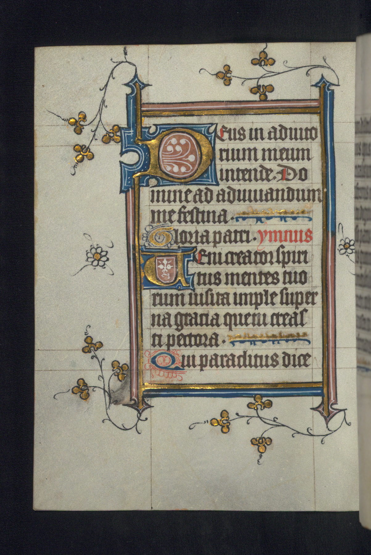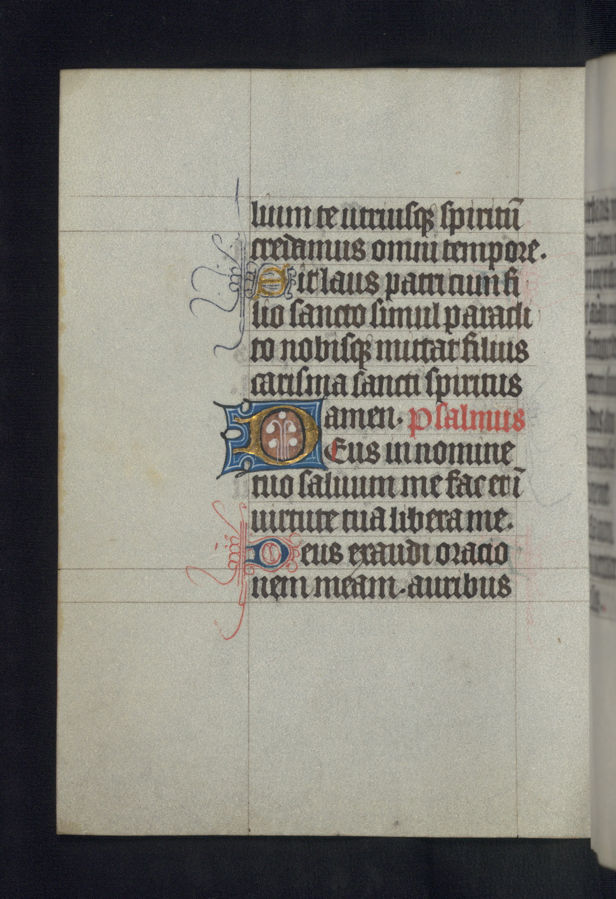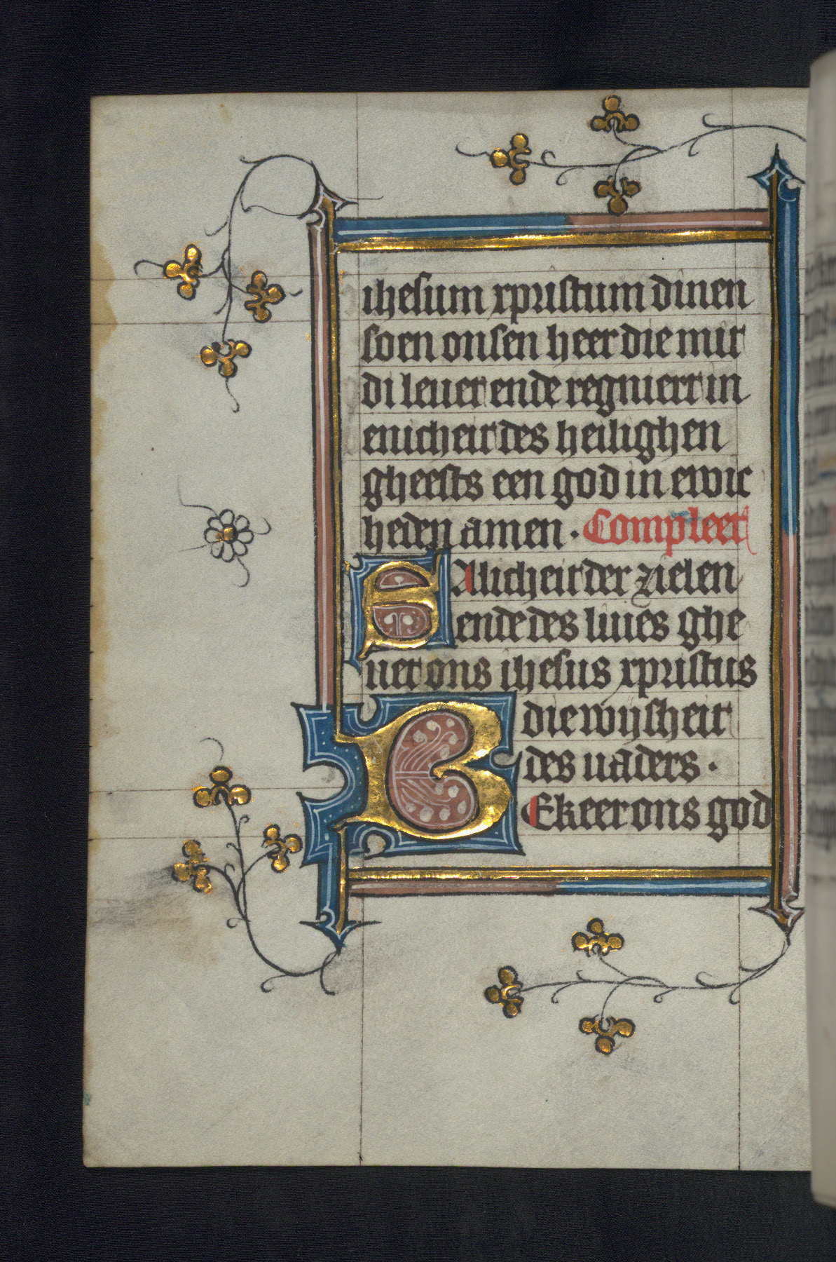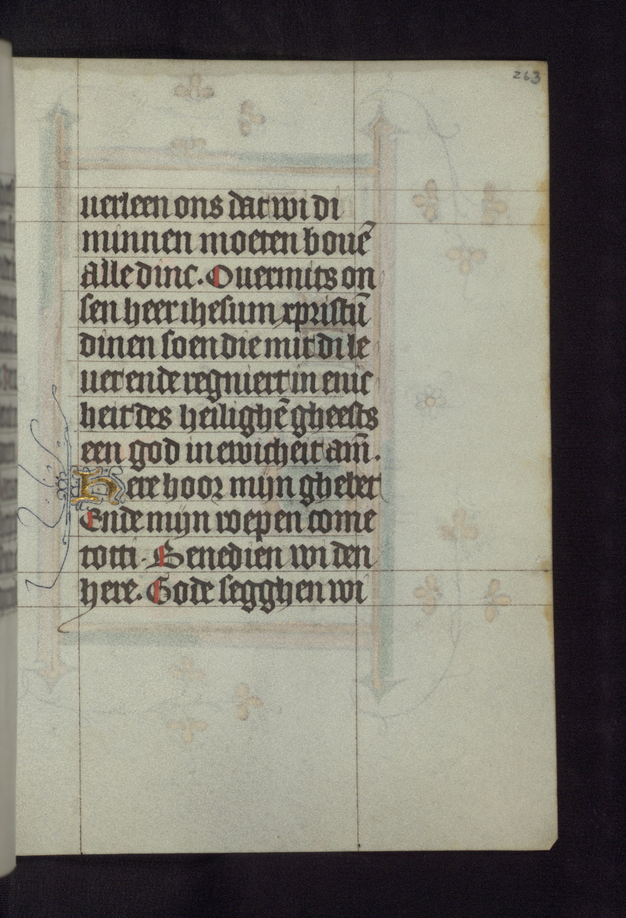 This Book of Hours was named the Doffinnes Hours after Franchoise de Doffinnes, who owned the book in the late sixteenth century and whose family’s subsequent history remains chronicled on the book’s final folios. However, the manuscript was originally made in the first quarter of the fifteenth century, probably for a married couple, who were originally represented kneeling with scrolls and their coats of arms in the margins, flanking a full-page miniature of the Crucifixion (fol. 72v), but whose figures and arms were later erased and overpainted with white. The manuscript contains both Latin and Dutch texts, supplemented by twelve full-page miniatures, the work of the Master of Walters 185. The manuscript also contains twelve pen-and-ink decorated initials in the calendar, some with grotesque faces, and letter "G" descenders throughout the book that can be attributed to the scribe Johannes de Malborch. The book’s original Dutch provenance is indicated by its calendar (for the Use of Utrecht) and its Hours of the Virgin, which follows predominantly the Use of the Windesheim Congregation. Prayers in Dutch were added to the end of the volume in the late fifteenth or early sixteenth century, and the book was subsequently rebound with its current cream-colored parchment binding of the seventeenth or eighteenth century.