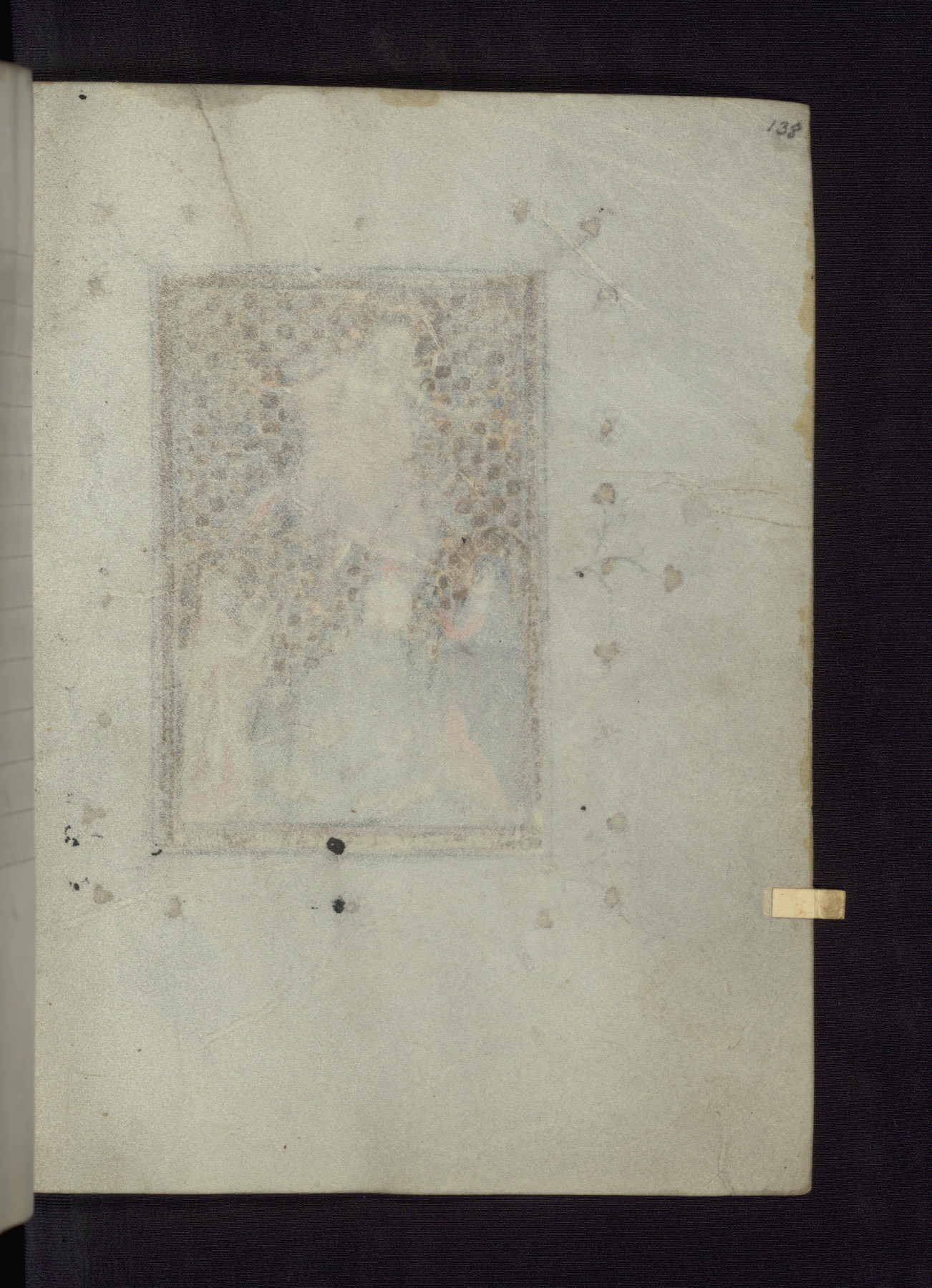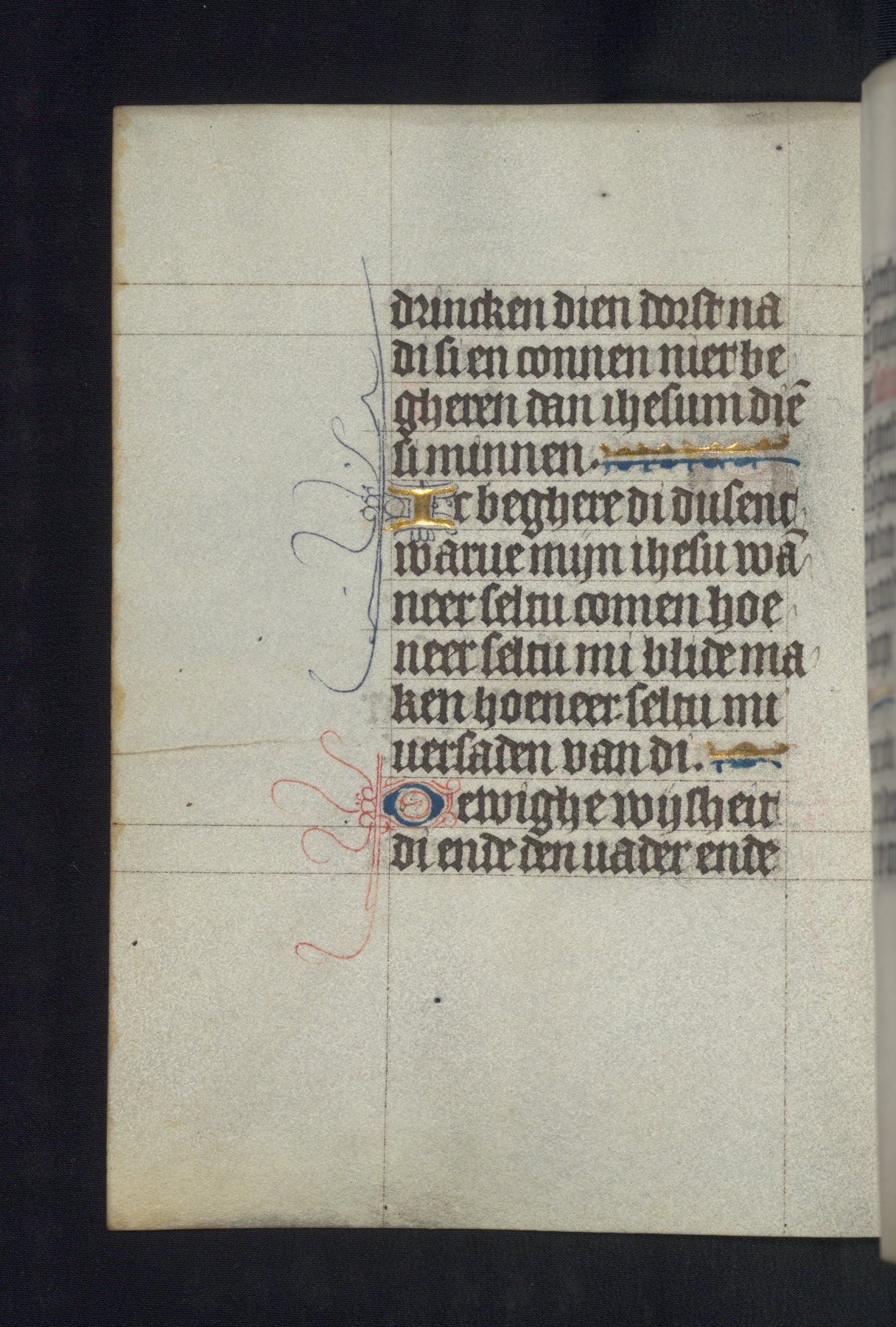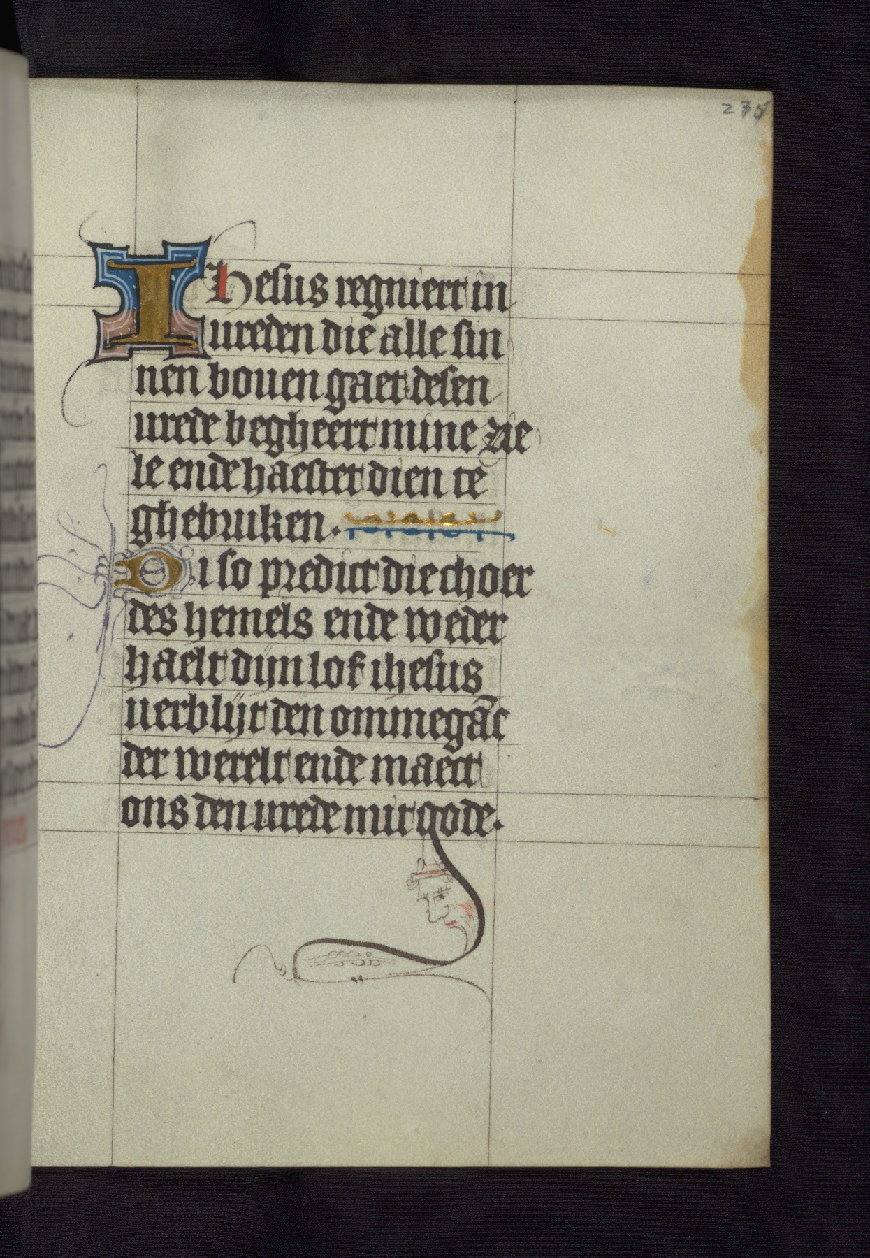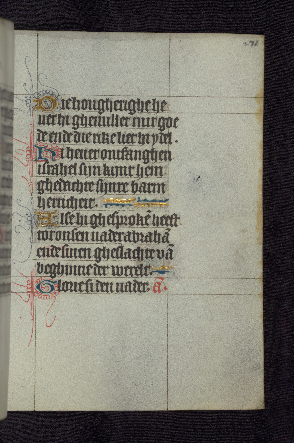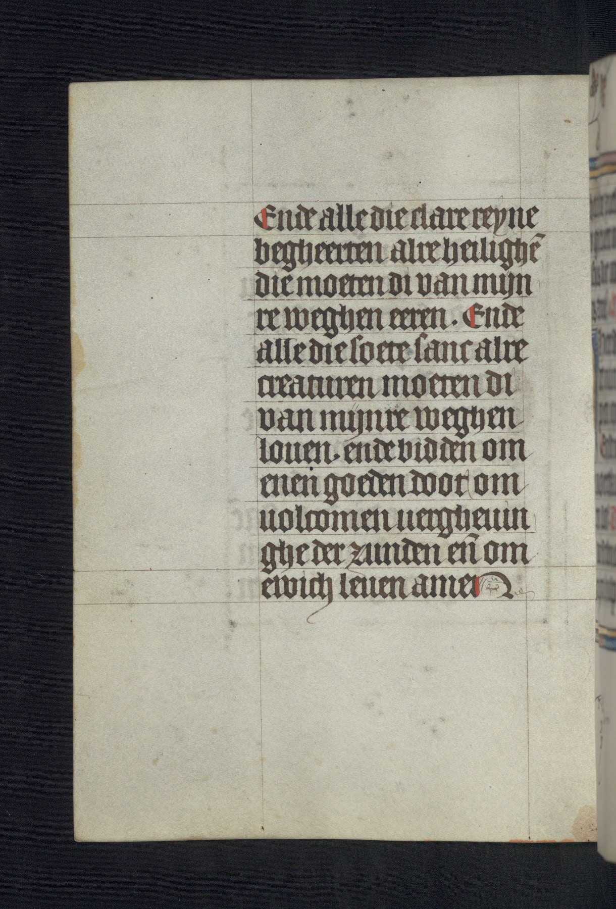 This Book of Hours was named the Doffinnes Hours after Franchoise de Doffinnes, who owned the book in the late sixteenth century and whose family’s subsequent history remains chronicled on the book’s final folios. However, the manuscript was originally made in the first quarter of the fifteenth century, probably for a married couple, who were originally represented kneeling with scrolls and their coats of arms in the margins, flanking a full-page miniature of the Crucifixion (fol. 72v), but whose figures and arms were later erased and overpainted with white. The manuscript contains both Latin and Dutch texts, supplemented by twelve full-page miniatures, the work of the Master of Walters 185. The manuscript also contains twelve pen-and-ink decorated initials in the calendar, some with grotesque faces, and letter "G" descenders throughout the book that can be attributed to the scribe Johannes de Malborch. The book’s original Dutch provenance is indicated by its calendar (for the Use of Utrecht) and its Hours of the Virgin, which follows predominantly the Use of the Windesheim Congregation. Prayers in Dutch were added to the end of the volume in the late fifteenth or early sixteenth century, and the book was subsequently rebound with its current cream-colored parchment binding of the seventeenth or eighteenth century.