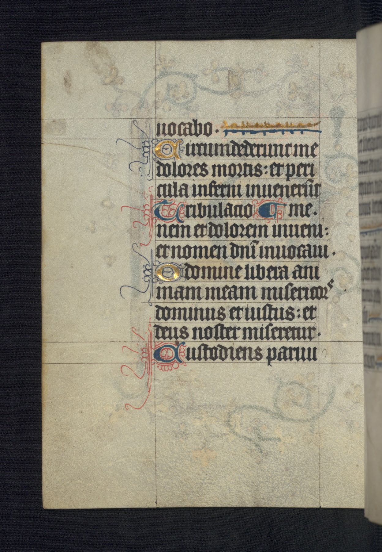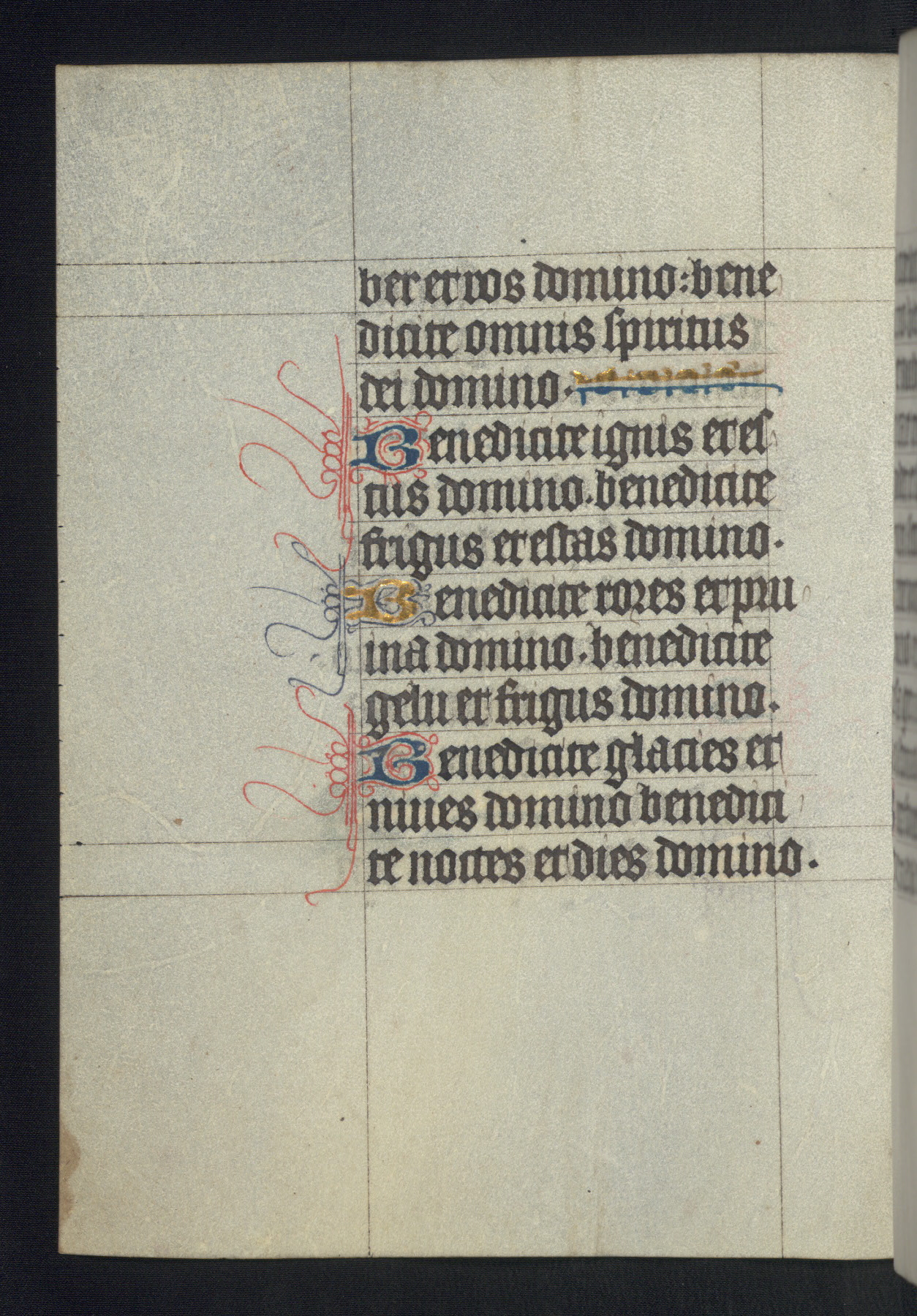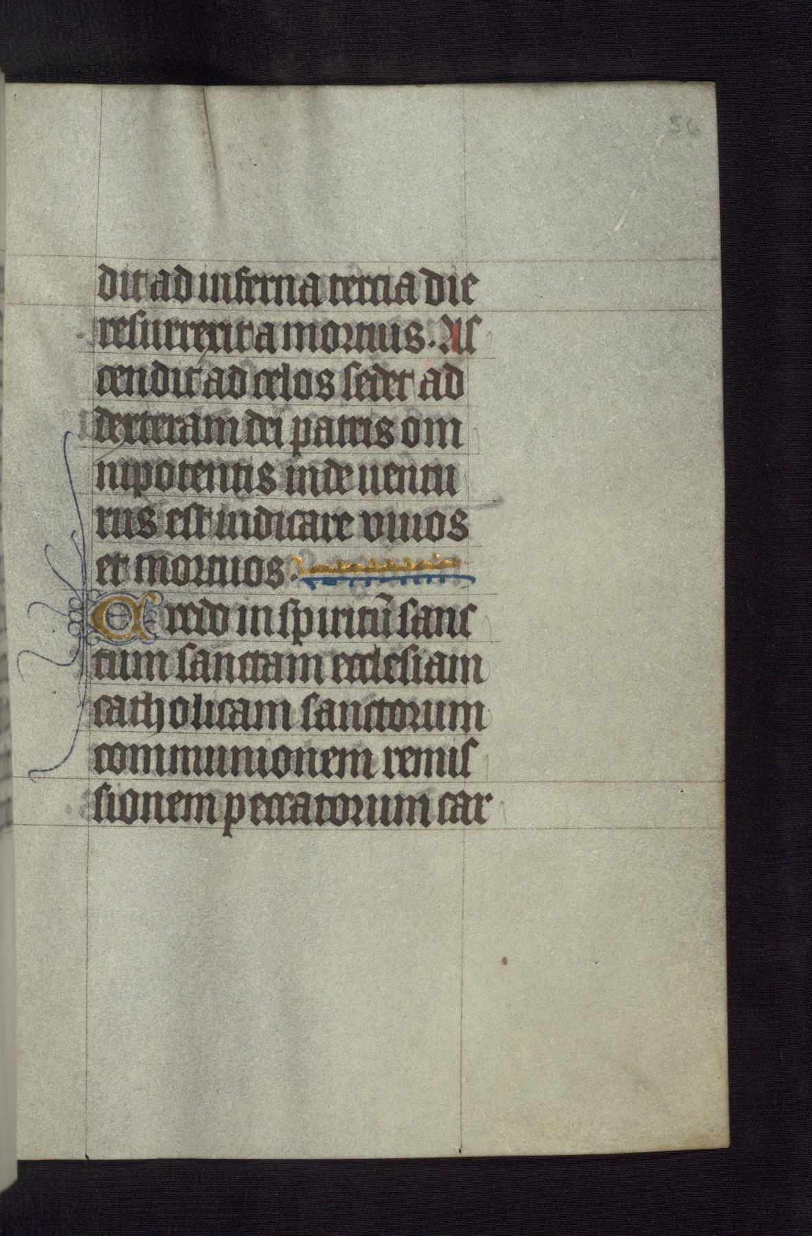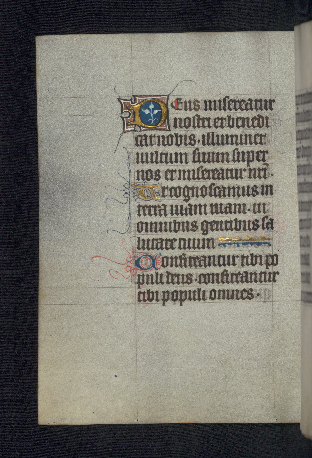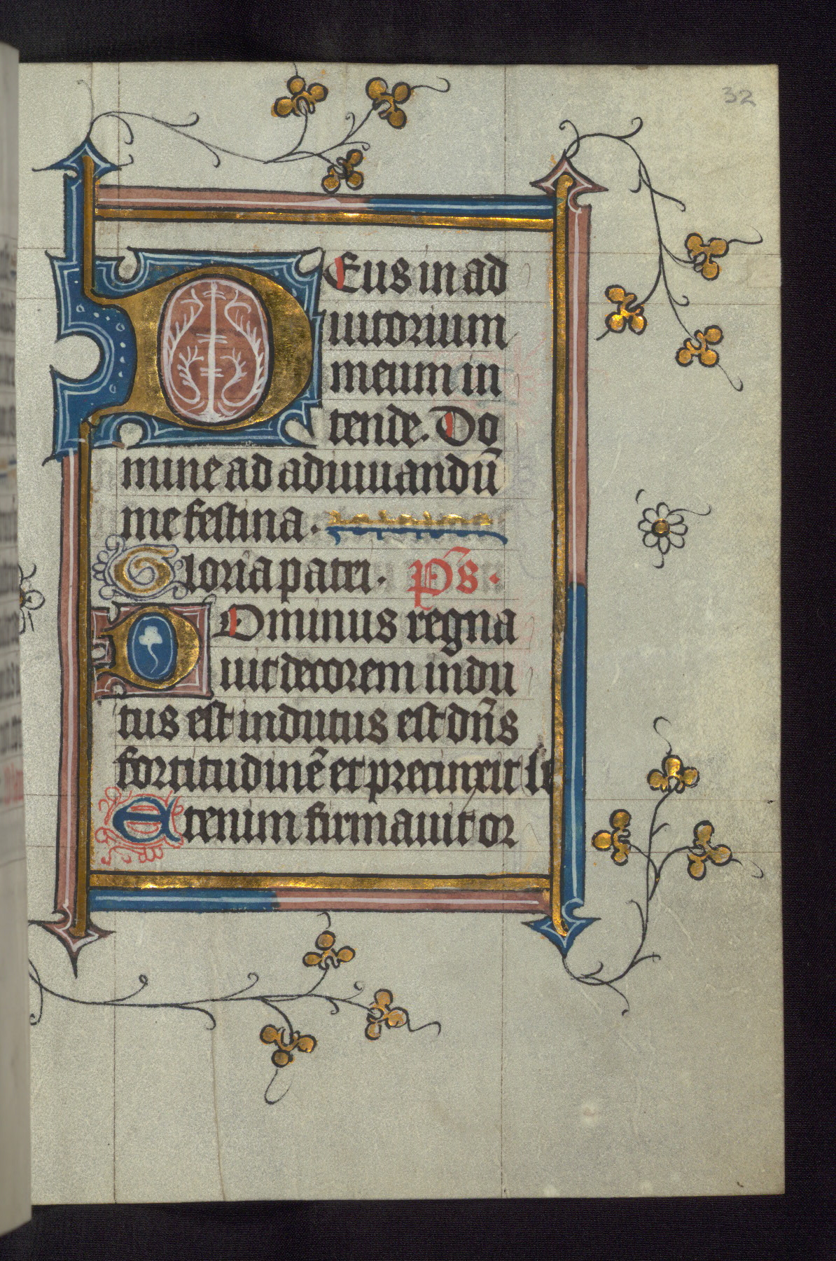 This Book of Hours was named the Doffinnes Hours after Franchoise de Doffinnes, who owned the book in the late sixteenth century and whose family’s subsequent history remains chronicled on the book’s final folios. However, the manuscript was originally made in the first quarter of the fifteenth century, probably for a married couple, who were originally represented kneeling with scrolls and their coats of arms in the margins, flanking a full-page miniature of the Crucifixion (fol. 72v), but whose figures and arms were later erased and overpainted with white. The manuscript contains both Latin and Dutch texts, supplemented by twelve full-page miniatures, the work of the Master of Walters 185. The manuscript also contains twelve pen-and-ink decorated initials in the calendar, some with grotesque faces, and letter "G" descenders throughout the book that can be attributed to the scribe Johannes de Malborch. The book’s original Dutch provenance is indicated by its calendar (for the Use of Utrecht) and its Hours of the Virgin, which follows predominantly the Use of the Windesheim Congregation. Prayers in Dutch were added to the end of the volume in the late fifteenth or early sixteenth century, and the book was subsequently rebound with its current cream-colored parchment binding of the seventeenth or eighteenth century.