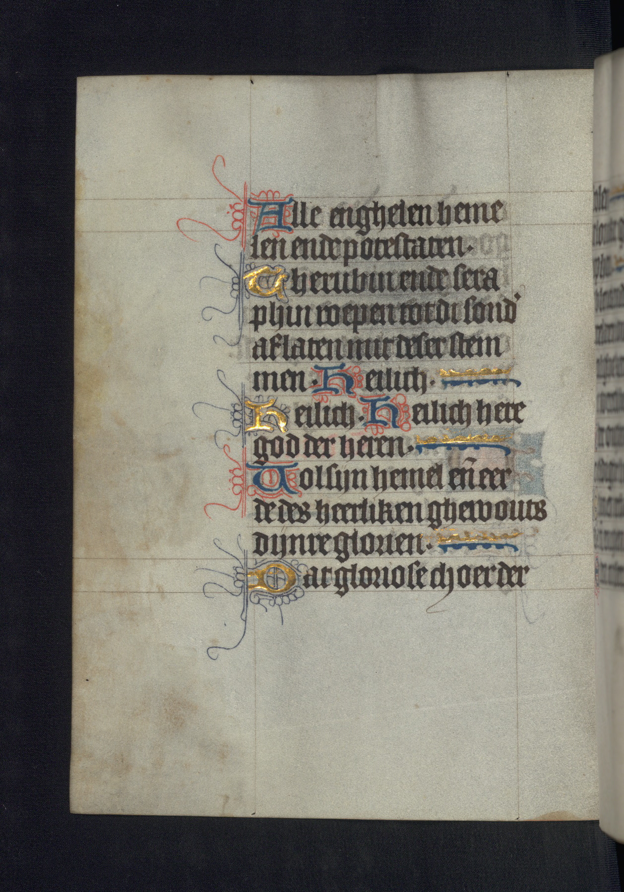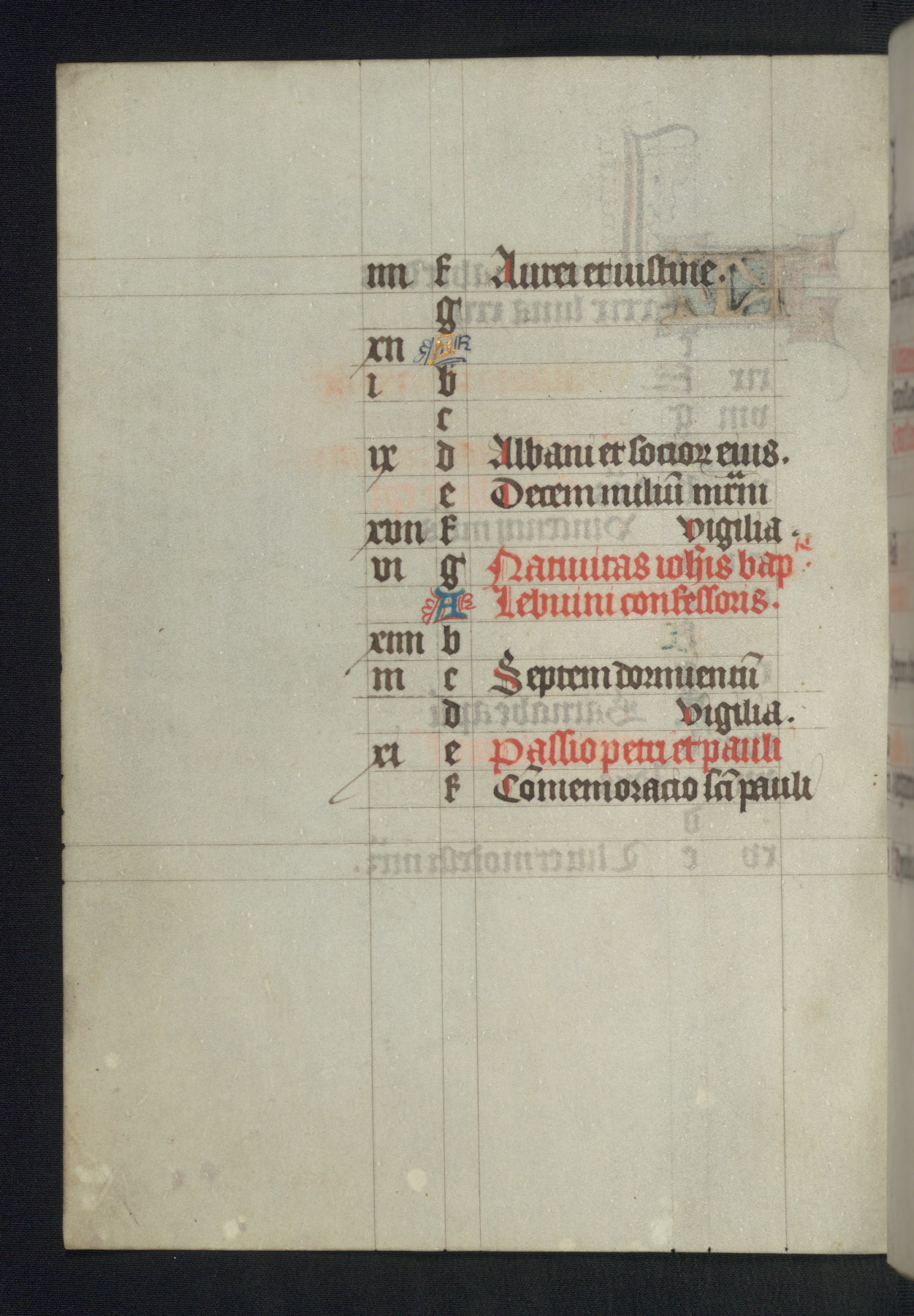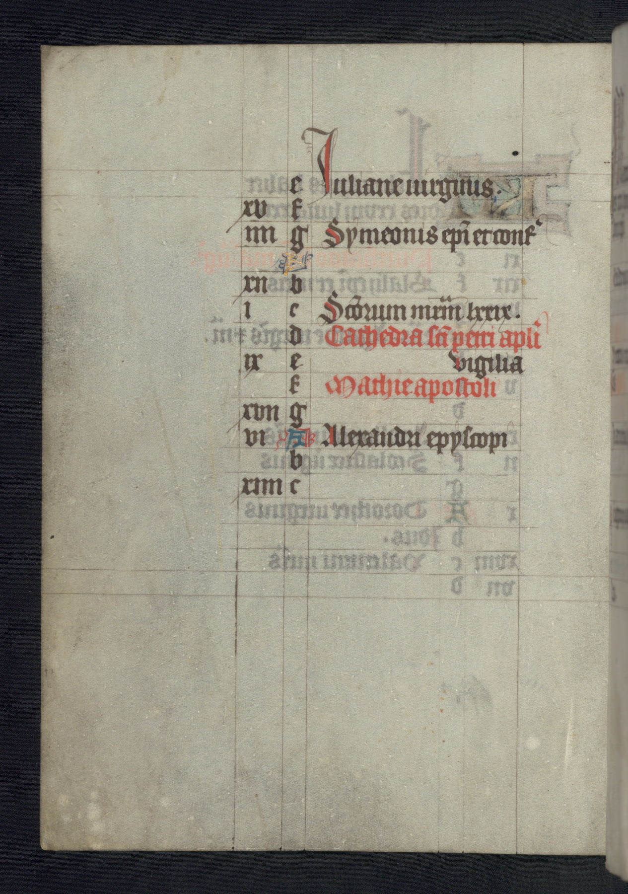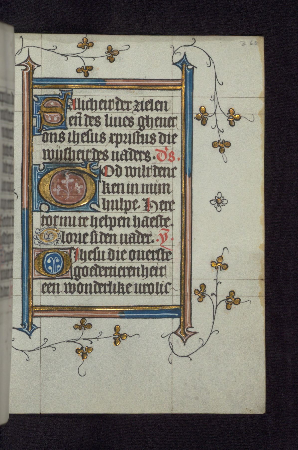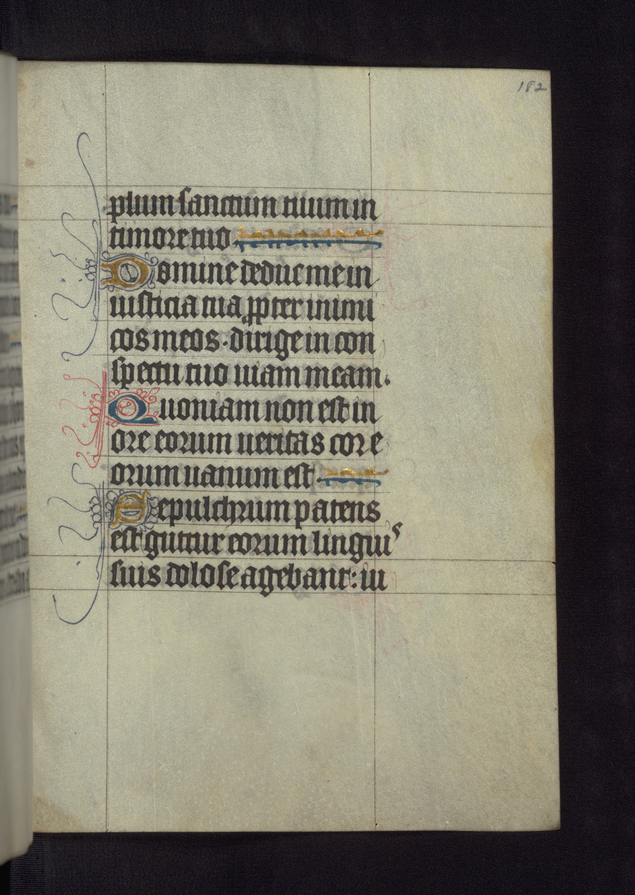 This Book of Hours was named the Doffinnes Hours after Franchoise de Doffinnes, who owned the book in the late sixteenth century and whose family’s subsequent history remains chronicled on the book’s final folios. However, the manuscript was originally made in the first quarter of the fifteenth century, probably for a married couple, who were originally represented kneeling with scrolls and their coats of arms in the margins, flanking a full-page miniature of the Crucifixion (fol. 72v), but whose figures and arms were later erased and overpainted with white. The manuscript contains both Latin and Dutch texts, supplemented by twelve full-page miniatures, the work of the Master of Walters 185. The manuscript also contains twelve pen-and-ink decorated initials in the calendar, some with grotesque faces, and letter "G" descenders throughout the book that can be attributed to the scribe Johannes de Malborch. The book’s original Dutch provenance is indicated by its calendar (for the Use of Utrecht) and its Hours of the Virgin, which follows predominantly the Use of the Windesheim Congregation. Prayers in Dutch were added to the end of the volume in the late fifteenth or early sixteenth century, and the book was subsequently rebound with its current cream-colored parchment binding of the seventeenth or eighteenth century.