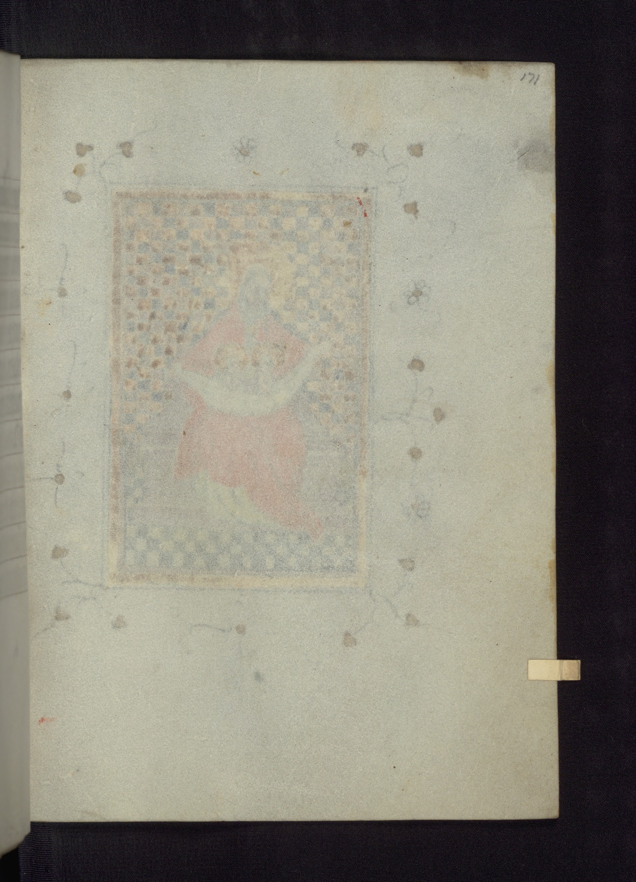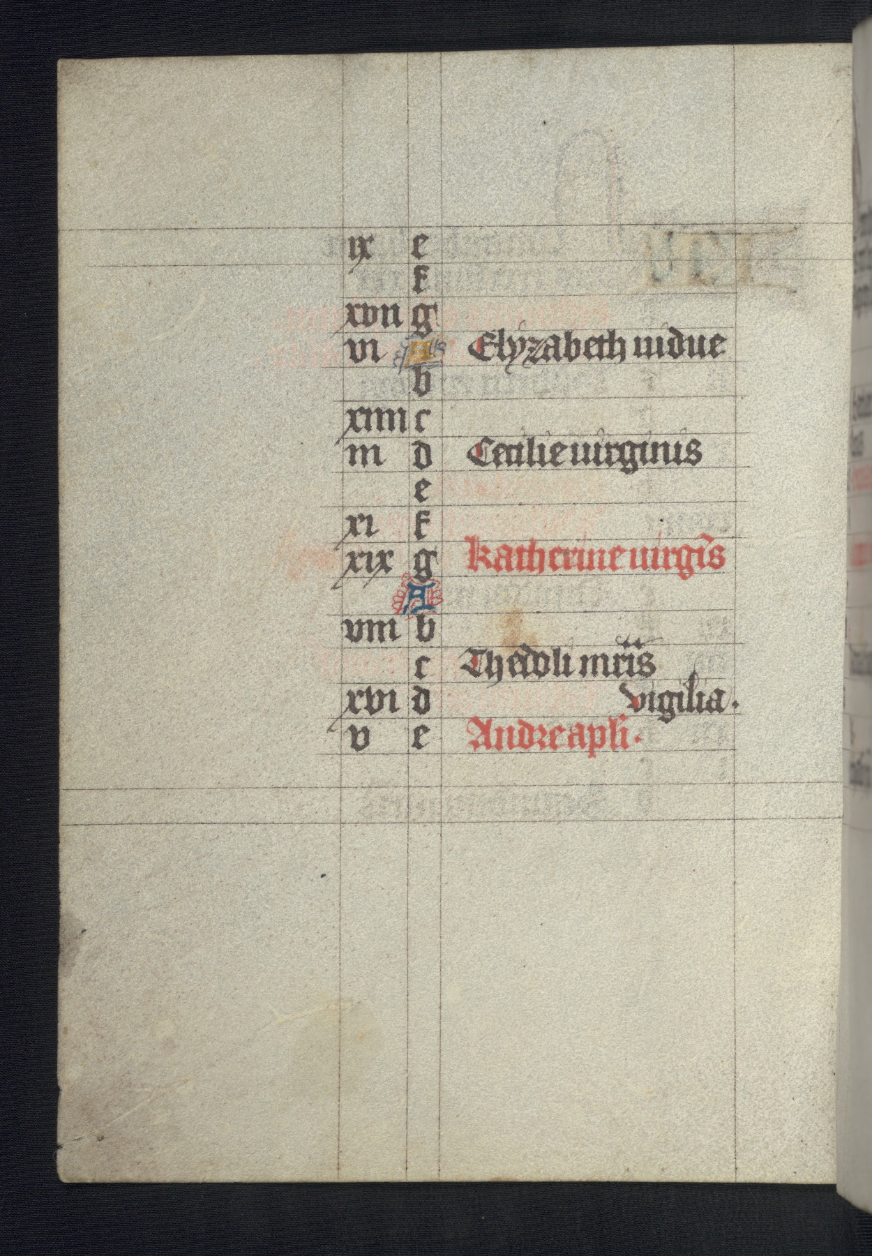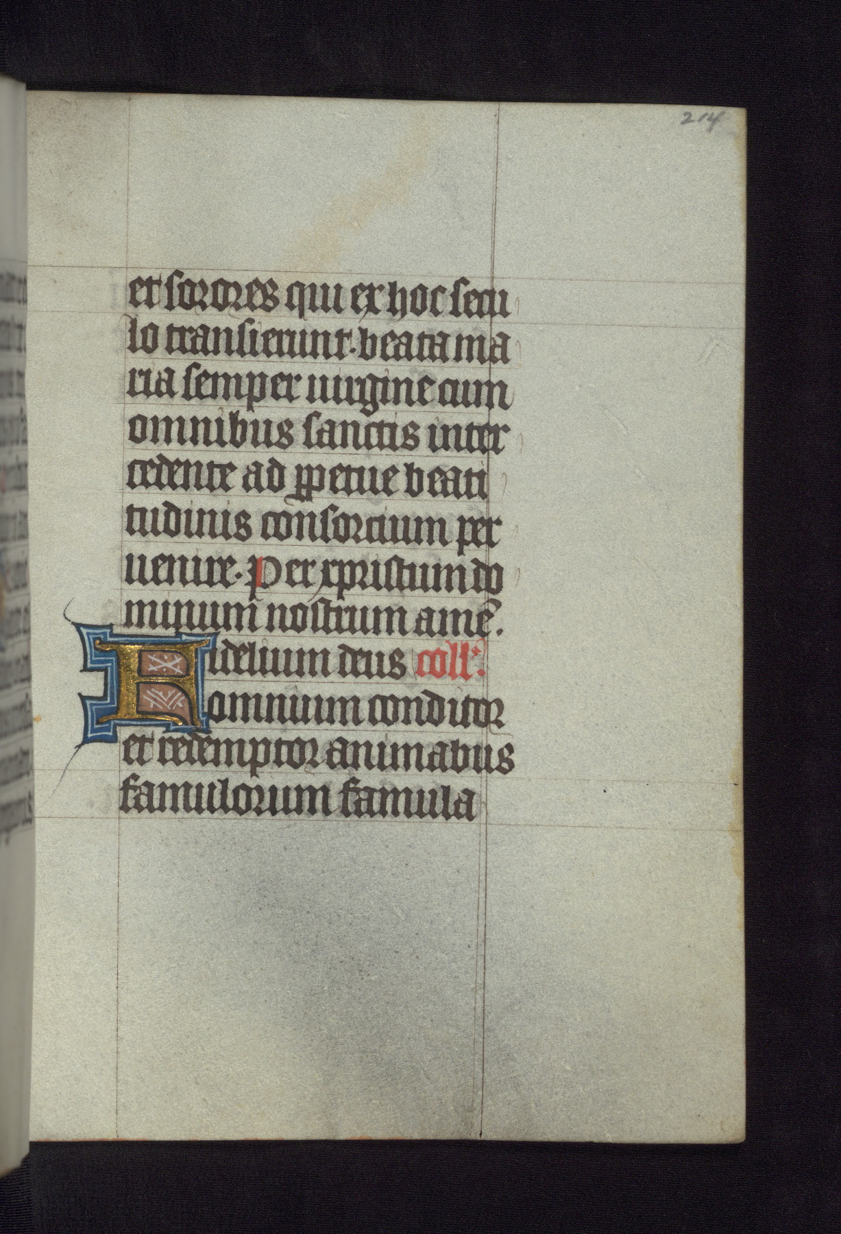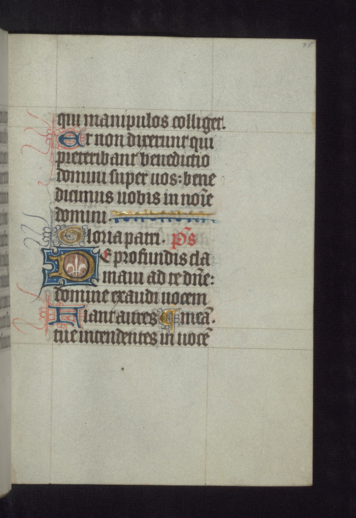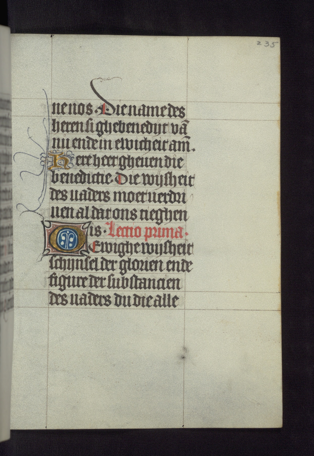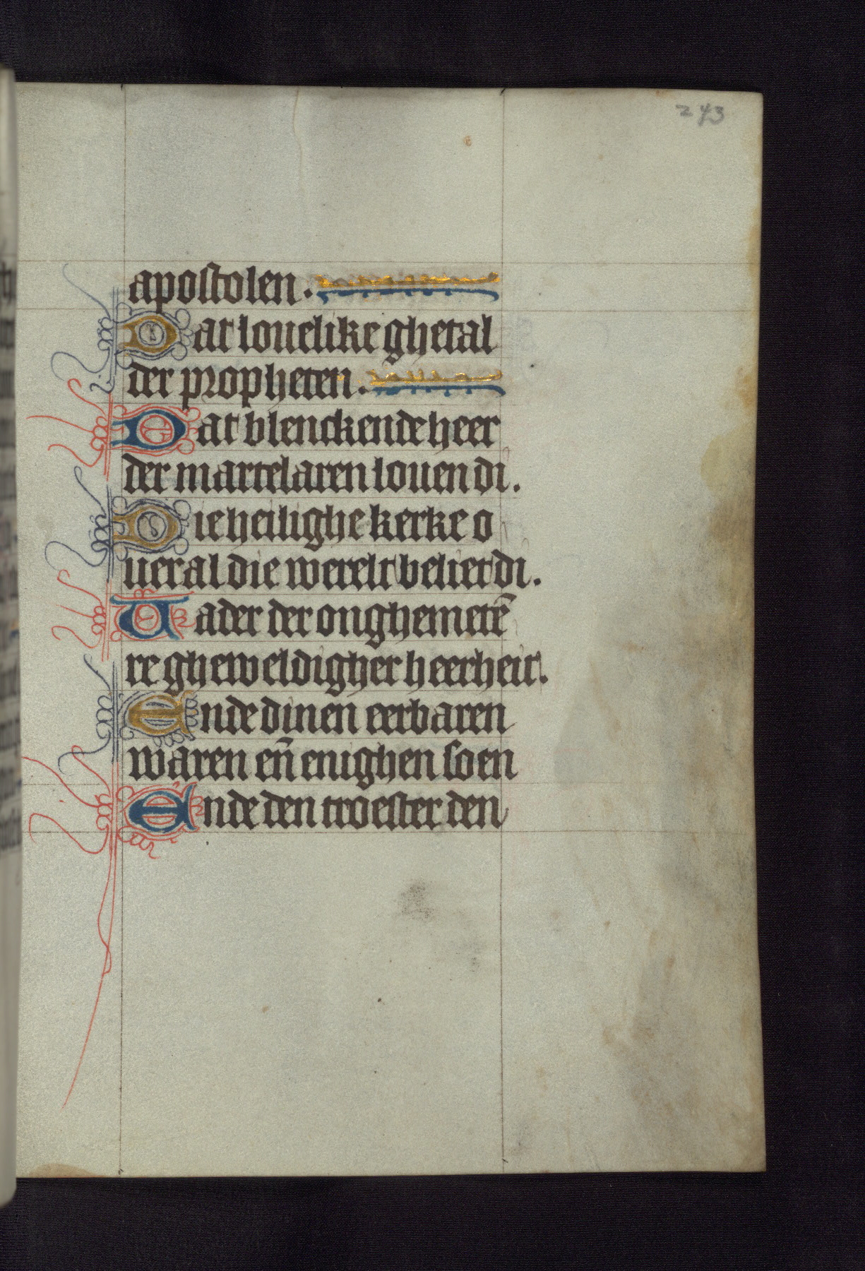 This Book of Hours was named the Doffinnes Hours after Franchoise de Doffinnes, who owned the book in the late sixteenth century and whose family’s subsequent history remains chronicled on the book’s final folios. However, the manuscript was originally made in the first quarter of the fifteenth century, probably for a married couple, who were originally represented kneeling with scrolls and their coats of arms in the margins, flanking a full-page miniature of the Crucifixion (fol. 72v), but whose figures and arms were later erased and overpainted with white. The manuscript contains both Latin and Dutch texts, supplemented by twelve full-page miniatures, the work of the Master of Walters 185. The manuscript also contains twelve pen-and-ink decorated initials in the calendar, some with grotesque faces, and letter "G" descenders throughout the book that can be attributed to the scribe Johannes de Malborch. The book’s original Dutch provenance is indicated by its calendar (for the Use of Utrecht) and its Hours of the Virgin, which follows predominantly the Use of the Windesheim Congregation. Prayers in Dutch were added to the end of the volume in the late fifteenth or early sixteenth century, and the book was subsequently rebound with its current cream-colored parchment binding of the seventeenth or eighteenth century.