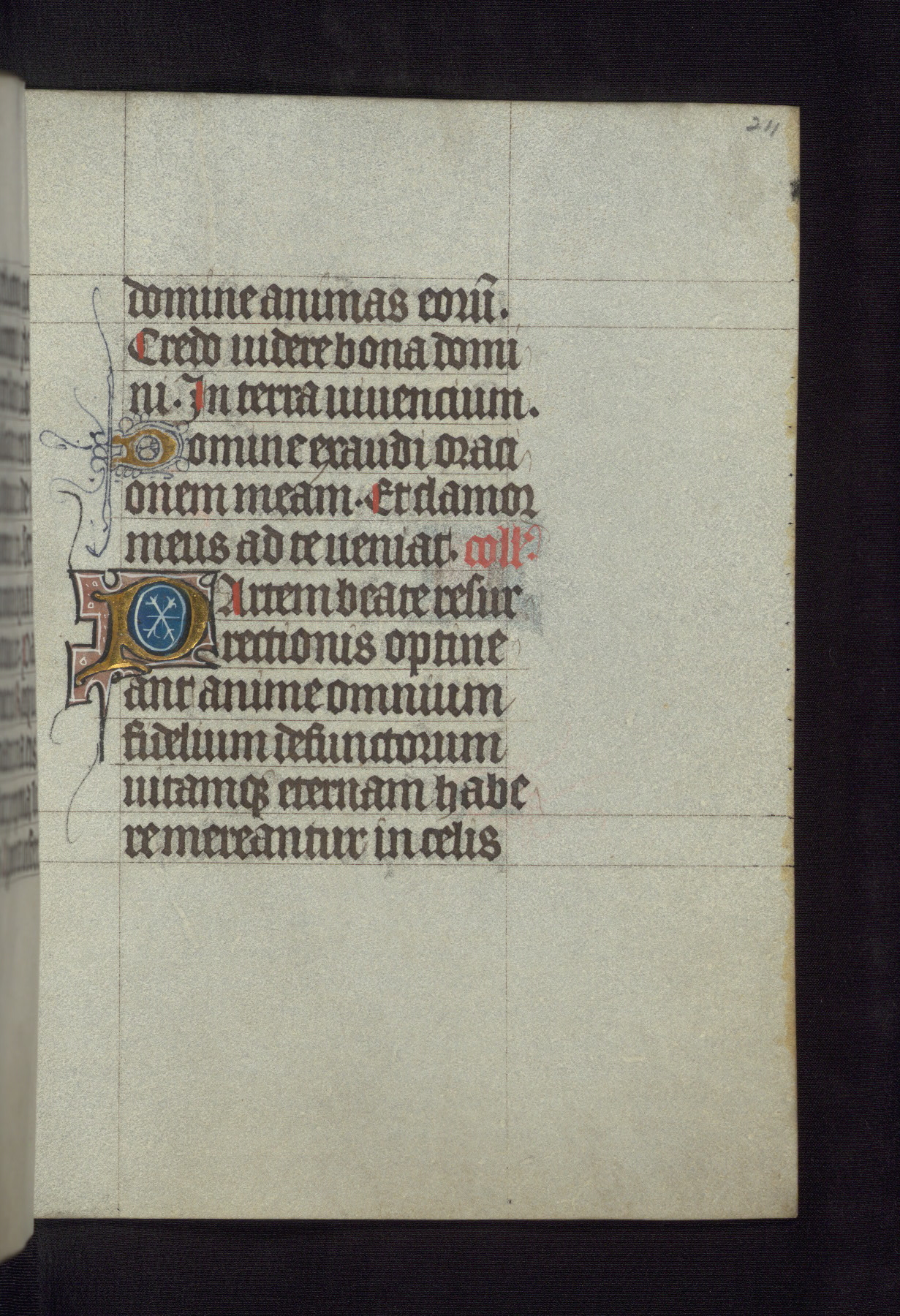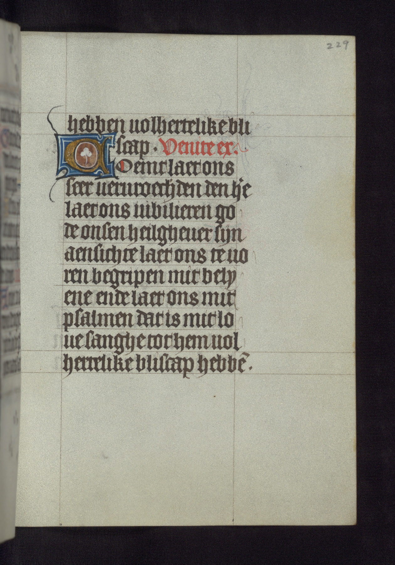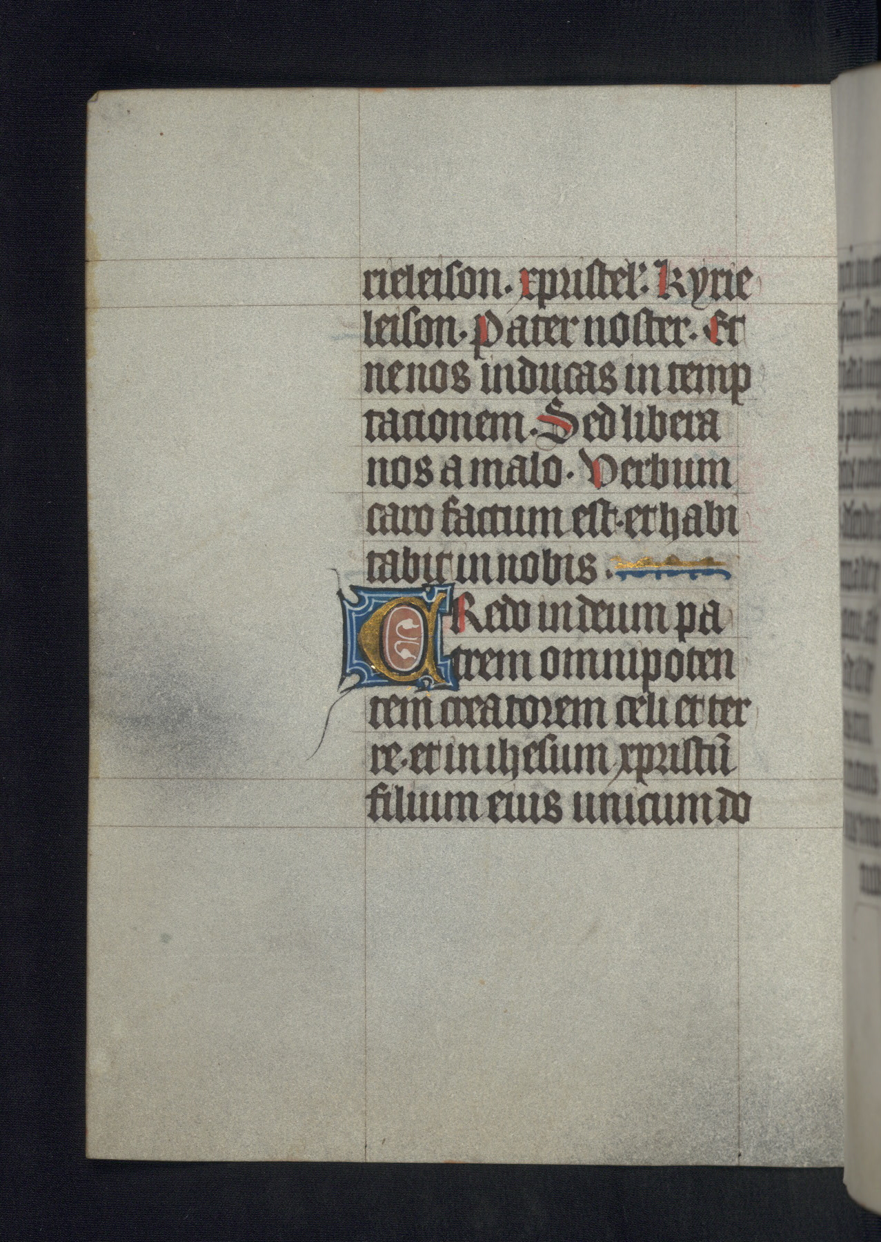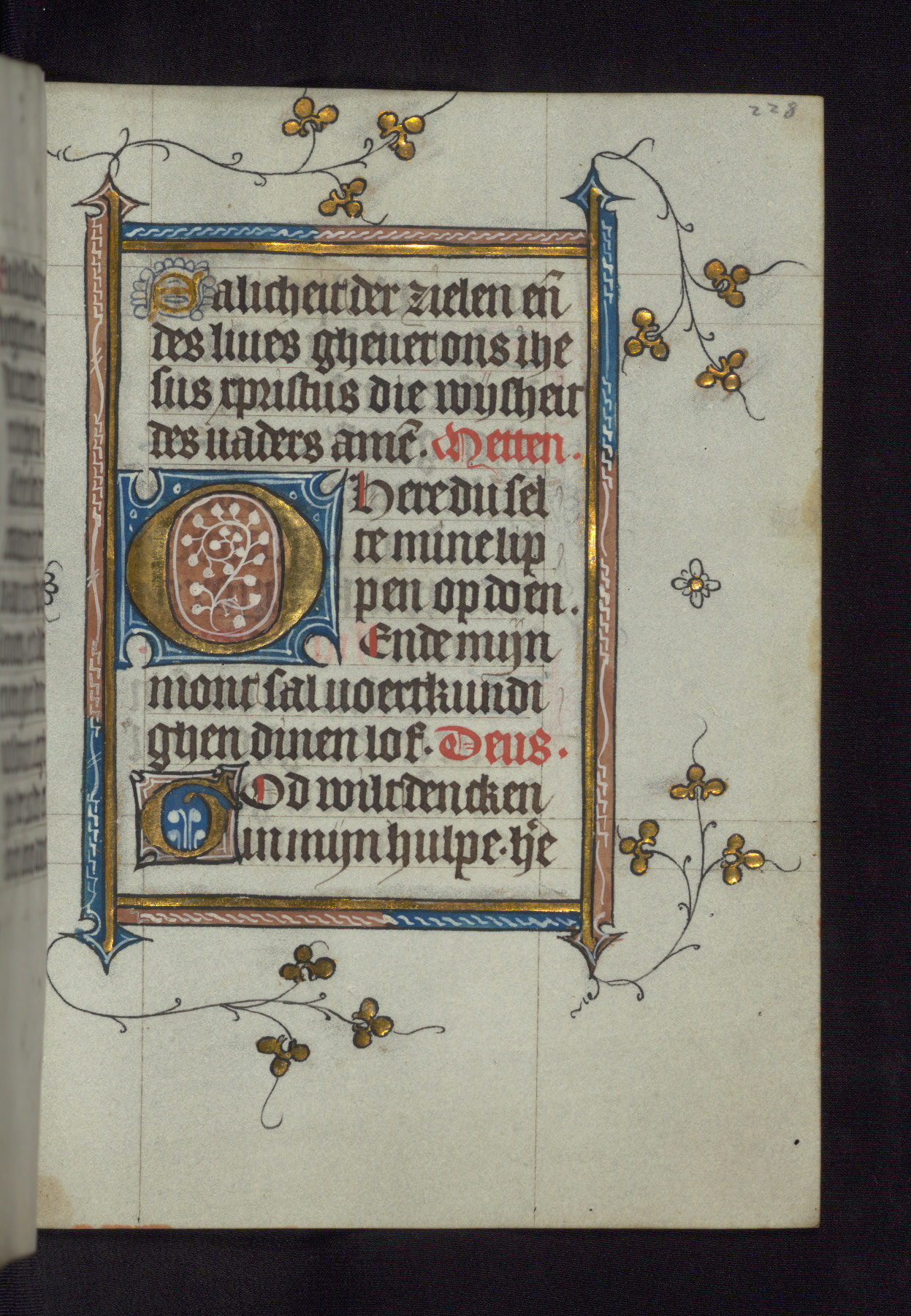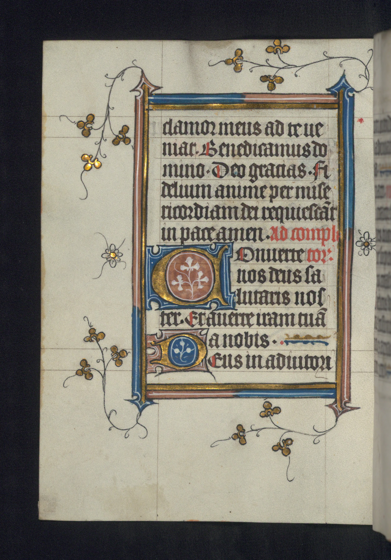 This Book of Hours was named the Doffinnes Hours after Franchoise de Doffinnes, who owned the book in the late sixteenth century and whose family’s subsequent history remains chronicled on the book’s final folios. However, the manuscript was originally made in the first quarter of the fifteenth century, probably for a married couple, who were originally represented kneeling with scrolls and their coats of arms in the margins, flanking a full-page miniature of the Crucifixion (fol. 72v), but whose figures and arms were later erased and overpainted with white. The manuscript contains both Latin and Dutch texts, supplemented by twelve full-page miniatures, the work of the Master of Walters 185. The manuscript also contains twelve pen-and-ink decorated initials in the calendar, some with grotesque faces, and letter "G" descenders throughout the book that can be attributed to the scribe Johannes de Malborch. The book’s original Dutch provenance is indicated by its calendar (for the Use of Utrecht) and its Hours of the Virgin, which follows predominantly the Use of the Windesheim Congregation. Prayers in Dutch were added to the end of the volume in the late fifteenth or early sixteenth century, and the book was subsequently rebound with its current cream-colored parchment binding of the seventeenth or eighteenth century.