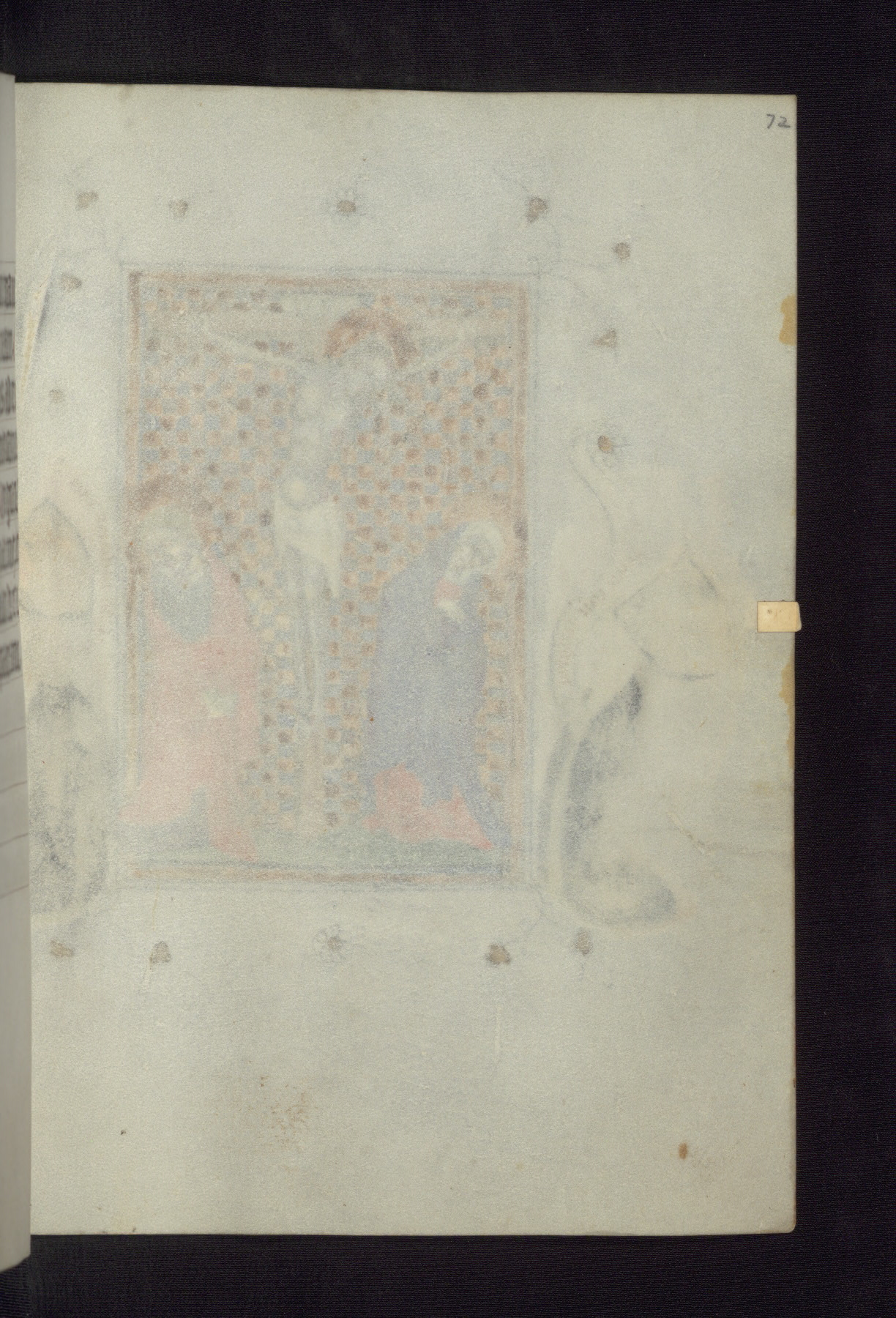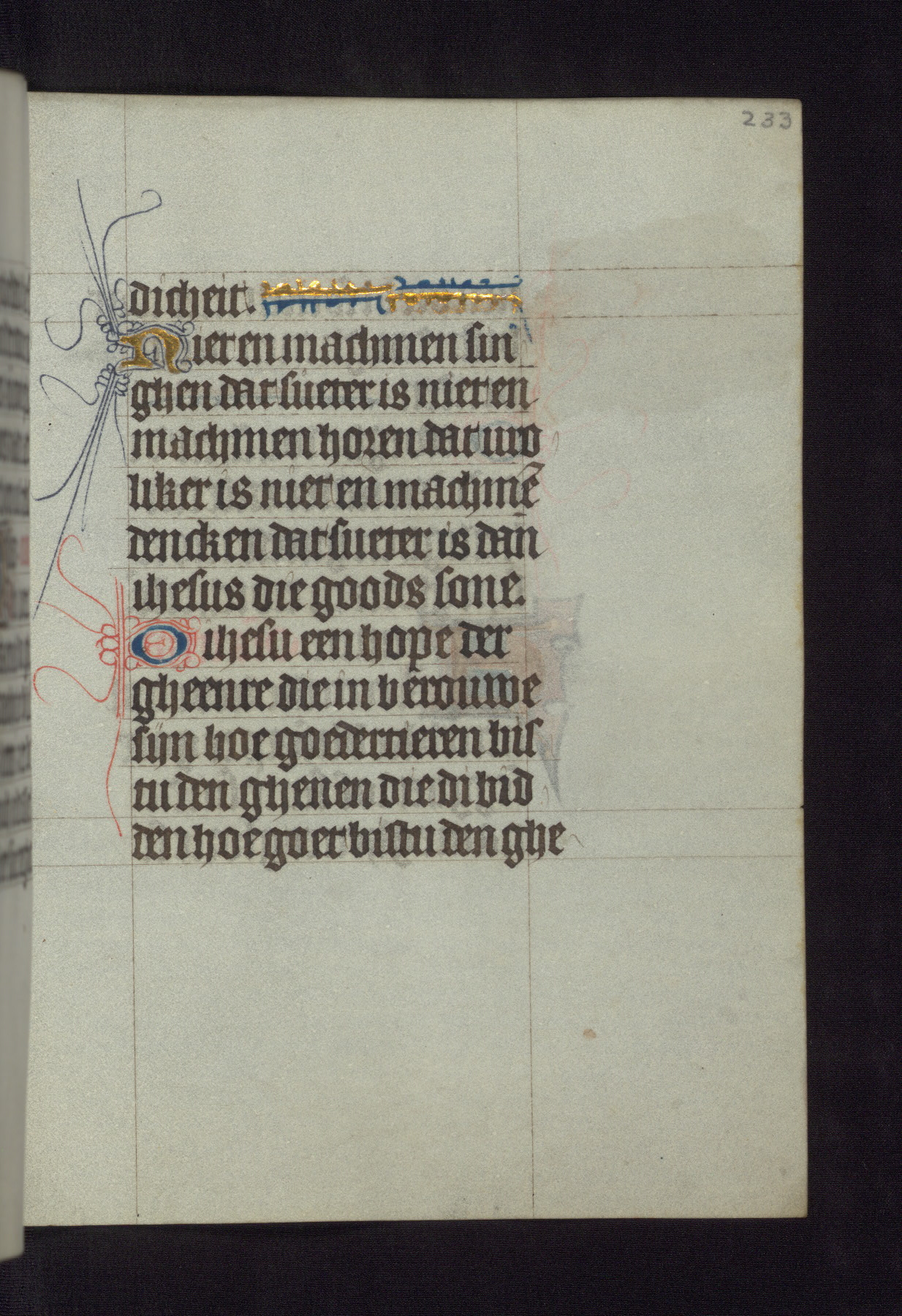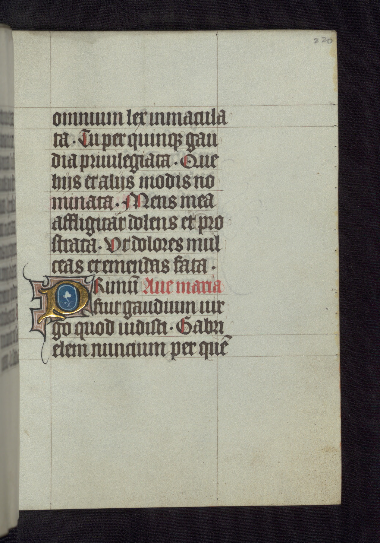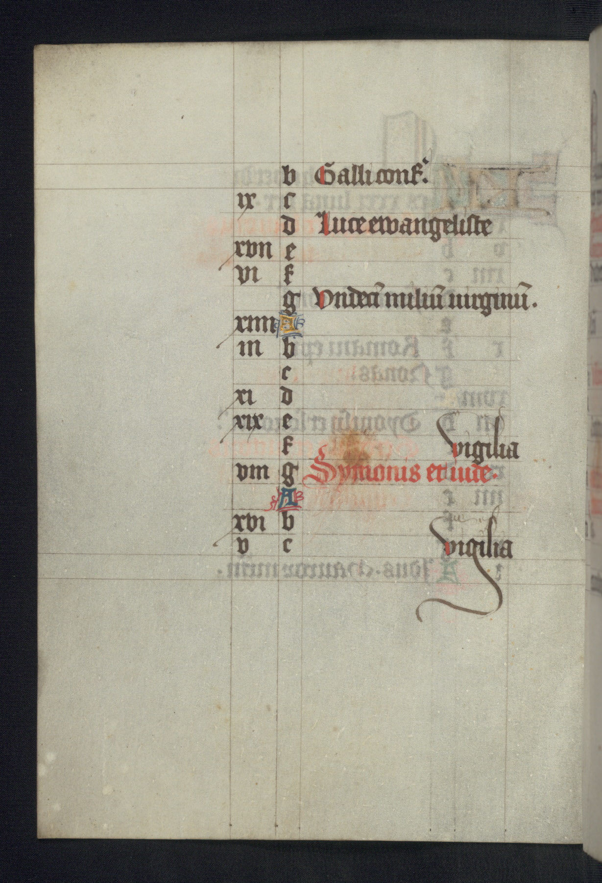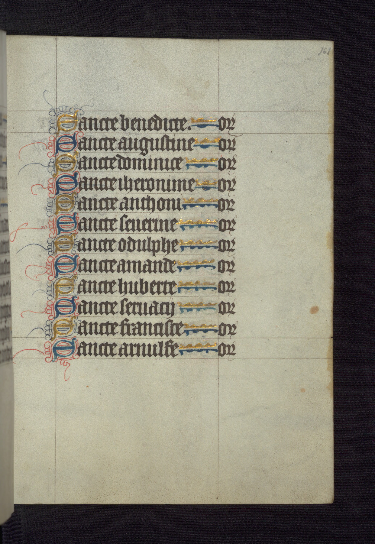 This Book of Hours was named the Doffinnes Hours after Franchoise de Doffinnes, who owned the book in the late sixteenth century and whose family’s subsequent history remains chronicled on the book’s final folios. However, the manuscript was originally made in the first quarter of the fifteenth century, probably for a married couple, who were originally represented kneeling with scrolls and their coats of arms in the margins, flanking a full-page miniature of the Crucifixion (fol. 72v), but whose figures and arms were later erased and overpainted with white. The manuscript contains both Latin and Dutch texts, supplemented by twelve full-page miniatures, the work of the Master of Walters 185. The manuscript also contains twelve pen-and-ink decorated initials in the calendar, some with grotesque faces, and letter "G" descenders throughout the book that can be attributed to the scribe Johannes de Malborch. The book’s original Dutch provenance is indicated by its calendar (for the Use of Utrecht) and its Hours of the Virgin, which follows predominantly the Use of the Windesheim Congregation. Prayers in Dutch were added to the end of the volume in the late fifteenth or early sixteenth century, and the book was subsequently rebound with its current cream-colored parchment binding of the seventeenth or eighteenth century.