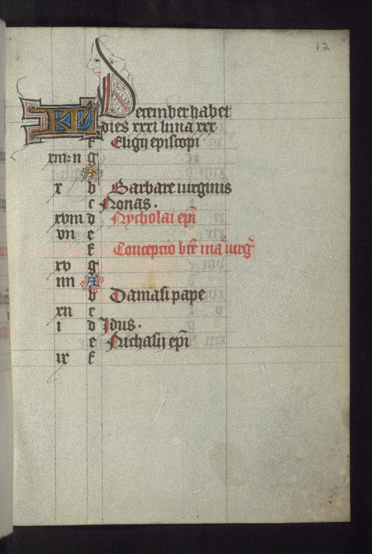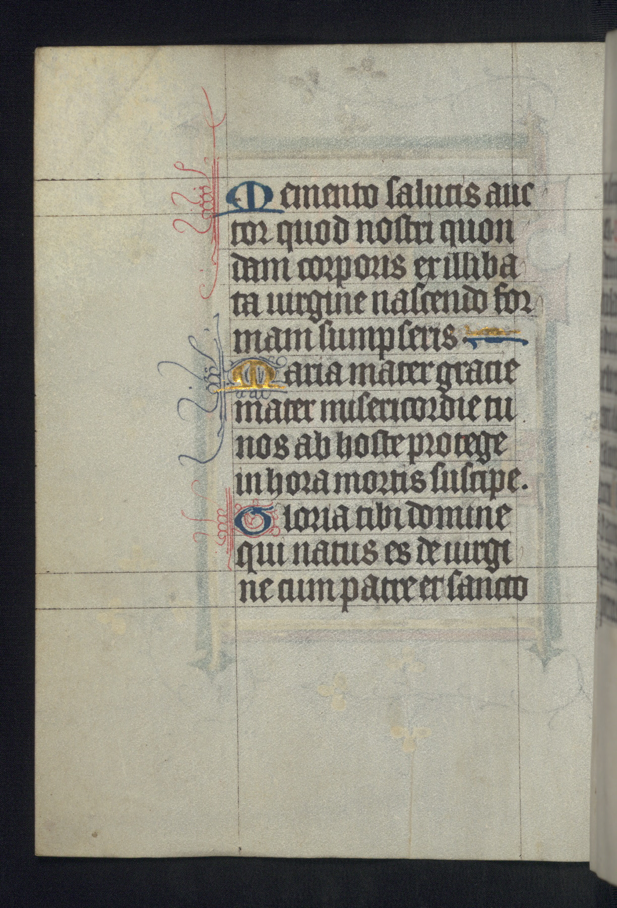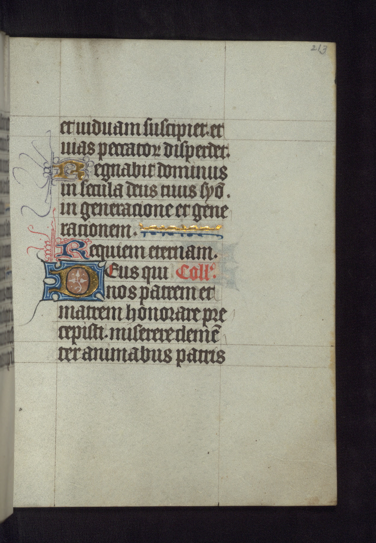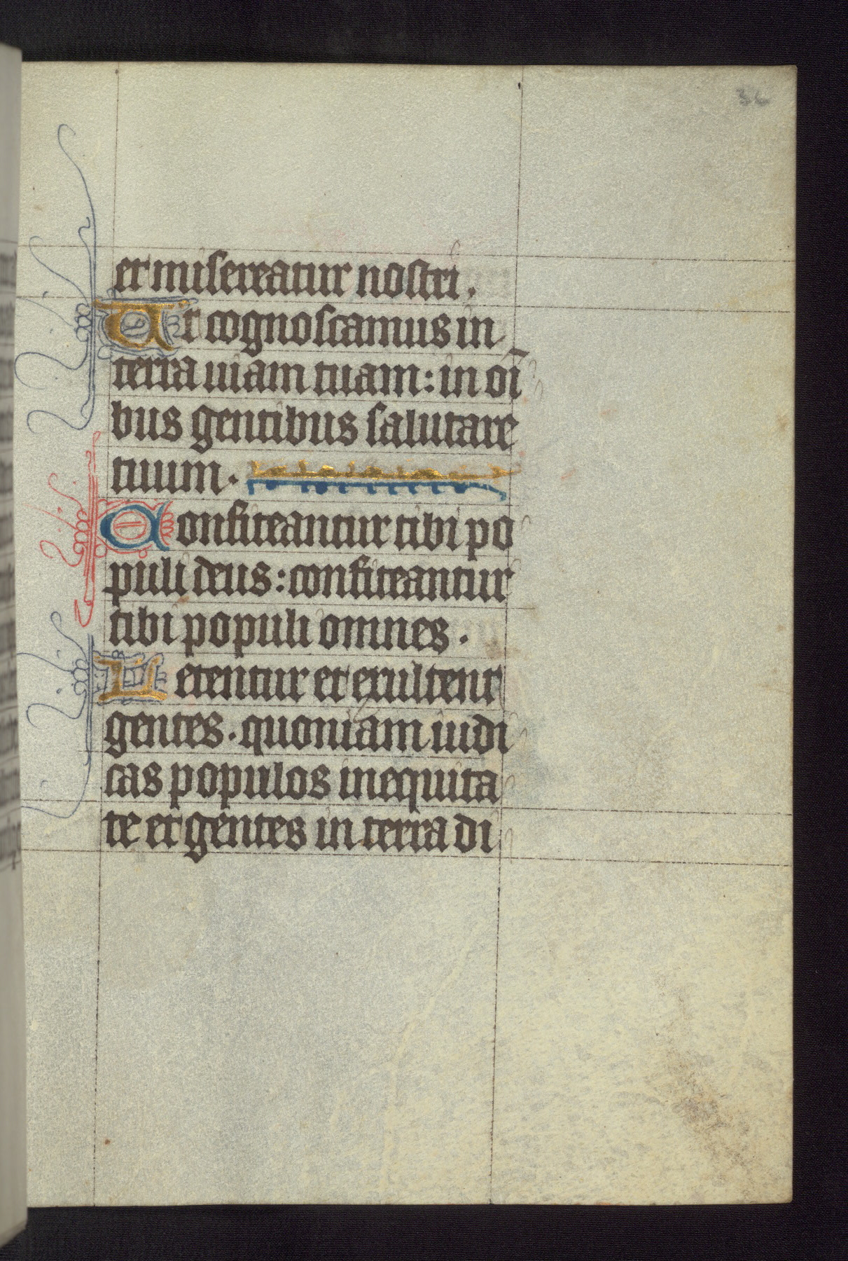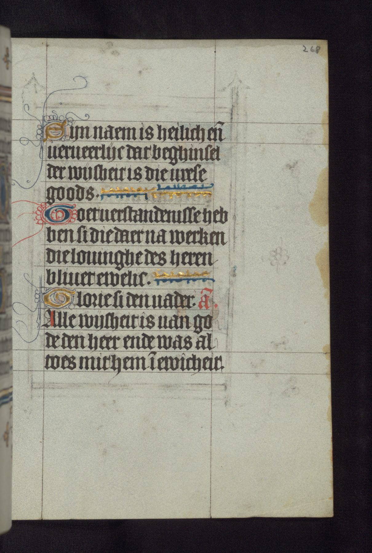 This Book of Hours was named the Doffinnes Hours after Franchoise de Doffinnes, who owned the book in the late sixteenth century and whose family’s subsequent history remains chronicled on the book’s final folios. However, the manuscript was originally made in the first quarter of the fifteenth century, probably for a married couple, who were originally represented kneeling with scrolls and their coats of arms in the margins, flanking a full-page miniature of the Crucifixion (fol. 72v), but whose figures and arms were later erased and overpainted with white. The manuscript contains both Latin and Dutch texts, supplemented by twelve full-page miniatures, the work of the Master of Walters 185. The manuscript also contains twelve pen-and-ink decorated initials in the calendar, some with grotesque faces, and letter "G" descenders throughout the book that can be attributed to the scribe Johannes de Malborch. The book’s original Dutch provenance is indicated by its calendar (for the Use of Utrecht) and its Hours of the Virgin, which follows predominantly the Use of the Windesheim Congregation. Prayers in Dutch were added to the end of the volume in the late fifteenth or early sixteenth century, and the book was subsequently rebound with its current cream-colored parchment binding of the seventeenth or eighteenth century.