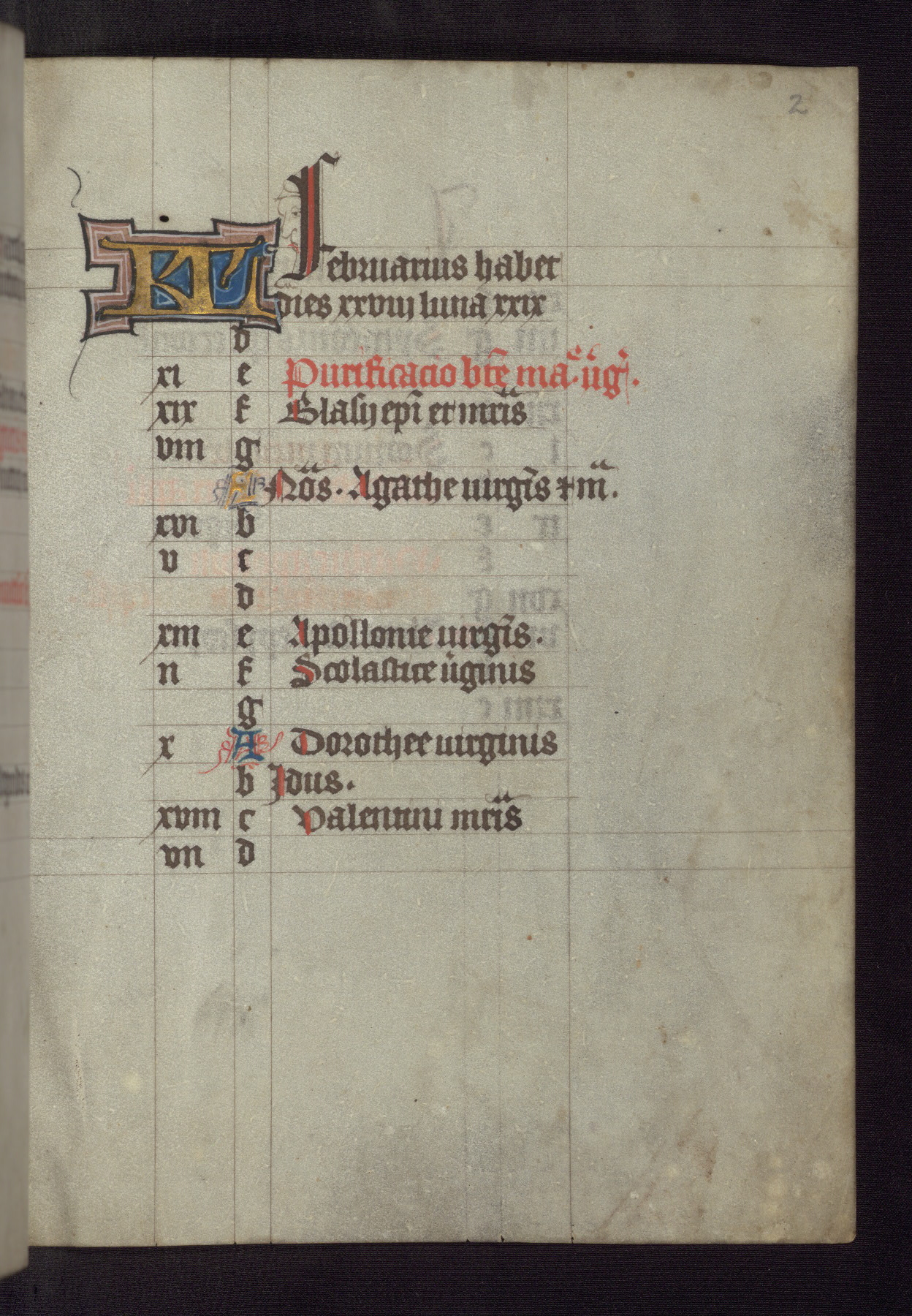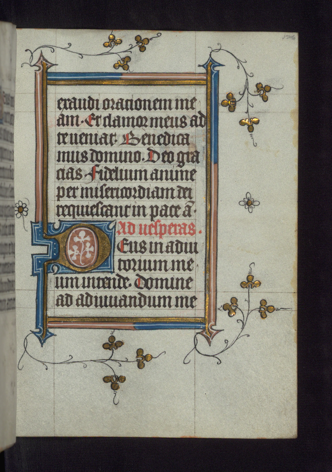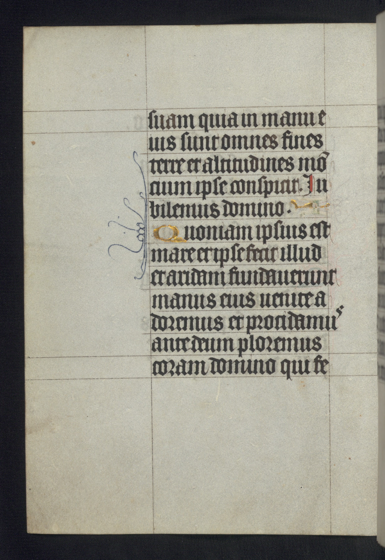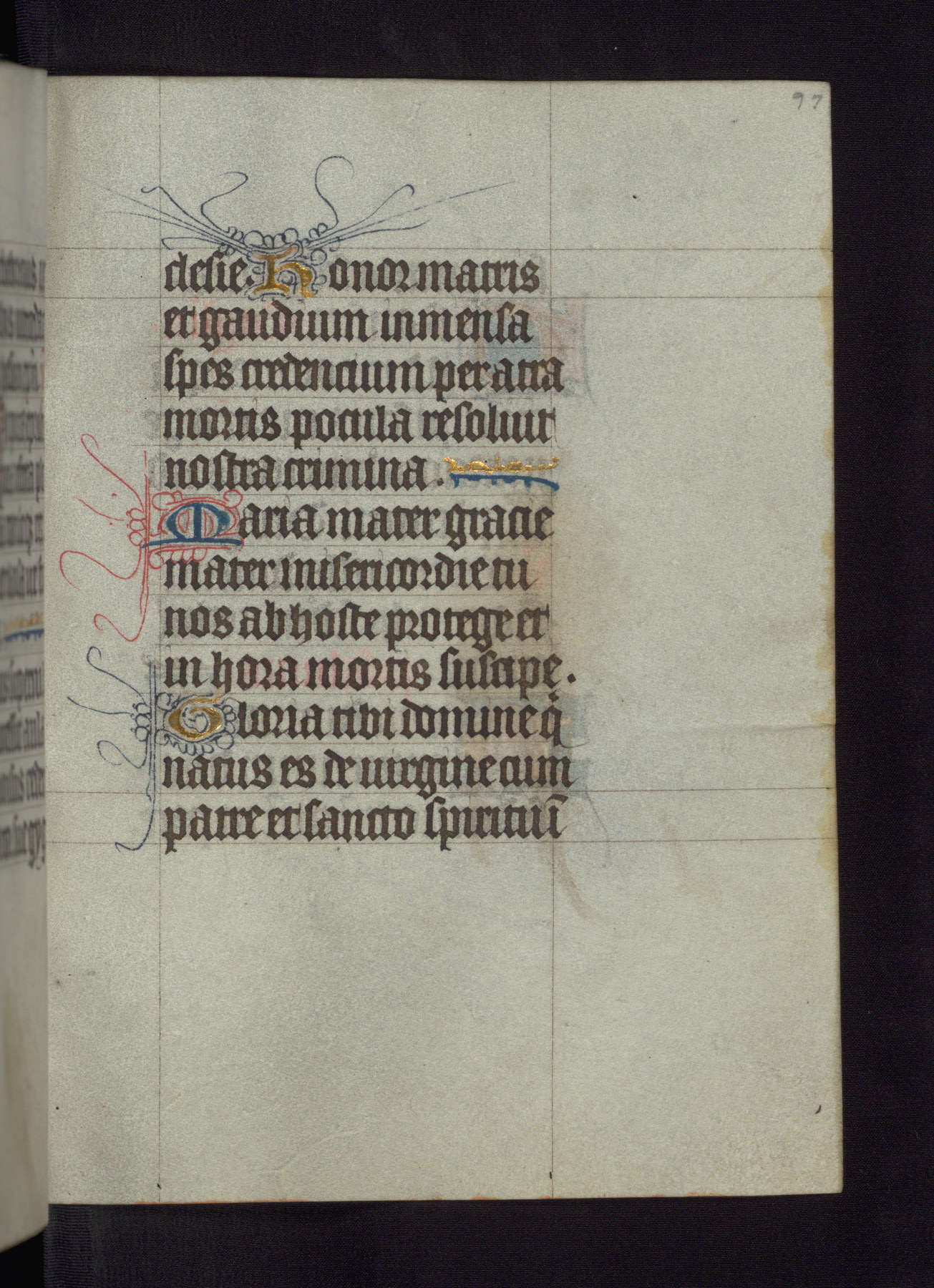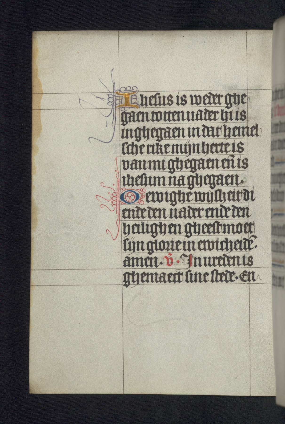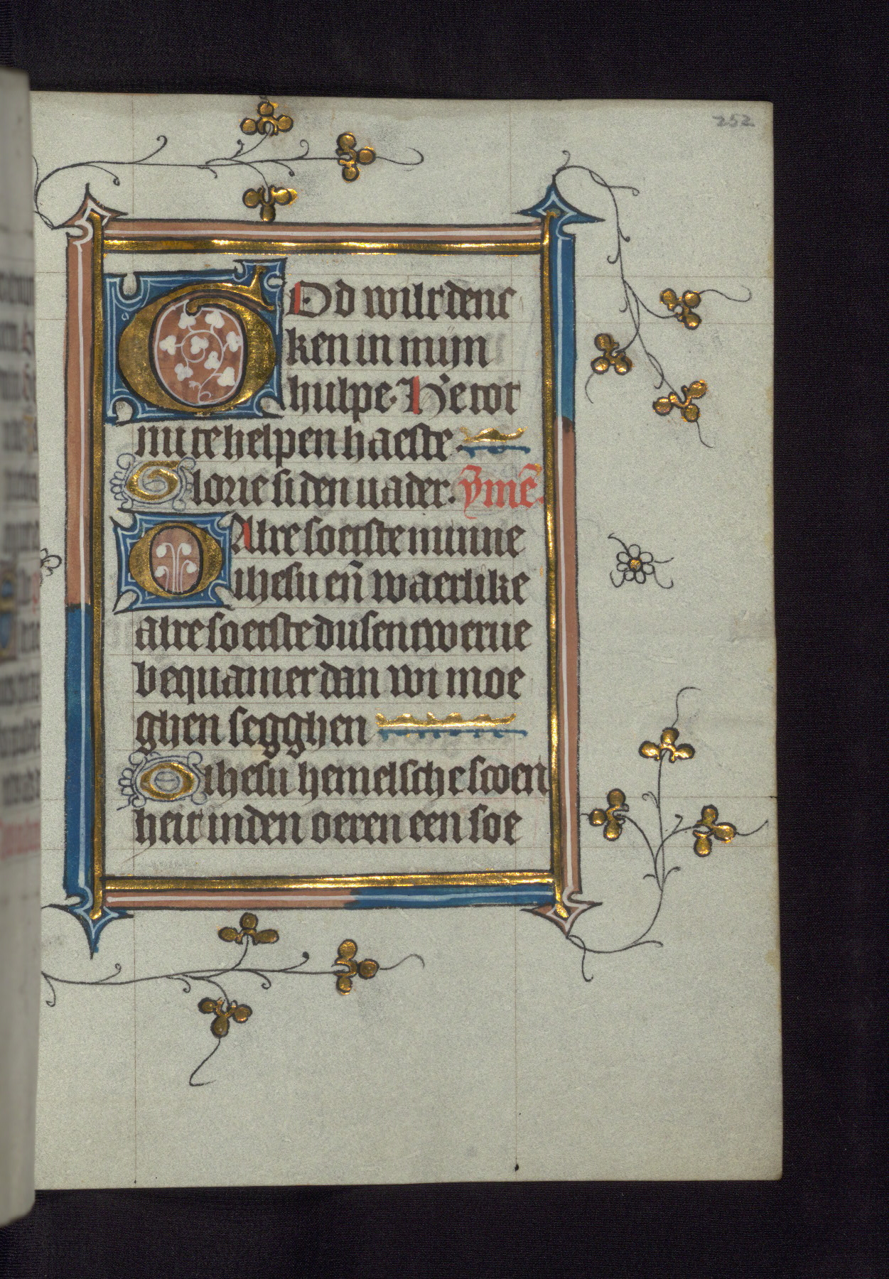 This Book of Hours was named the Doffinnes Hours after Franchoise de Doffinnes, who owned the book in the late sixteenth century and whose family’s subsequent history remains chronicled on the book’s final folios. However, the manuscript was originally made in the first quarter of the fifteenth century, probably for a married couple, who were originally represented kneeling with scrolls and their coats of arms in the margins, flanking a full-page miniature of the Crucifixion (fol. 72v), but whose figures and arms were later erased and overpainted with white. The manuscript contains both Latin and Dutch texts, supplemented by twelve full-page miniatures, the work of the Master of Walters 185. The manuscript also contains twelve pen-and-ink decorated initials in the calendar, some with grotesque faces, and letter "G" descenders throughout the book that can be attributed to the scribe Johannes de Malborch. The book’s original Dutch provenance is indicated by its calendar (for the Use of Utrecht) and its Hours of the Virgin, which follows predominantly the Use of the Windesheim Congregation. Prayers in Dutch were added to the end of the volume in the late fifteenth or early sixteenth century, and the book was subsequently rebound with its current cream-colored parchment binding of the seventeenth or eighteenth century.