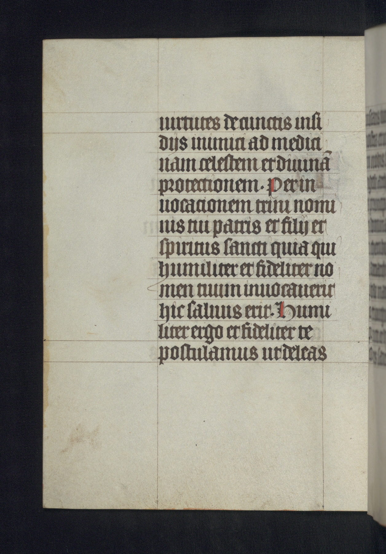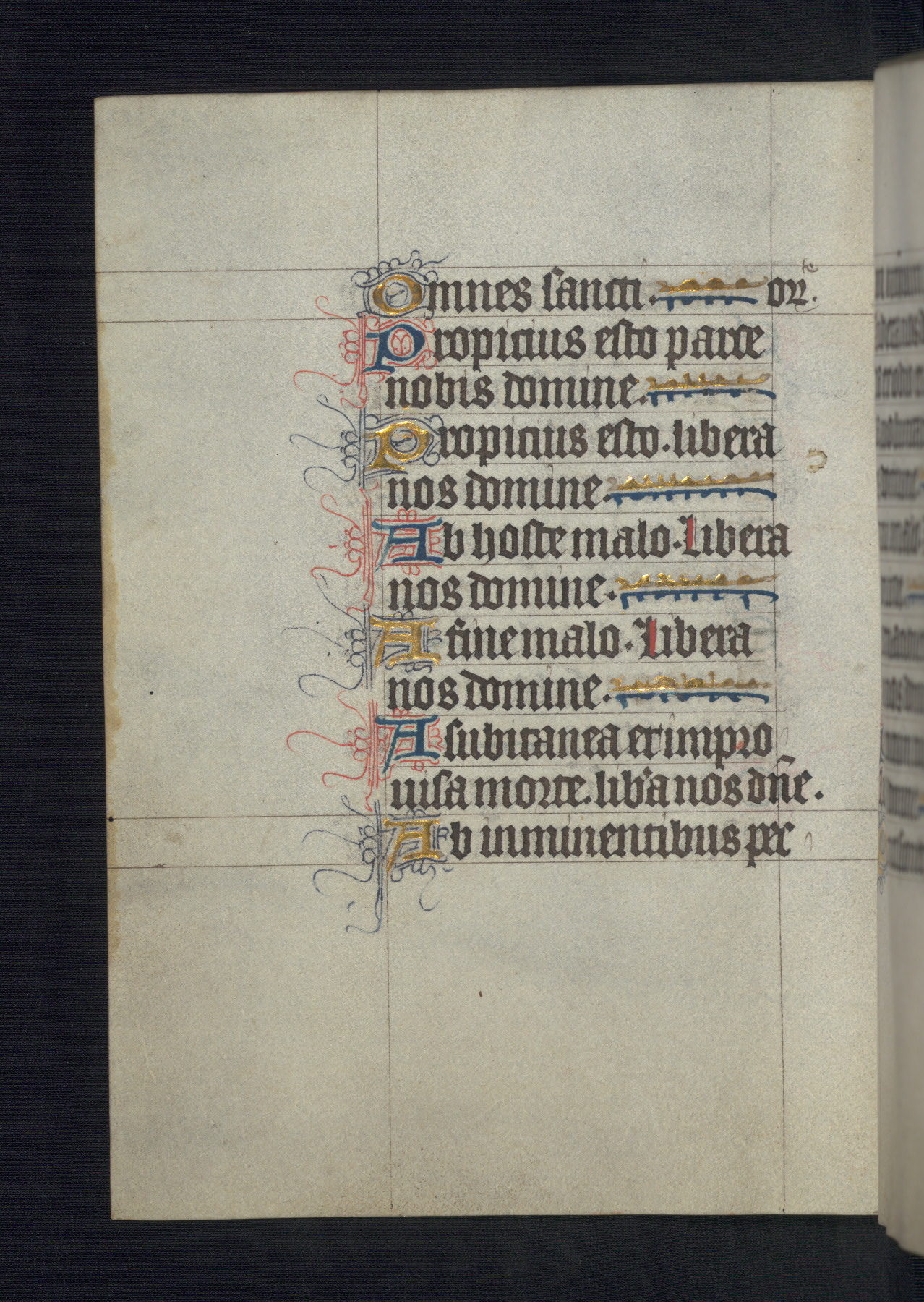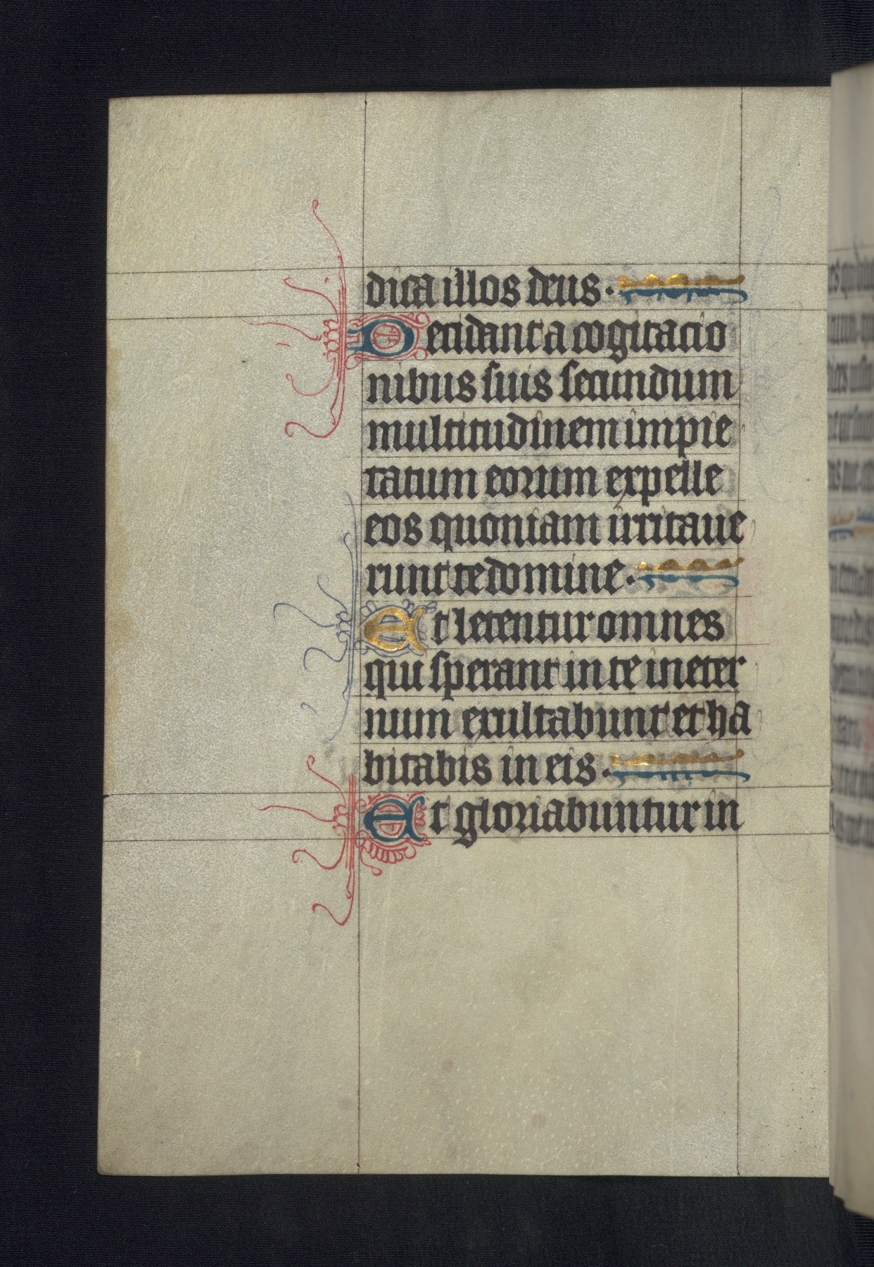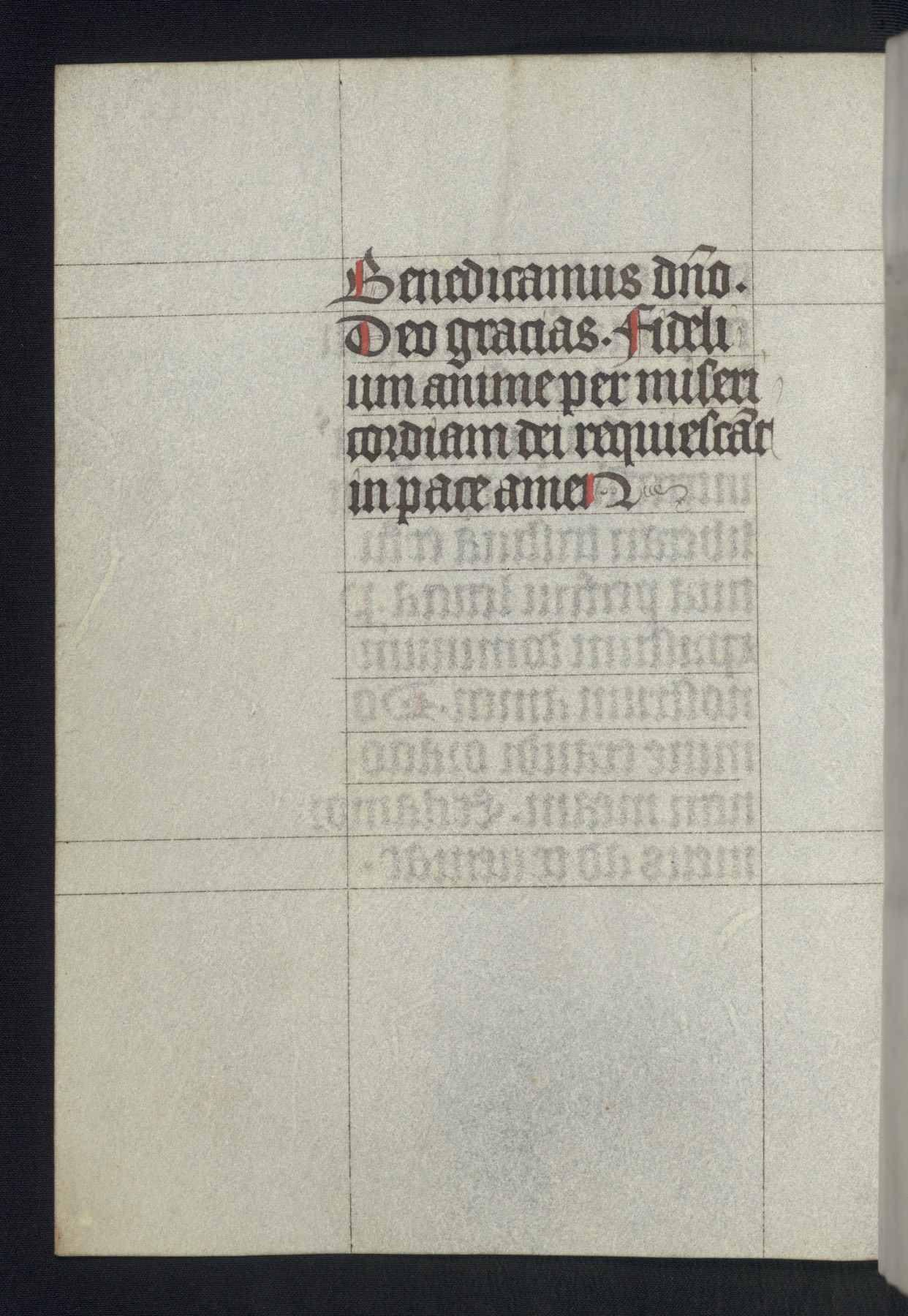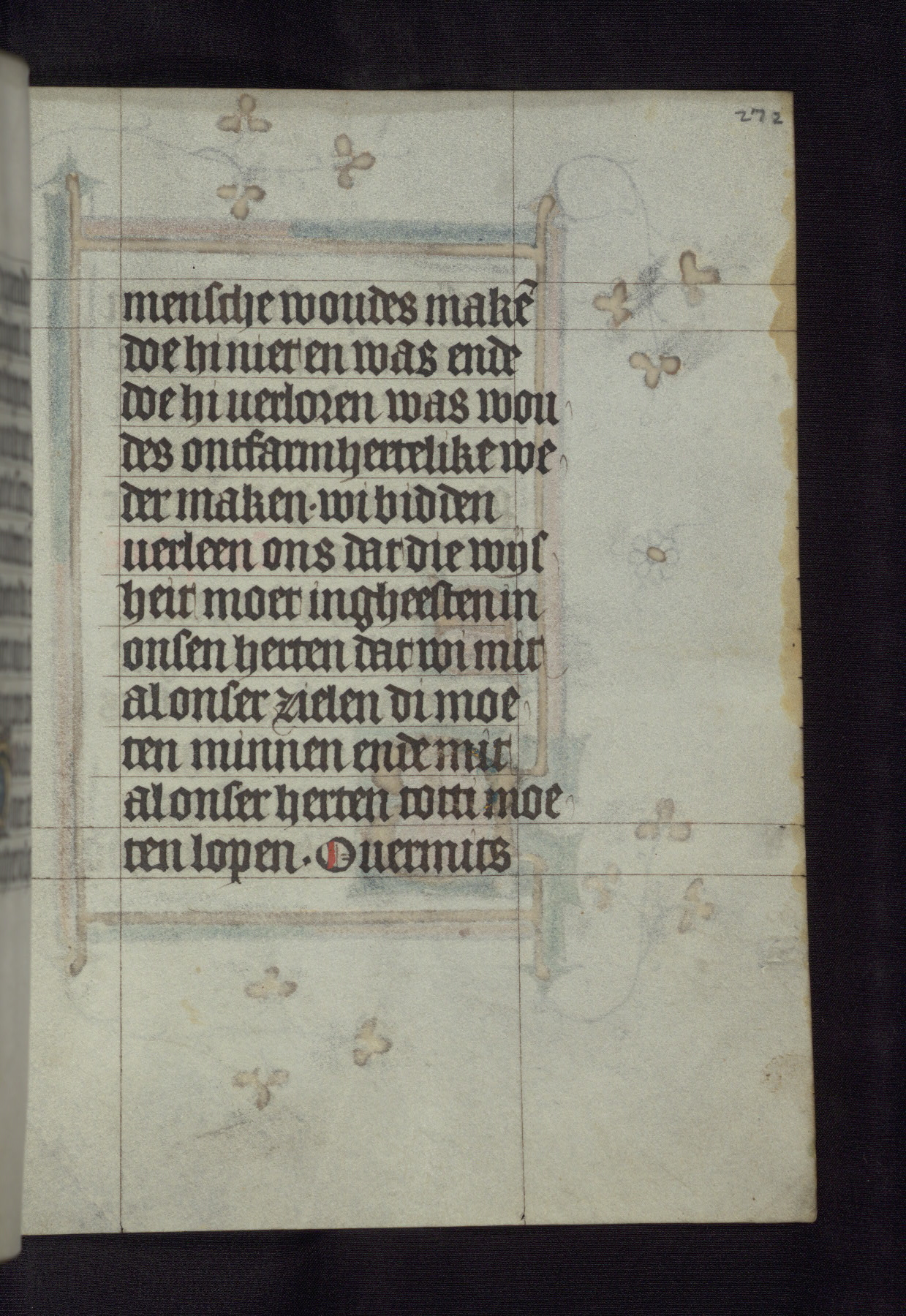 This Book of Hours was named the Doffinnes Hours after Franchoise de Doffinnes, who owned the book in the late sixteenth century and whose family’s subsequent history remains chronicled on the book’s final folios. However, the manuscript was originally made in the first quarter of the fifteenth century, probably for a married couple, who were originally represented kneeling with scrolls and their coats of arms in the margins, flanking a full-page miniature of the Crucifixion (fol. 72v), but whose figures and arms were later erased and overpainted with white. The manuscript contains both Latin and Dutch texts, supplemented by twelve full-page miniatures, the work of the Master of Walters 185. The manuscript also contains twelve pen-and-ink decorated initials in the calendar, some with grotesque faces, and letter "G" descenders throughout the book that can be attributed to the scribe Johannes de Malborch. The book’s original Dutch provenance is indicated by its calendar (for the Use of Utrecht) and its Hours of the Virgin, which follows predominantly the Use of the Windesheim Congregation. Prayers in Dutch were added to the end of the volume in the late fifteenth or early sixteenth century, and the book was subsequently rebound with its current cream-colored parchment binding of the seventeenth or eighteenth century.