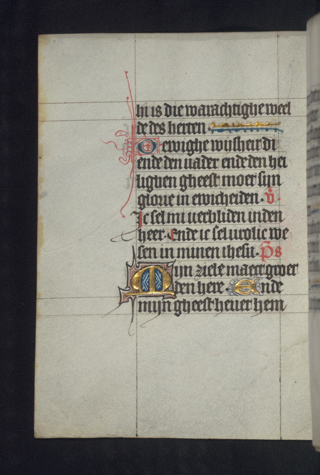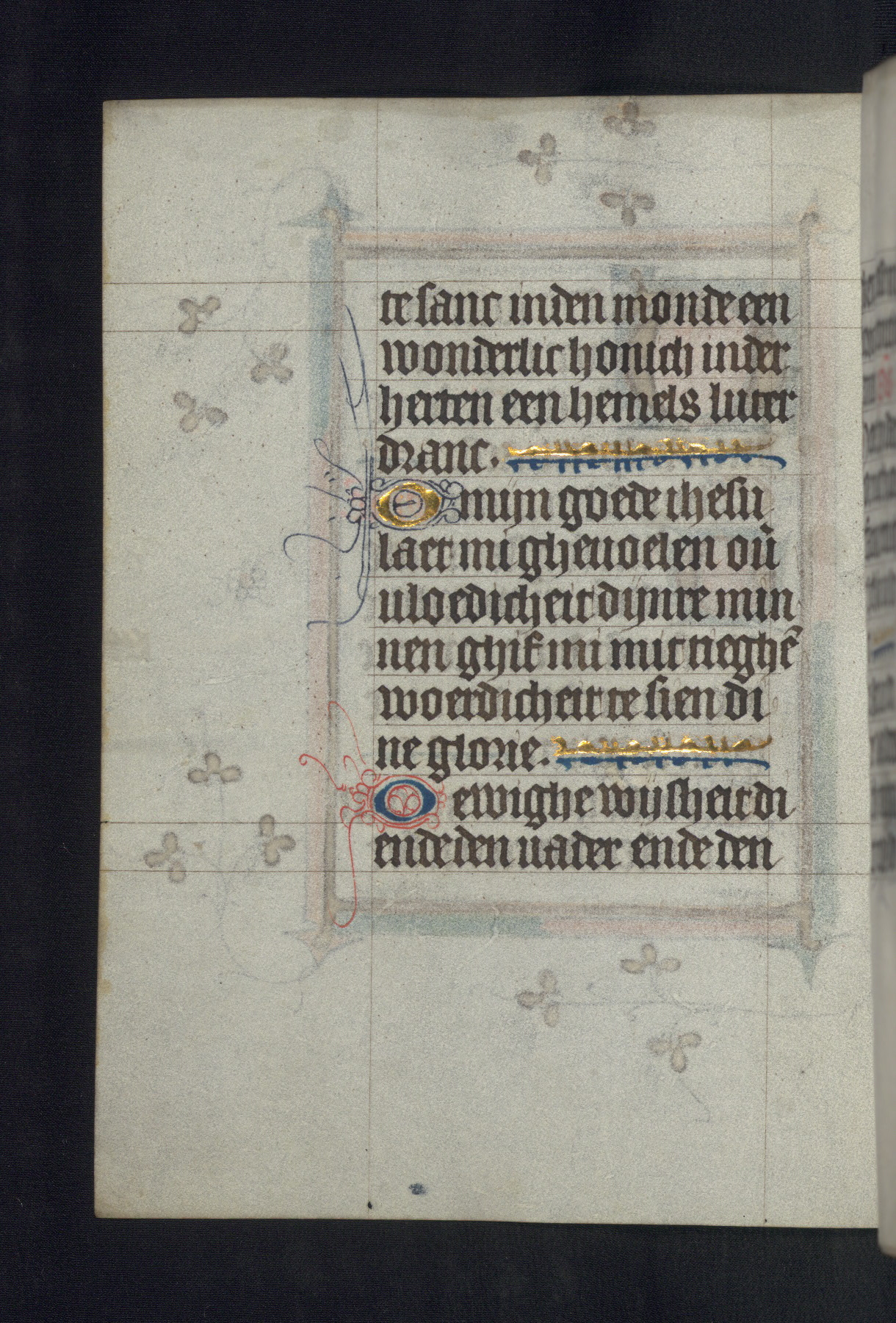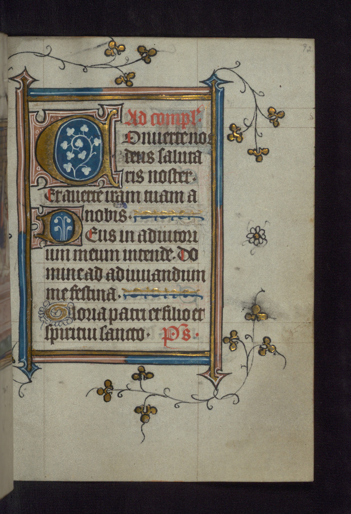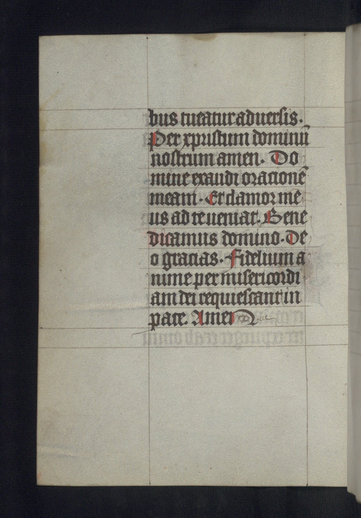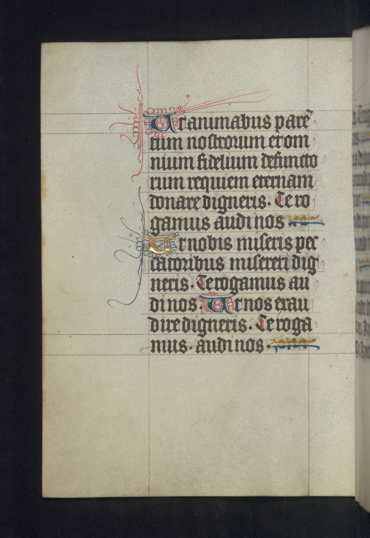 This Book of Hours was named the Doffinnes Hours after Franchoise de Doffinnes, who owned the book in the late sixteenth century and whose family’s subsequent history remains chronicled on the book’s final folios. However, the manuscript was originally made in the first quarter of the fifteenth century, probably for a married couple, who were originally represented kneeling with scrolls and their coats of arms in the margins, flanking a full-page miniature of the Crucifixion (fol. 72v), but whose figures and arms were later erased and overpainted with white. The manuscript contains both Latin and Dutch texts, supplemented by twelve full-page miniatures, the work of the Master of Walters 185. The manuscript also contains twelve pen-and-ink decorated initials in the calendar, some with grotesque faces, and letter "G" descenders throughout the book that can be attributed to the scribe Johannes de Malborch. The book’s original Dutch provenance is indicated by its calendar (for the Use of Utrecht) and its Hours of the Virgin, which follows predominantly the Use of the Windesheim Congregation. Prayers in Dutch were added to the end of the volume in the late fifteenth or early sixteenth century, and the book was subsequently rebound with its current cream-colored parchment binding of the seventeenth or eighteenth century.