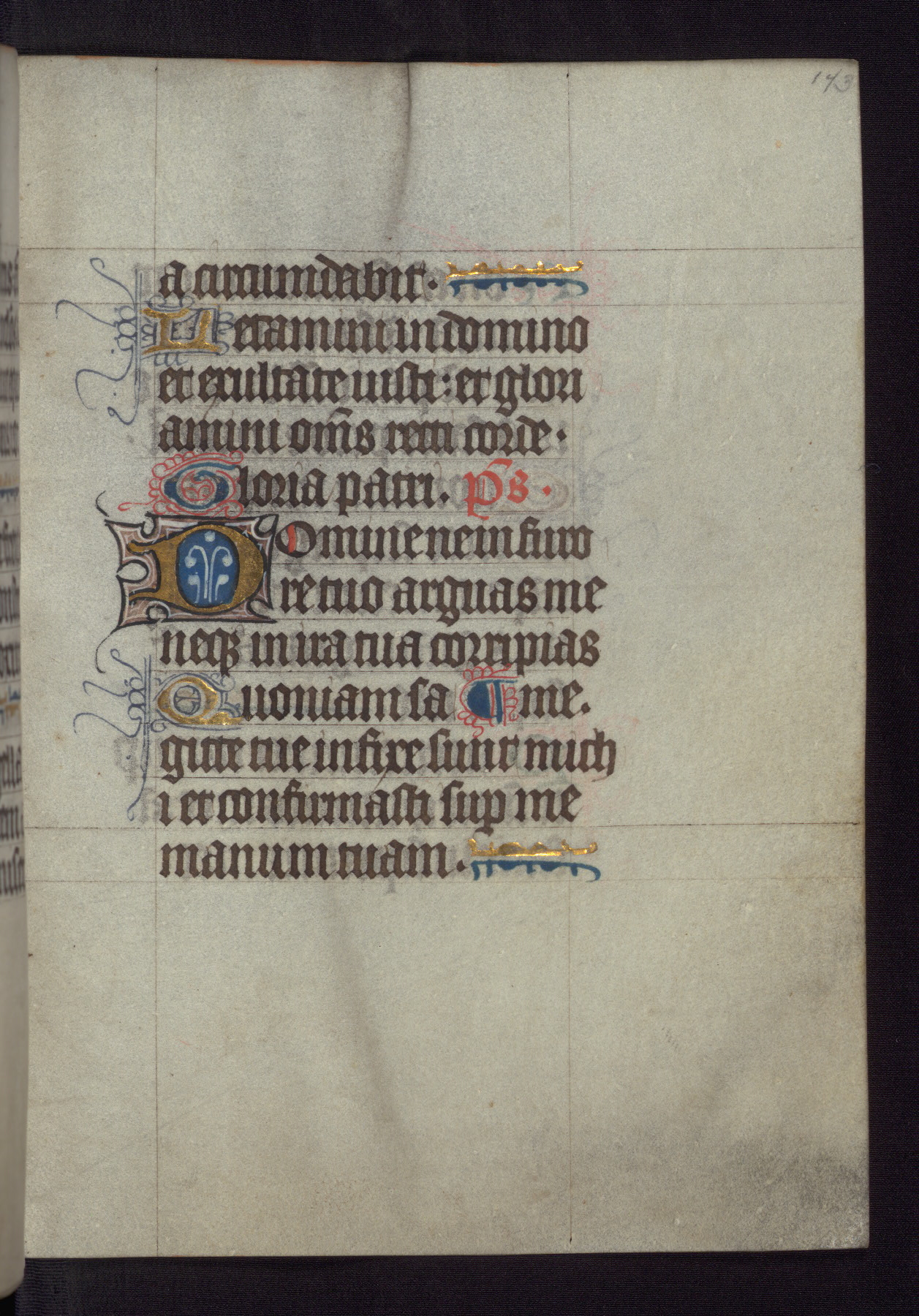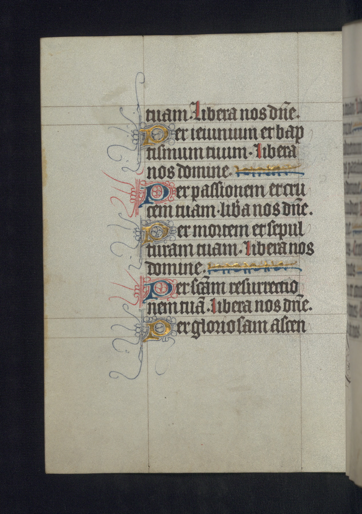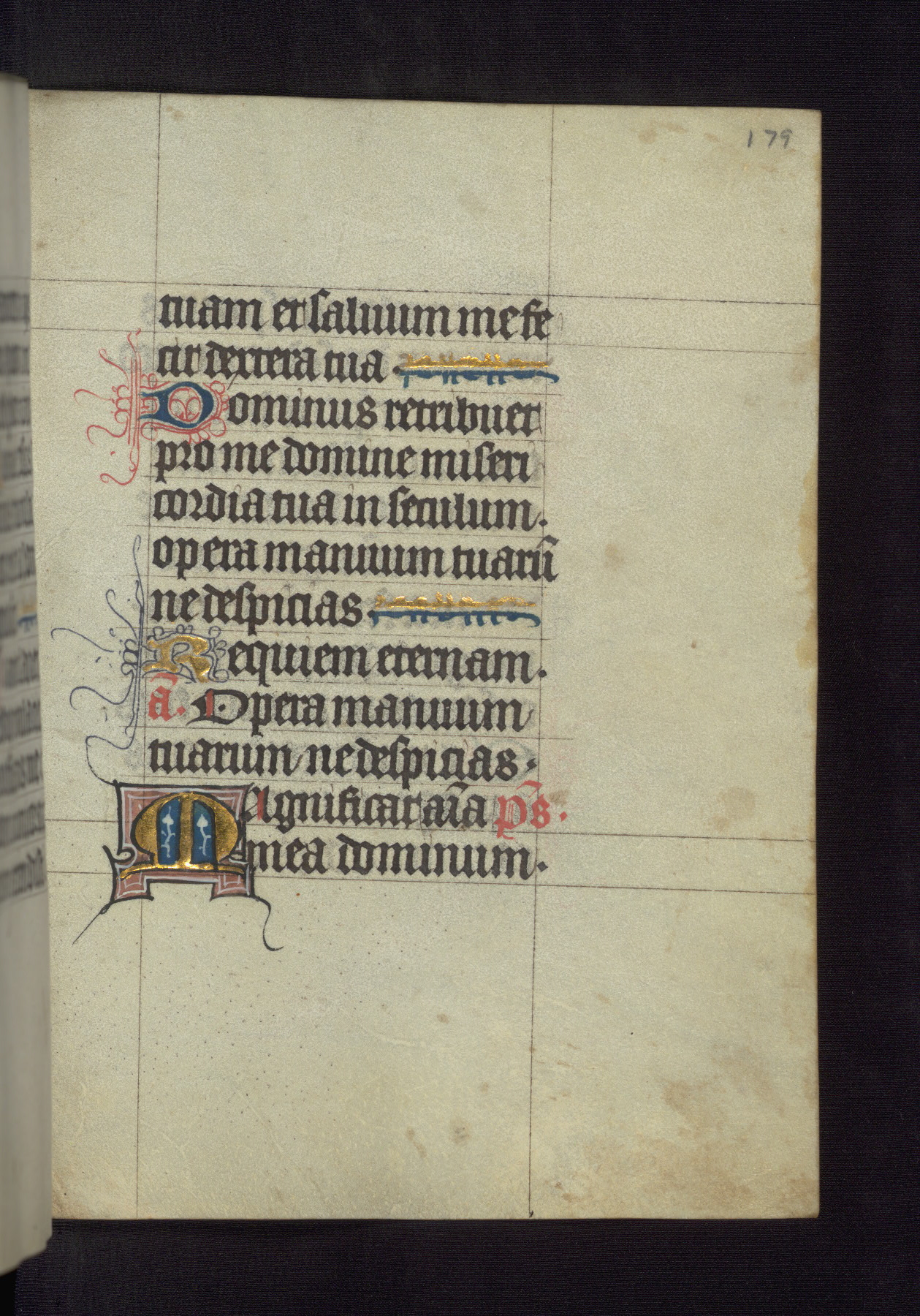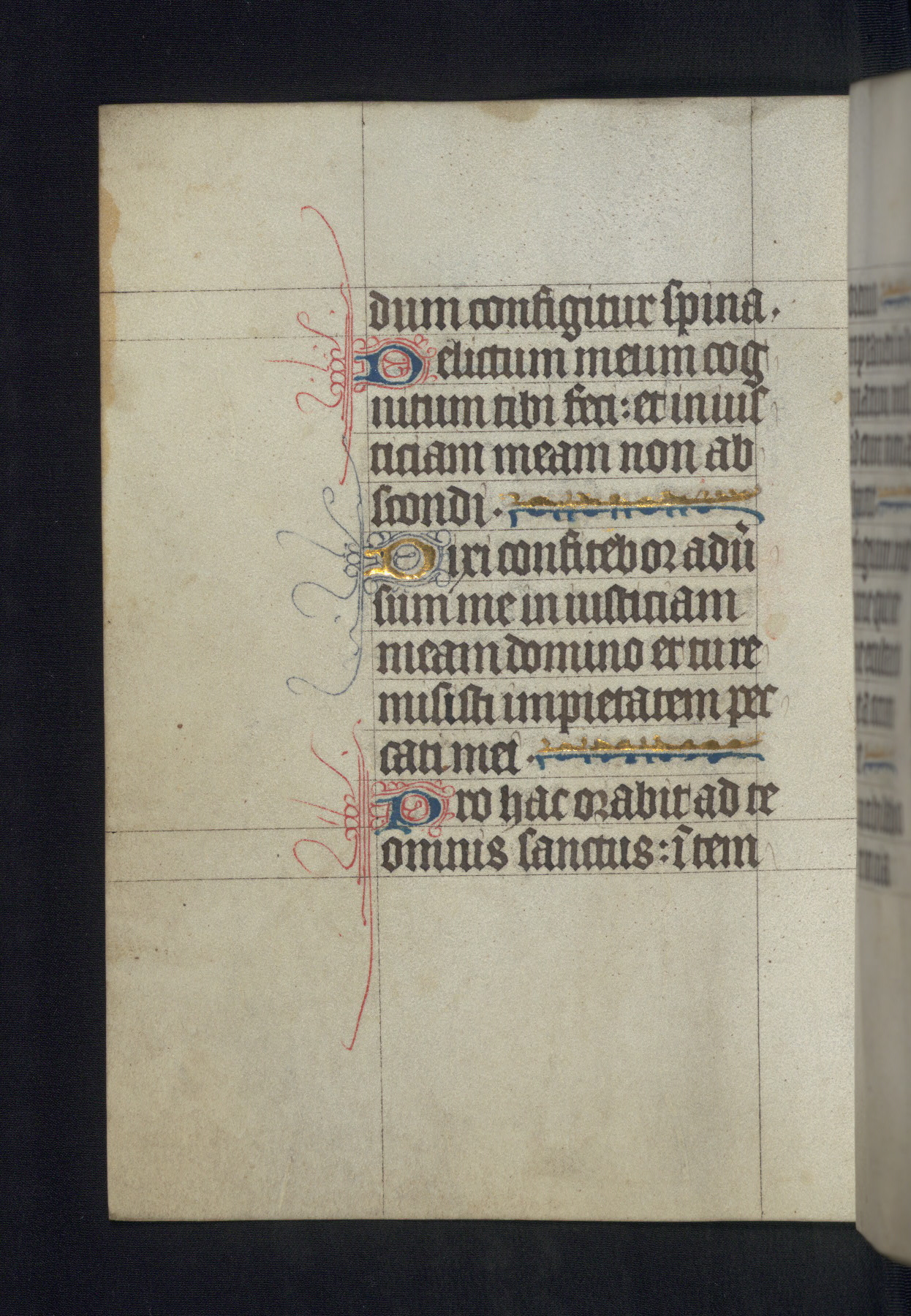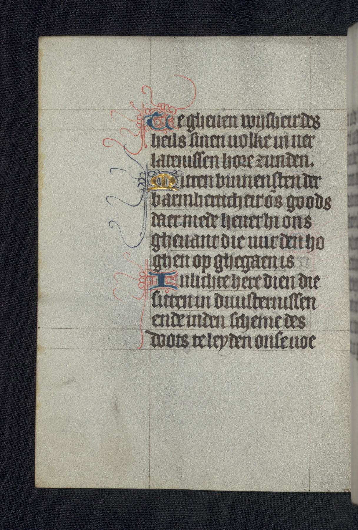 This Book of Hours was named the Doffinnes Hours after Franchoise de Doffinnes, who owned the book in the late sixteenth century and whose family’s subsequent history remains chronicled on the book’s final folios. However, the manuscript was originally made in the first quarter of the fifteenth century, probably for a married couple, who were originally represented kneeling with scrolls and their coats of arms in the margins, flanking a full-page miniature of the Crucifixion (fol. 72v), but whose figures and arms were later erased and overpainted with white. The manuscript contains both Latin and Dutch texts, supplemented by twelve full-page miniatures, the work of the Master of Walters 185. The manuscript also contains twelve pen-and-ink decorated initials in the calendar, some with grotesque faces, and letter "G" descenders throughout the book that can be attributed to the scribe Johannes de Malborch. The book’s original Dutch provenance is indicated by its calendar (for the Use of Utrecht) and its Hours of the Virgin, which follows predominantly the Use of the Windesheim Congregation. Prayers in Dutch were added to the end of the volume in the late fifteenth or early sixteenth century, and the book was subsequently rebound with its current cream-colored parchment binding of the seventeenth or eighteenth century.