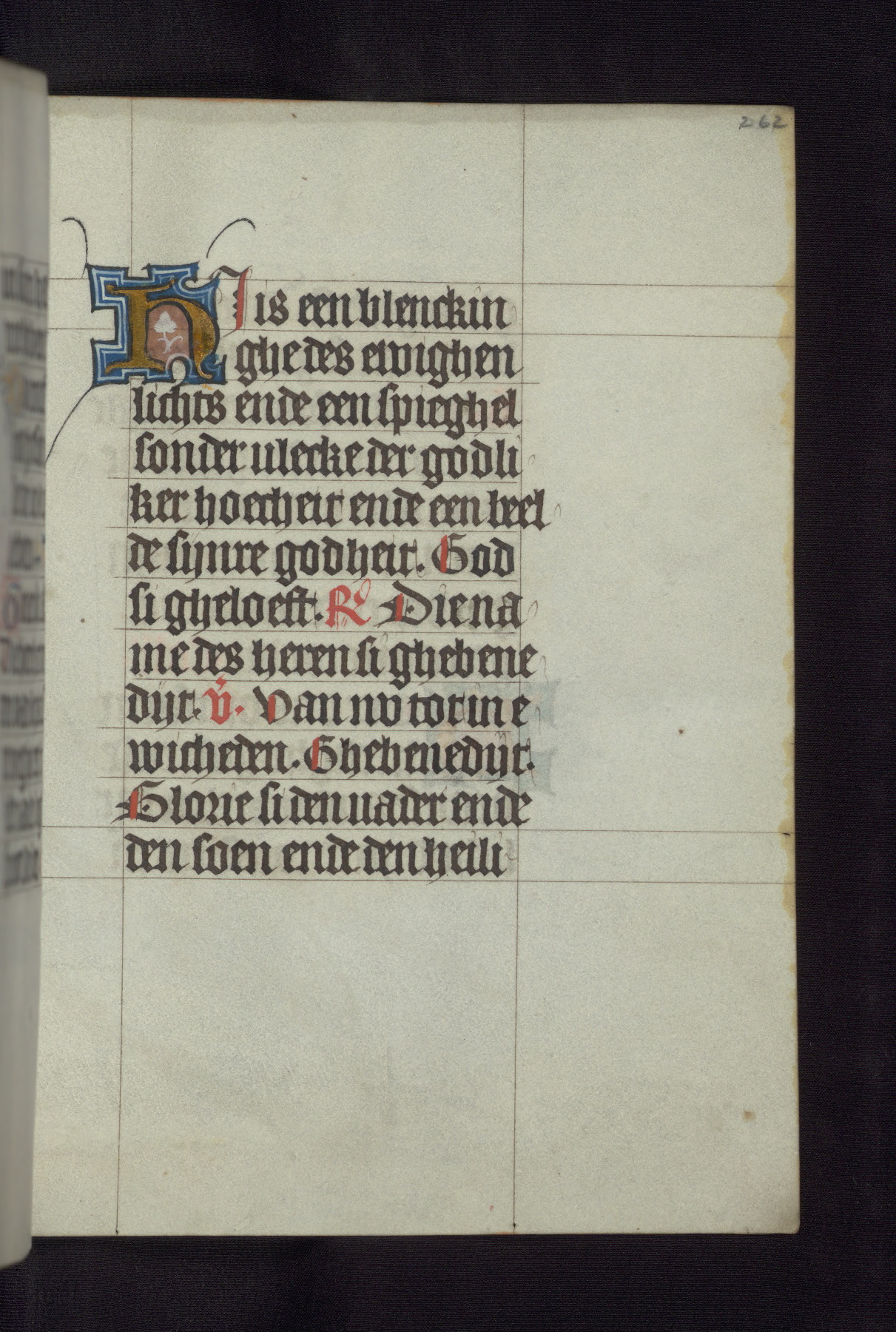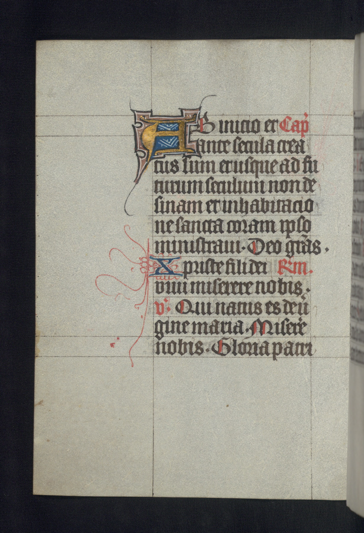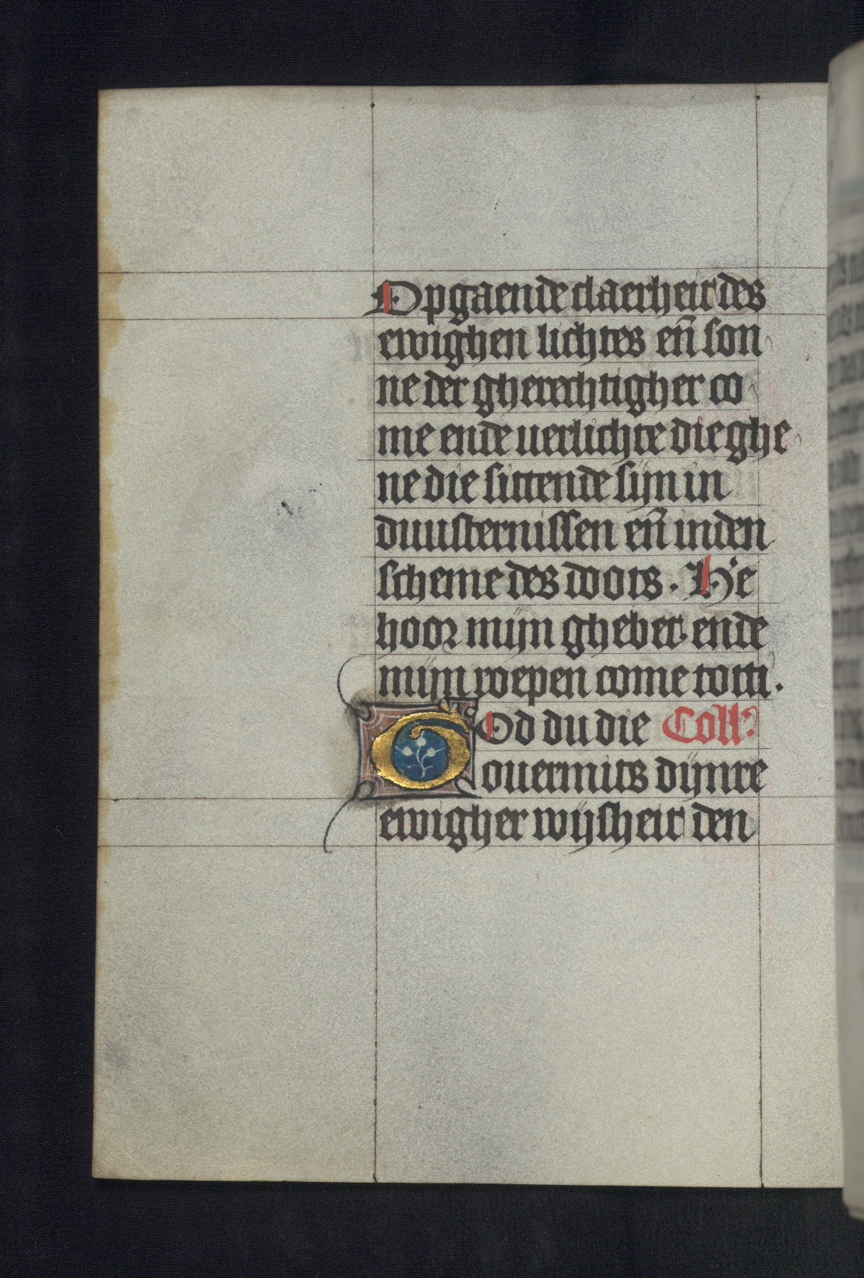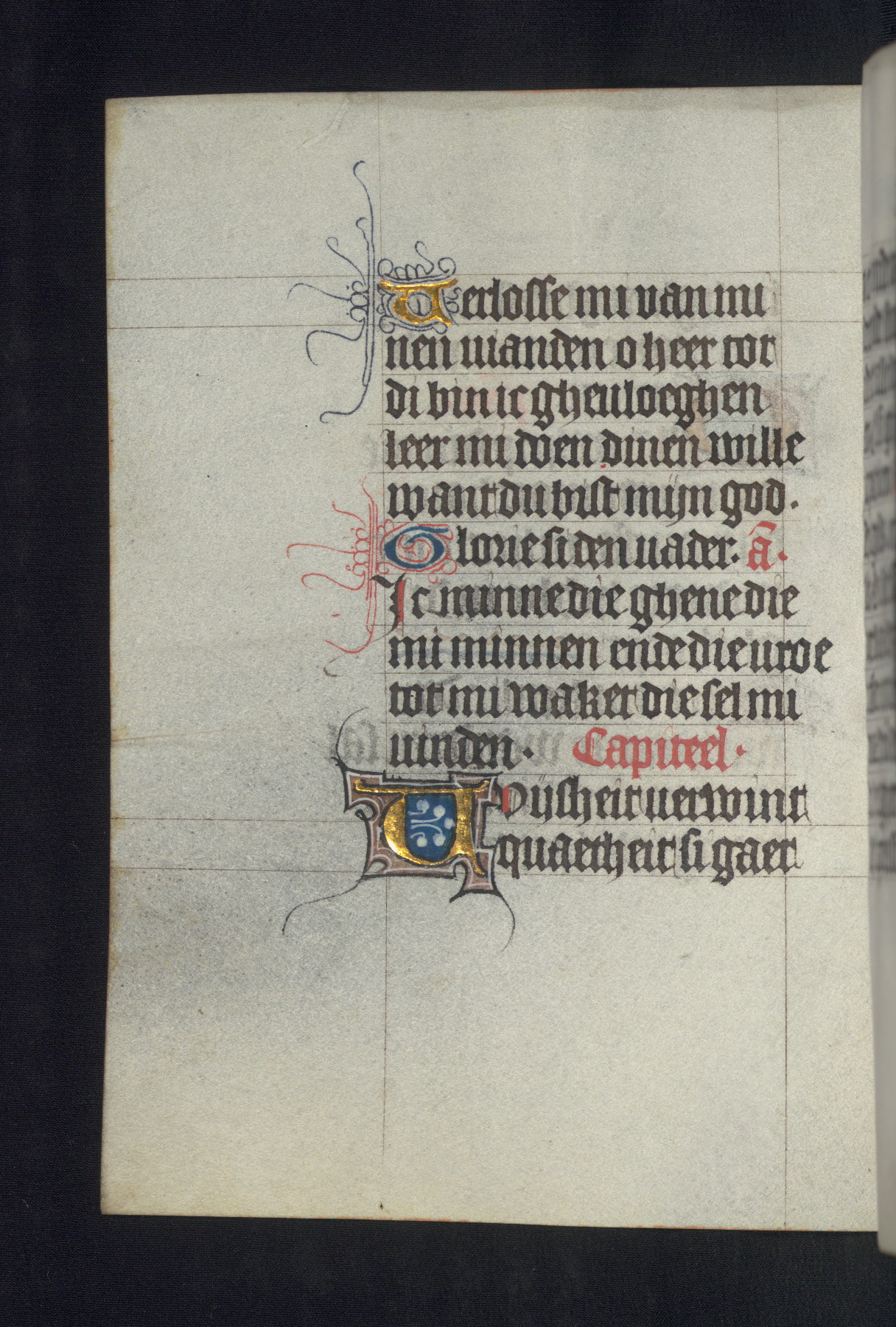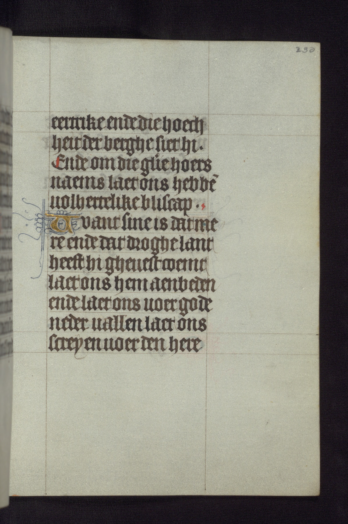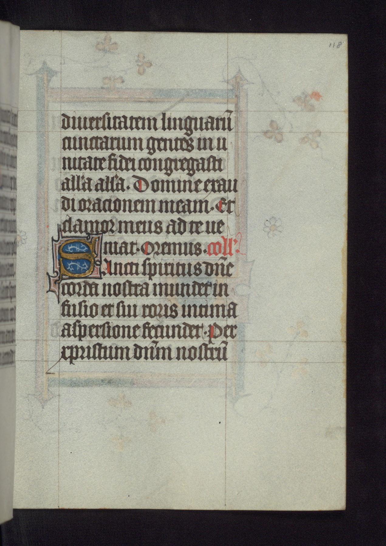 This Book of Hours was named the Doffinnes Hours after Franchoise de Doffinnes, who owned the book in the late sixteenth century and whose family’s subsequent history remains chronicled on the book’s final folios. However, the manuscript was originally made in the first quarter of the fifteenth century, probably for a married couple, who were originally represented kneeling with scrolls and their coats of arms in the margins, flanking a full-page miniature of the Crucifixion (fol. 72v), but whose figures and arms were later erased and overpainted with white. The manuscript contains both Latin and Dutch texts, supplemented by twelve full-page miniatures, the work of the Master of Walters 185. The manuscript also contains twelve pen-and-ink decorated initials in the calendar, some with grotesque faces, and letter "G" descenders throughout the book that can be attributed to the scribe Johannes de Malborch. The book’s original Dutch provenance is indicated by its calendar (for the Use of Utrecht) and its Hours of the Virgin, which follows predominantly the Use of the Windesheim Congregation. Prayers in Dutch were added to the end of the volume in the late fifteenth or early sixteenth century, and the book was subsequently rebound with its current cream-colored parchment binding of the seventeenth or eighteenth century.