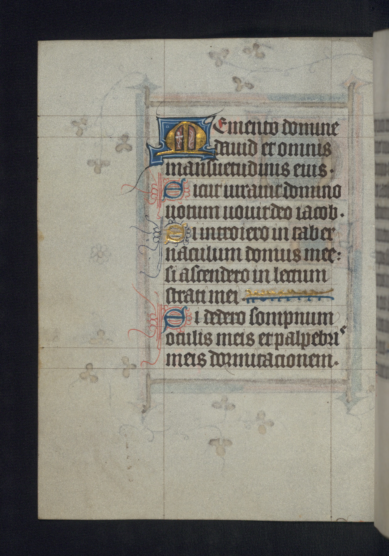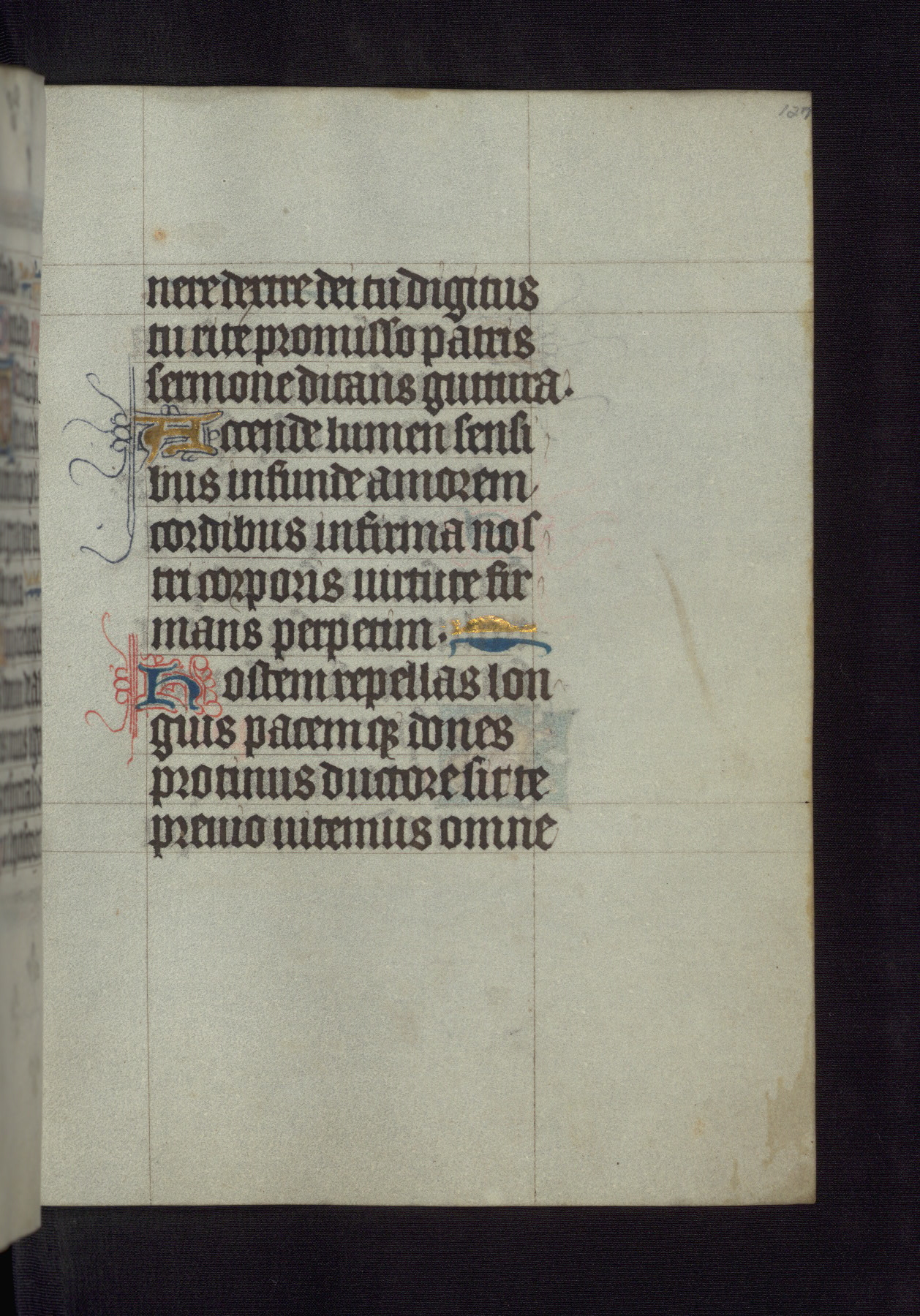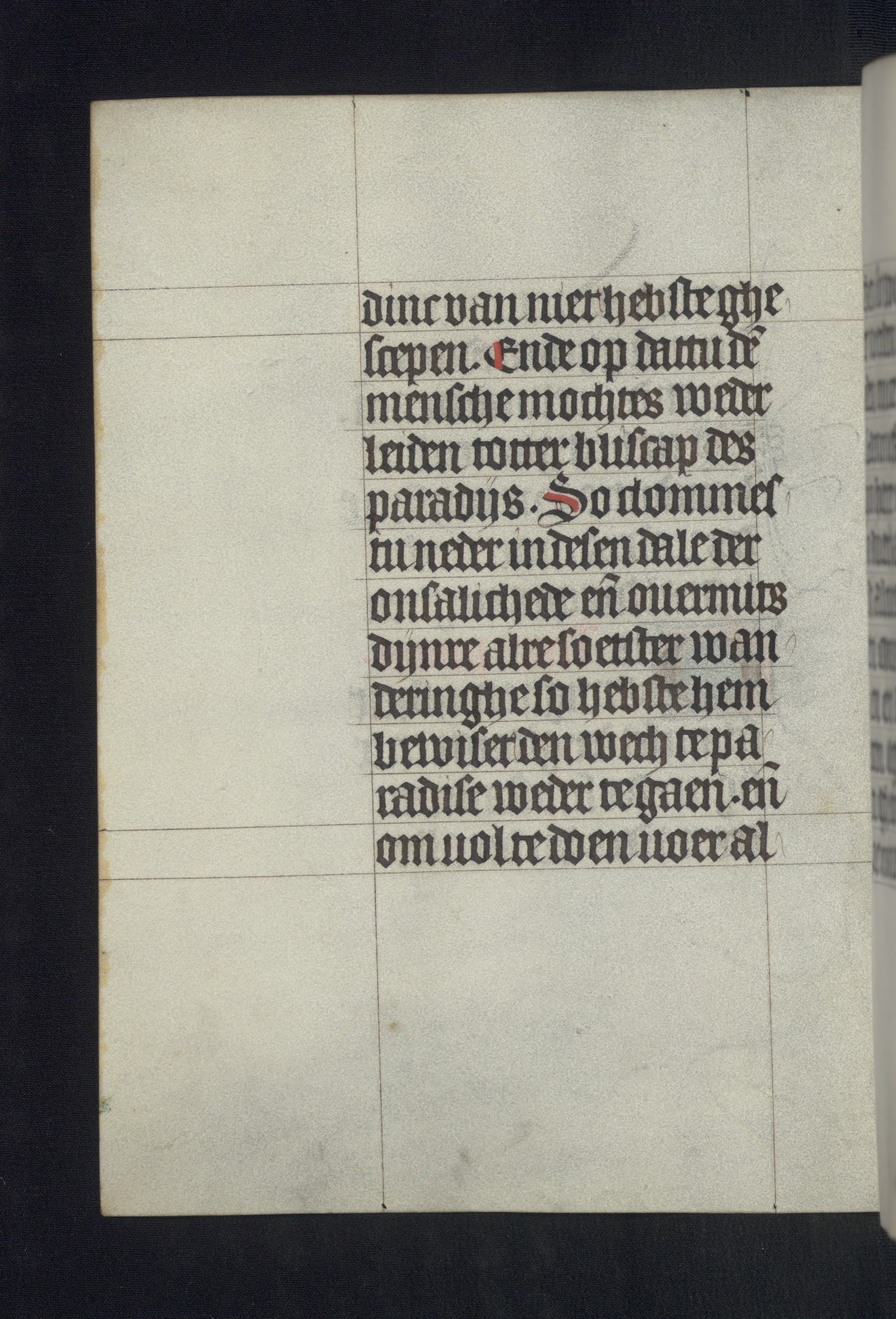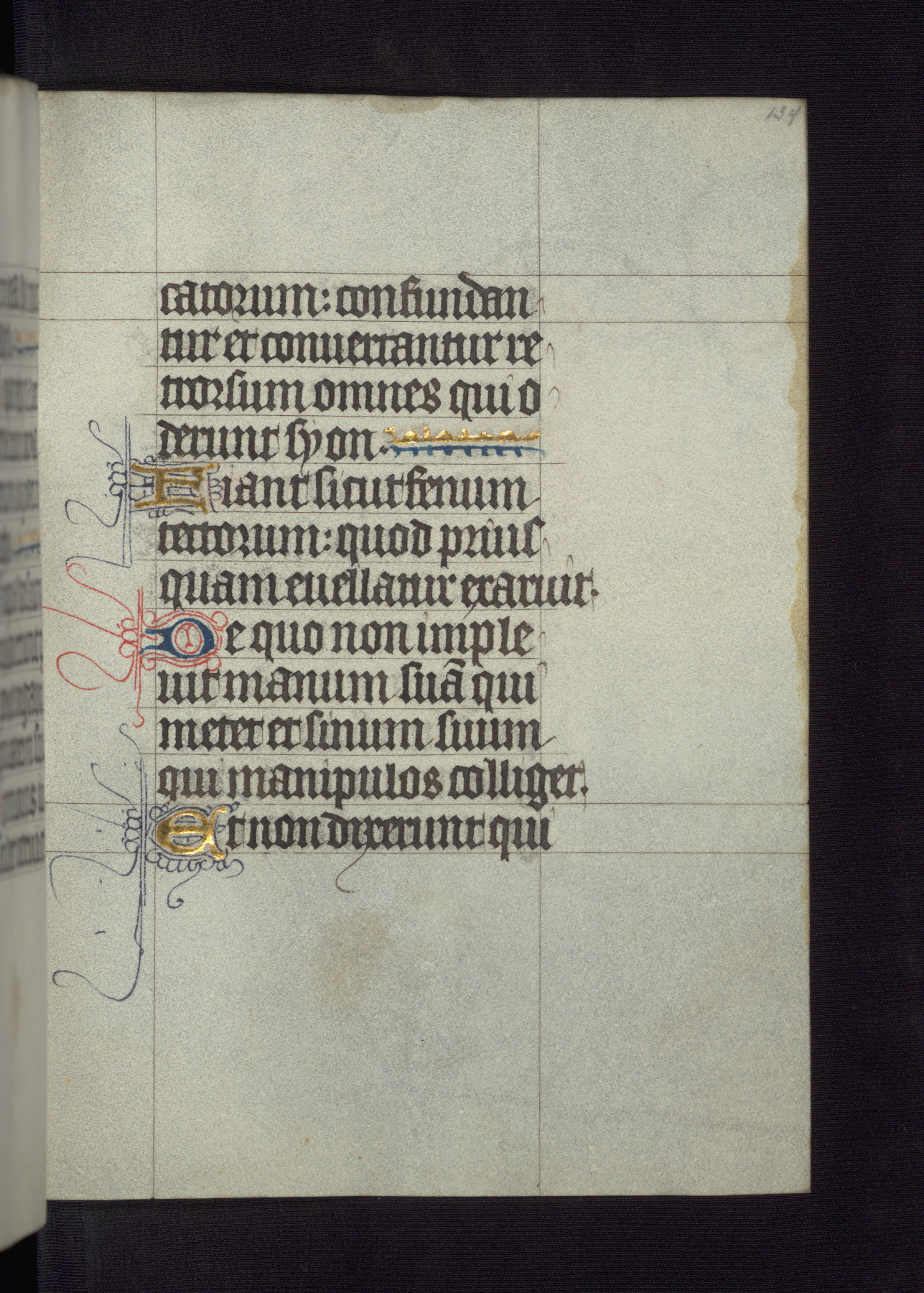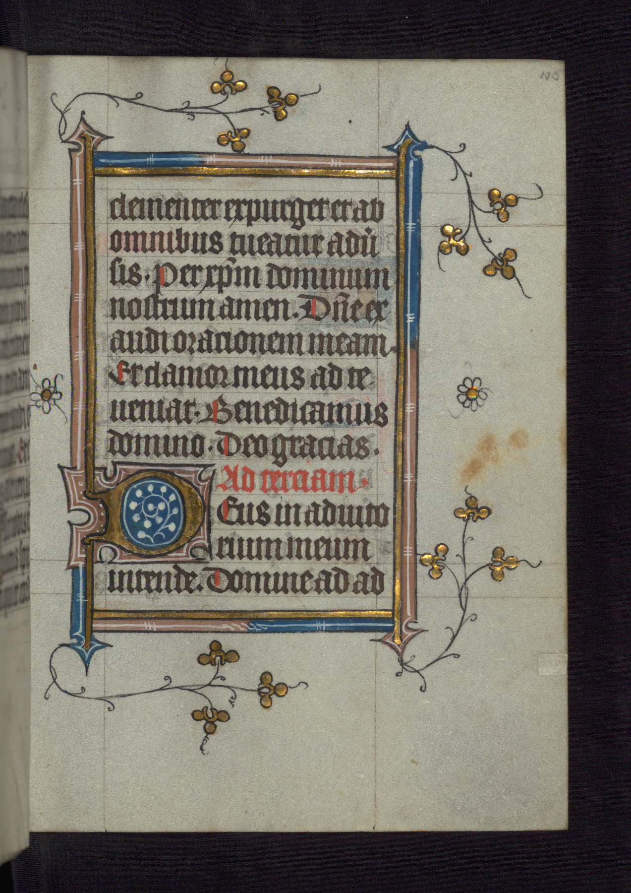 This Book of Hours was named the Doffinnes Hours after Franchoise de Doffinnes, who owned the book in the late sixteenth century and whose family’s subsequent history remains chronicled on the book’s final folios. However, the manuscript was originally made in the first quarter of the fifteenth century, probably for a married couple, who were originally represented kneeling with scrolls and their coats of arms in the margins, flanking a full-page miniature of the Crucifixion (fol. 72v), but whose figures and arms were later erased and overpainted with white. The manuscript contains both Latin and Dutch texts, supplemented by twelve full-page miniatures, the work of the Master of Walters 185. The manuscript also contains twelve pen-and-ink decorated initials in the calendar, some with grotesque faces, and letter "G" descenders throughout the book that can be attributed to the scribe Johannes de Malborch. The book’s original Dutch provenance is indicated by its calendar (for the Use of Utrecht) and its Hours of the Virgin, which follows predominantly the Use of the Windesheim Congregation. Prayers in Dutch were added to the end of the volume in the late fifteenth or early sixteenth century, and the book was subsequently rebound with its current cream-colored parchment binding of the seventeenth or eighteenth century.
