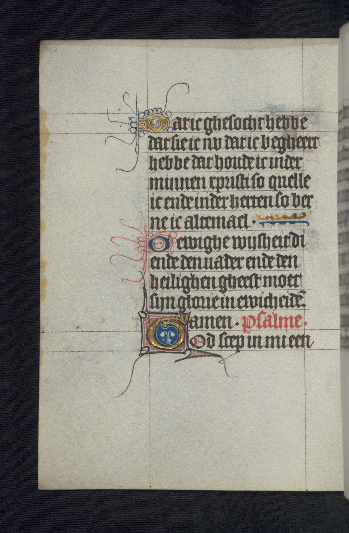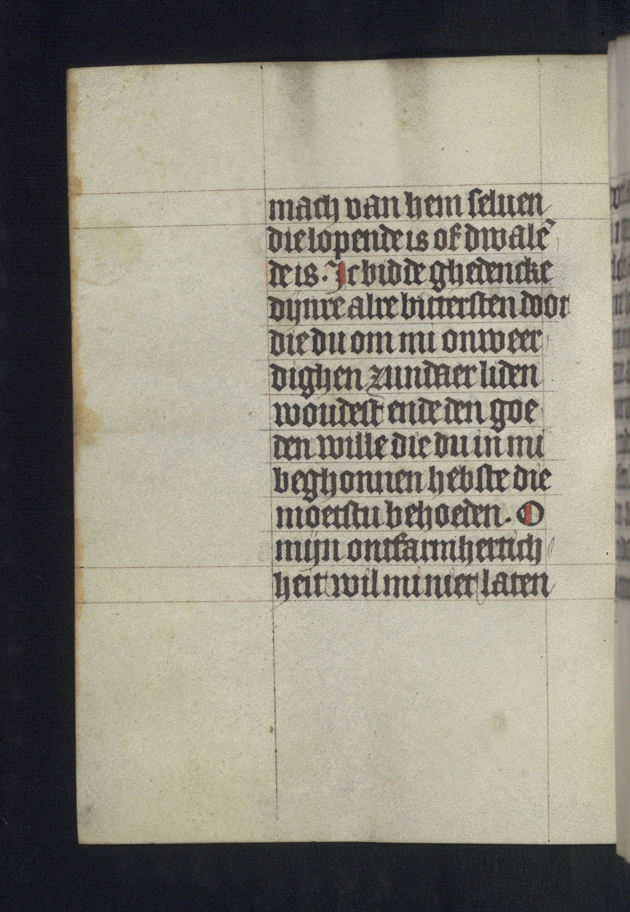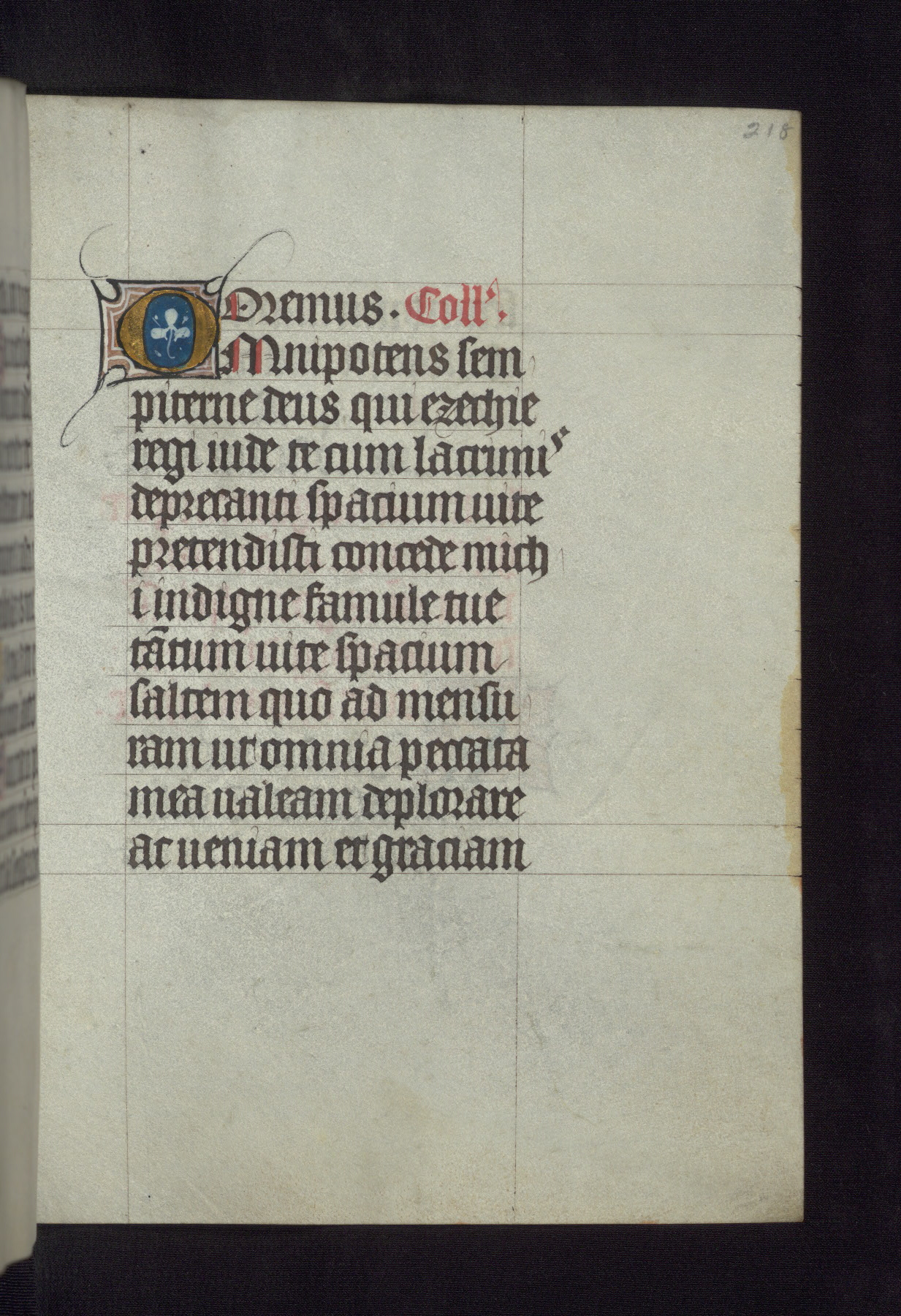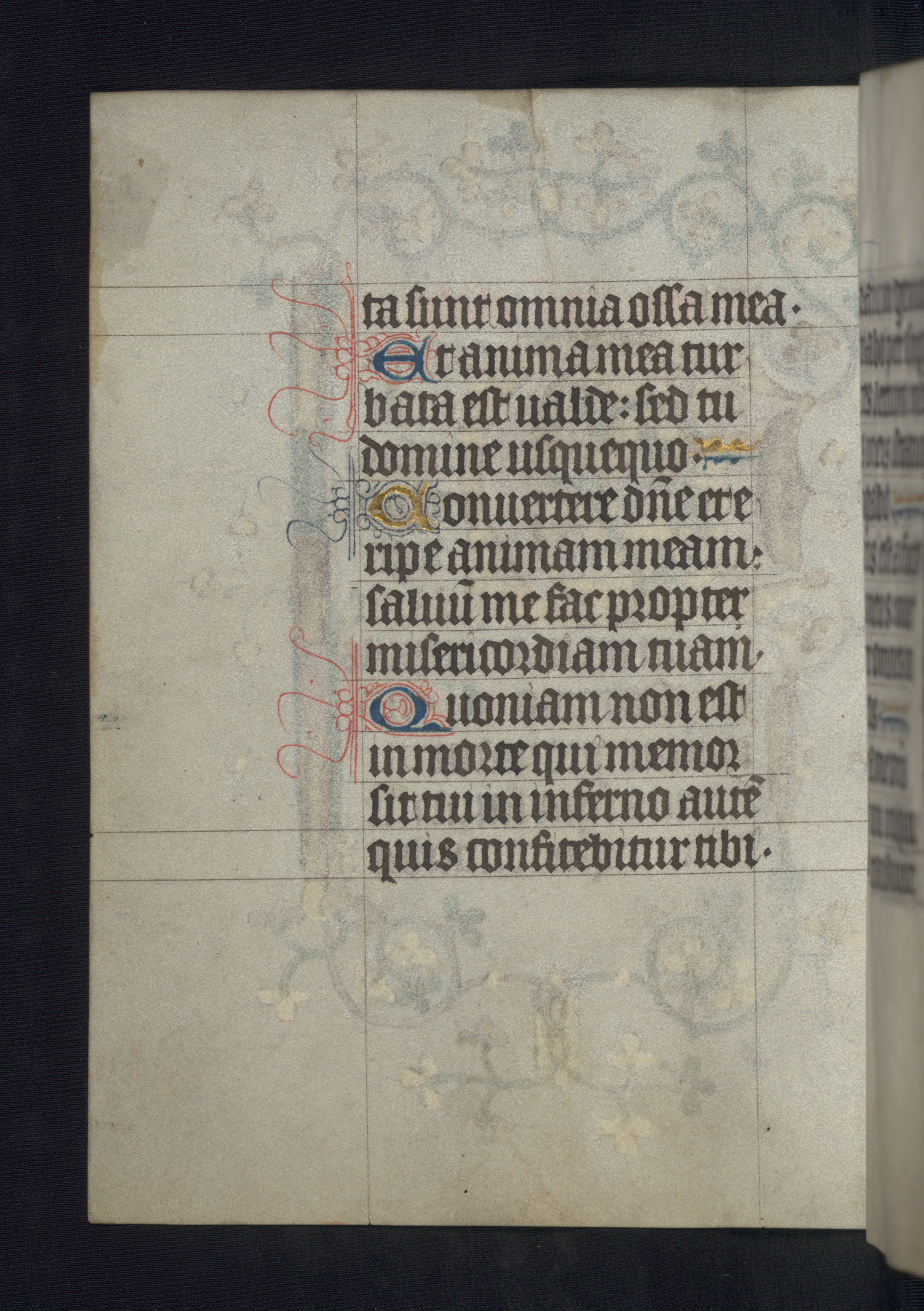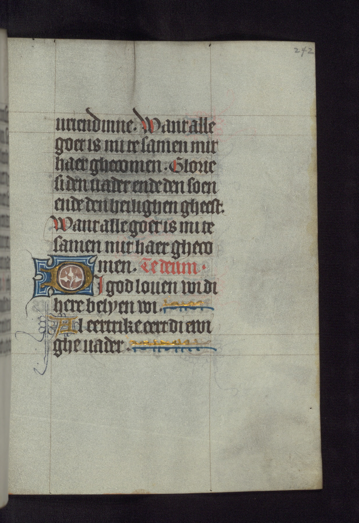 This Book of Hours was named the Doffinnes Hours after Franchoise de Doffinnes, who owned the book in the late sixteenth century and whose family’s subsequent history remains chronicled on the book’s final folios. However, the manuscript was originally made in the first quarter of the fifteenth century, probably for a married couple, who were originally represented kneeling with scrolls and their coats of arms in the margins, flanking a full-page miniature of the Crucifixion (fol. 72v), but whose figures and arms were later erased and overpainted with white. The manuscript contains both Latin and Dutch texts, supplemented by twelve full-page miniatures, the work of the Master of Walters 185. The manuscript also contains twelve pen-and-ink decorated initials in the calendar, some with grotesque faces, and letter "G" descenders throughout the book that can be attributed to the scribe Johannes de Malborch. The book’s original Dutch provenance is indicated by its calendar (for the Use of Utrecht) and its Hours of the Virgin, which follows predominantly the Use of the Windesheim Congregation. Prayers in Dutch were added to the end of the volume in the late fifteenth or early sixteenth century, and the book was subsequently rebound with its current cream-colored parchment binding of the seventeenth or eighteenth century.