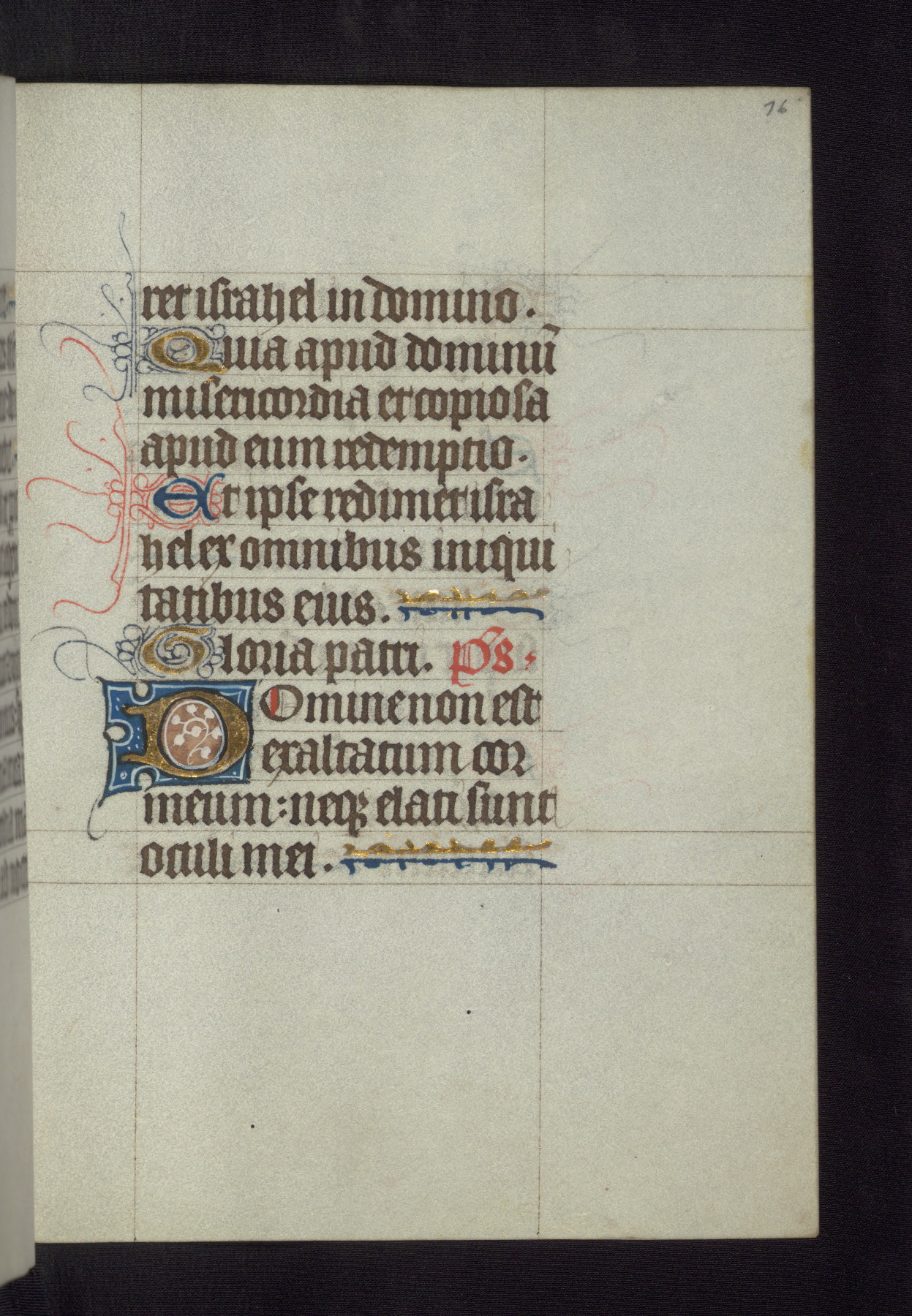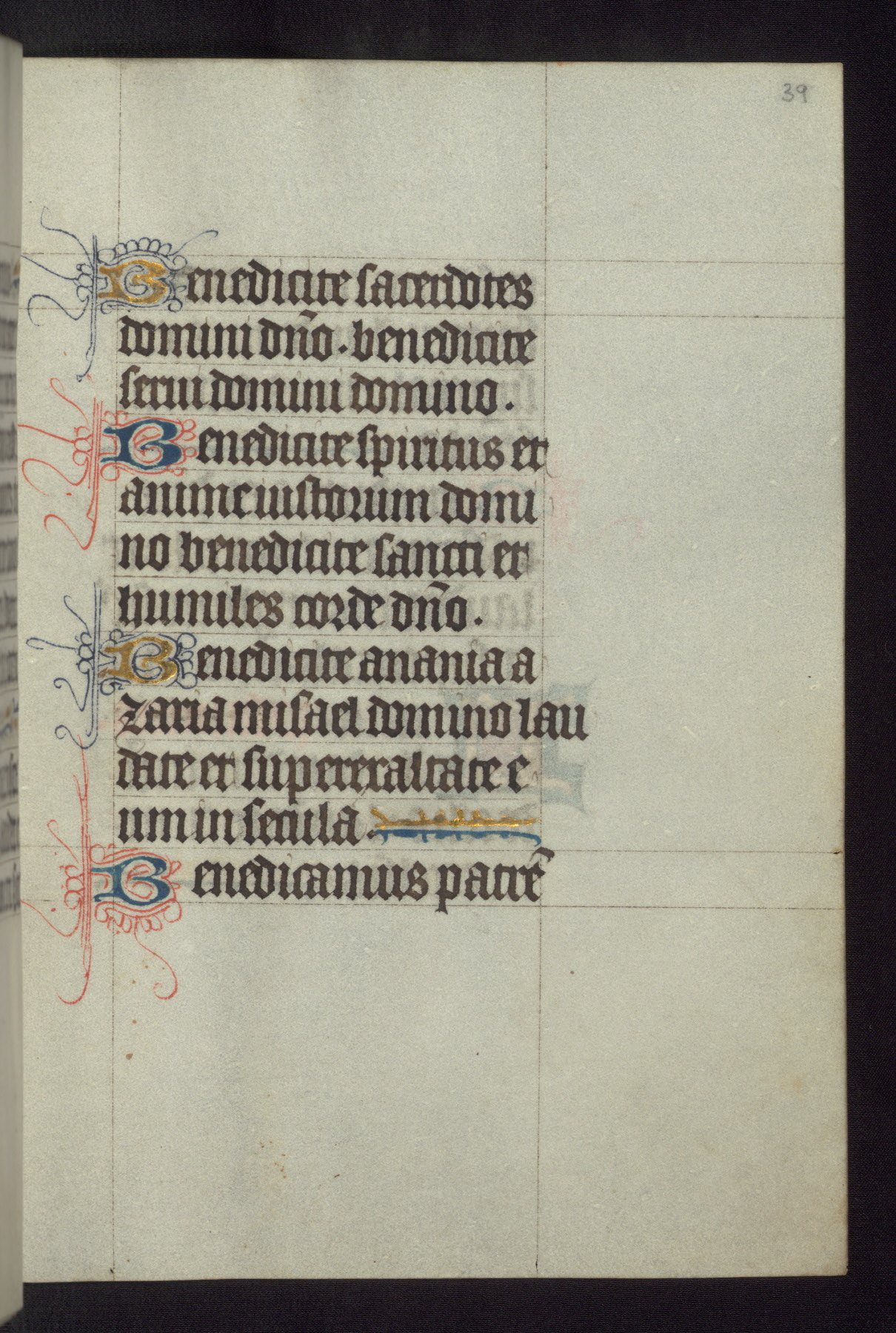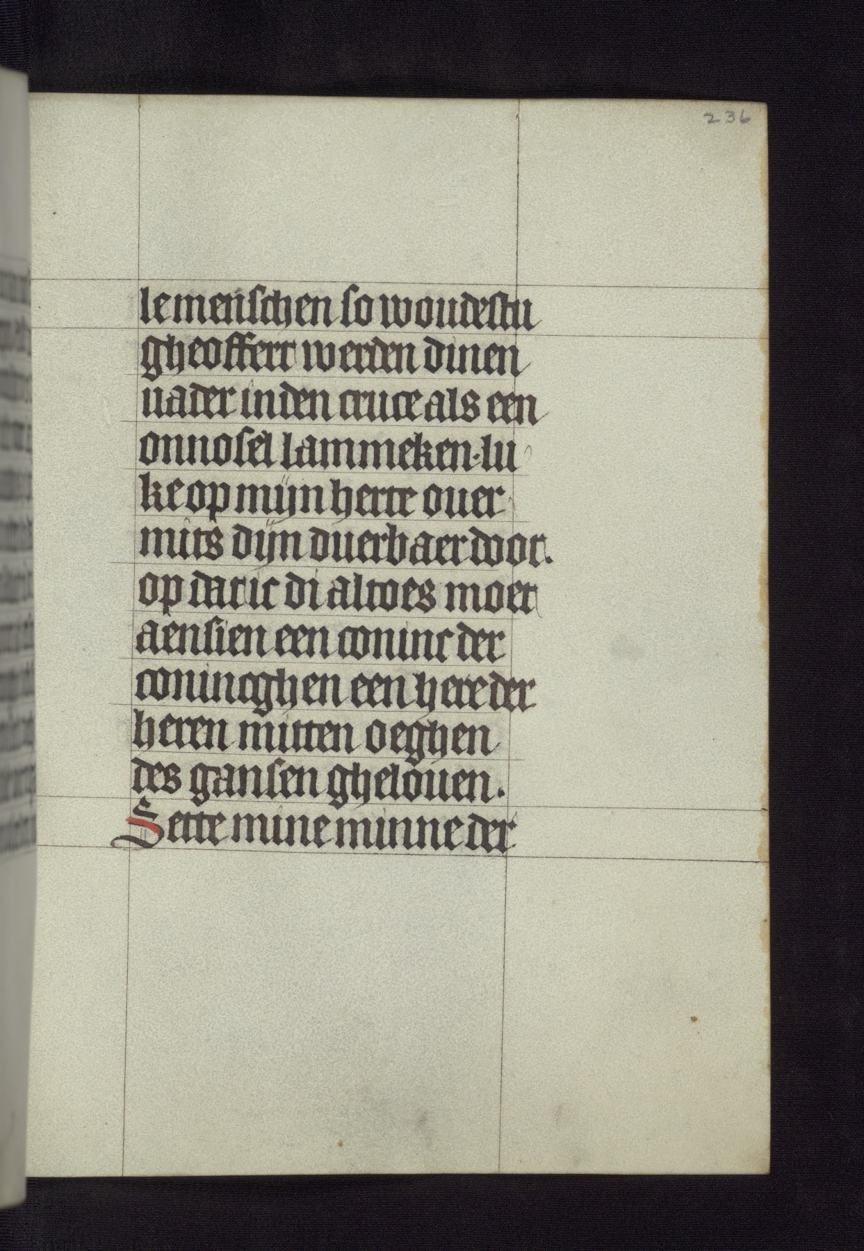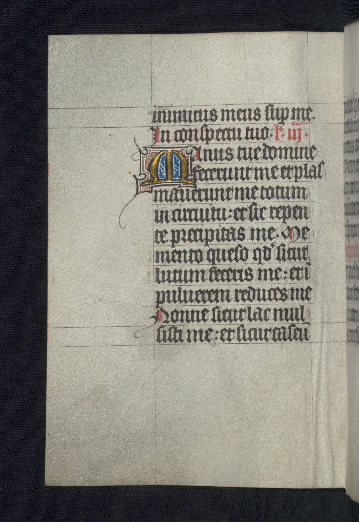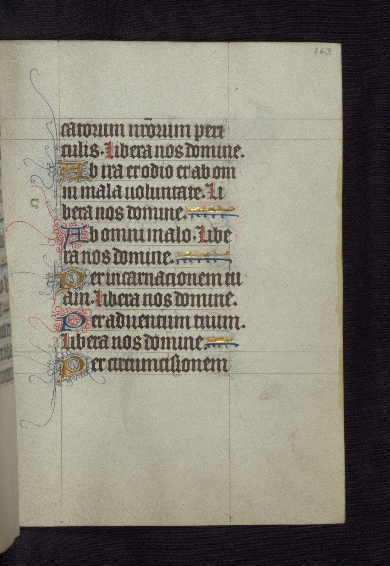 This Book of Hours was named the Doffinnes Hours after Franchoise de Doffinnes, who owned the book in the late sixteenth century and whose family’s subsequent history remains chronicled on the book’s final folios. However, the manuscript was originally made in the first quarter of the fifteenth century, probably for a married couple, who were originally represented kneeling with scrolls and their coats of arms in the margins, flanking a full-page miniature of the Crucifixion (fol. 72v), but whose figures and arms were later erased and overpainted with white. The manuscript contains both Latin and Dutch texts, supplemented by twelve full-page miniatures, the work of the Master of Walters 185. The manuscript also contains twelve pen-and-ink decorated initials in the calendar, some with grotesque faces, and letter "G" descenders throughout the book that can be attributed to the scribe Johannes de Malborch. The book’s original Dutch provenance is indicated by its calendar (for the Use of Utrecht) and its Hours of the Virgin, which follows predominantly the Use of the Windesheim Congregation. Prayers in Dutch were added to the end of the volume in the late fifteenth or early sixteenth century, and the book was subsequently rebound with its current cream-colored parchment binding of the seventeenth or eighteenth century.