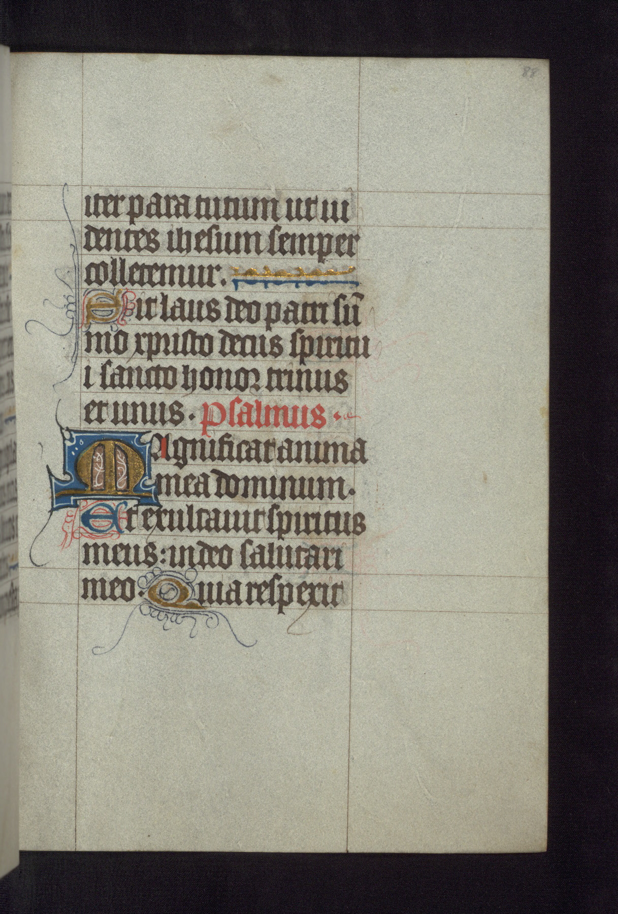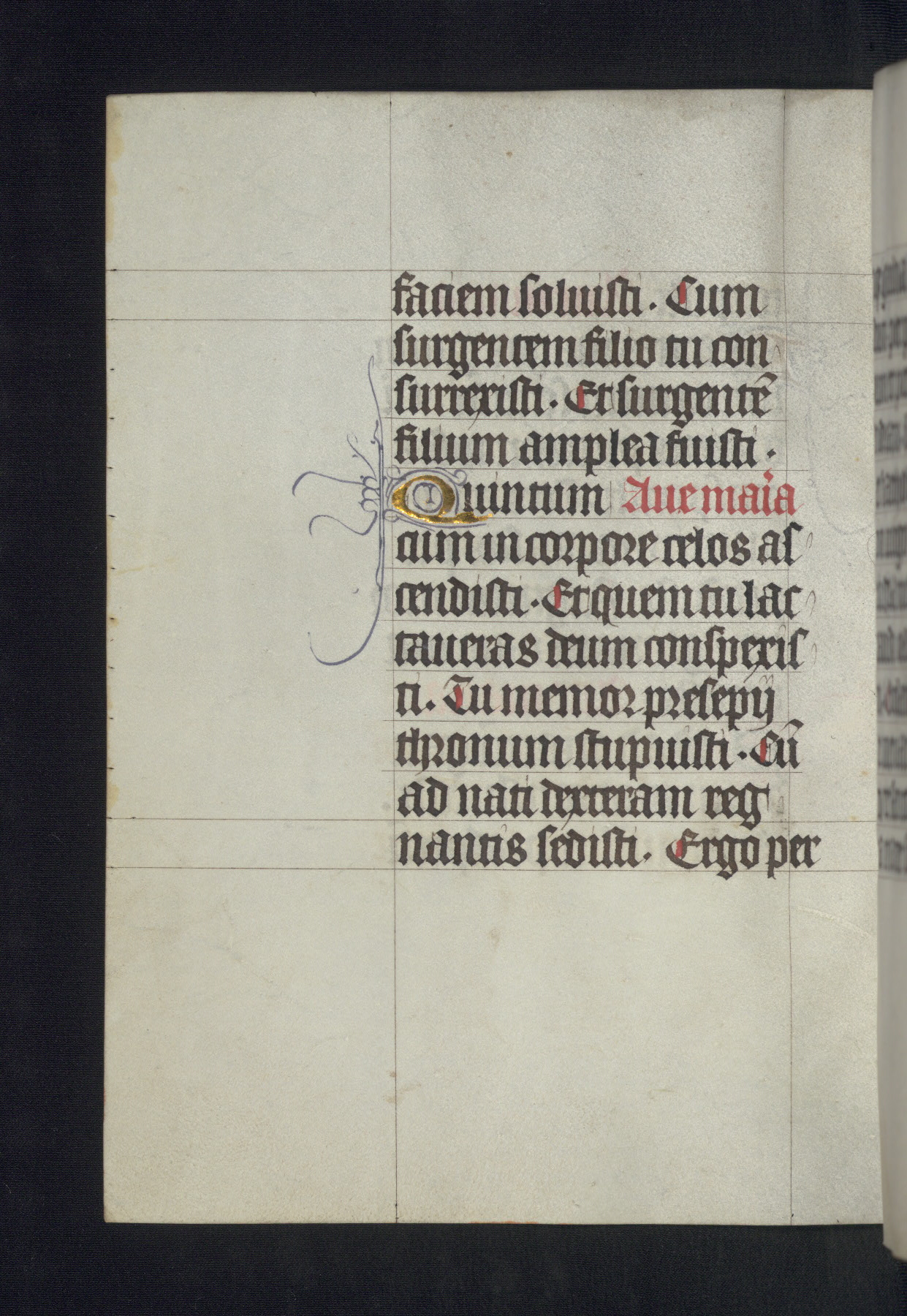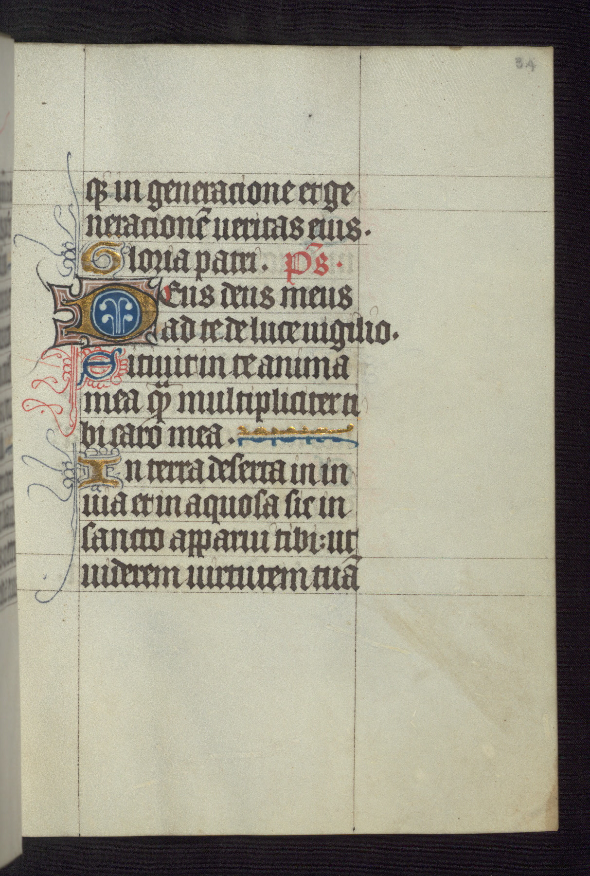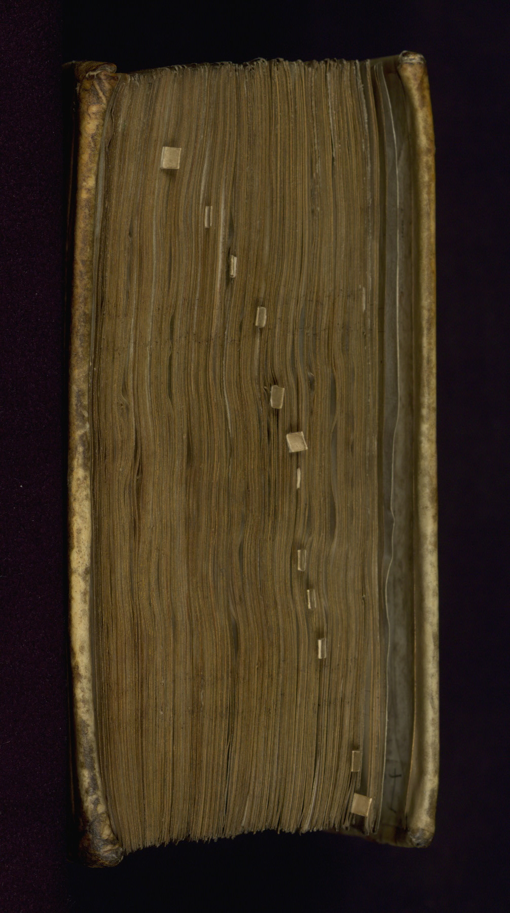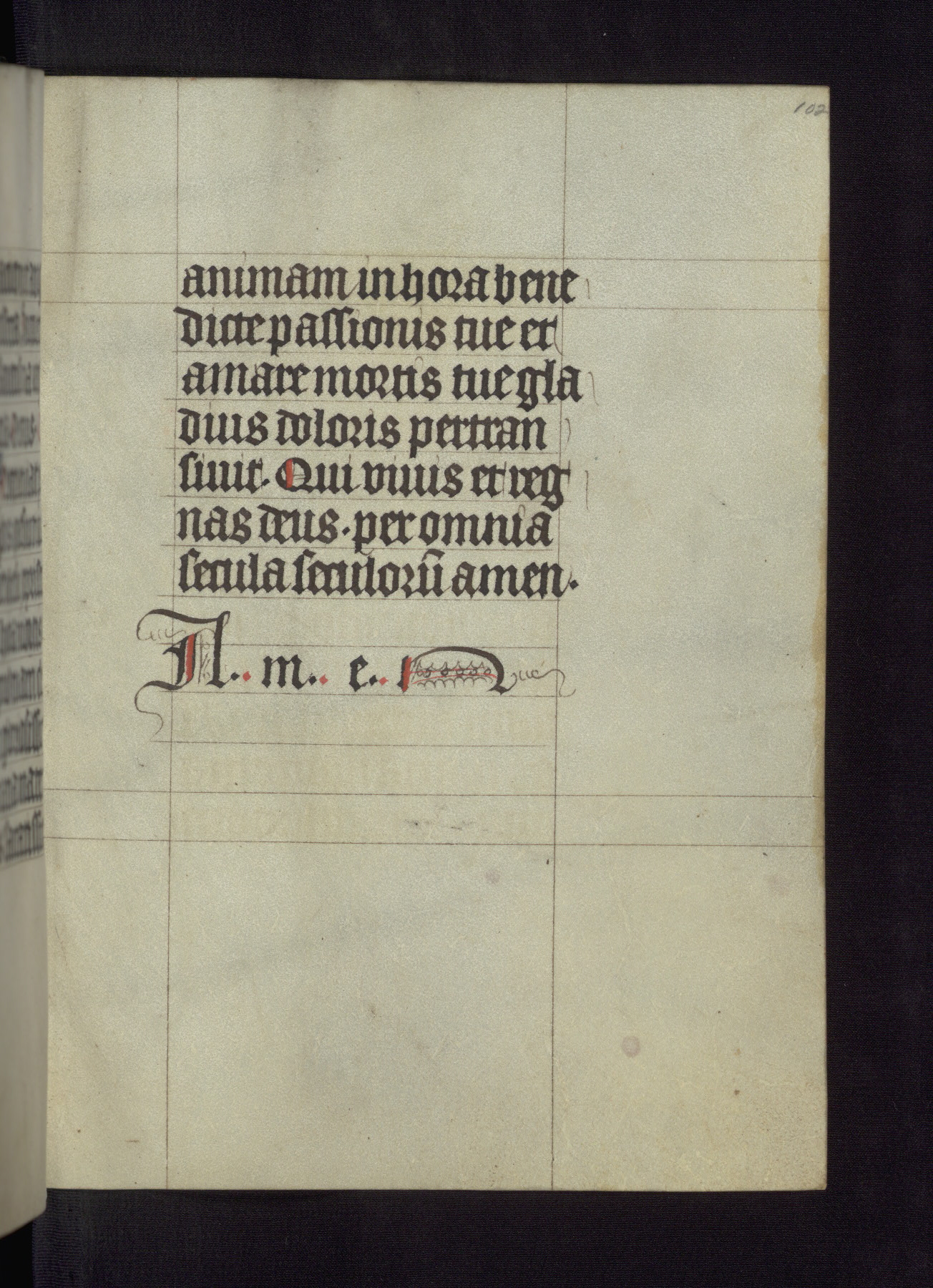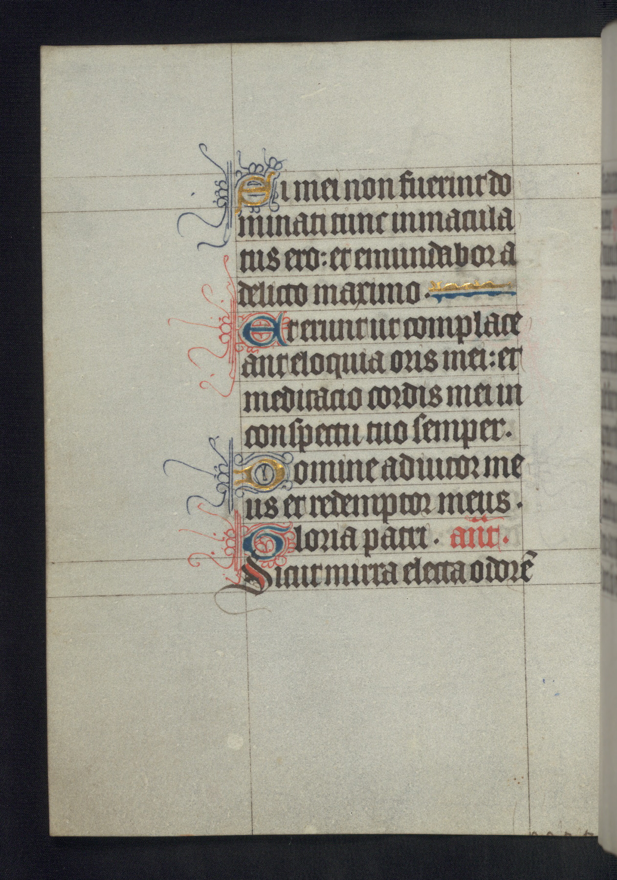 This Book of Hours was named the Doffinnes Hours after Franchoise de Doffinnes, who owned the book in the late sixteenth century and whose family’s subsequent history remains chronicled on the book’s final folios. However, the manuscript was originally made in the first quarter of the fifteenth century, probably for a married couple, who were originally represented kneeling with scrolls and their coats of arms in the margins, flanking a full-page miniature of the Crucifixion (fol. 72v), but whose figures and arms were later erased and overpainted with white. The manuscript contains both Latin and Dutch texts, supplemented by twelve full-page miniatures, the work of the Master of Walters 185. The manuscript also contains twelve pen-and-ink decorated initials in the calendar, some with grotesque faces, and letter "G" descenders throughout the book that can be attributed to the scribe Johannes de Malborch. The book’s original Dutch provenance is indicated by its calendar (for the Use of Utrecht) and its Hours of the Virgin, which follows predominantly the Use of the Windesheim Congregation. Prayers in Dutch were added to the end of the volume in the late fifteenth or early sixteenth century, and the book was subsequently rebound with its current cream-colored parchment binding of the seventeenth or eighteenth century.
