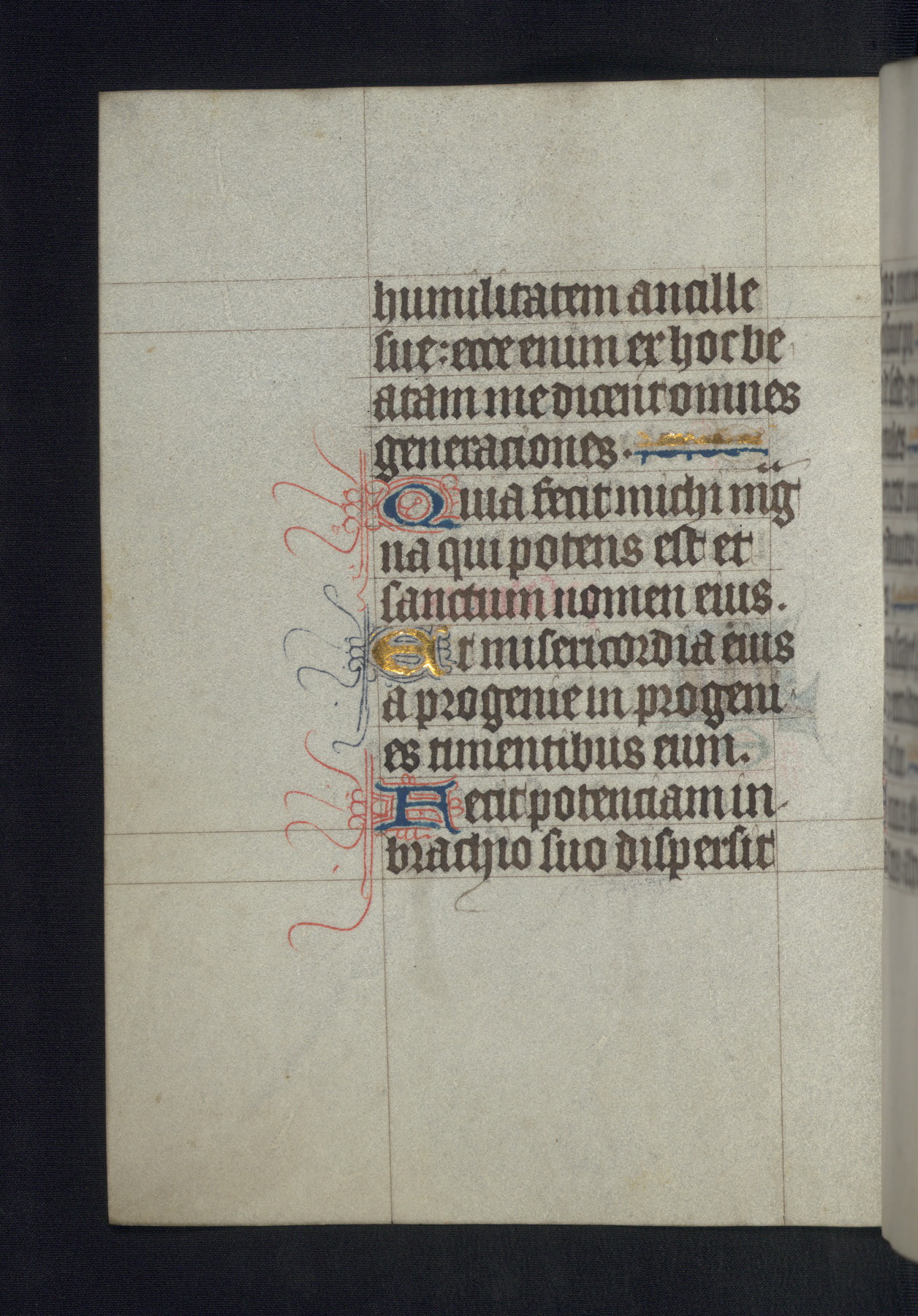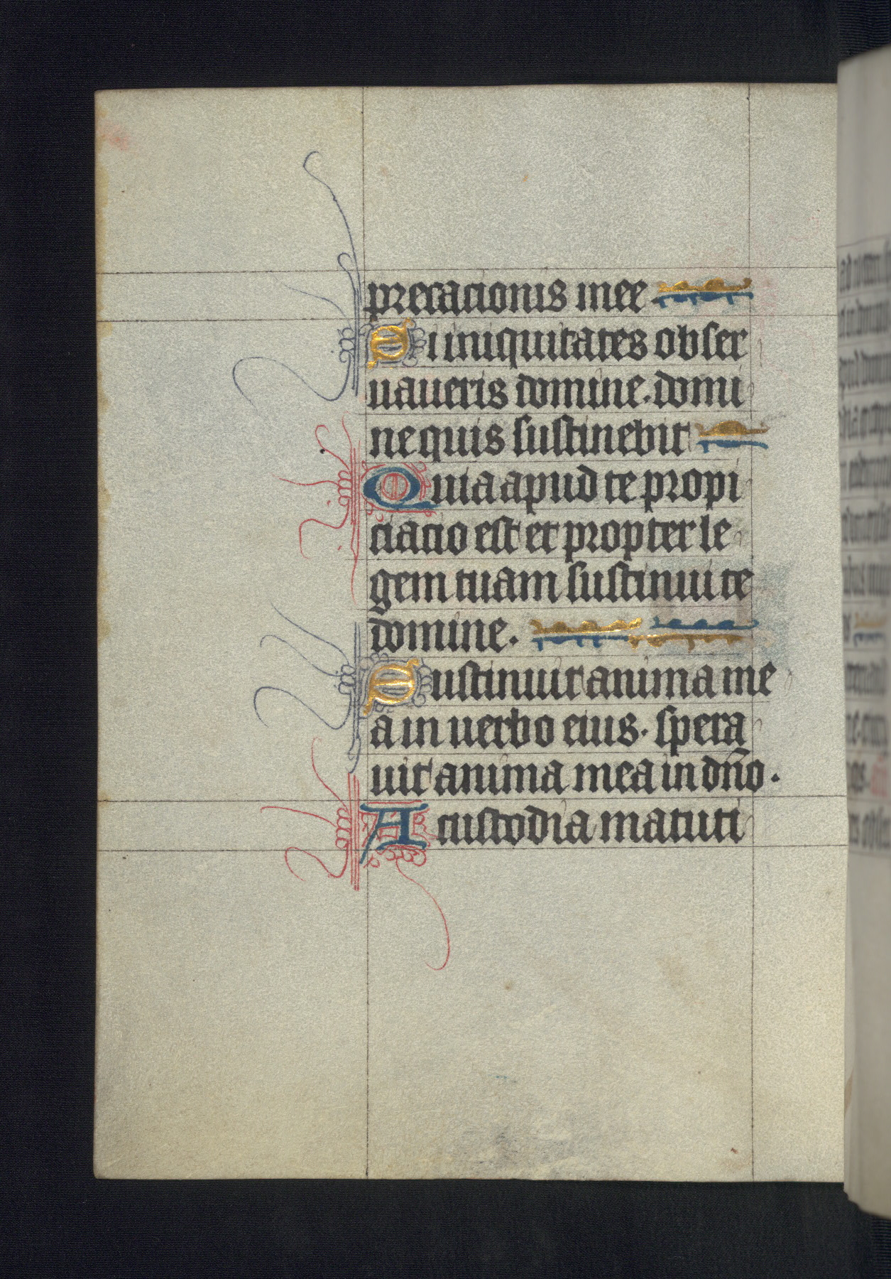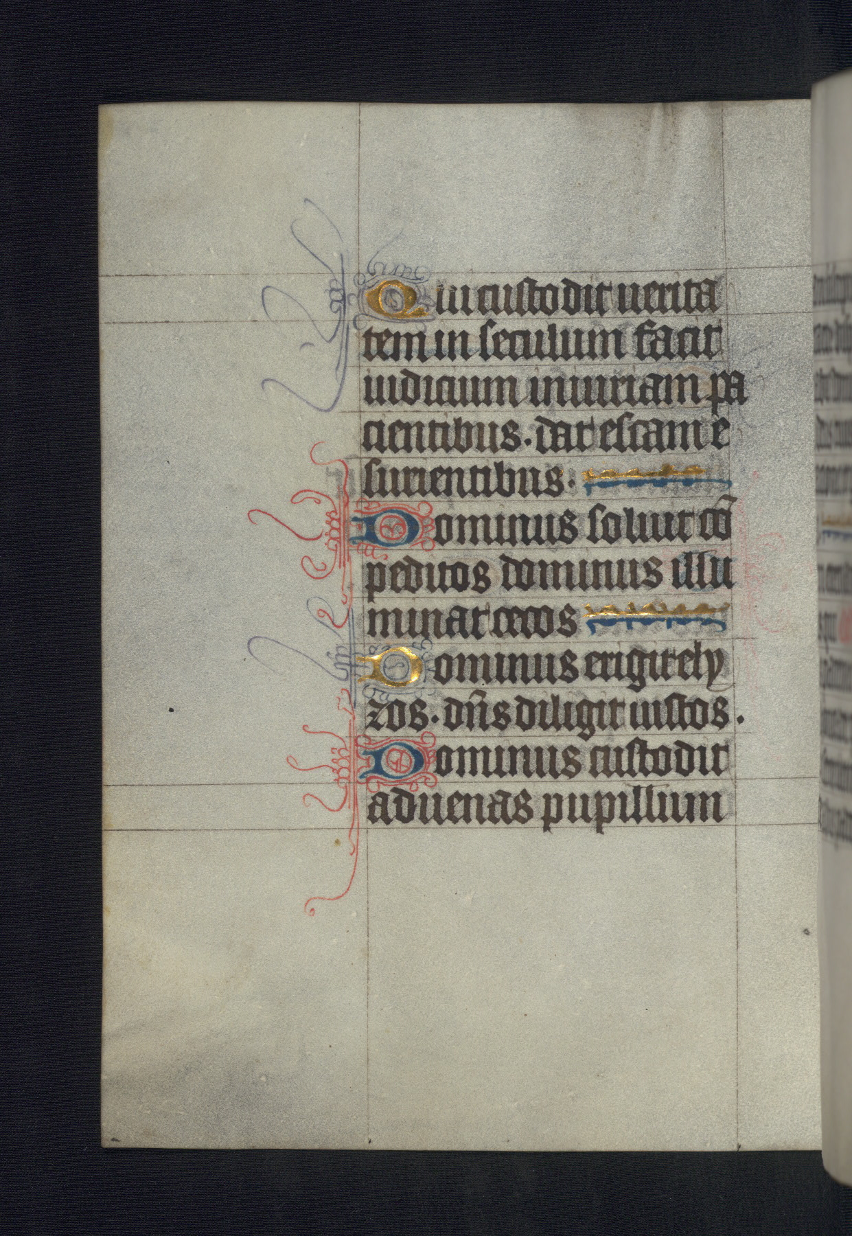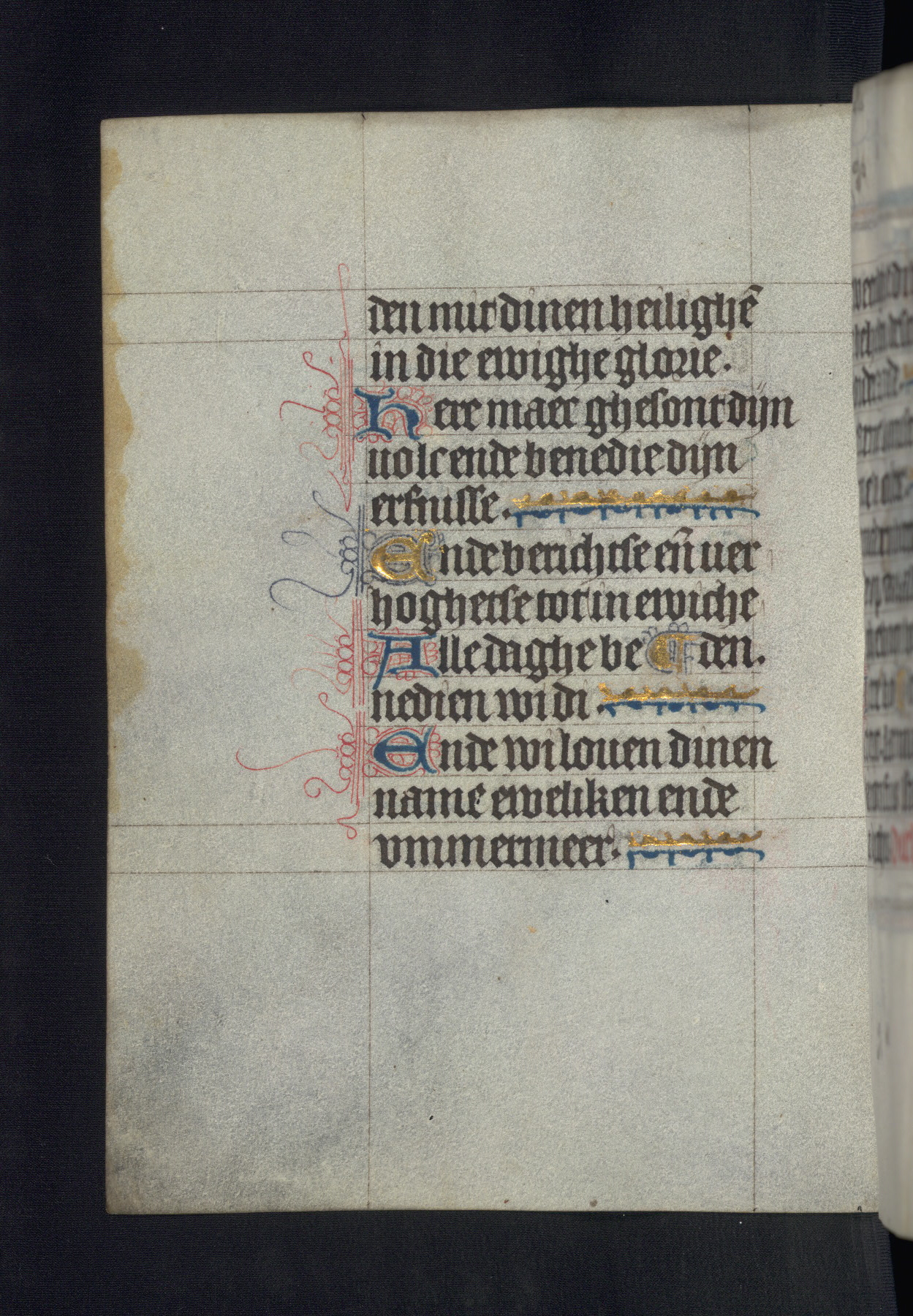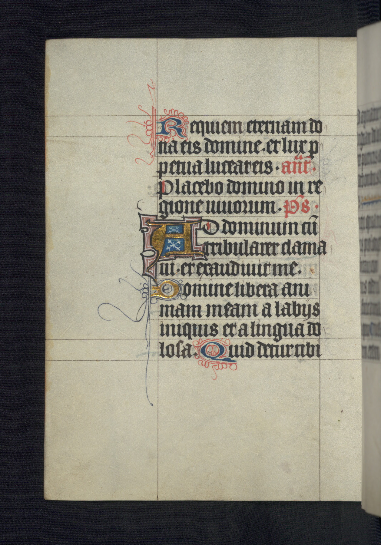 This Book of Hours was named the Doffinnes Hours after Franchoise de Doffinnes, who owned the book in the late sixteenth century and whose family’s subsequent history remains chronicled on the book’s final folios. However, the manuscript was originally made in the first quarter of the fifteenth century, probably for a married couple, who were originally represented kneeling with scrolls and their coats of arms in the margins, flanking a full-page miniature of the Crucifixion (fol. 72v), but whose figures and arms were later erased and overpainted with white. The manuscript contains both Latin and Dutch texts, supplemented by twelve full-page miniatures, the work of the Master of Walters 185. The manuscript also contains twelve pen-and-ink decorated initials in the calendar, some with grotesque faces, and letter "G" descenders throughout the book that can be attributed to the scribe Johannes de Malborch. The book’s original Dutch provenance is indicated by its calendar (for the Use of Utrecht) and its Hours of the Virgin, which follows predominantly the Use of the Windesheim Congregation. Prayers in Dutch were added to the end of the volume in the late fifteenth or early sixteenth century, and the book was subsequently rebound with its current cream-colored parchment binding of the seventeenth or eighteenth century.