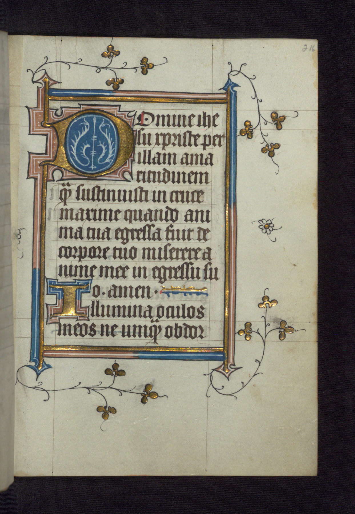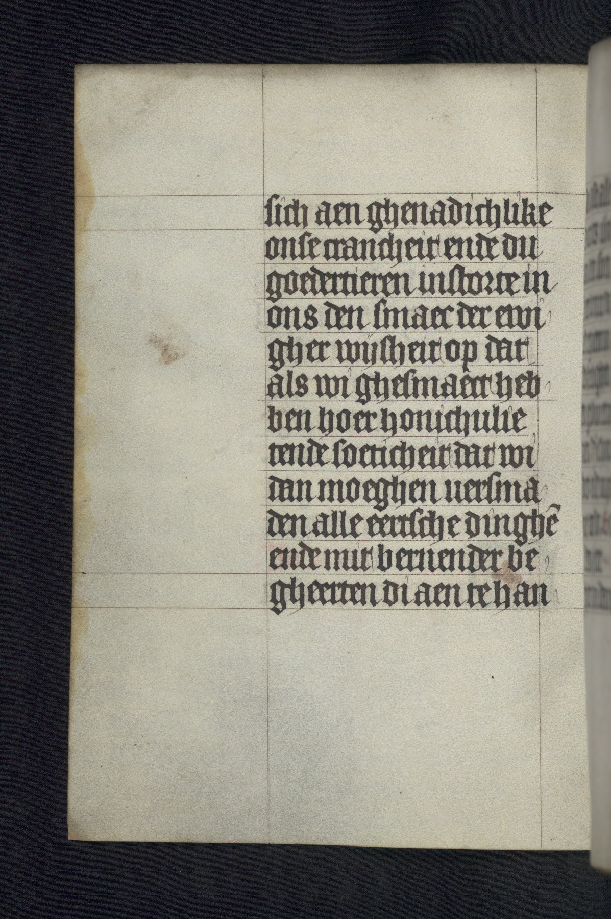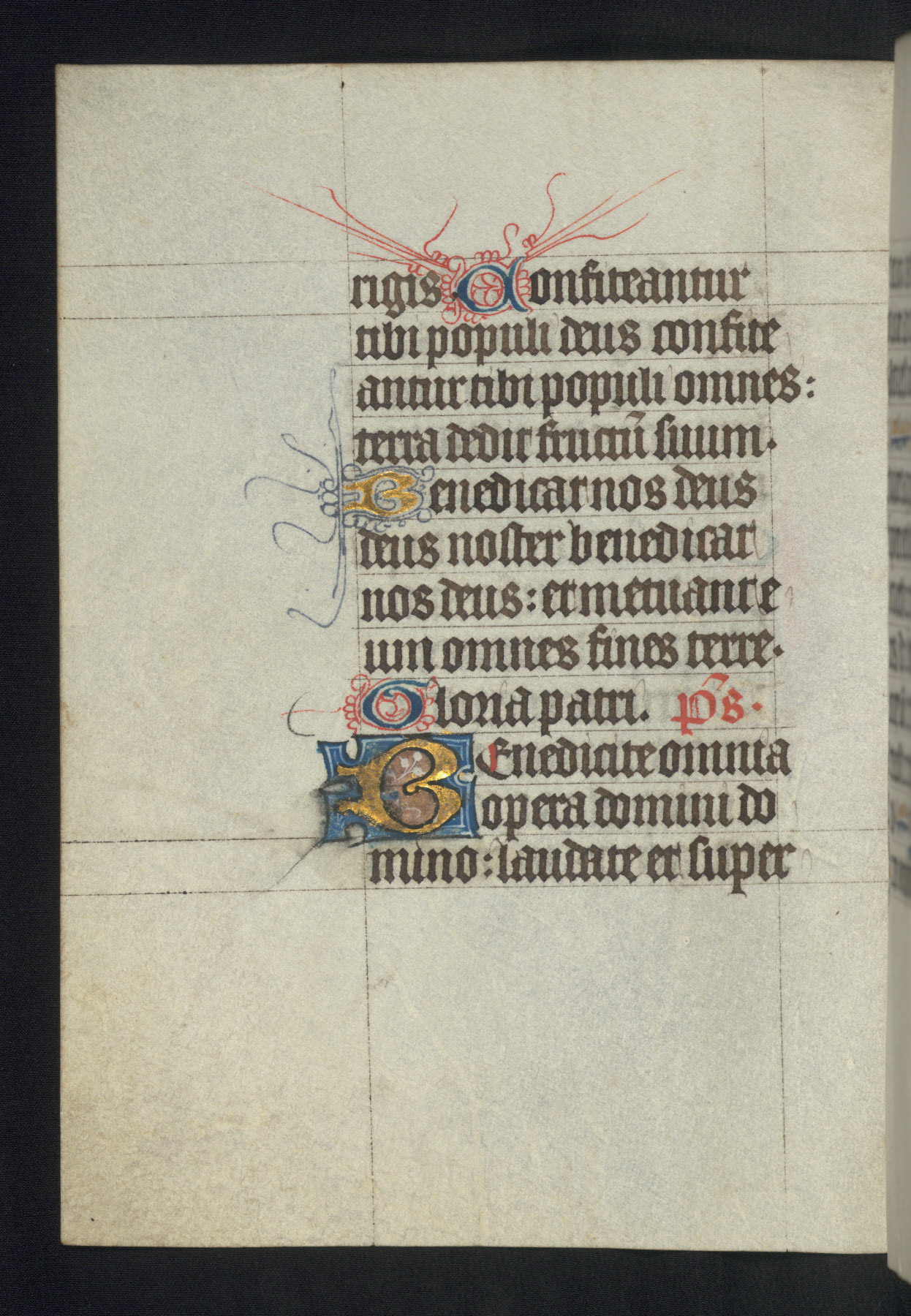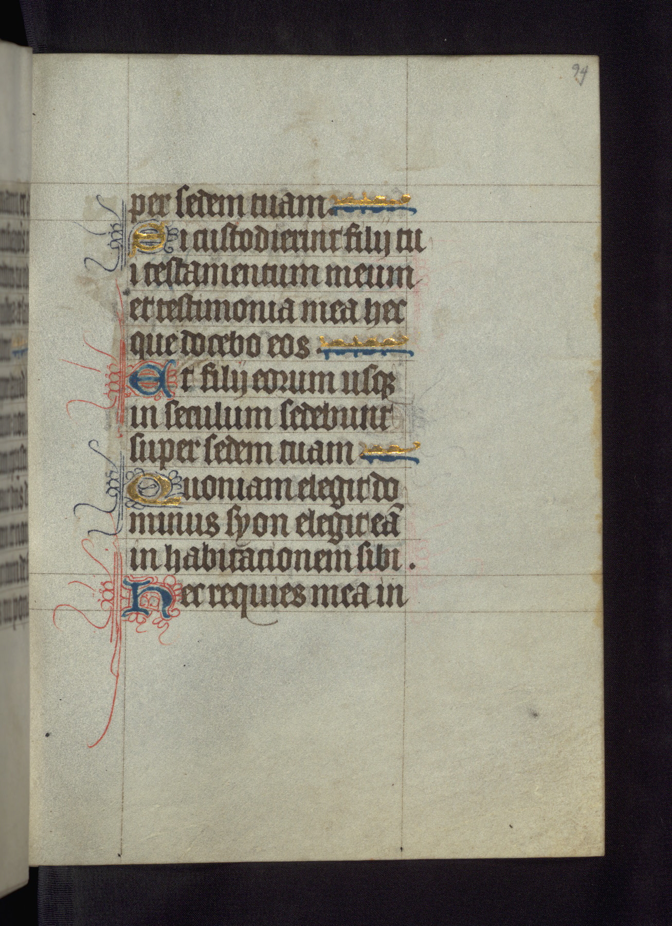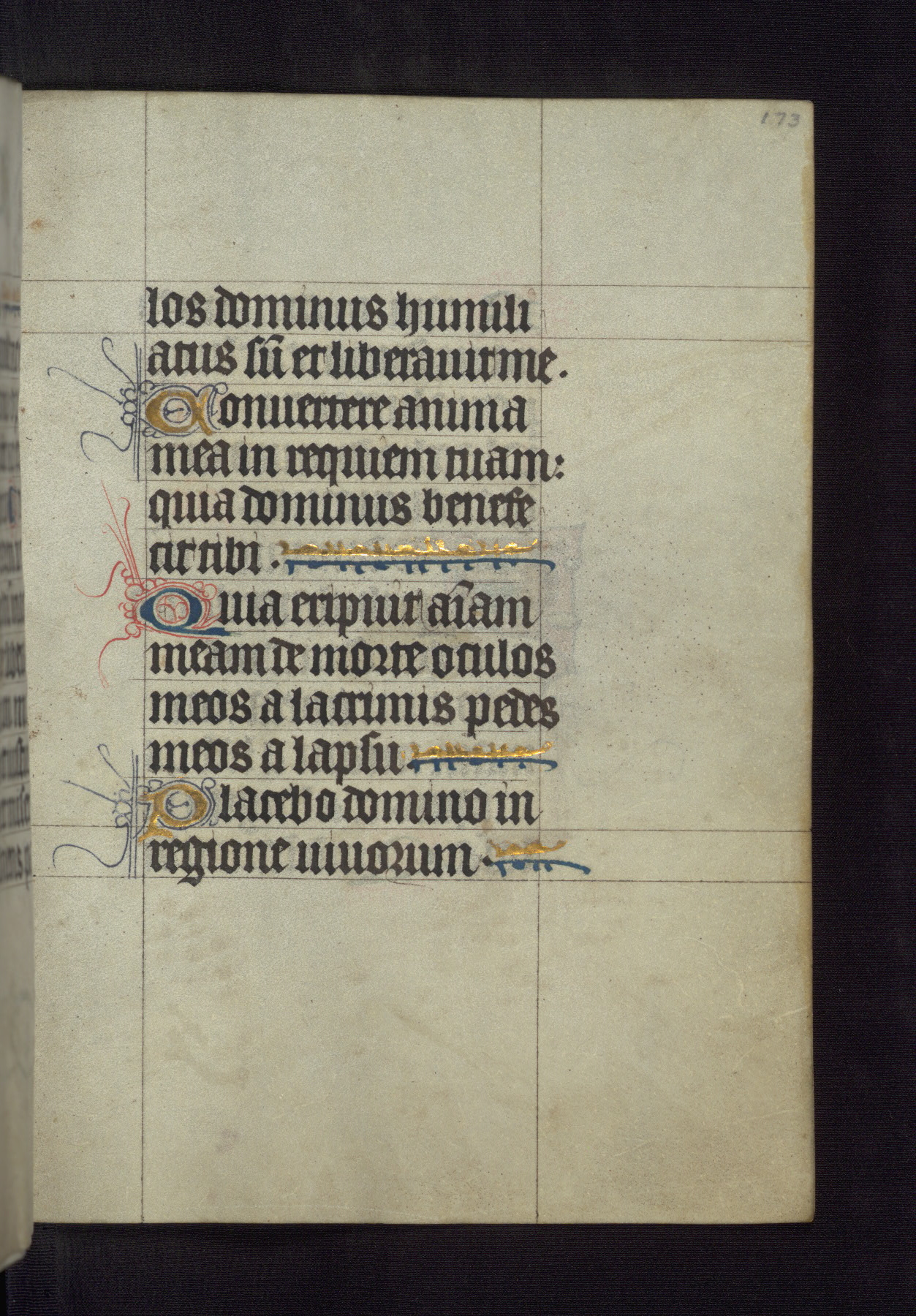 This Book of Hours was named the Doffinnes Hours after Franchoise de Doffinnes, who owned the book in the late sixteenth century and whose family’s subsequent history remains chronicled on the book’s final folios. However, the manuscript was originally made in the first quarter of the fifteenth century, probably for a married couple, who were originally represented kneeling with scrolls and their coats of arms in the margins, flanking a full-page miniature of the Crucifixion (fol. 72v), but whose figures and arms were later erased and overpainted with white. The manuscript contains both Latin and Dutch texts, supplemented by twelve full-page miniatures, the work of the Master of Walters 185. The manuscript also contains twelve pen-and-ink decorated initials in the calendar, some with grotesque faces, and letter "G" descenders throughout the book that can be attributed to the scribe Johannes de Malborch. The book’s original Dutch provenance is indicated by its calendar (for the Use of Utrecht) and its Hours of the Virgin, which follows predominantly the Use of the Windesheim Congregation. Prayers in Dutch were added to the end of the volume in the late fifteenth or early sixteenth century, and the book was subsequently rebound with its current cream-colored parchment binding of the seventeenth or eighteenth century.