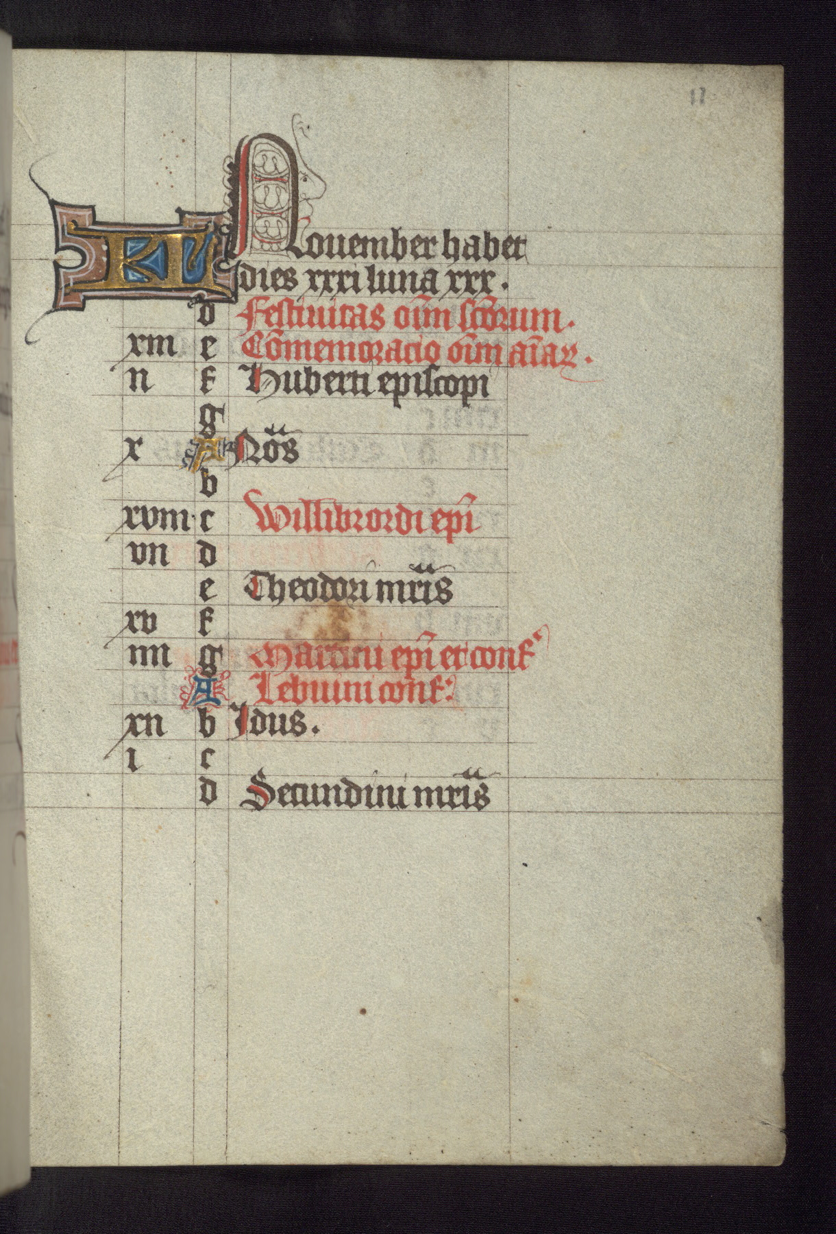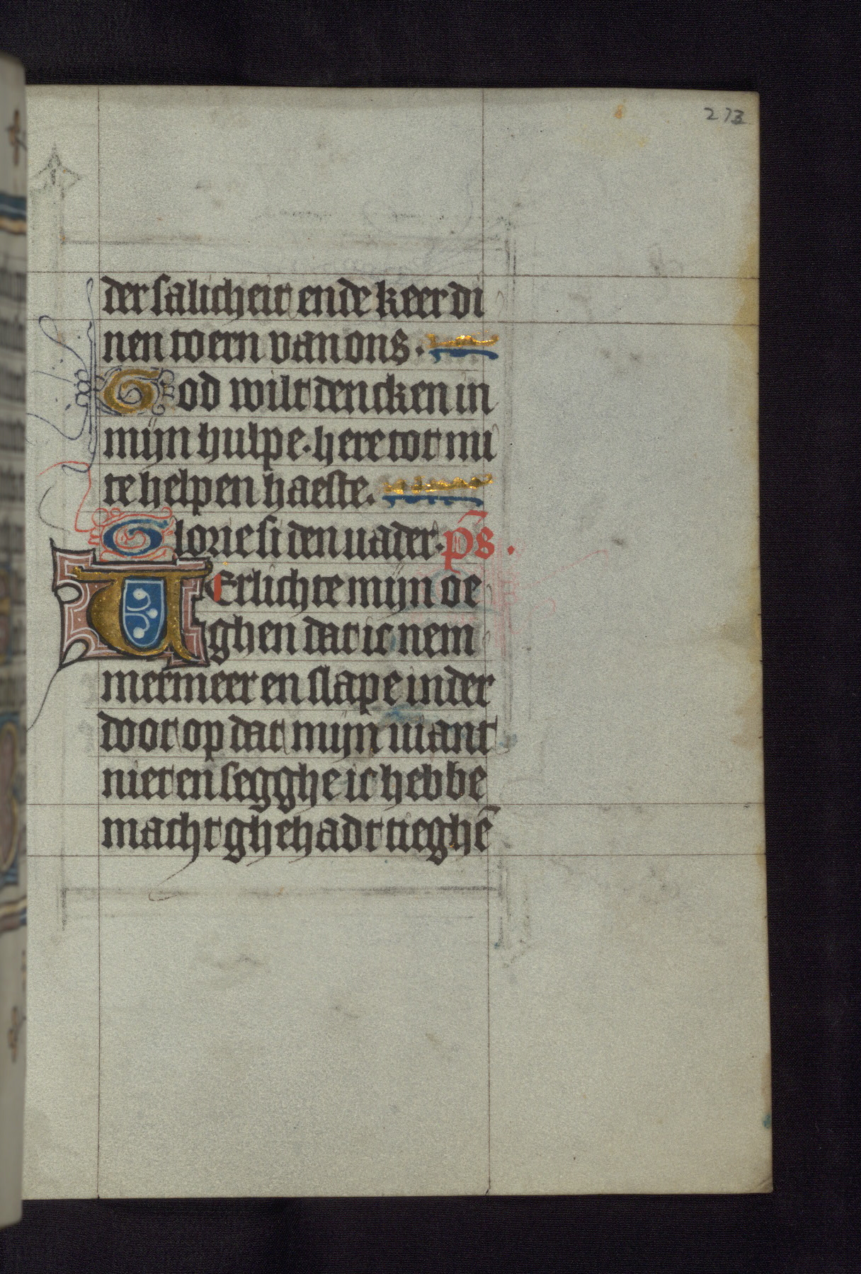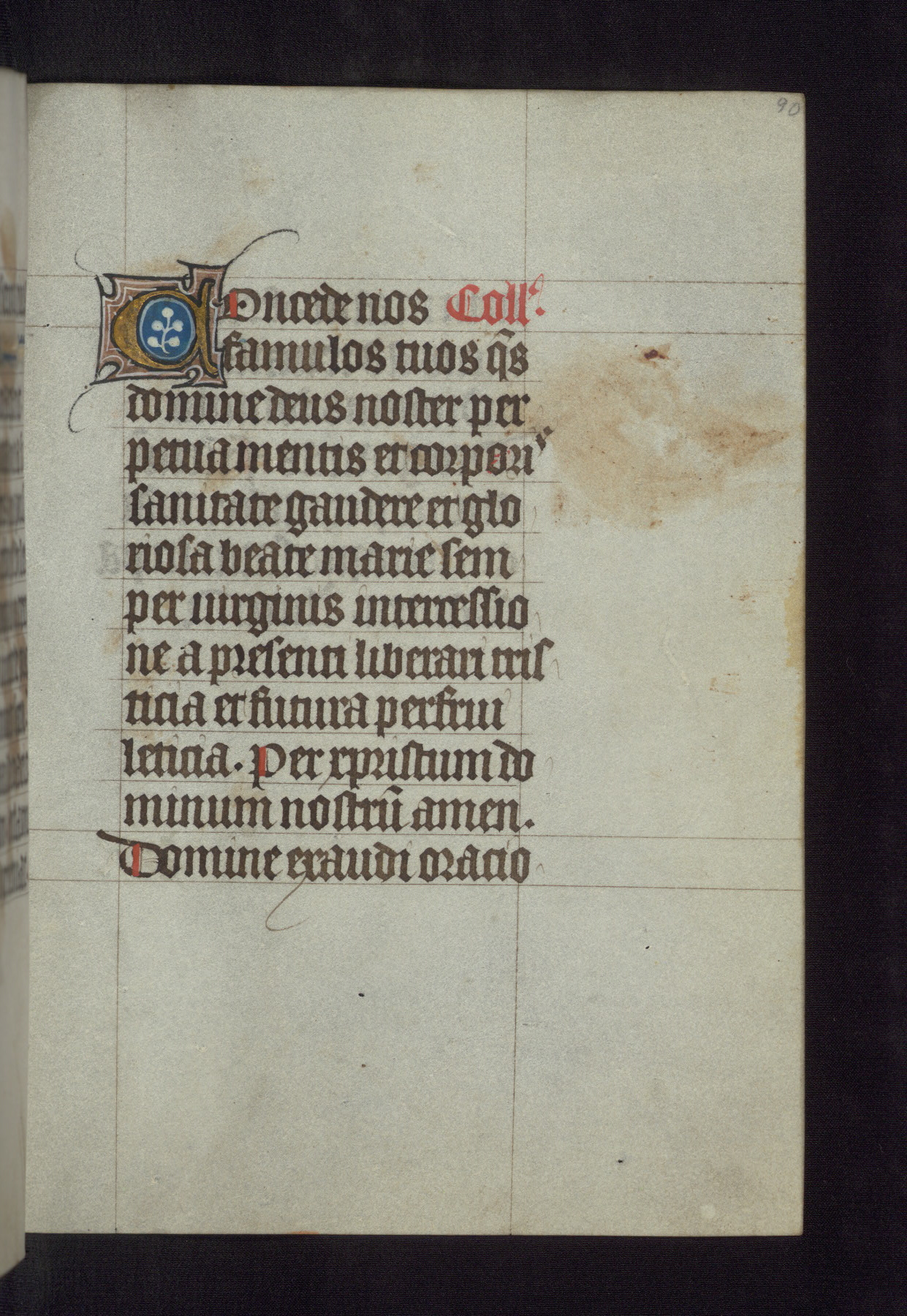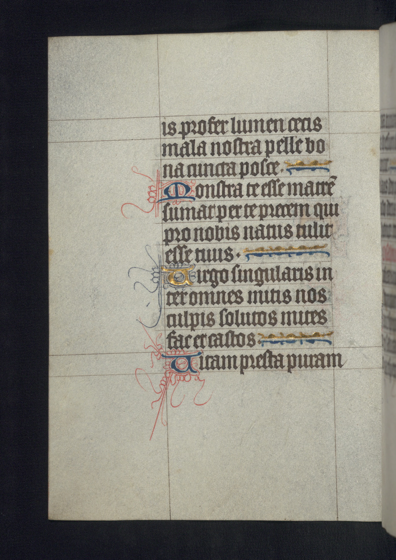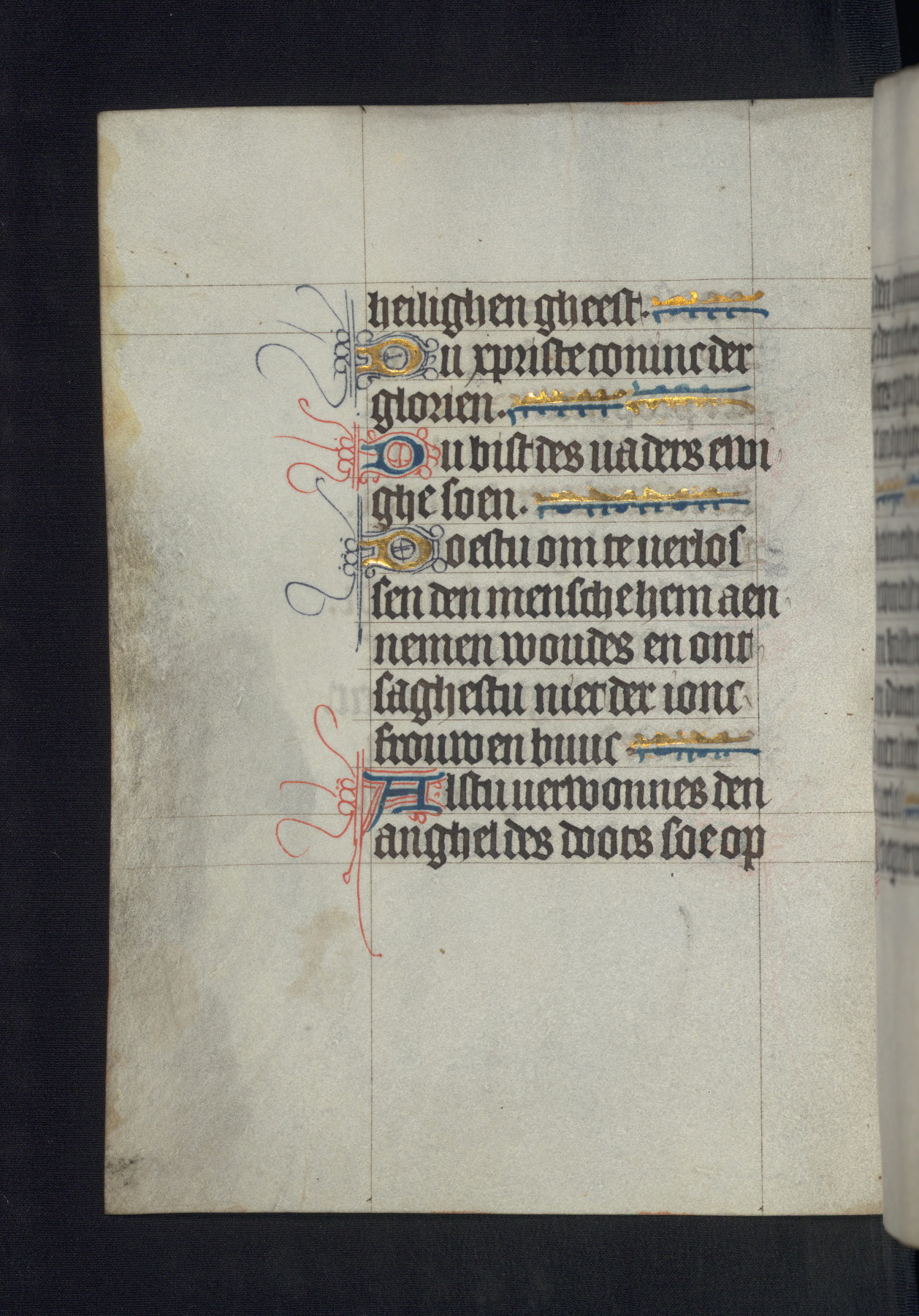 This Book of Hours was named the Doffinnes Hours after Franchoise de Doffinnes, who owned the book in the late sixteenth century and whose family’s subsequent history remains chronicled on the book’s final folios. However, the manuscript was originally made in the first quarter of the fifteenth century, probably for a married couple, who were originally represented kneeling with scrolls and their coats of arms in the margins, flanking a full-page miniature of the Crucifixion (fol. 72v), but whose figures and arms were later erased and overpainted with white. The manuscript contains both Latin and Dutch texts, supplemented by twelve full-page miniatures, the work of the Master of Walters 185. The manuscript also contains twelve pen-and-ink decorated initials in the calendar, some with grotesque faces, and letter "G" descenders throughout the book that can be attributed to the scribe Johannes de Malborch. The book’s original Dutch provenance is indicated by its calendar (for the Use of Utrecht) and its Hours of the Virgin, which follows predominantly the Use of the Windesheim Congregation. Prayers in Dutch were added to the end of the volume in the late fifteenth or early sixteenth century, and the book was subsequently rebound with its current cream-colored parchment binding of the seventeenth or eighteenth century.