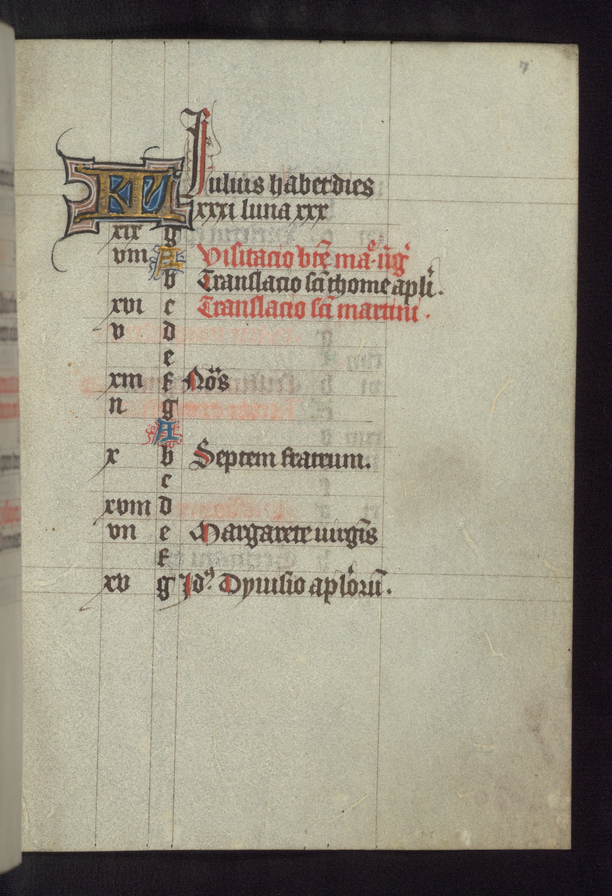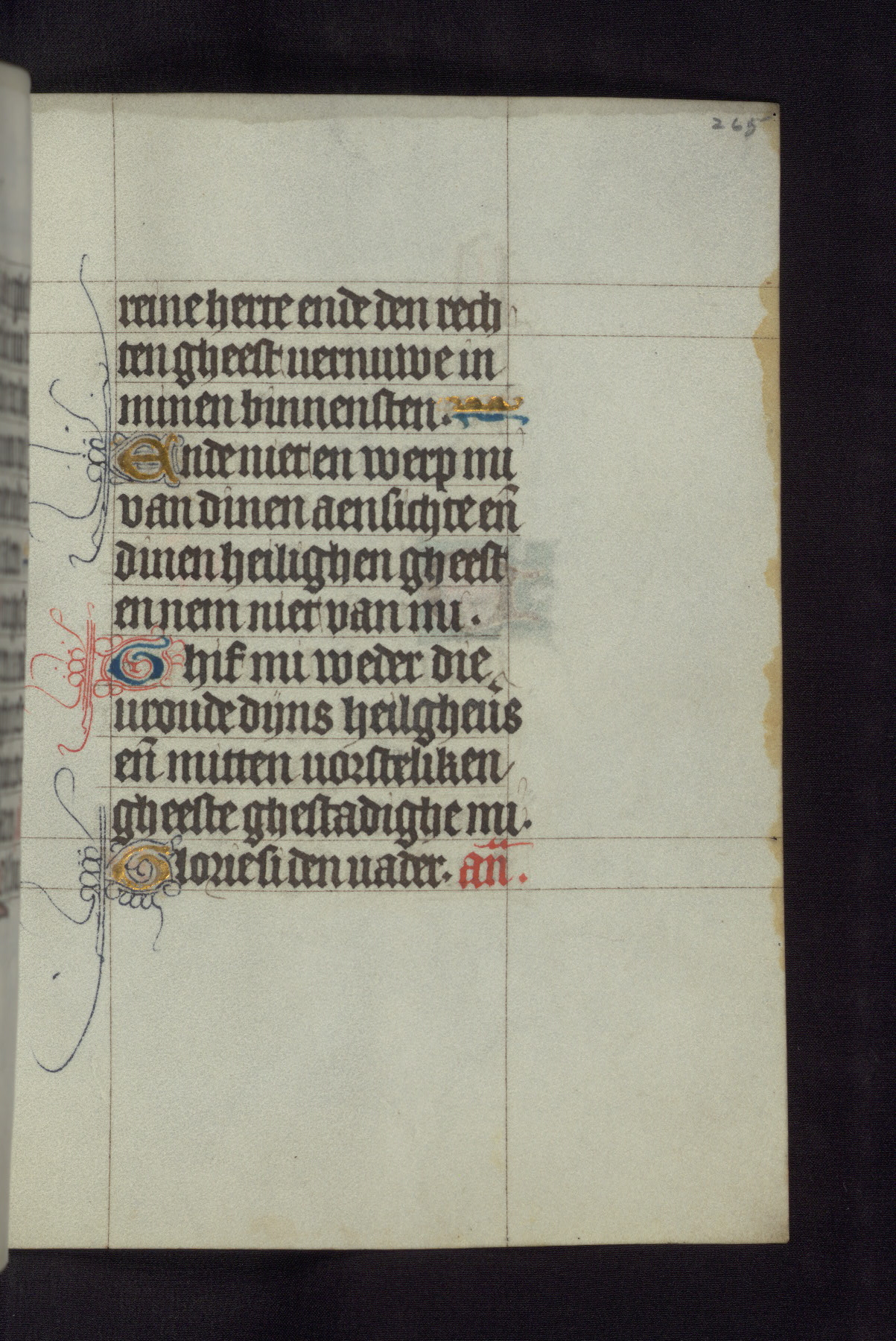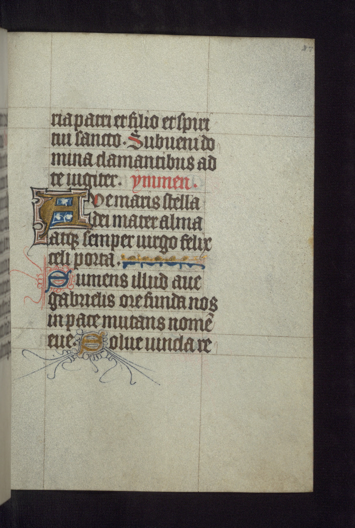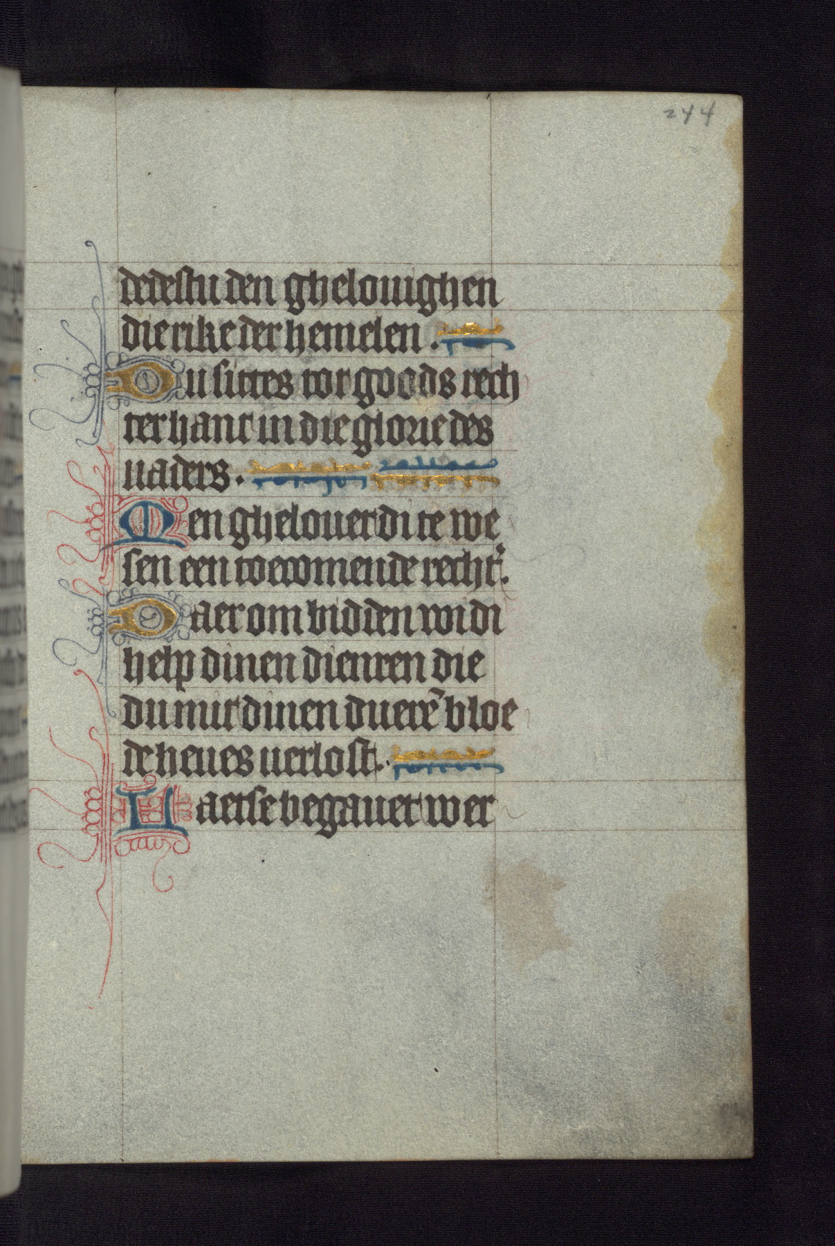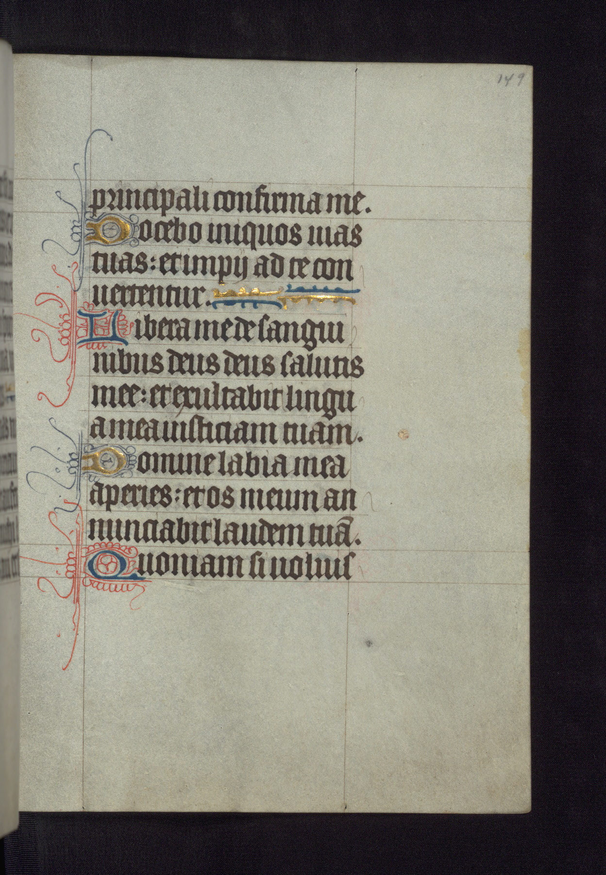 This Book of Hours was named the Doffinnes Hours after Franchoise de Doffinnes, who owned the book in the late sixteenth century and whose family’s subsequent history remains chronicled on the book’s final folios. However, the manuscript was originally made in the first quarter of the fifteenth century, probably for a married couple, who were originally represented kneeling with scrolls and their coats of arms in the margins, flanking a full-page miniature of the Crucifixion (fol. 72v), but whose figures and arms were later erased and overpainted with white. The manuscript contains both Latin and Dutch texts, supplemented by twelve full-page miniatures, the work of the Master of Walters 185. The manuscript also contains twelve pen-and-ink decorated initials in the calendar, some with grotesque faces, and letter "G" descenders throughout the book that can be attributed to the scribe Johannes de Malborch. The book’s original Dutch provenance is indicated by its calendar (for the Use of Utrecht) and its Hours of the Virgin, which follows predominantly the Use of the Windesheim Congregation. Prayers in Dutch were added to the end of the volume in the late fifteenth or early sixteenth century, and the book was subsequently rebound with its current cream-colored parchment binding of the seventeenth or eighteenth century.
