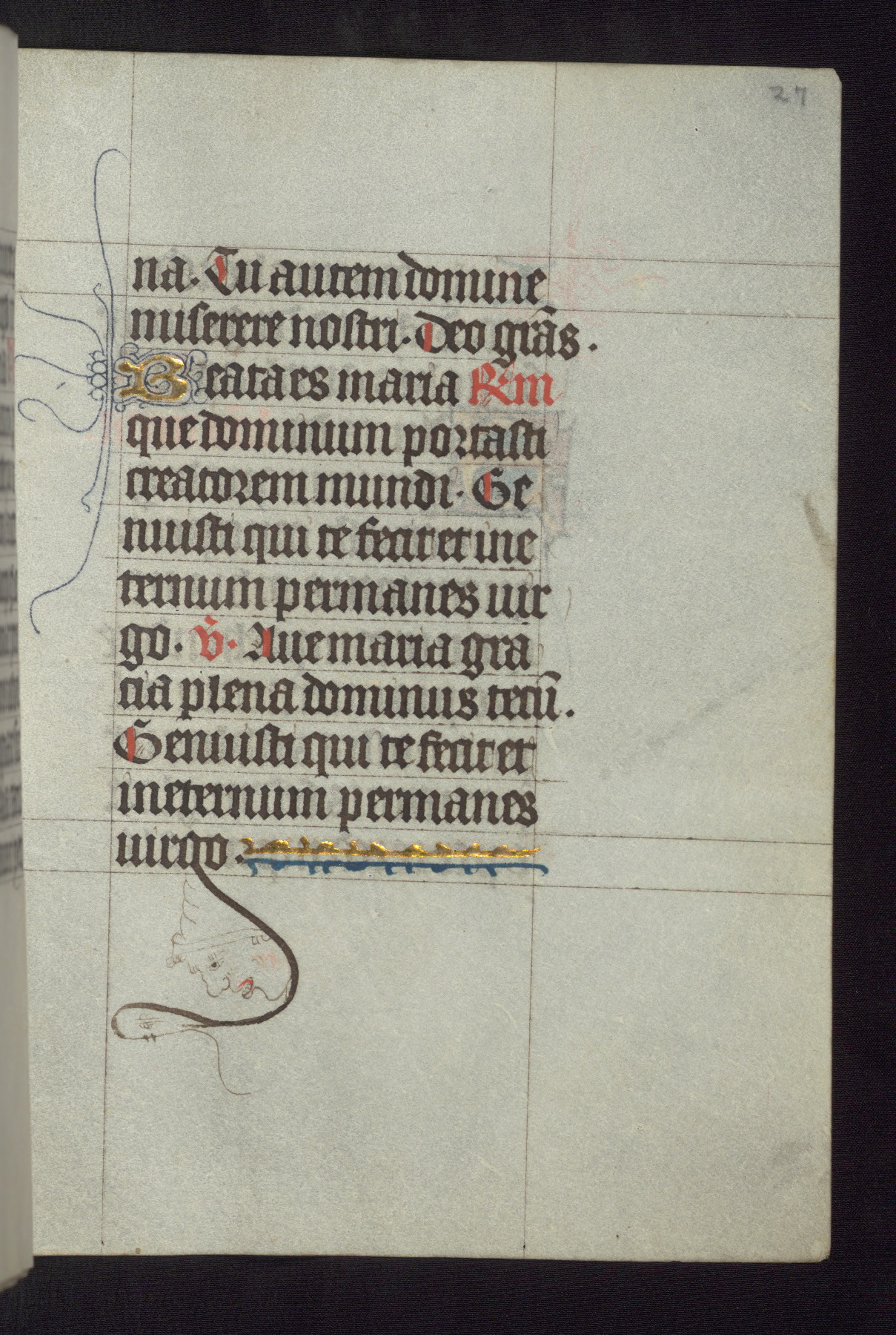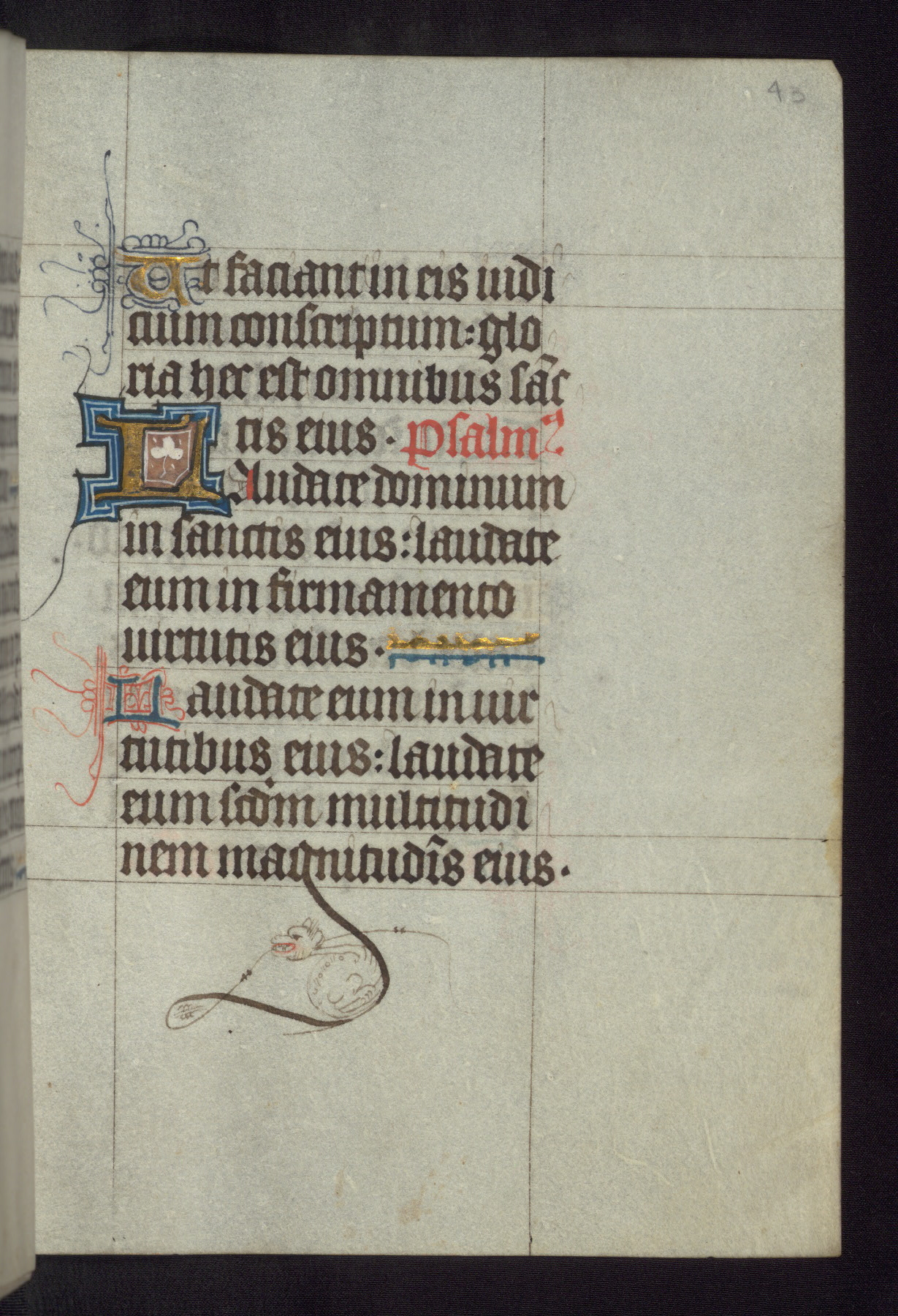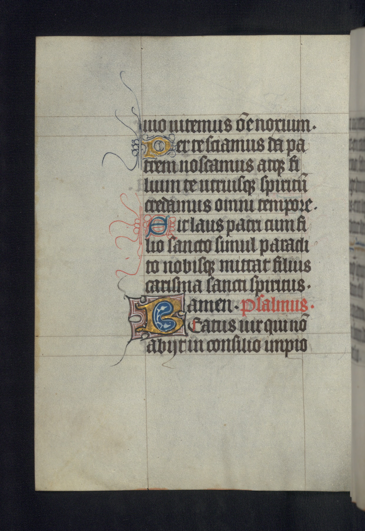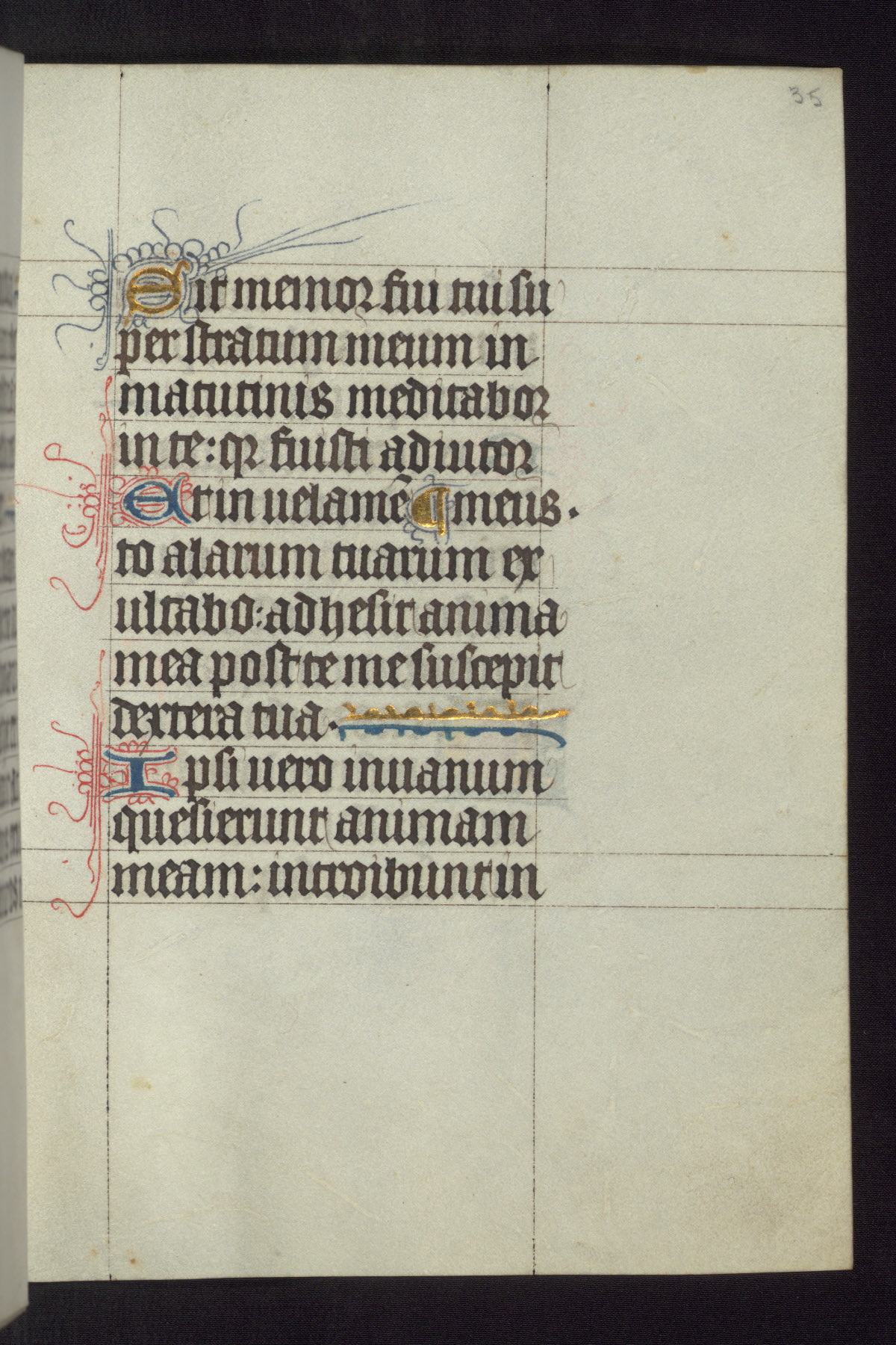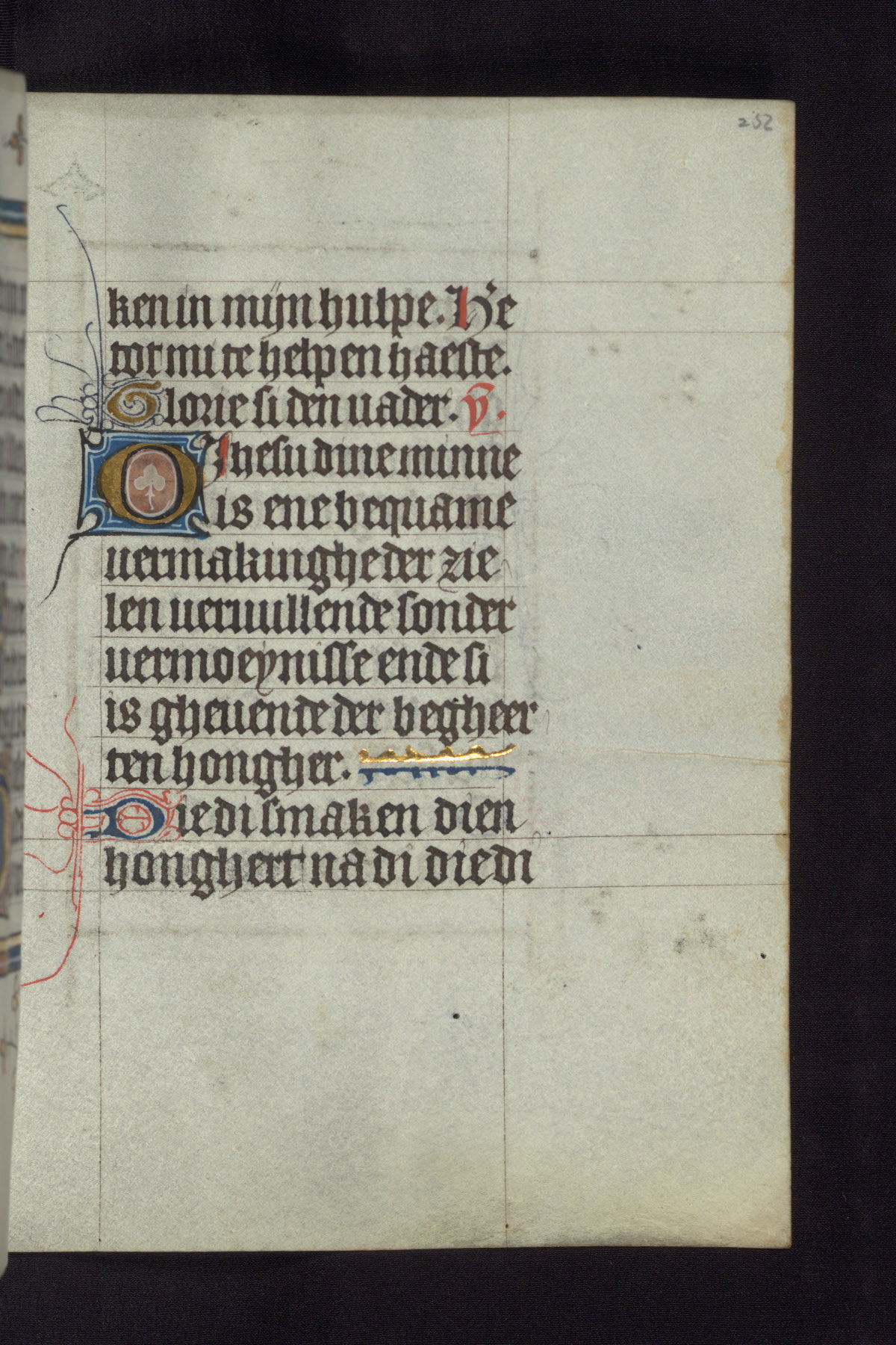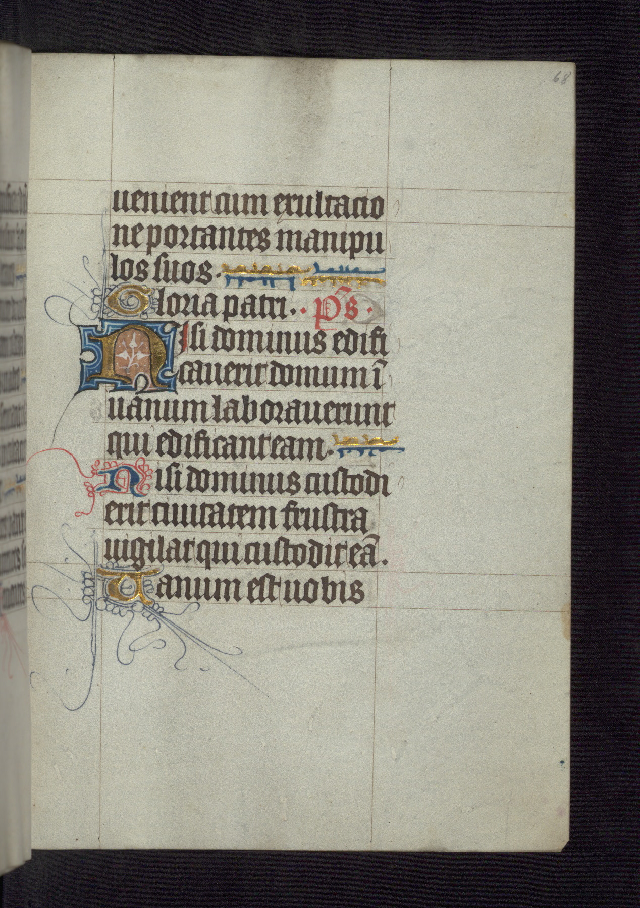 This Book of Hours was named the Doffinnes Hours after Franchoise de Doffinnes, who owned the book in the late sixteenth century and whose family’s subsequent history remains chronicled on the book’s final folios. However, the manuscript was originally made in the first quarter of the fifteenth century, probably for a married couple, who were originally represented kneeling with scrolls and their coats of arms in the margins, flanking a full-page miniature of the Crucifixion (fol. 72v), but whose figures and arms were later erased and overpainted with white. The manuscript contains both Latin and Dutch texts, supplemented by twelve full-page miniatures, the work of the Master of Walters 185. The manuscript also contains twelve pen-and-ink decorated initials in the calendar, some with grotesque faces, and letter "G" descenders throughout the book that can be attributed to the scribe Johannes de Malborch. The book’s original Dutch provenance is indicated by its calendar (for the Use of Utrecht) and its Hours of the Virgin, which follows predominantly the Use of the Windesheim Congregation. Prayers in Dutch were added to the end of the volume in the late fifteenth or early sixteenth century, and the book was subsequently rebound with its current cream-colored parchment binding of the seventeenth or eighteenth century.
