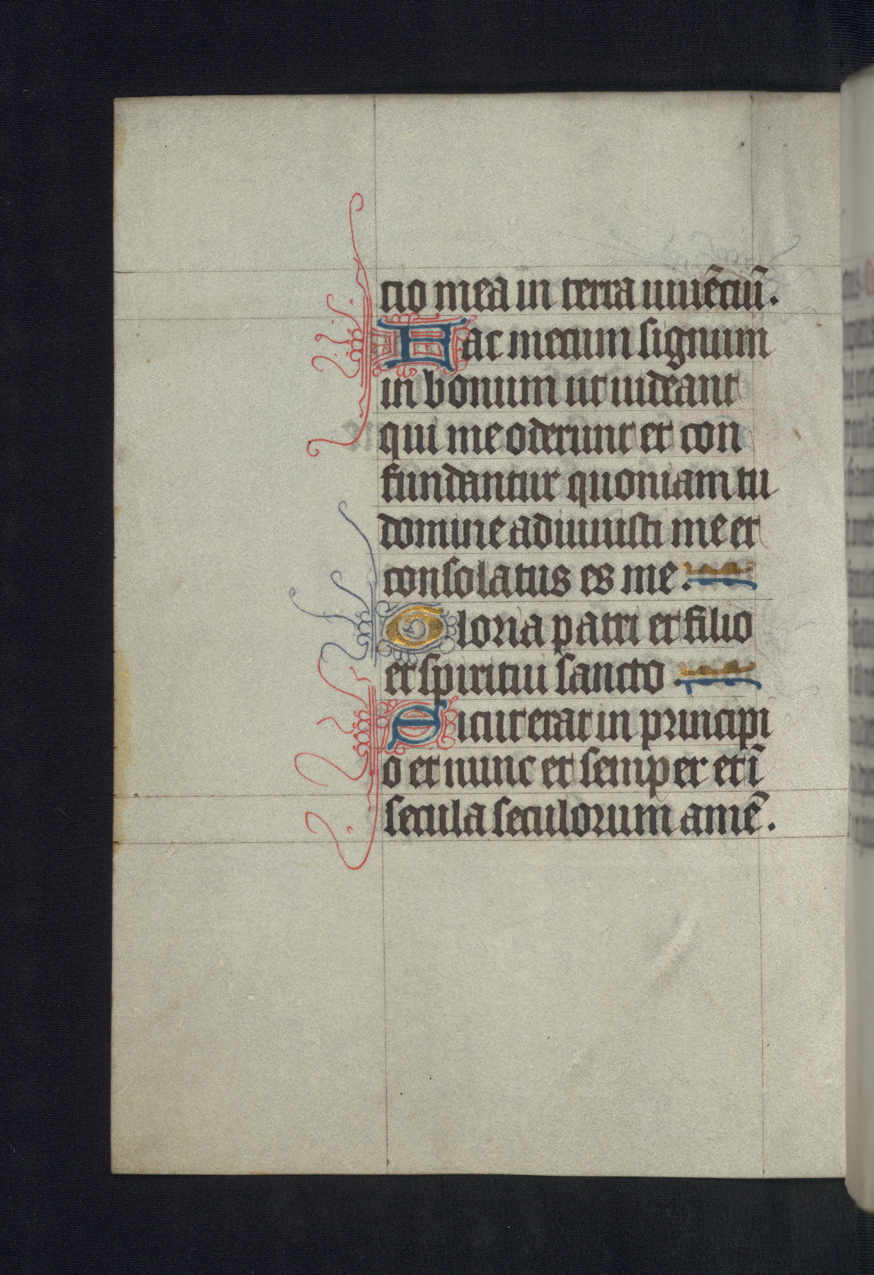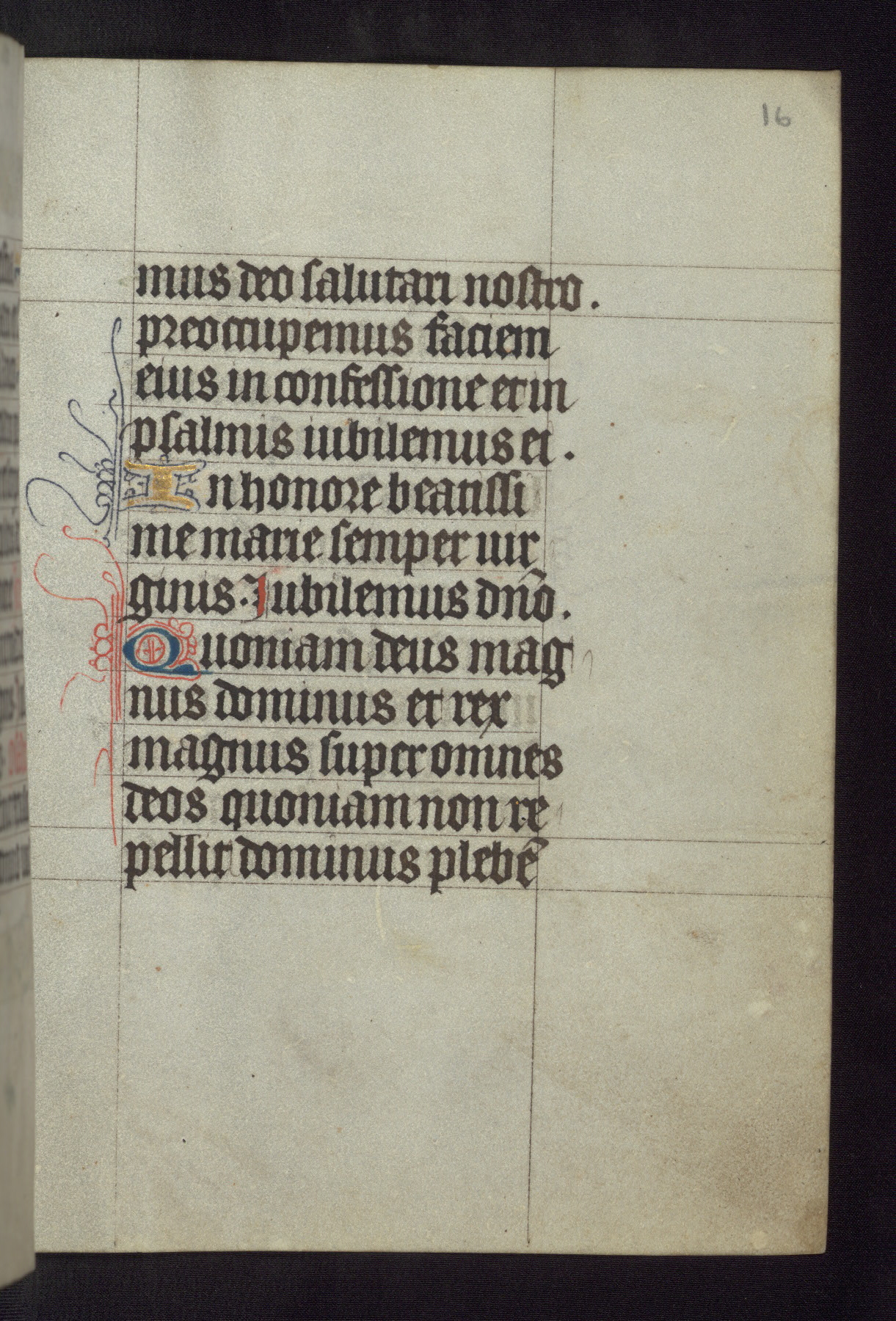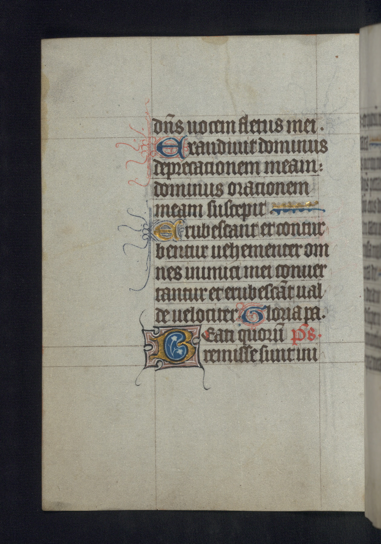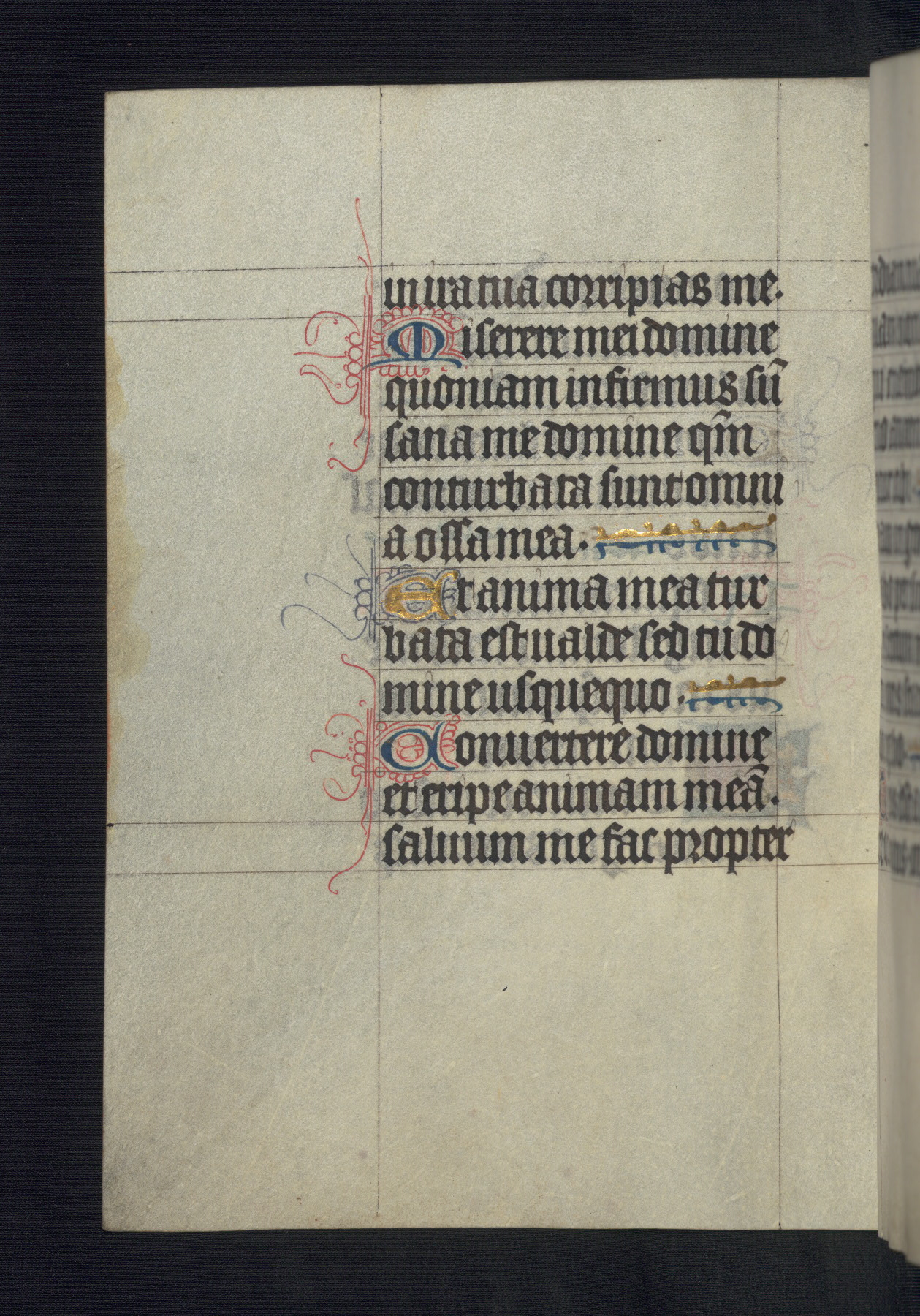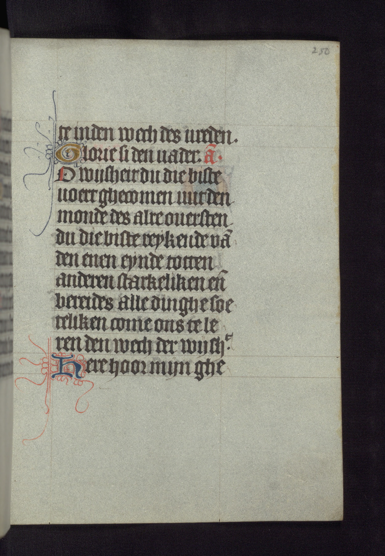 This Book of Hours was named the Doffinnes Hours after Franchoise de Doffinnes, who owned the book in the late sixteenth century and whose family’s subsequent history remains chronicled on the book’s final folios. However, the manuscript was originally made in the first quarter of the fifteenth century, probably for a married couple, who were originally represented kneeling with scrolls and their coats of arms in the margins, flanking a full-page miniature of the Crucifixion (fol. 72v), but whose figures and arms were later erased and overpainted with white. The manuscript contains both Latin and Dutch texts, supplemented by twelve full-page miniatures, the work of the Master of Walters 185. The manuscript also contains twelve pen-and-ink decorated initials in the calendar, some with grotesque faces, and letter "G" descenders throughout the book that can be attributed to the scribe Johannes de Malborch. The book’s original Dutch provenance is indicated by its calendar (for the Use of Utrecht) and its Hours of the Virgin, which follows predominantly the Use of the Windesheim Congregation. Prayers in Dutch were added to the end of the volume in the late fifteenth or early sixteenth century, and the book was subsequently rebound with its current cream-colored parchment binding of the seventeenth or eighteenth century.