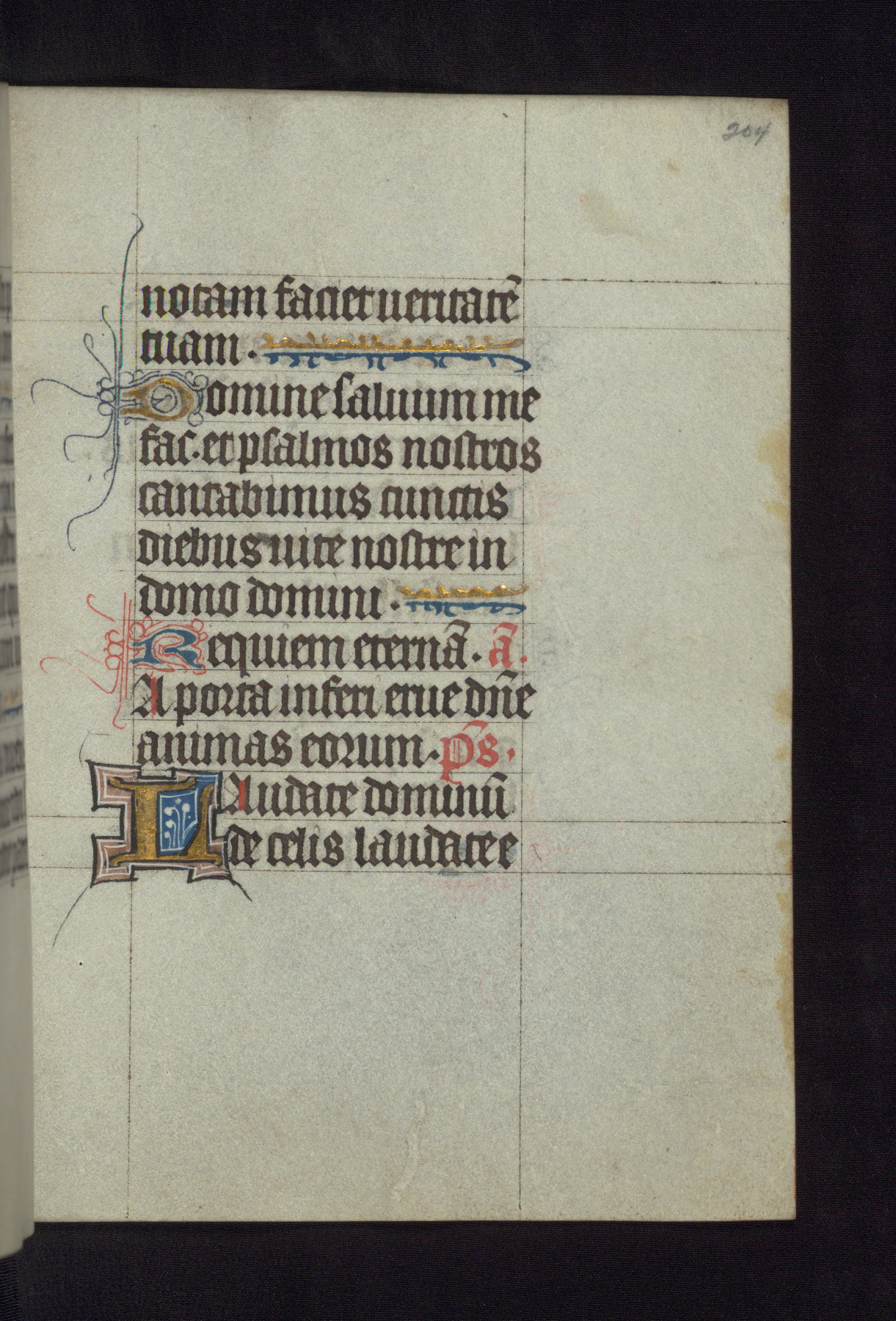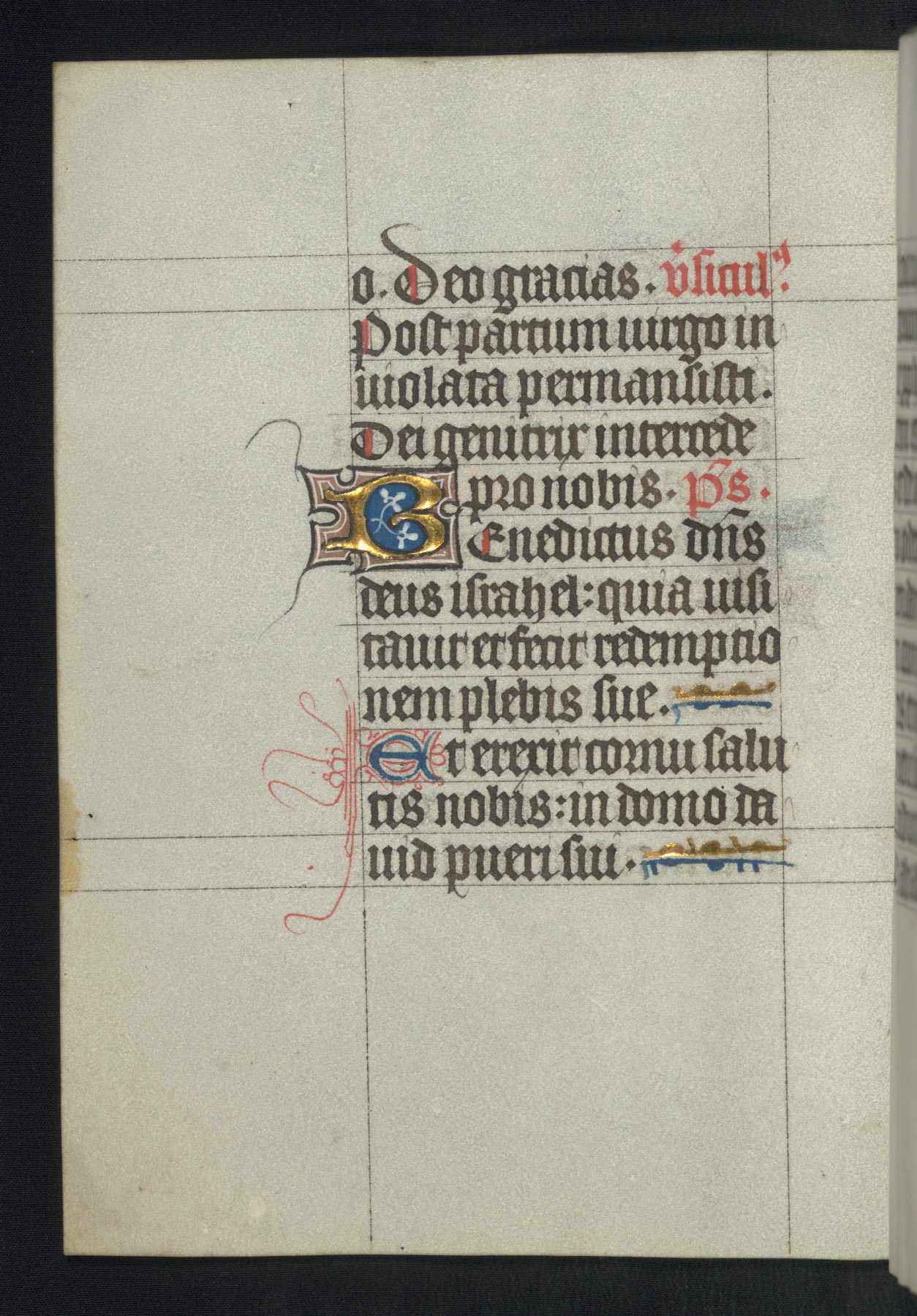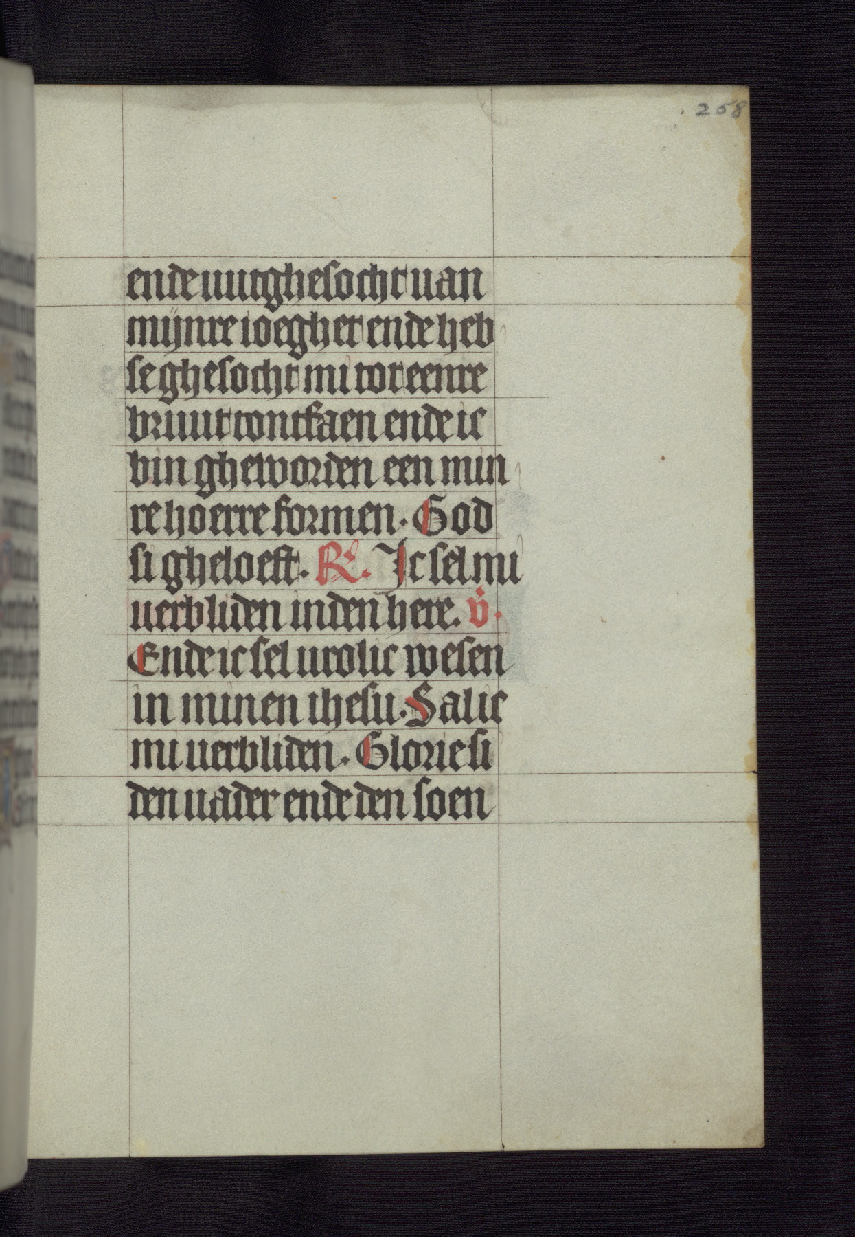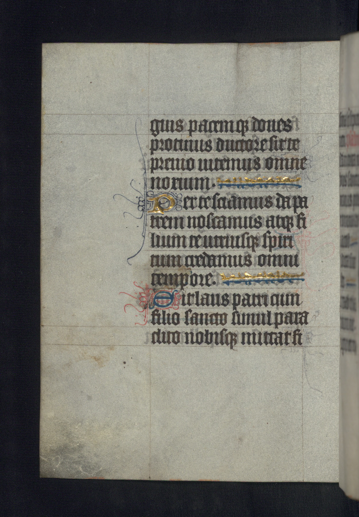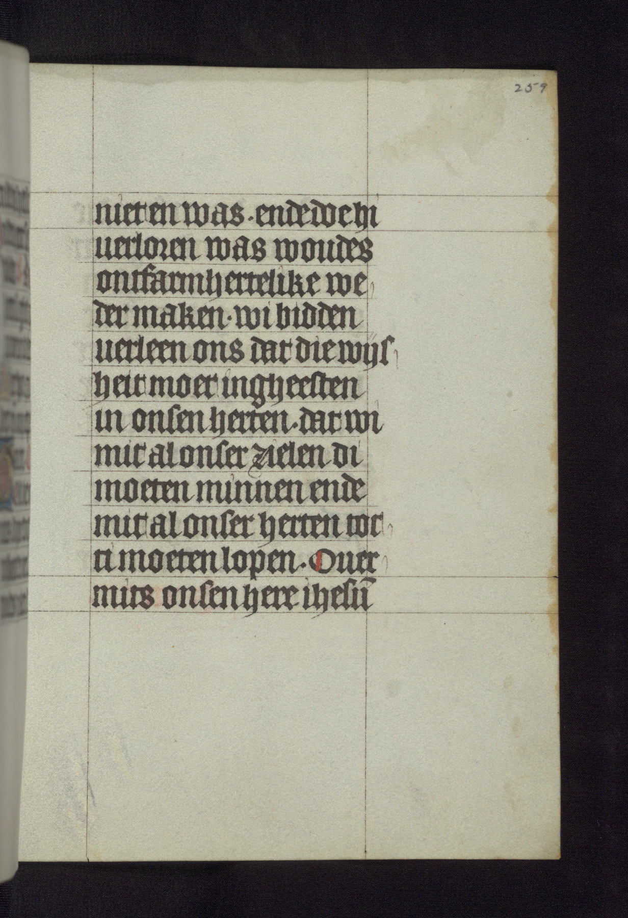 This Book of Hours was named the Doffinnes Hours after Franchoise de Doffinnes, who owned the book in the late sixteenth century and whose family’s subsequent history remains chronicled on the book’s final folios. However, the manuscript was originally made in the first quarter of the fifteenth century, probably for a married couple, who were originally represented kneeling with scrolls and their coats of arms in the margins, flanking a full-page miniature of the Crucifixion (fol. 72v), but whose figures and arms were later erased and overpainted with white. The manuscript contains both Latin and Dutch texts, supplemented by twelve full-page miniatures, the work of the Master of Walters 185. The manuscript also contains twelve pen-and-ink decorated initials in the calendar, some with grotesque faces, and letter "G" descenders throughout the book that can be attributed to the scribe Johannes de Malborch. The book’s original Dutch provenance is indicated by its calendar (for the Use of Utrecht) and its Hours of the Virgin, which follows predominantly the Use of the Windesheim Congregation. Prayers in Dutch were added to the end of the volume in the late fifteenth or early sixteenth century, and the book was subsequently rebound with its current cream-colored parchment binding of the seventeenth or eighteenth century.
