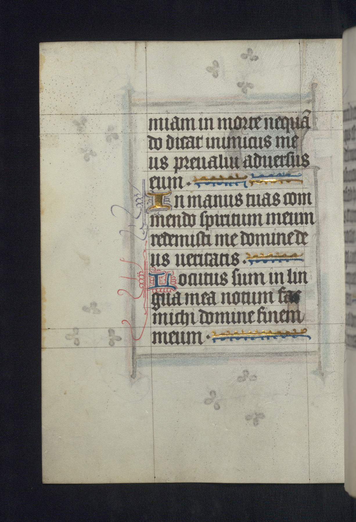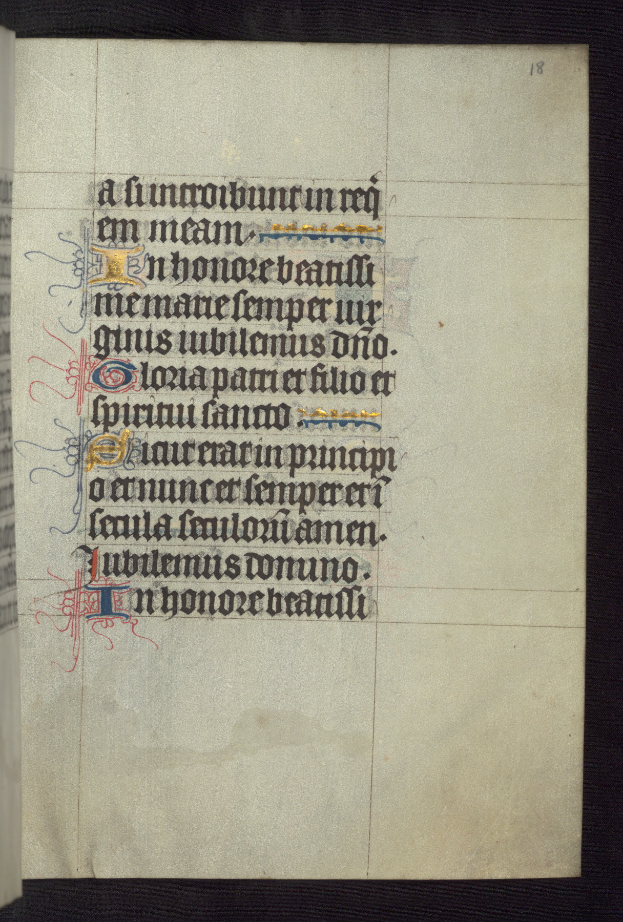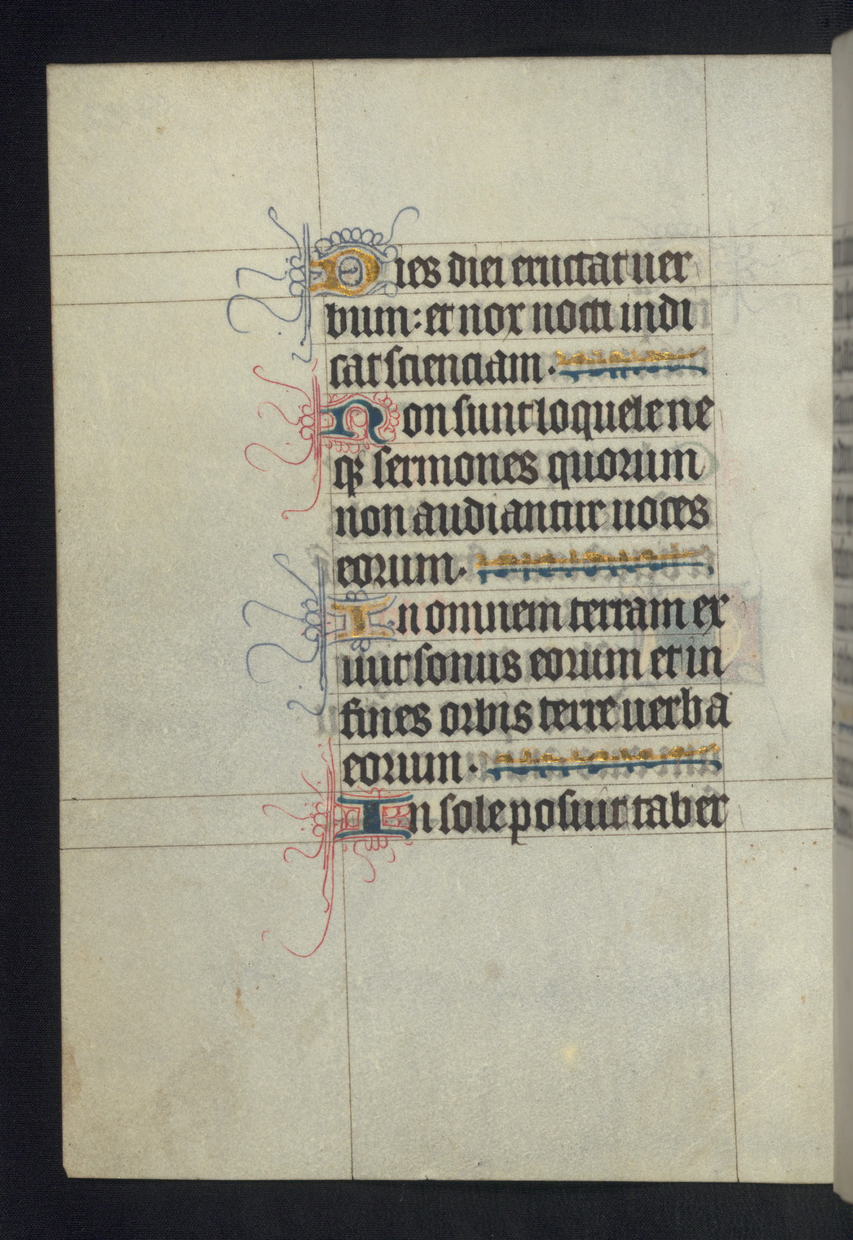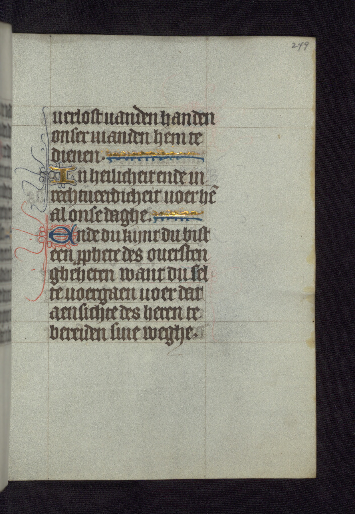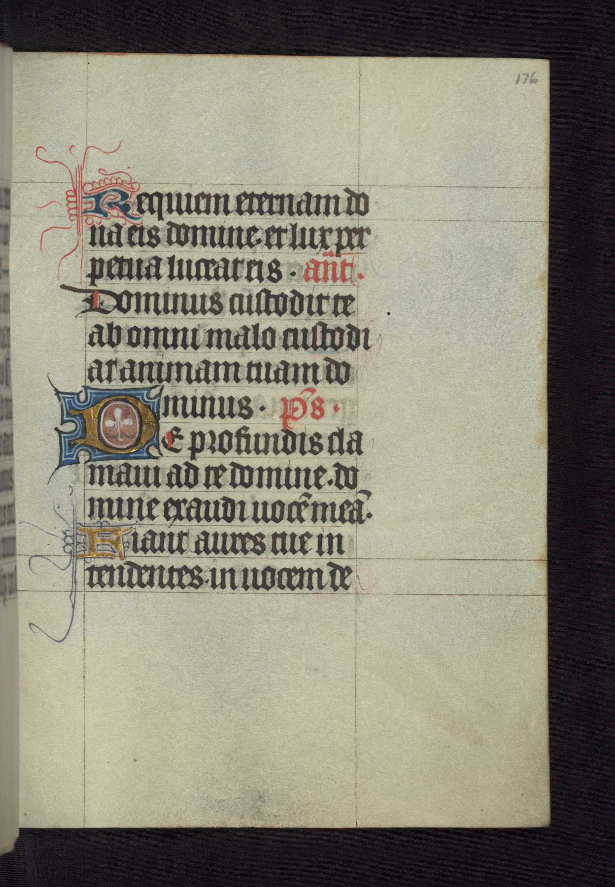 This Book of Hours was named the Doffinnes Hours after Franchoise de Doffinnes, who owned the book in the late sixteenth century and whose family’s subsequent history remains chronicled on the book’s final folios. However, the manuscript was originally made in the first quarter of the fifteenth century, probably for a married couple, who were originally represented kneeling with scrolls and their coats of arms in the margins, flanking a full-page miniature of the Crucifixion (fol. 72v), but whose figures and arms were later erased and overpainted with white. The manuscript contains both Latin and Dutch texts, supplemented by twelve full-page miniatures, the work of the Master of Walters 185. The manuscript also contains twelve pen-and-ink decorated initials in the calendar, some with grotesque faces, and letter "G" descenders throughout the book that can be attributed to the scribe Johannes de Malborch. The book’s original Dutch provenance is indicated by its calendar (for the Use of Utrecht) and its Hours of the Virgin, which follows predominantly the Use of the Windesheim Congregation. Prayers in Dutch were added to the end of the volume in the late fifteenth or early sixteenth century, and the book was subsequently rebound with its current cream-colored parchment binding of the seventeenth or eighteenth century.