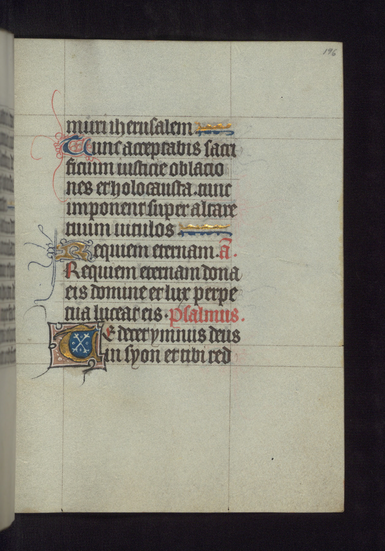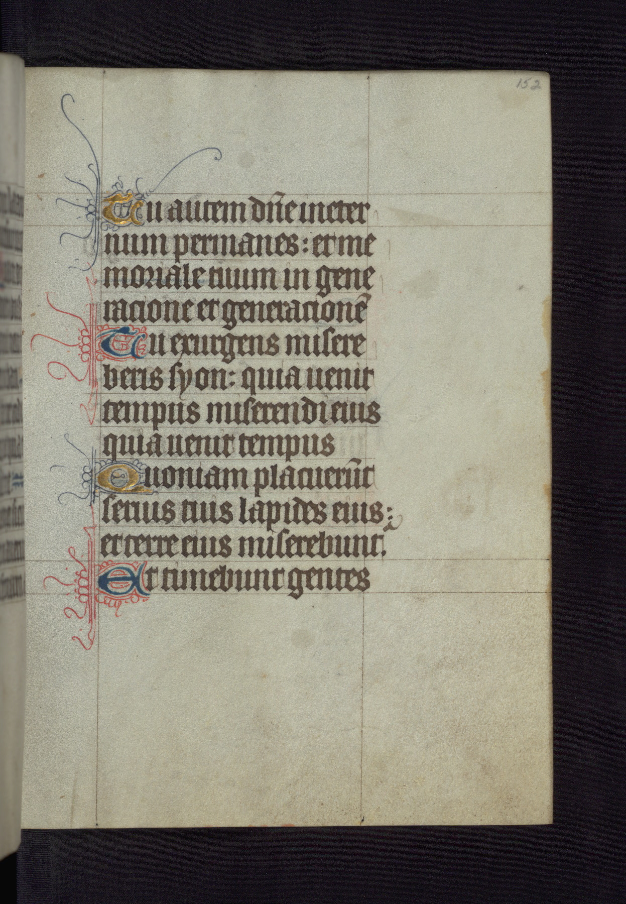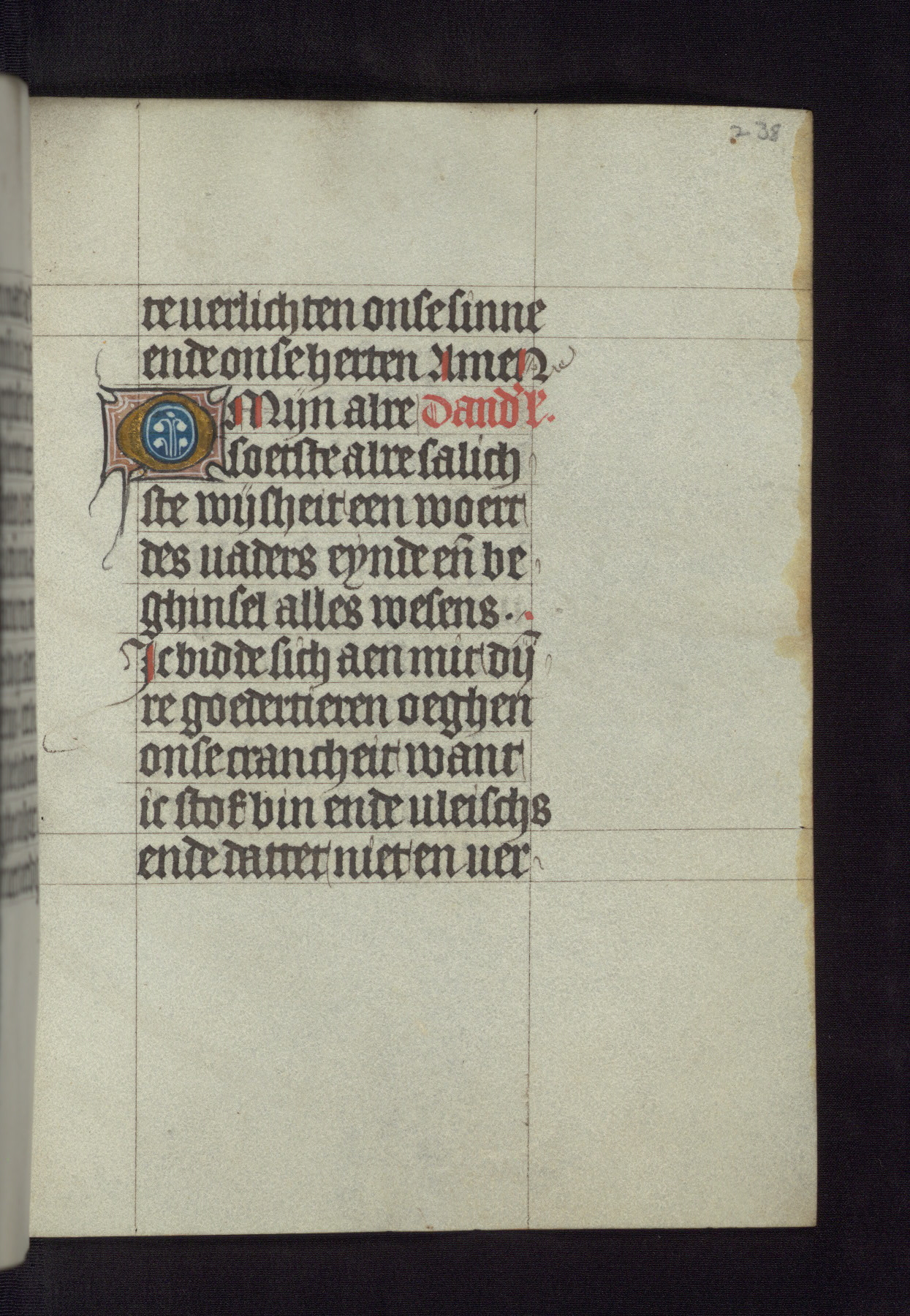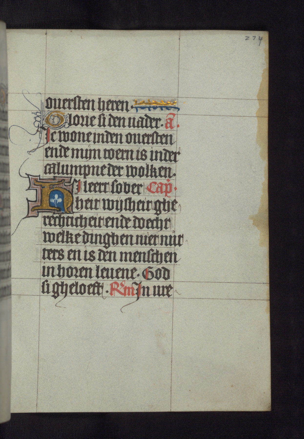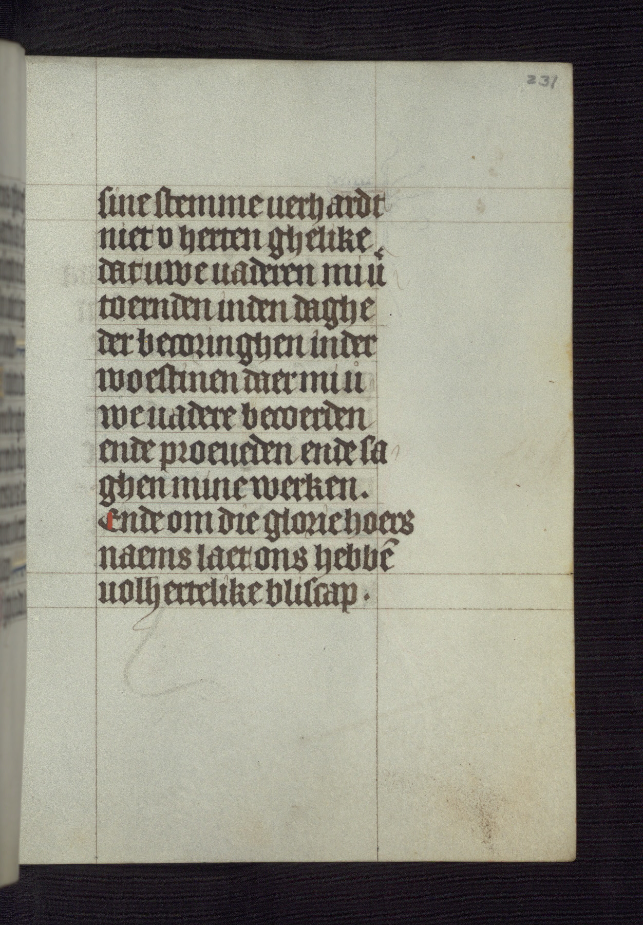 This Book of Hours was named the Doffinnes Hours after Franchoise de Doffinnes, who owned the book in the late sixteenth century and whose family’s subsequent history remains chronicled on the book’s final folios. However, the manuscript was originally made in the first quarter of the fifteenth century, probably for a married couple, who were originally represented kneeling with scrolls and their coats of arms in the margins, flanking a full-page miniature of the Crucifixion (fol. 72v), but whose figures and arms were later erased and overpainted with white. The manuscript contains both Latin and Dutch texts, supplemented by twelve full-page miniatures, the work of the Master of Walters 185. The manuscript also contains twelve pen-and-ink decorated initials in the calendar, some with grotesque faces, and letter "G" descenders throughout the book that can be attributed to the scribe Johannes de Malborch. The book’s original Dutch provenance is indicated by its calendar (for the Use of Utrecht) and its Hours of the Virgin, which follows predominantly the Use of the Windesheim Congregation. Prayers in Dutch were added to the end of the volume in the late fifteenth or early sixteenth century, and the book was subsequently rebound with its current cream-colored parchment binding of the seventeenth or eighteenth century.