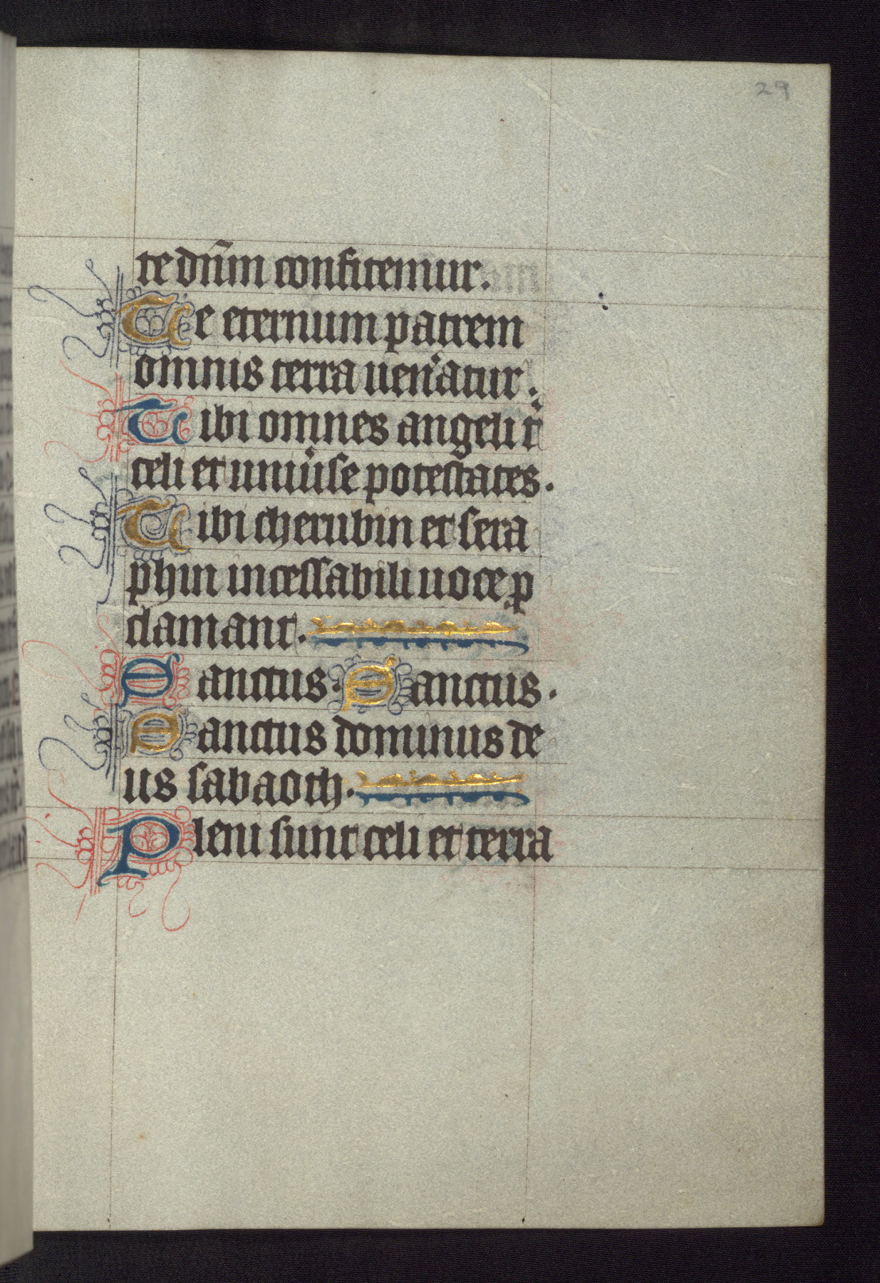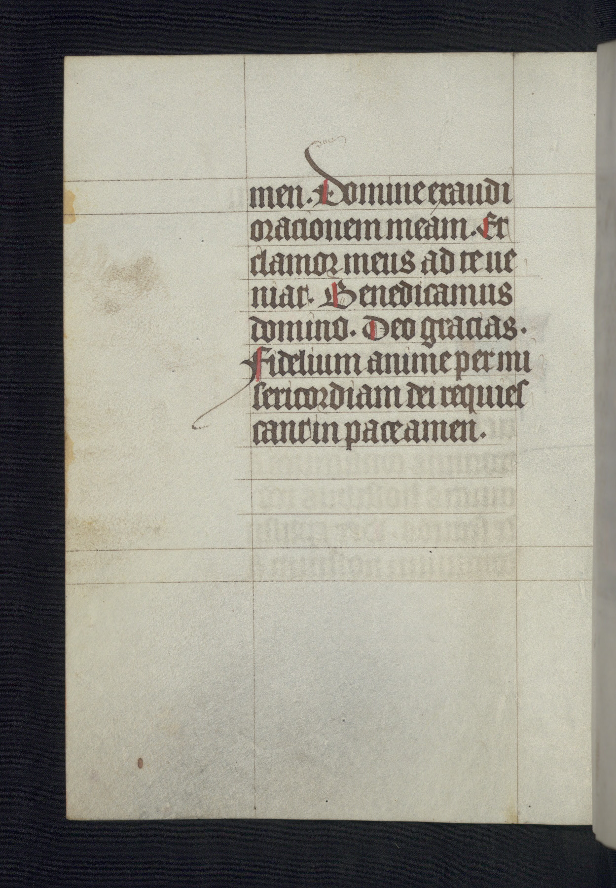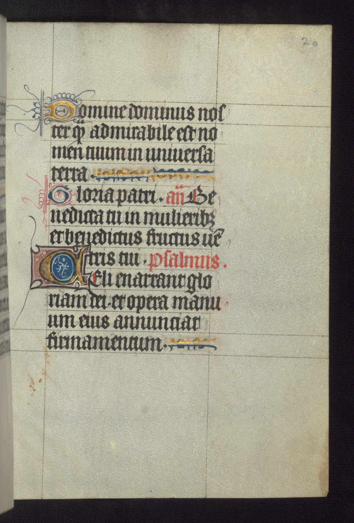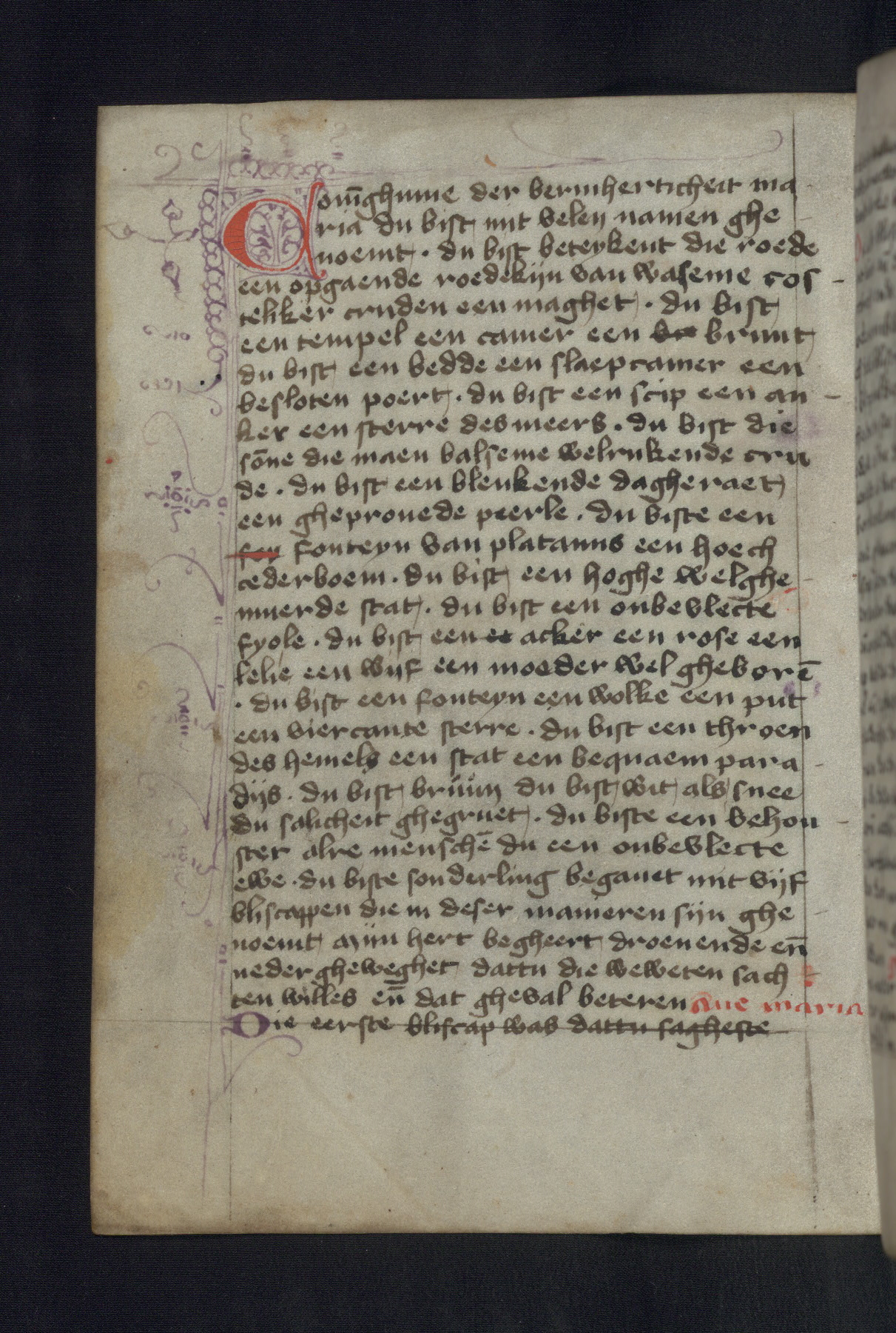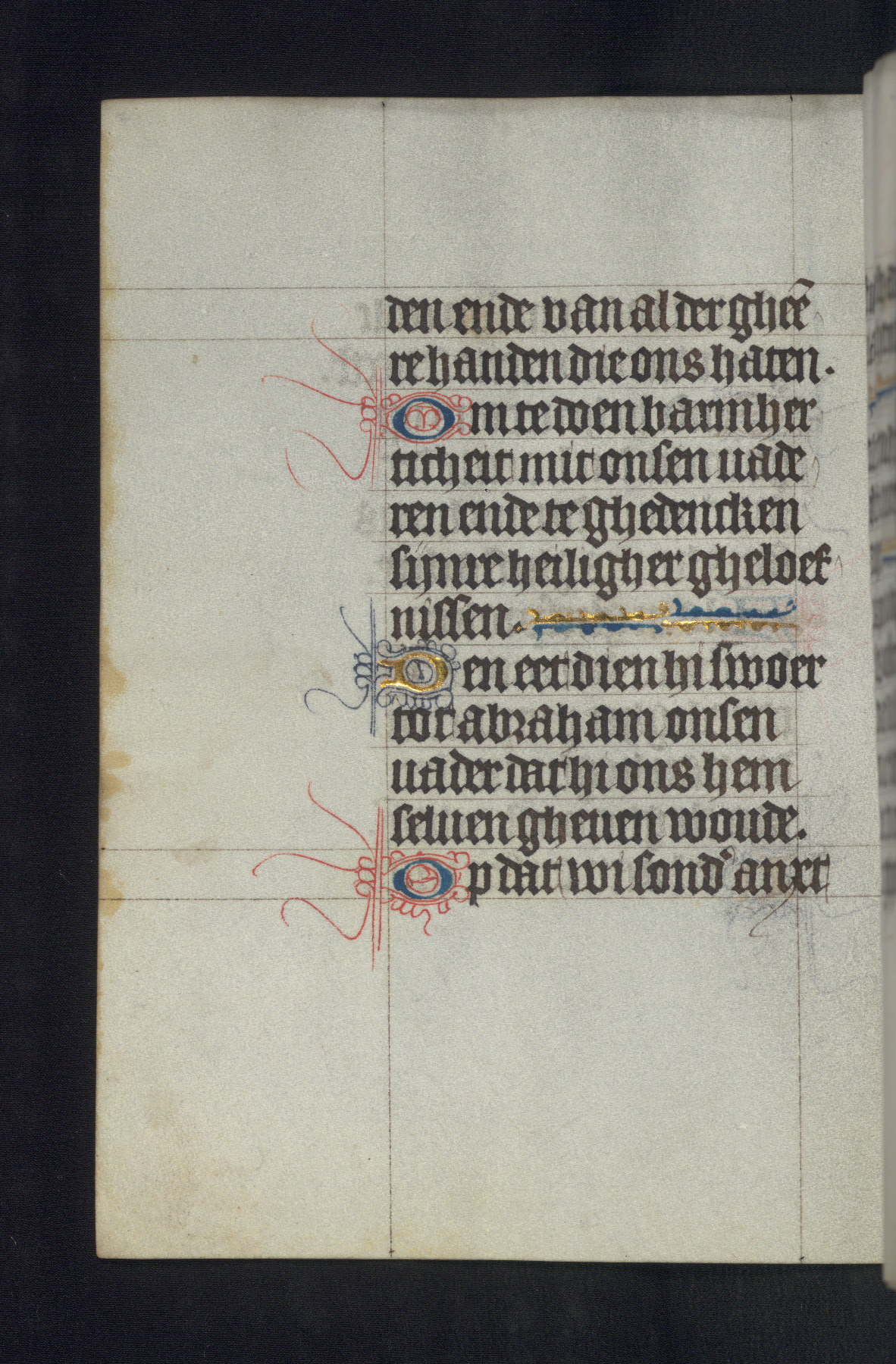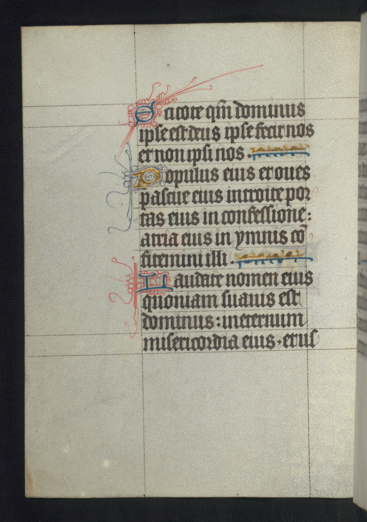 This Book of Hours was named the Doffinnes Hours after Franchoise de Doffinnes, who owned the book in the late sixteenth century and whose family’s subsequent history remains chronicled on the book’s final folios. However, the manuscript was originally made in the first quarter of the fifteenth century, probably for a married couple, who were originally represented kneeling with scrolls and their coats of arms in the margins, flanking a full-page miniature of the Crucifixion (fol. 72v), but whose figures and arms were later erased and overpainted with white. The manuscript contains both Latin and Dutch texts, supplemented by twelve full-page miniatures, the work of the Master of Walters 185. The manuscript also contains twelve pen-and-ink decorated initials in the calendar, some with grotesque faces, and letter "G" descenders throughout the book that can be attributed to the scribe Johannes de Malborch. The book’s original Dutch provenance is indicated by its calendar (for the Use of Utrecht) and its Hours of the Virgin, which follows predominantly the Use of the Windesheim Congregation. Prayers in Dutch were added to the end of the volume in the late fifteenth or early sixteenth century, and the book was subsequently rebound with its current cream-colored parchment binding of the seventeenth or eighteenth century.