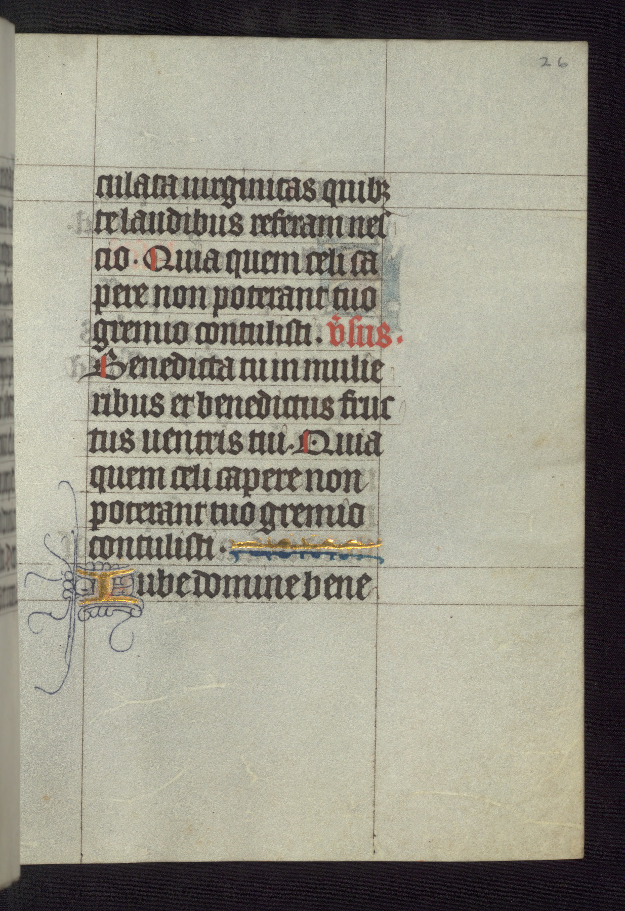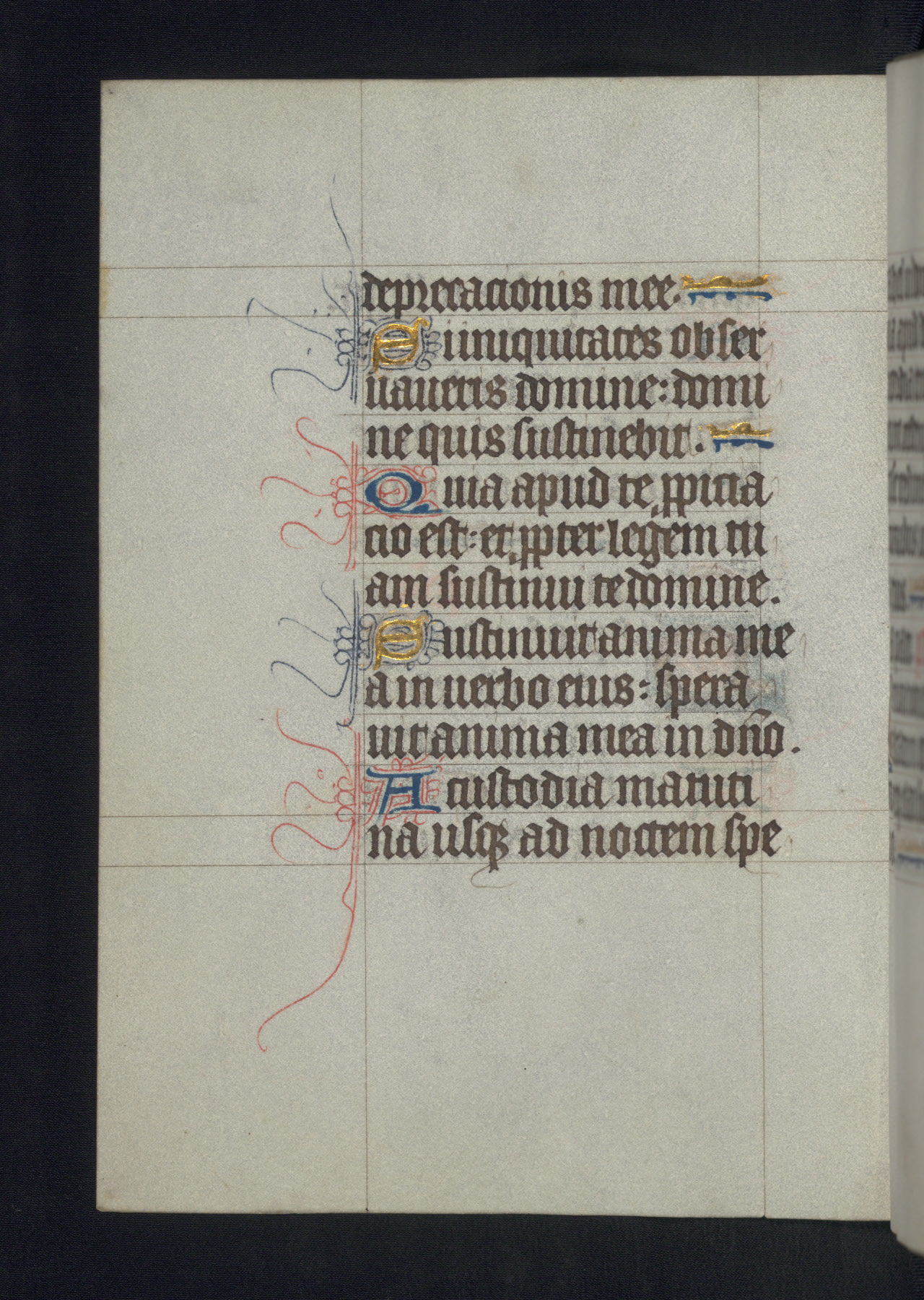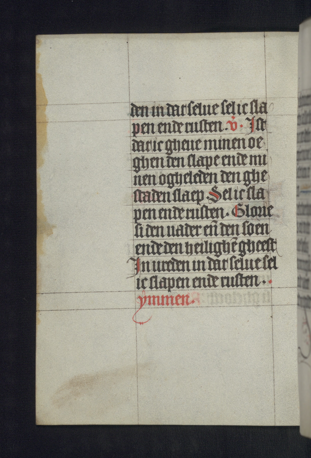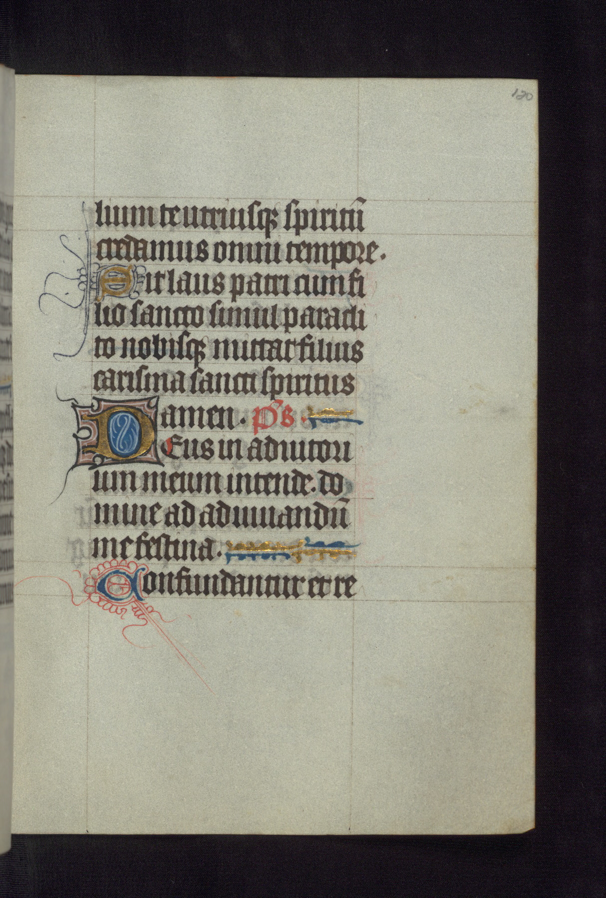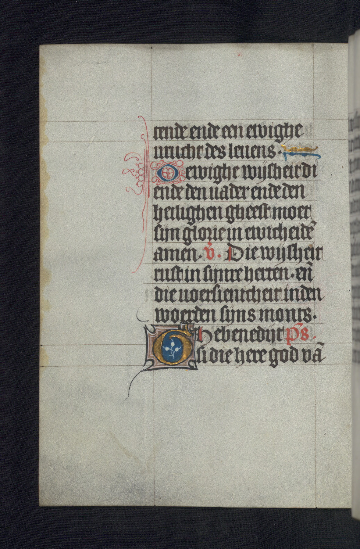 This Book of Hours was named the Doffinnes Hours after Franchoise de Doffinnes, who owned the book in the late sixteenth century and whose family’s subsequent history remains chronicled on the book’s final folios. However, the manuscript was originally made in the first quarter of the fifteenth century, probably for a married couple, who were originally represented kneeling with scrolls and their coats of arms in the margins, flanking a full-page miniature of the Crucifixion (fol. 72v), but whose figures and arms were later erased and overpainted with white. The manuscript contains both Latin and Dutch texts, supplemented by twelve full-page miniatures, the work of the Master of Walters 185. The manuscript also contains twelve pen-and-ink decorated initials in the calendar, some with grotesque faces, and letter "G" descenders throughout the book that can be attributed to the scribe Johannes de Malborch. The book’s original Dutch provenance is indicated by its calendar (for the Use of Utrecht) and its Hours of the Virgin, which follows predominantly the Use of the Windesheim Congregation. Prayers in Dutch were added to the end of the volume in the late fifteenth or early sixteenth century, and the book was subsequently rebound with its current cream-colored parchment binding of the seventeenth or eighteenth century.