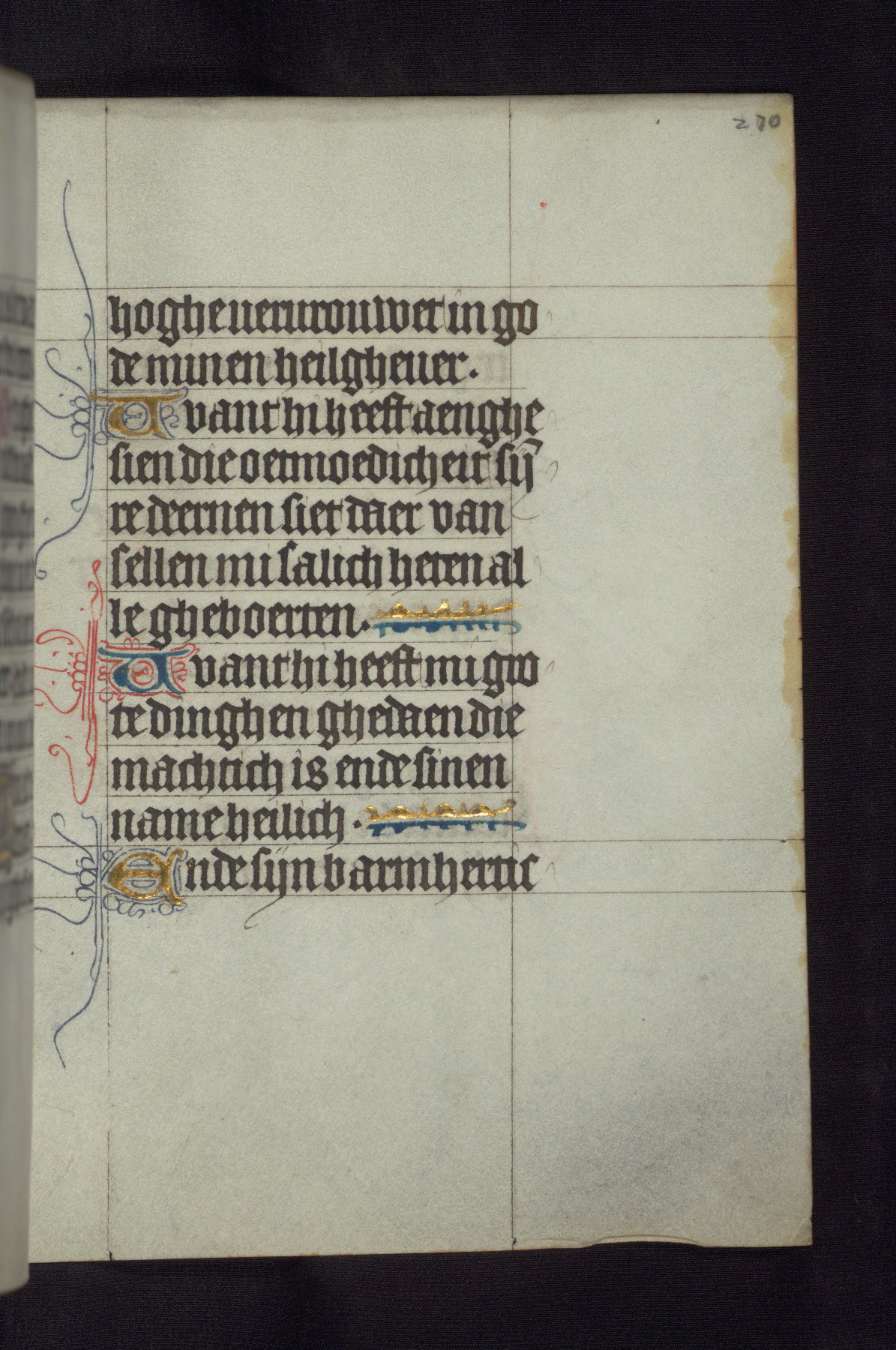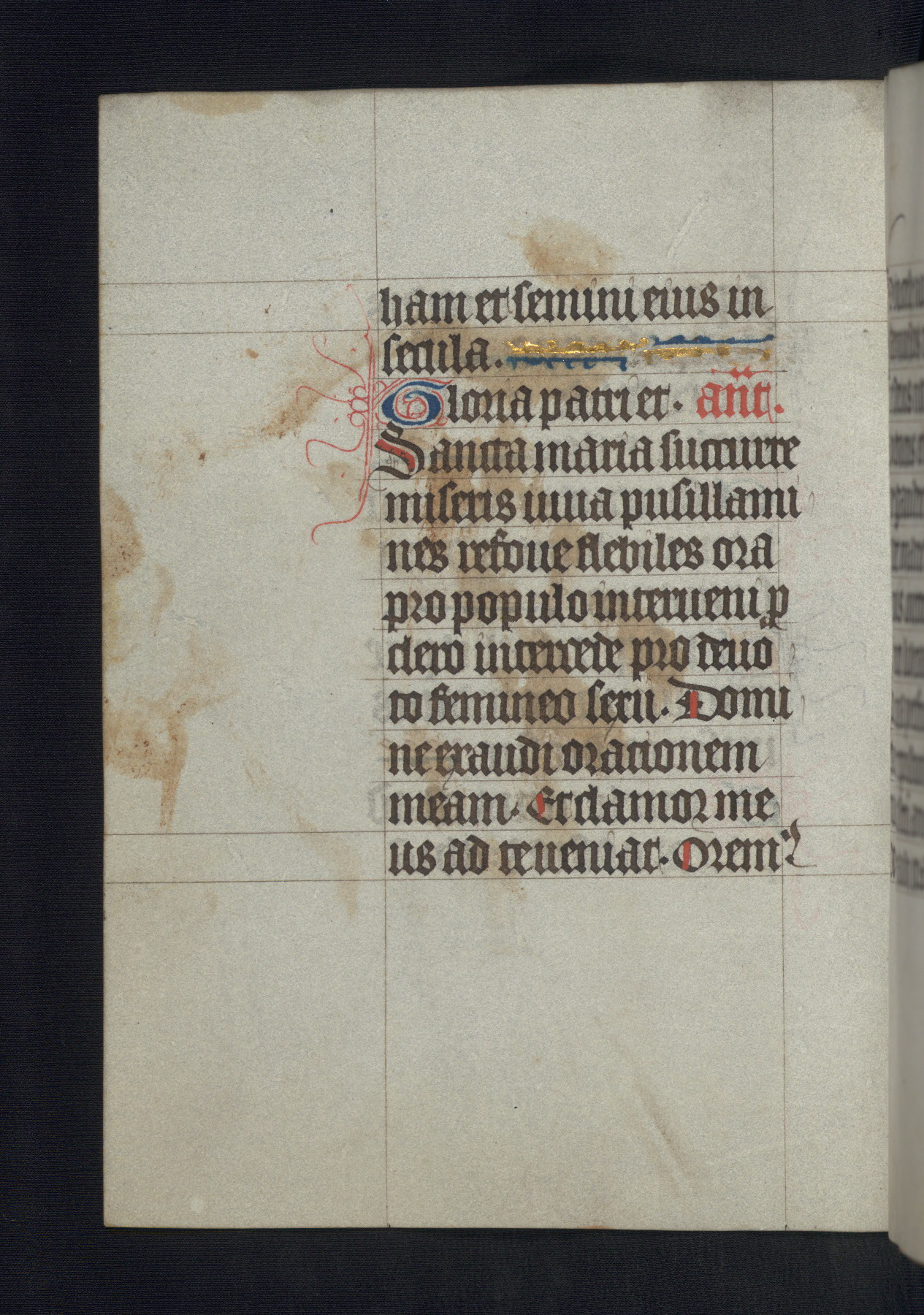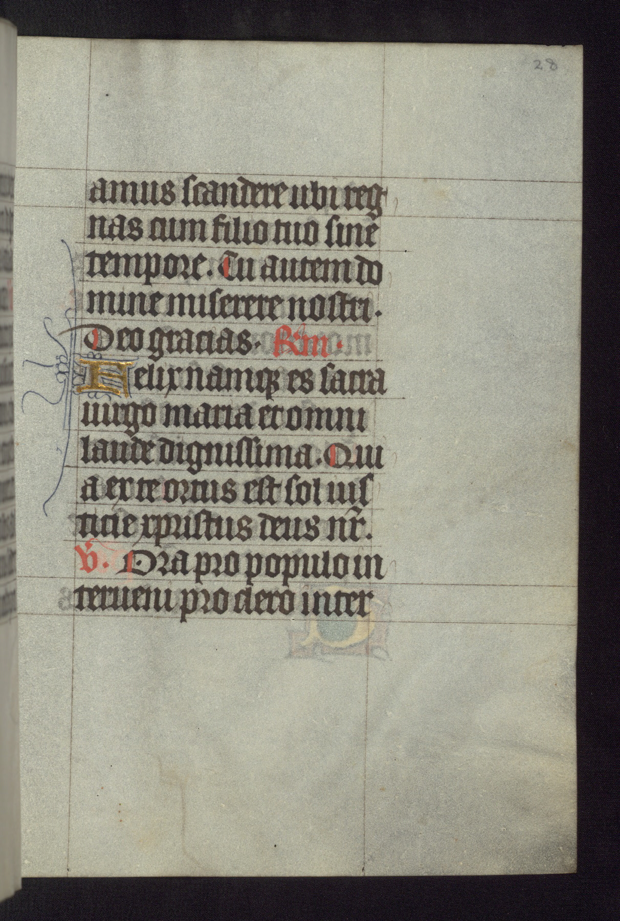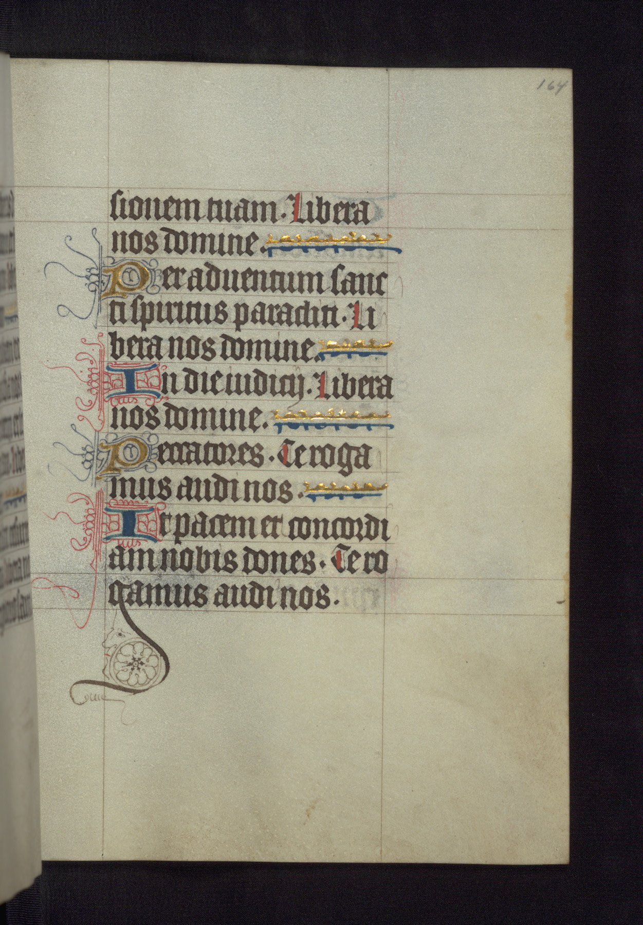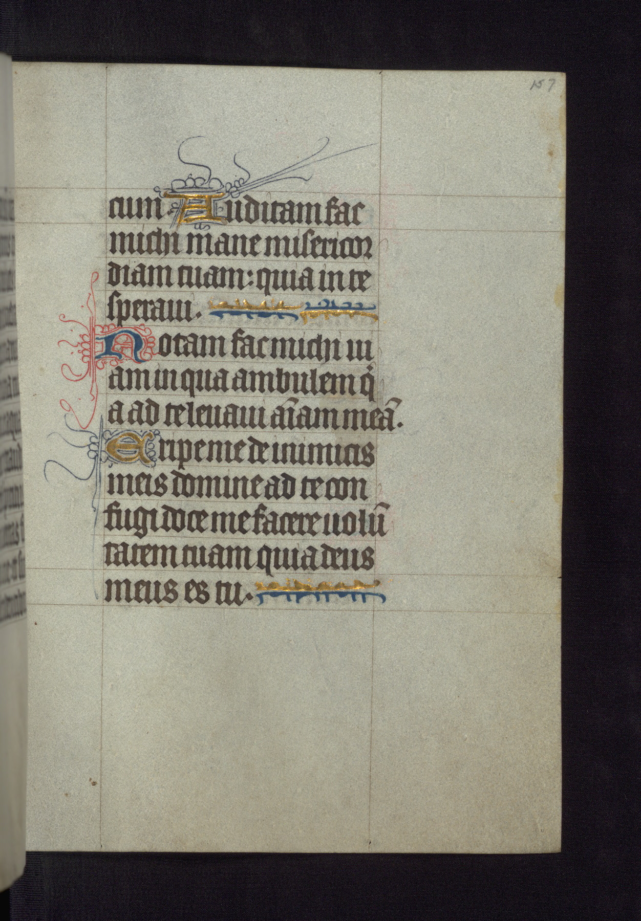 This Book of Hours was named the Doffinnes Hours after Franchoise de Doffinnes, who owned the book in the late sixteenth century and whose family’s subsequent history remains chronicled on the book’s final folios. However, the manuscript was originally made in the first quarter of the fifteenth century, probably for a married couple, who were originally represented kneeling with scrolls and their coats of arms in the margins, flanking a full-page miniature of the Crucifixion (fol. 72v), but whose figures and arms were later erased and overpainted with white. The manuscript contains both Latin and Dutch texts, supplemented by twelve full-page miniatures, the work of the Master of Walters 185. The manuscript also contains twelve pen-and-ink decorated initials in the calendar, some with grotesque faces, and letter "G" descenders throughout the book that can be attributed to the scribe Johannes de Malborch. The book’s original Dutch provenance is indicated by its calendar (for the Use of Utrecht) and its Hours of the Virgin, which follows predominantly the Use of the Windesheim Congregation. Prayers in Dutch were added to the end of the volume in the late fifteenth or early sixteenth century, and the book was subsequently rebound with its current cream-colored parchment binding of the seventeenth or eighteenth century.