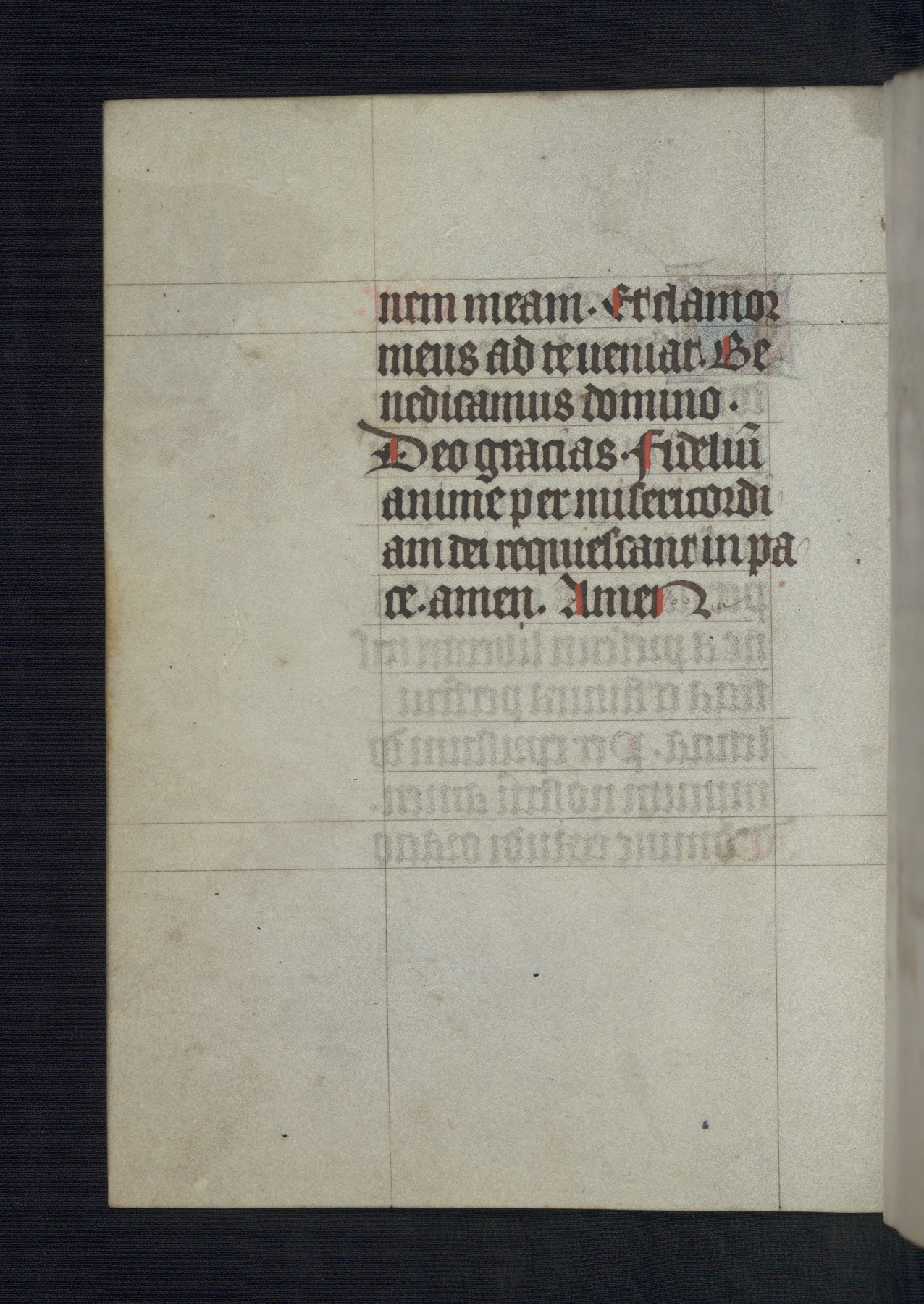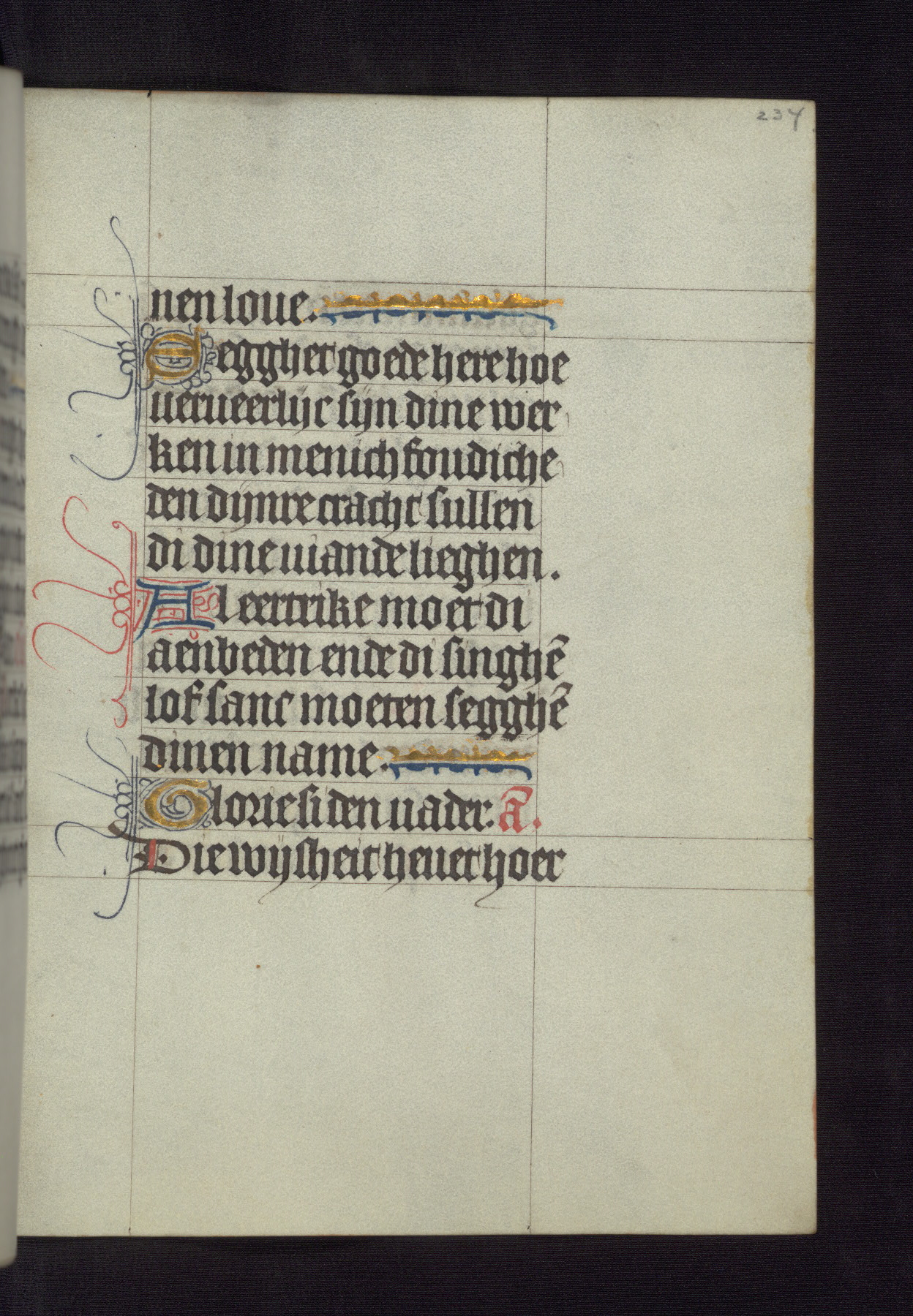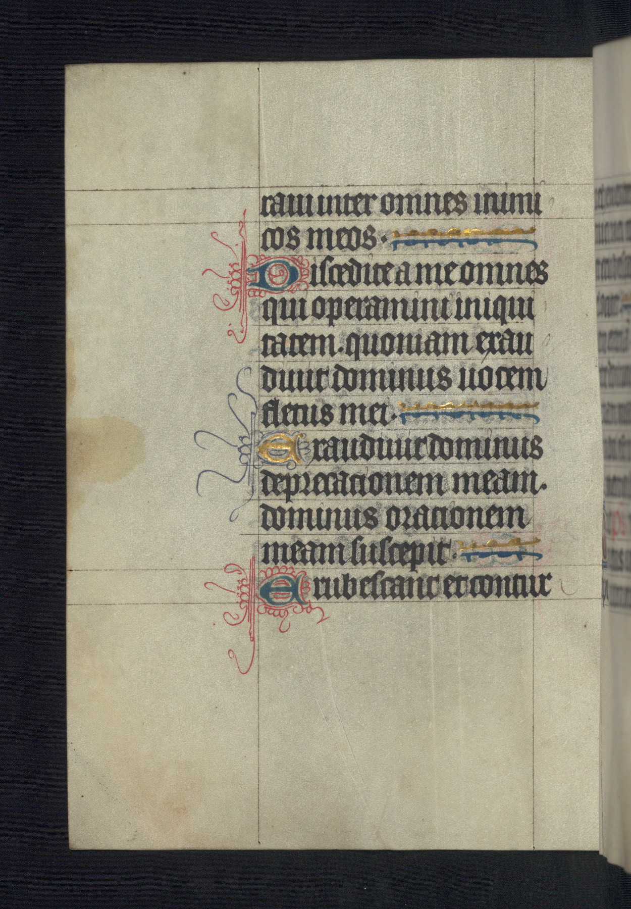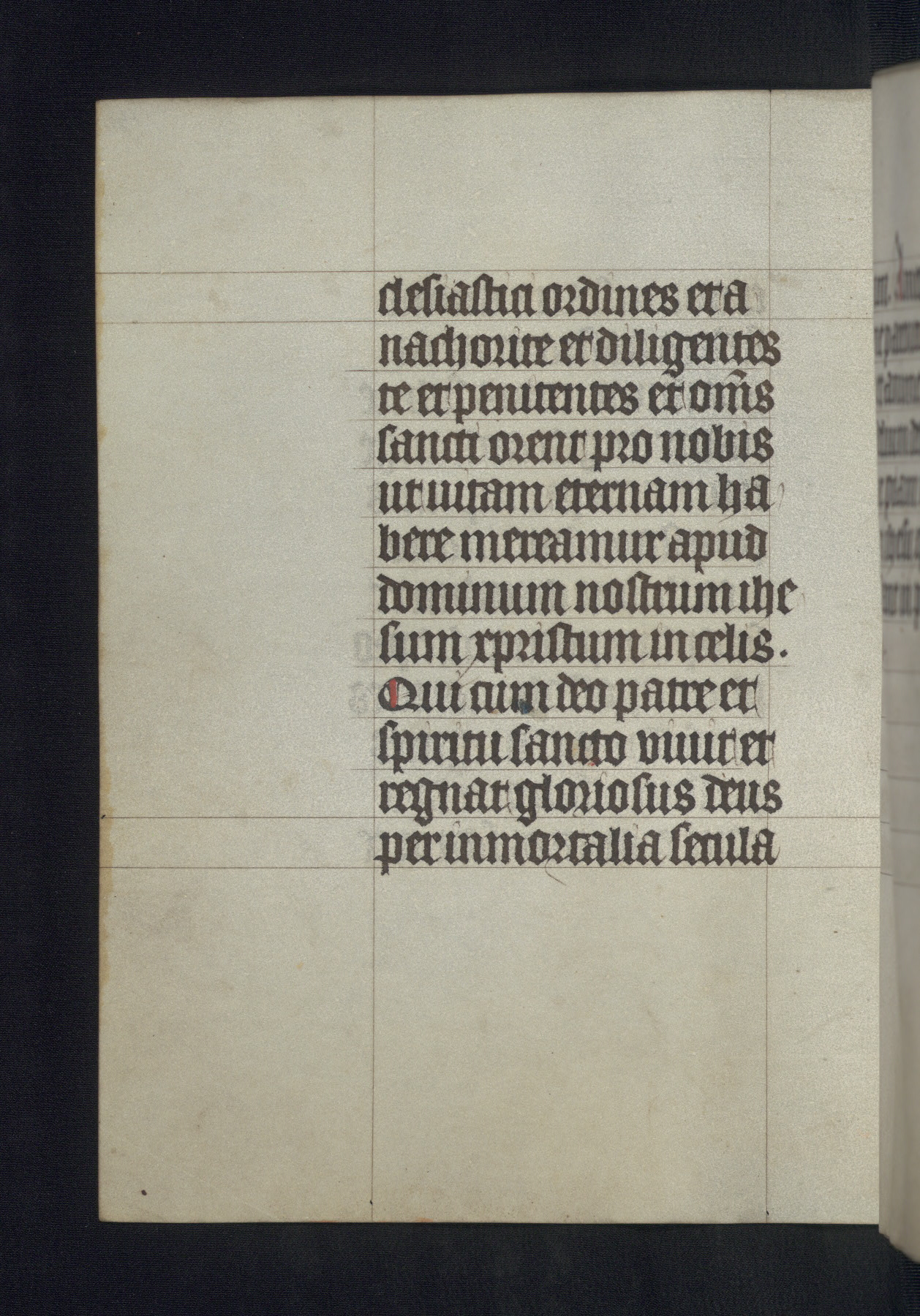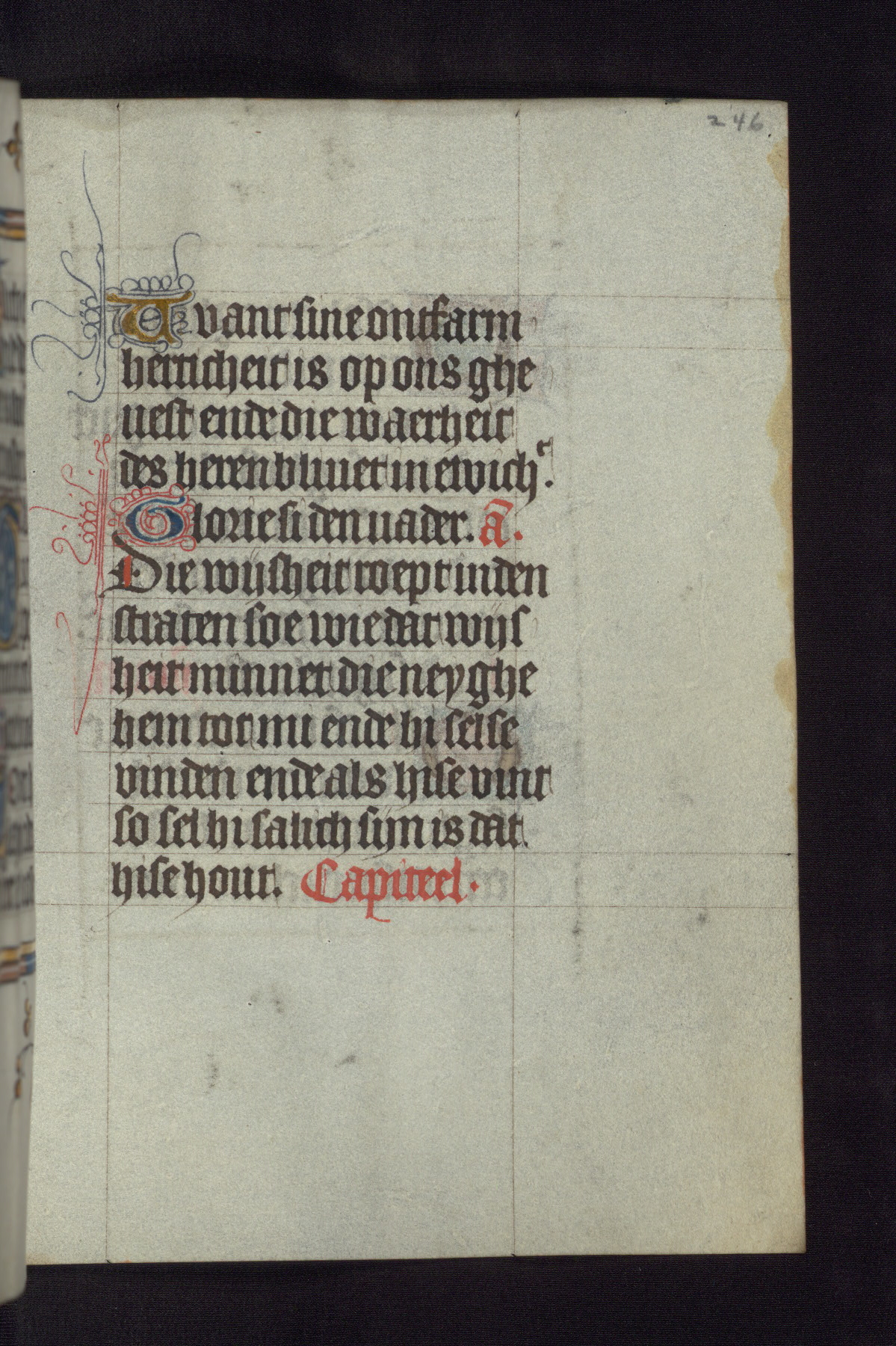 This Book of Hours was named the Doffinnes Hours after Franchoise de Doffinnes, who owned the book in the late sixteenth century and whose family’s subsequent history remains chronicled on the book’s final folios. However, the manuscript was originally made in the first quarter of the fifteenth century, probably for a married couple, who were originally represented kneeling with scrolls and their coats of arms in the margins, flanking a full-page miniature of the Crucifixion (fol. 72v), but whose figures and arms were later erased and overpainted with white. The manuscript contains both Latin and Dutch texts, supplemented by twelve full-page miniatures, the work of the Master of Walters 185. The manuscript also contains twelve pen-and-ink decorated initials in the calendar, some with grotesque faces, and letter "G" descenders throughout the book that can be attributed to the scribe Johannes de Malborch. The book’s original Dutch provenance is indicated by its calendar (for the Use of Utrecht) and its Hours of the Virgin, which follows predominantly the Use of the Windesheim Congregation. Prayers in Dutch were added to the end of the volume in the late fifteenth or early sixteenth century, and the book was subsequently rebound with its current cream-colored parchment binding of the seventeenth or eighteenth century.