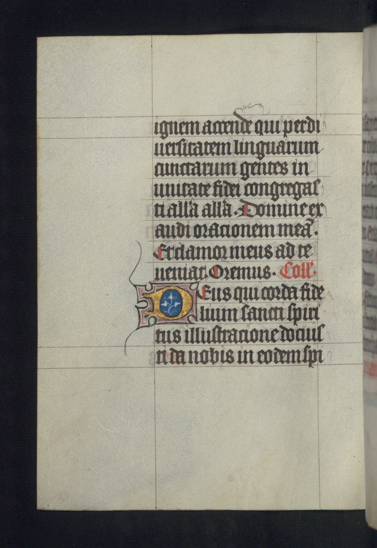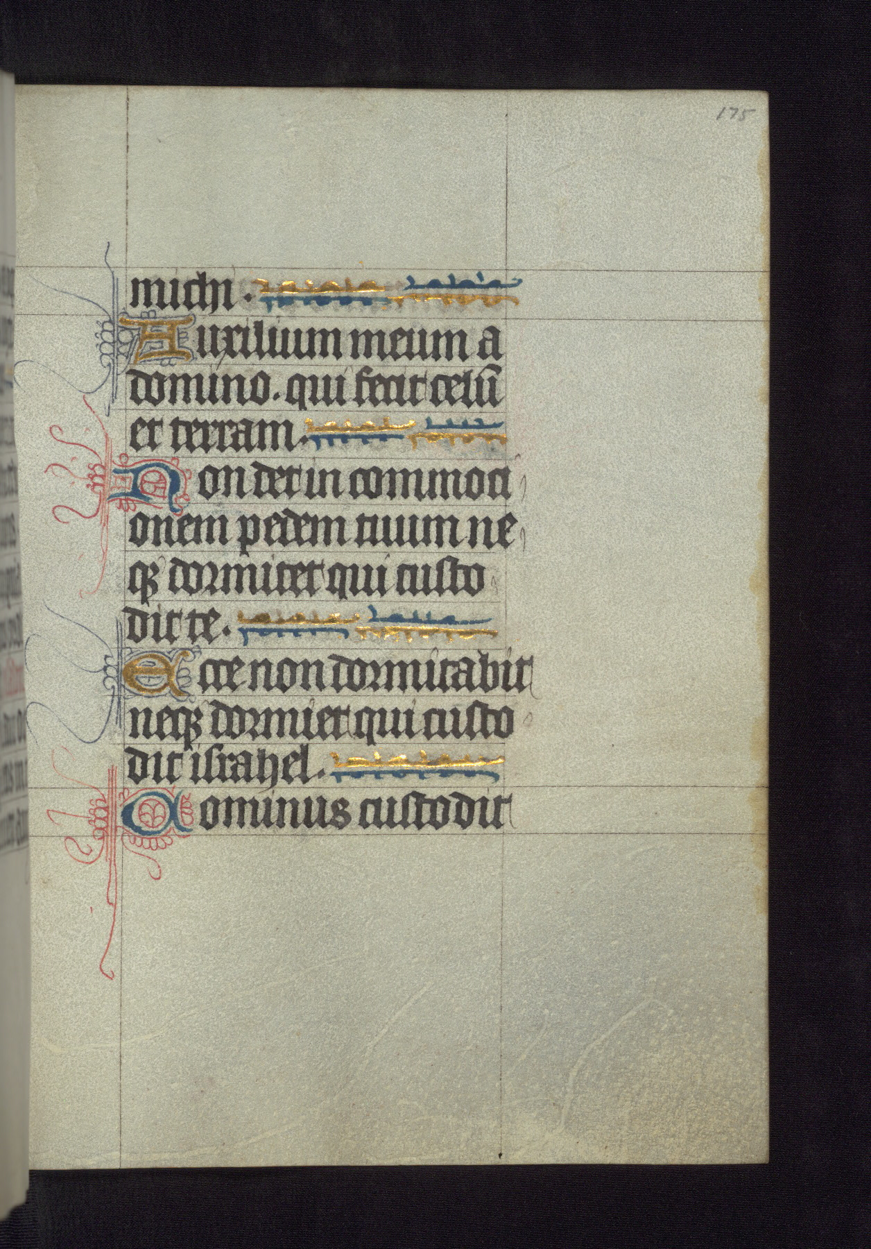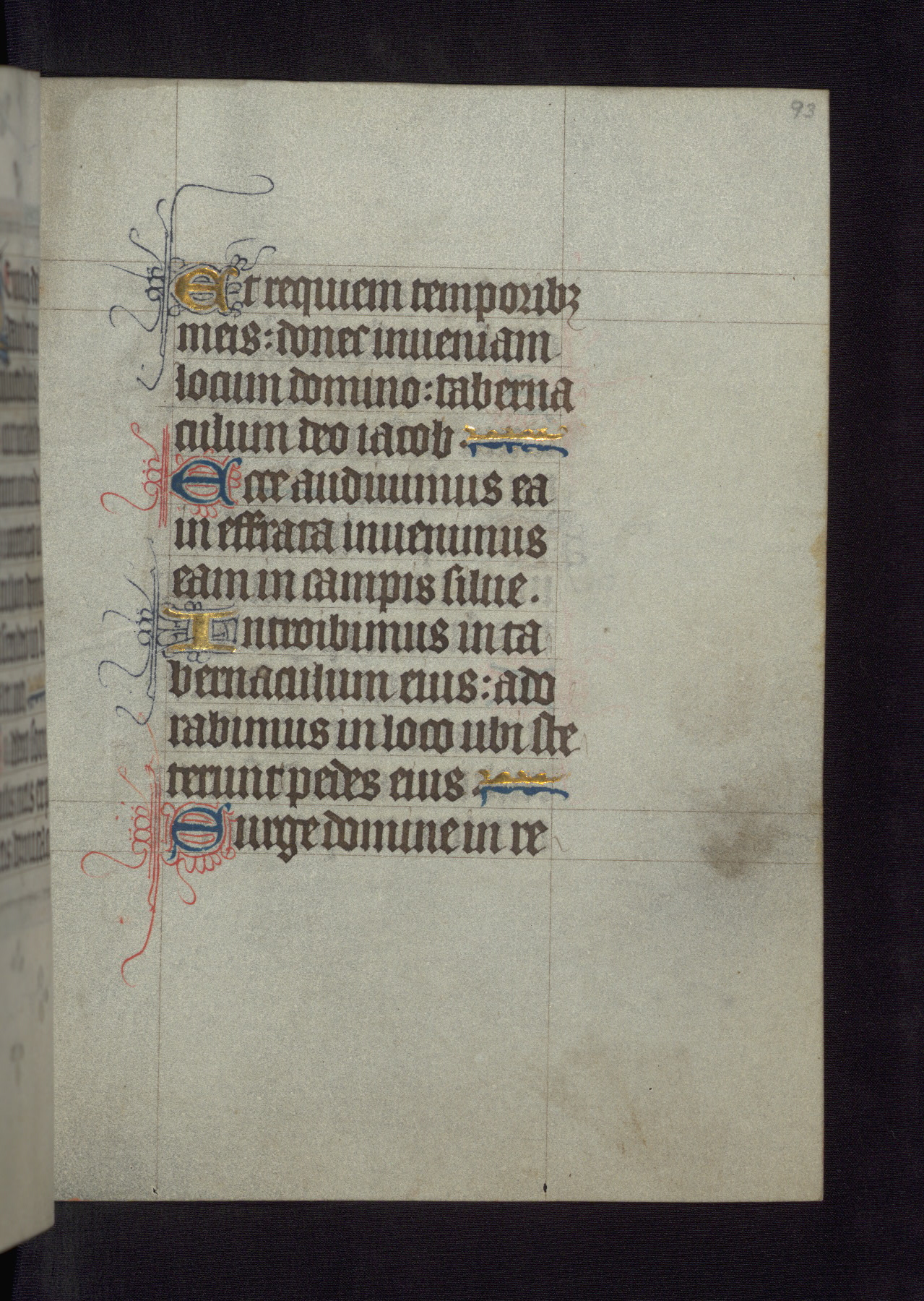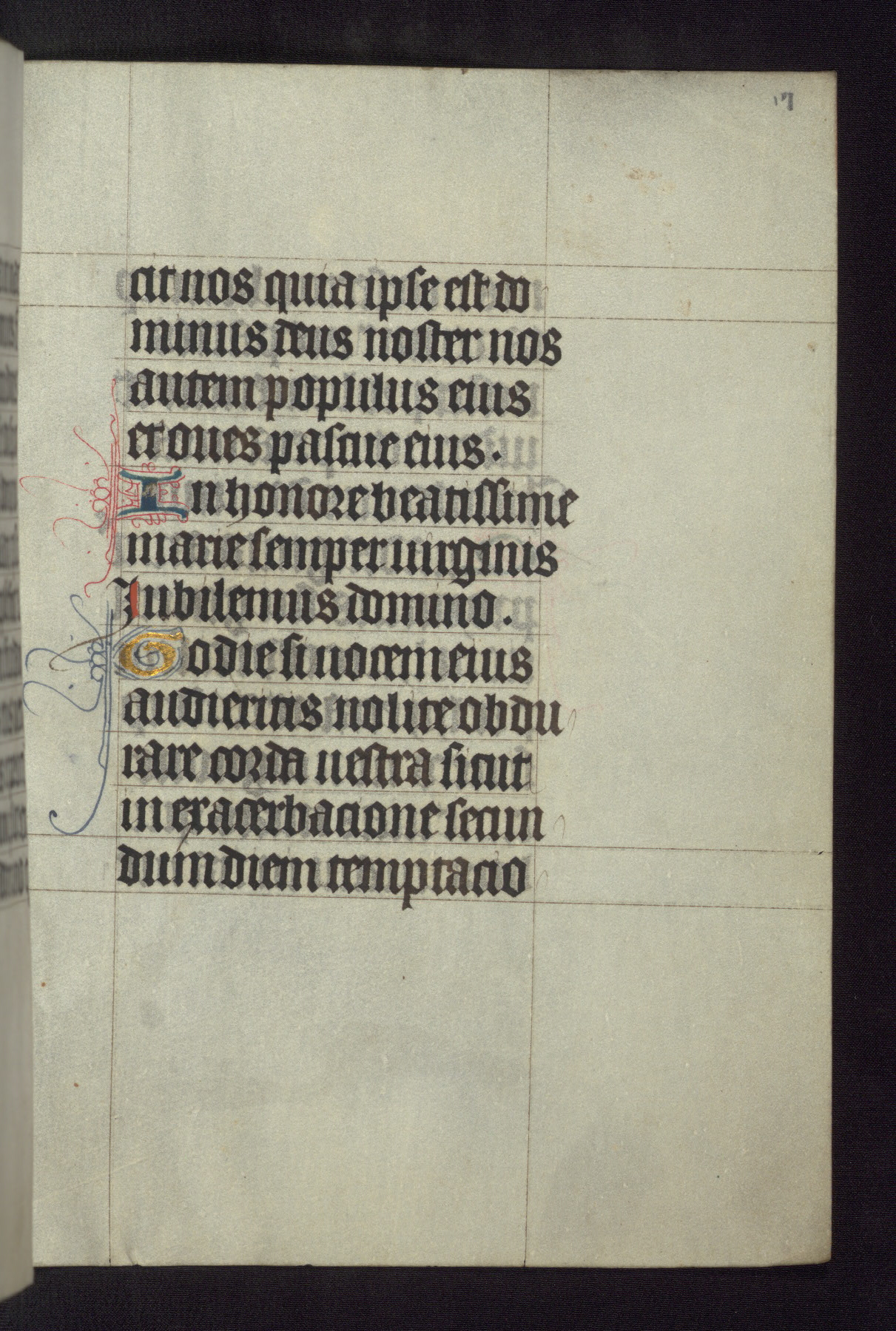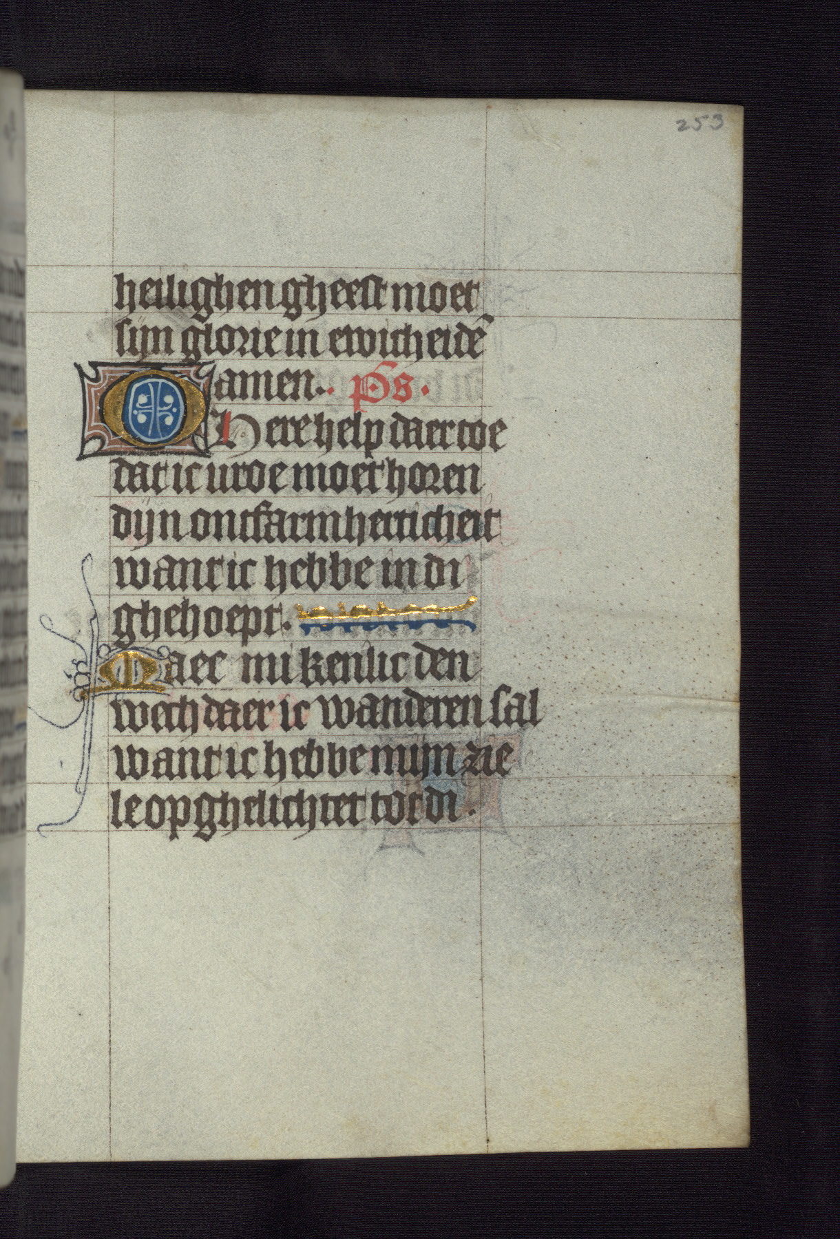 This Book of Hours was named the Doffinnes Hours after Franchoise de Doffinnes, who owned the book in the late sixteenth century and whose family’s subsequent history remains chronicled on the book’s final folios. However, the manuscript was originally made in the first quarter of the fifteenth century, probably for a married couple, who were originally represented kneeling with scrolls and their coats of arms in the margins, flanking a full-page miniature of the Crucifixion (fol. 72v), but whose figures and arms were later erased and overpainted with white. The manuscript contains both Latin and Dutch texts, supplemented by twelve full-page miniatures, the work of the Master of Walters 185. The manuscript also contains twelve pen-and-ink decorated initials in the calendar, some with grotesque faces, and letter "G" descenders throughout the book that can be attributed to the scribe Johannes de Malborch. The book’s original Dutch provenance is indicated by its calendar (for the Use of Utrecht) and its Hours of the Virgin, which follows predominantly the Use of the Windesheim Congregation. Prayers in Dutch were added to the end of the volume in the late fifteenth or early sixteenth century, and the book was subsequently rebound with its current cream-colored parchment binding of the seventeenth or eighteenth century.